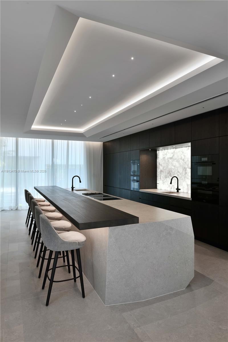 A true architectural masterpiece, this newly completed waterfront residence on the exclusive, guard-gated Hibiscus Island embodies the pinnacle of refined Miami Beach living. Designed by renowned architect Kobi Karp and curated by European luxury design firm AED Planung, this contemporary estate offers 7,869 SF under air (9,178 SF total) with 6 beds, 7.5 baths on a 90-ft bayfront lot with sweeping views of the Bay, Miami, and Miami Beach. The open floor plan flows seamlessly to a resort-style outdoor area featuring an infinity-edge pool/spa, covered dining pavilion, summer kitchen, sunken lounge next to pool, and private dock. Other notable features: home automation system, elevator, movie room, gym, wine fridge, extensive rooftop terrace, separate guest house, and whole home generator.