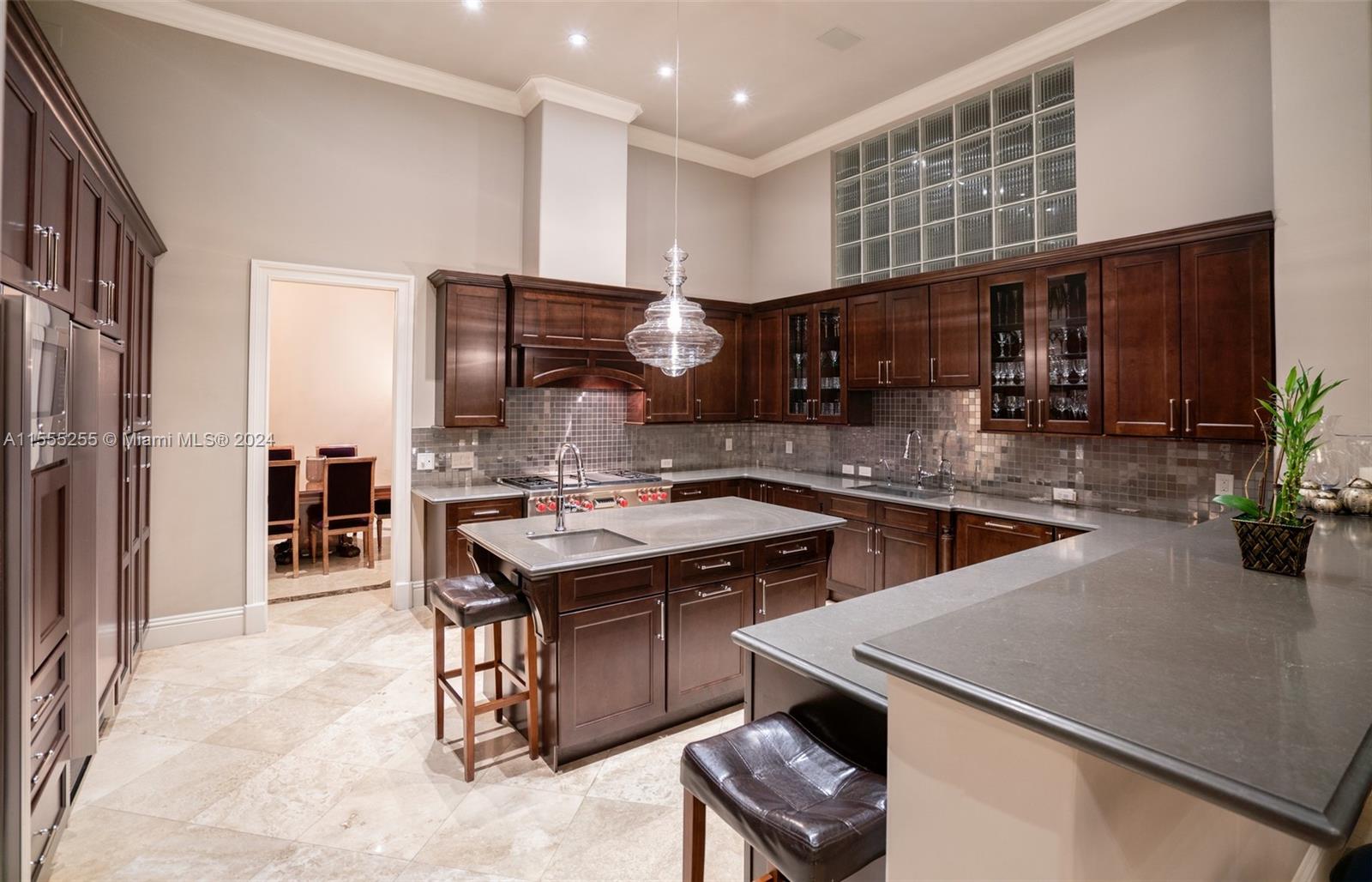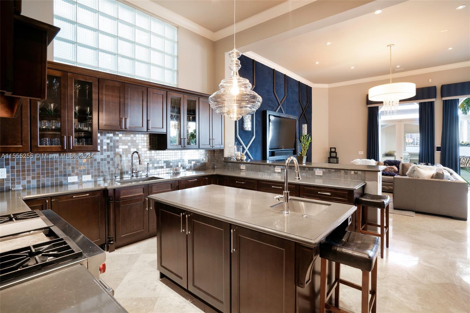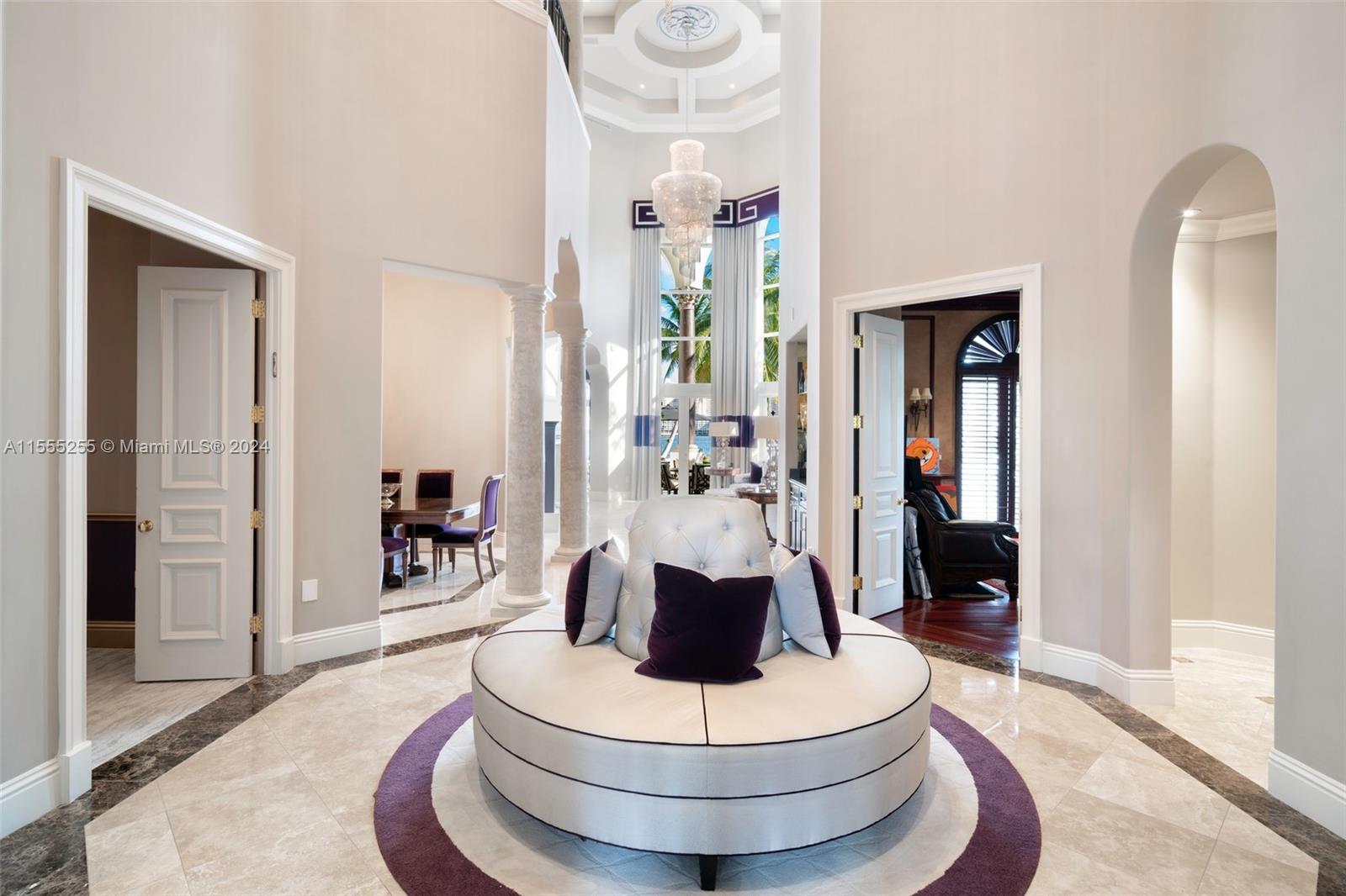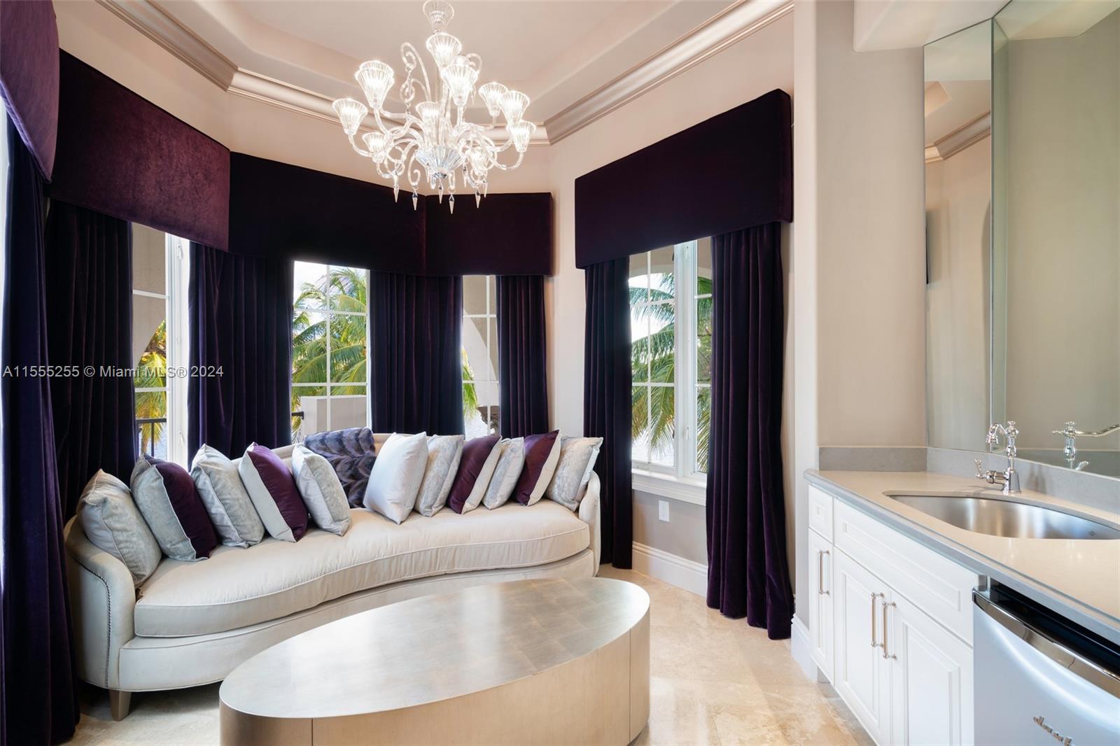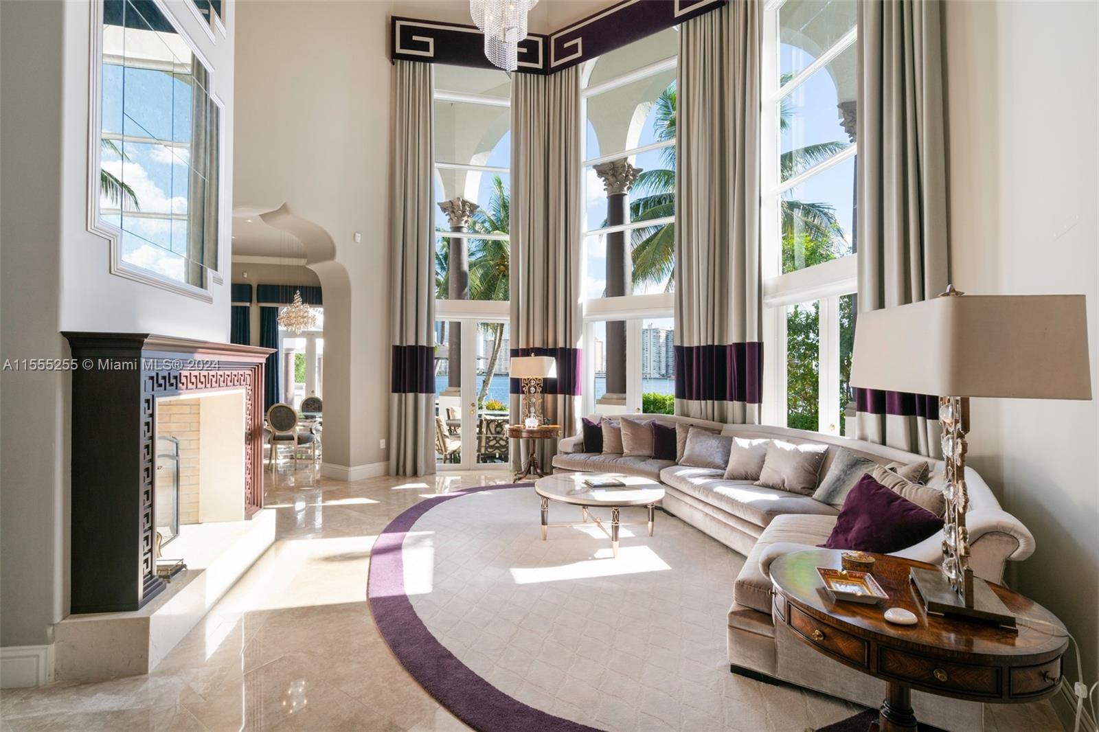 Own a former celebrity bayfront three-story Mediterranean estate in the prestigious gated community of Island Estates. The only home on a double lot of 24,772sf with 240ft of water frontage. Top-of-the-line finishes, vaulted 30-foot ceilings, gourmet chef's kitchen, elevator, luxurious master suite with sitting area and veranda with sunrises and sunset panoramic views. Stunning tropical pool and spa overlooking the bay. Marble and walnut hardwood floors and impact glass. Ipad-controlled smart house system, movie theater with 128-inch TV, cabana, elevator, office, service quarters, and golf cart parking. and 14K Gold Chandeliers with Swarovski Crystals with a special cleaning system. Residents have complete access to Prive five-star amenities.