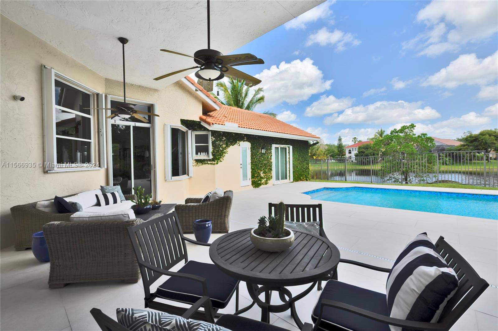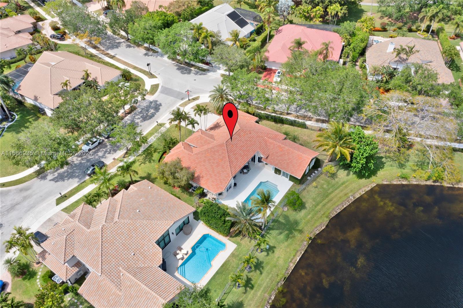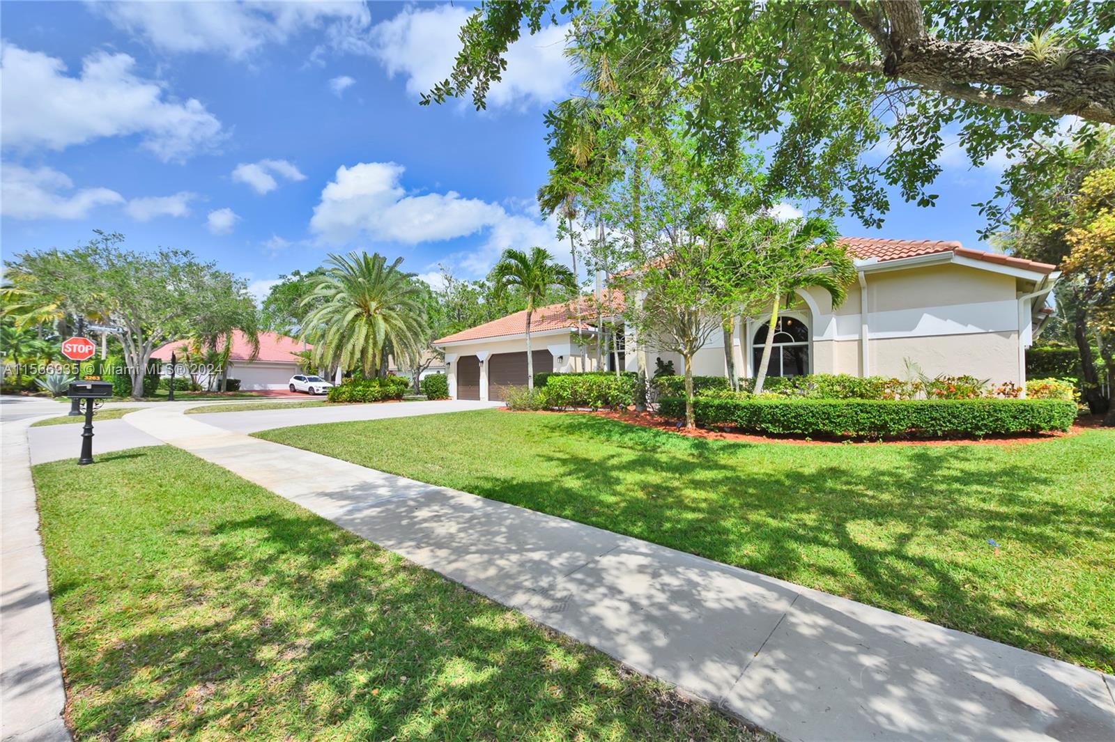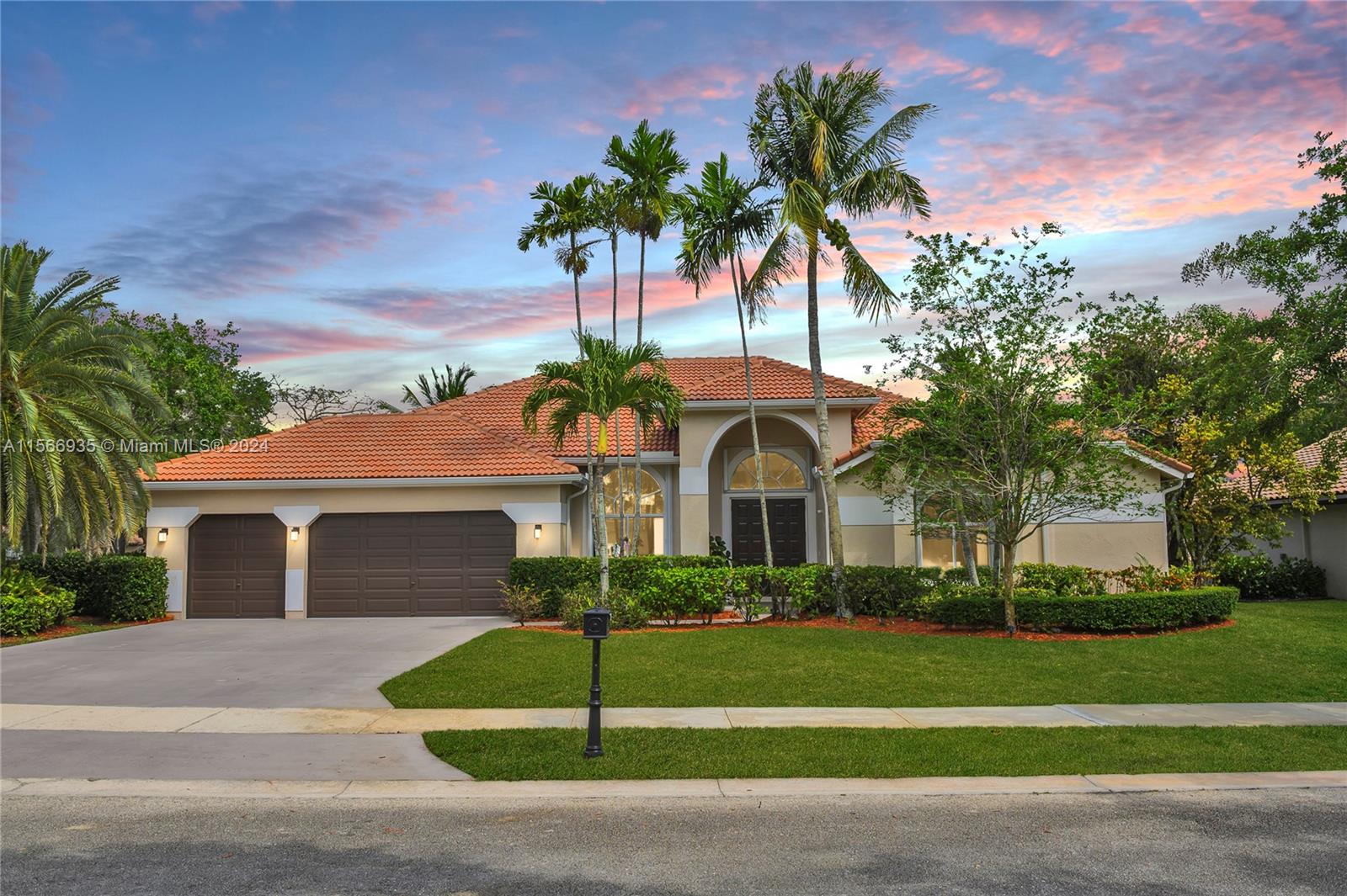 Weston Hills, stunning corner home boasts a single-story layout with 5 bedrooms and 3.5 bathrooms, offering spacious living on an 18,000 sq ft lot. The split bedroom design ensures privacy, complemented by a 3-car garage for ample parking and storage. Upon entry through double doors, you're greeted by an open floor plan that seamlessly integrates indoor and outdoor living. Enjoy picturesque views of the lake, pool, and sunrise from every angle. The pool and deck have been remodeled, featuring a saline system for added luxury. Inside, the kitchen has been updated, while newer roof, accordion shutters, and impact garage doors provide security and peace of mind. Tile flooring graces the living areas, while laminated floors add warmth to the bedrooms. Excellent school system.