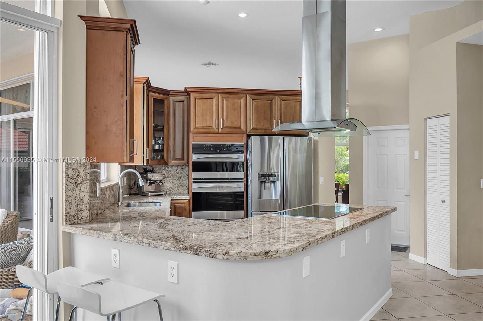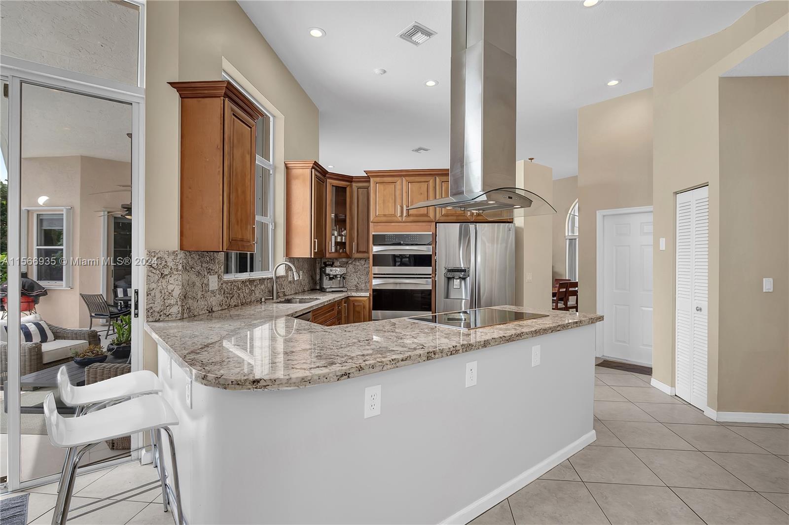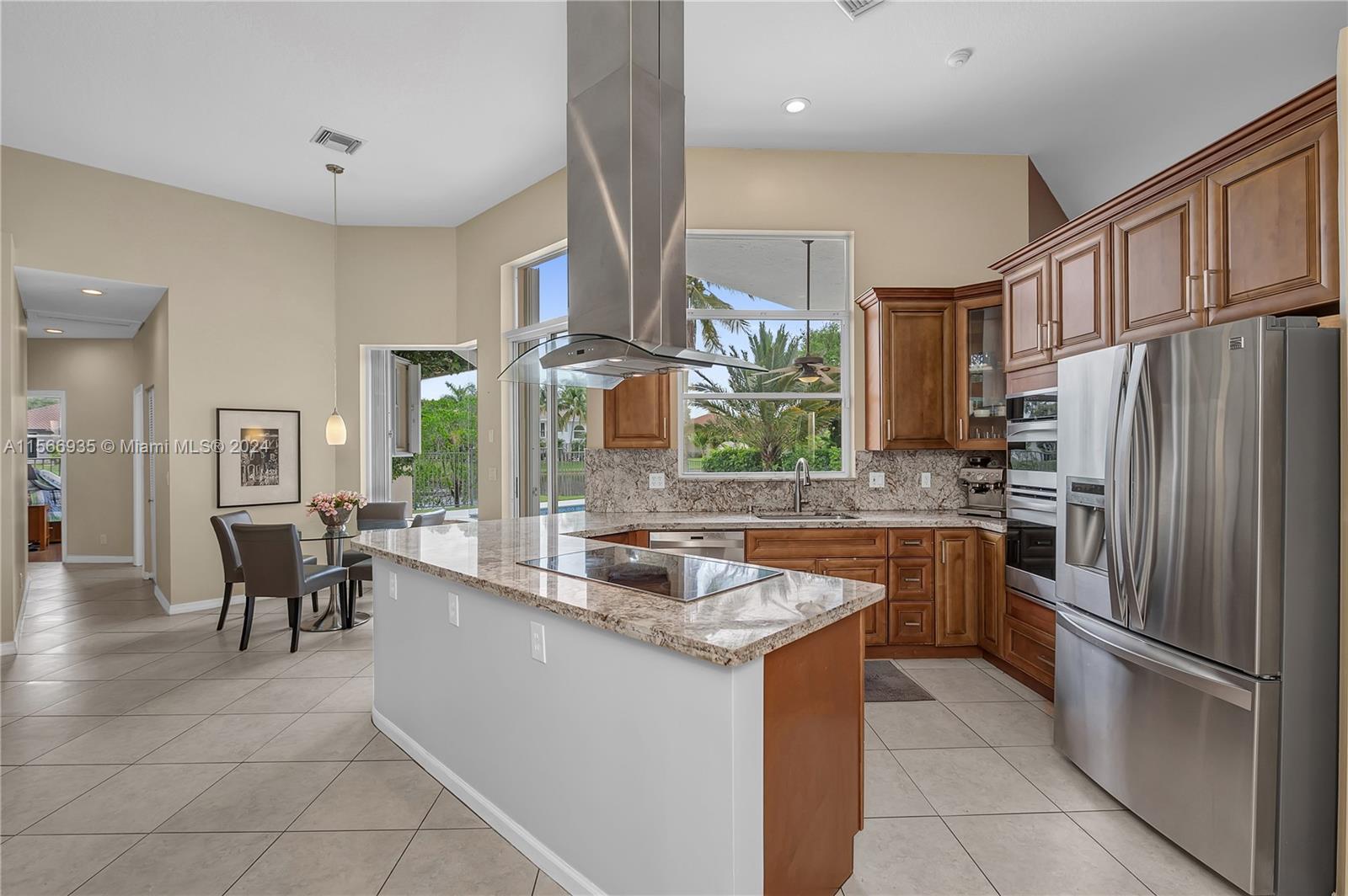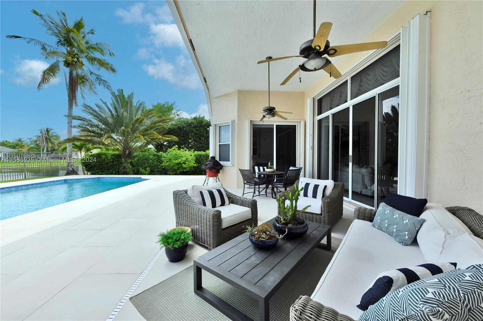 Weston Hills, stunning corner home boasts a single-story layout with 5 bedrooms and 3.5 bathrooms, offering spacious living on an 18,000 sq ft lot. The split bedroom design ensures privacy, complemented by a 3-car garage for ample parking and storage. Upon entry through double doors, you're greeted by an open floor plan that seamlessly integrates indoor and outdoor living. Enjoy picturesque views of the lake, pool, and sunrise from every angle. The pool and deck have been remodeled, featuring a saline system for added luxury. Inside, the kitchen has been updated, while newer roof, accordion shutters, and impact garage doors provide security and peace of mind. Tile flooring graces the living areas, while laminated floors add warmth to the bedrooms. Excellent school system.