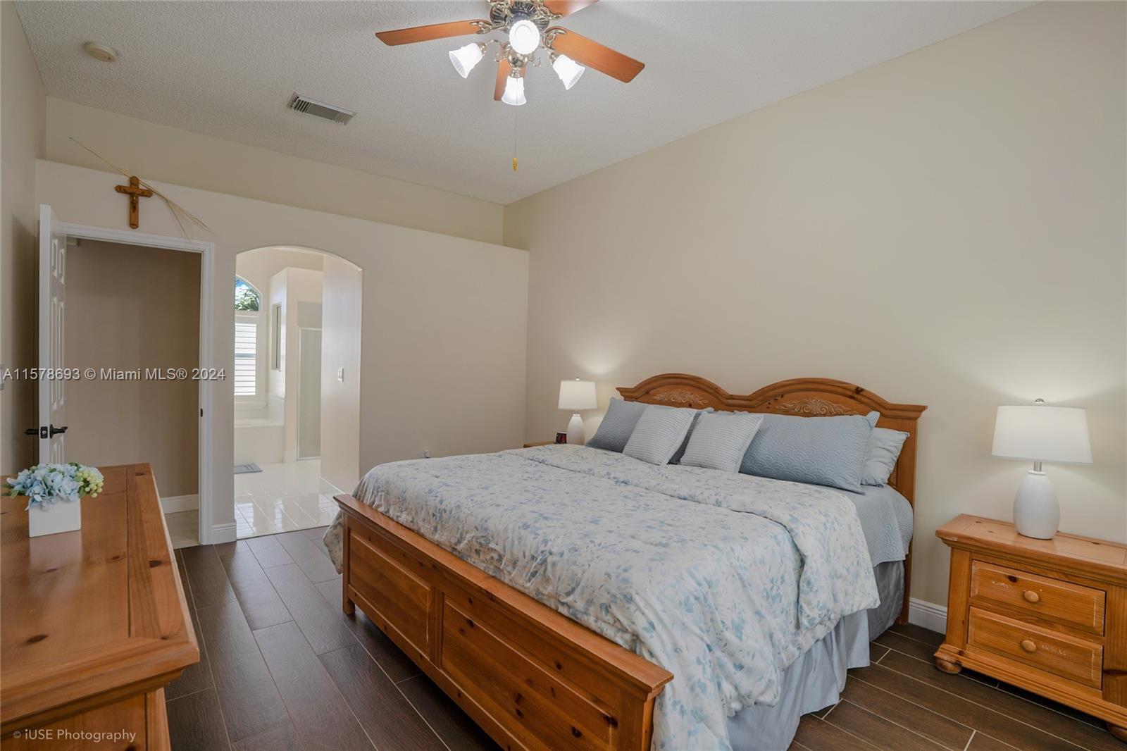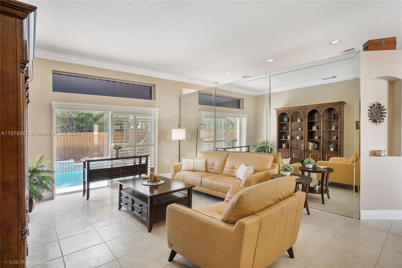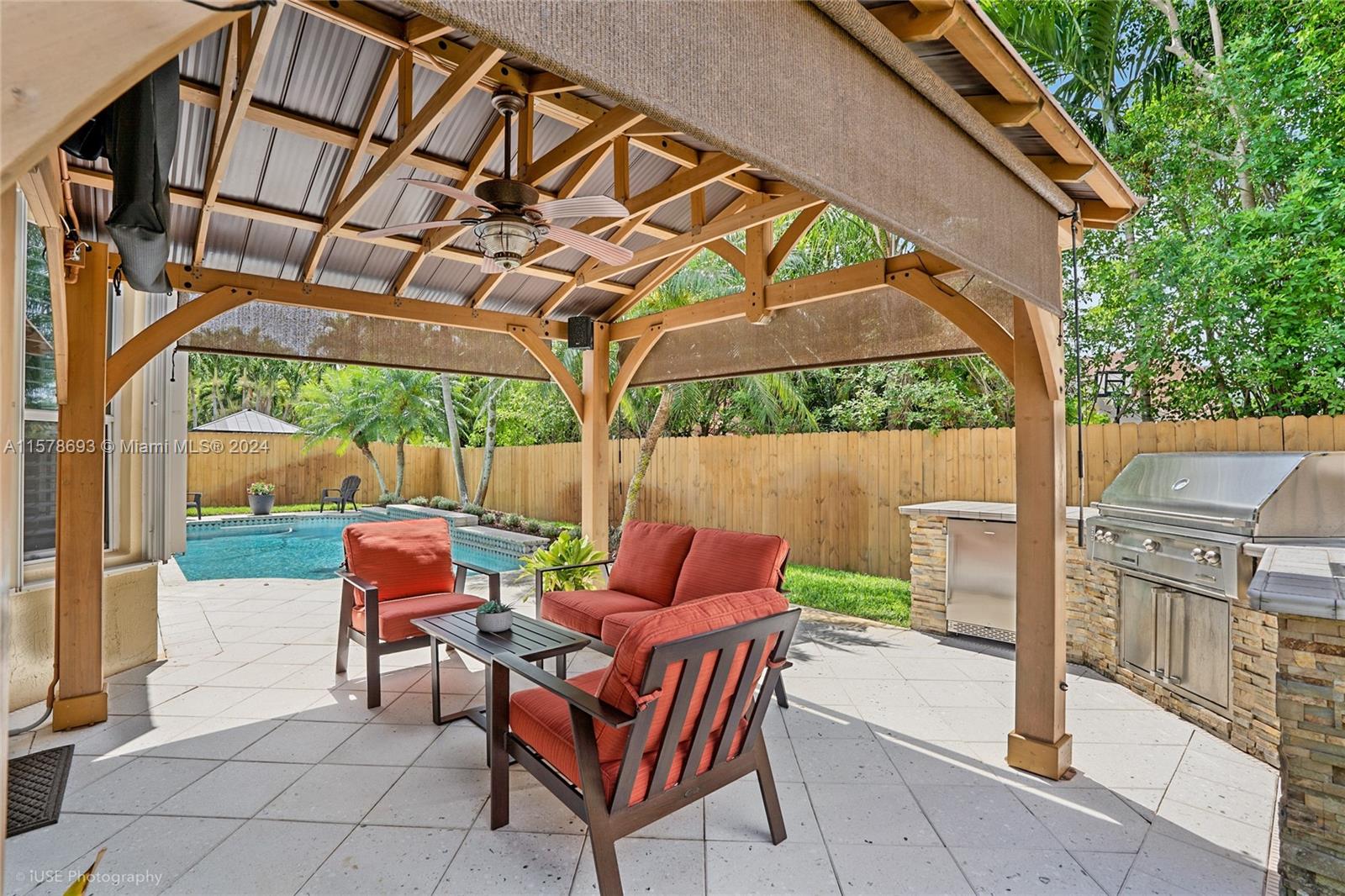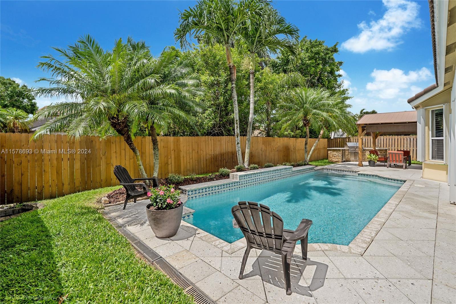 Welcome Home! This home is move in ready! Immaculately maintained, Original Owner. This 1-story, 3/2 Single Family Home Boasts a Backyard Oasis with Pool, Gazebo, Outdoor Kitchen, Palm Trees and 6 Ft Fence. 2024 New Roof, Exterior Painted Exterior 2024, A/C (2019), Plantation Shutters, Accordian Shutters and Security Lighting. Large driveway, 2 Car Garage and nearby guest parking spaces provides for plenty of convenient parking while entertaining. Master bedroom has walk-in-closet, his and her vanity, separate shower & roman tub. Renovated Kitchen and Bath. Home is surrounded by well maintained landscaping and privacy. Low HOA Fees. No HOA Buyer approval. HOA includes basic cable and internet through Comcast.