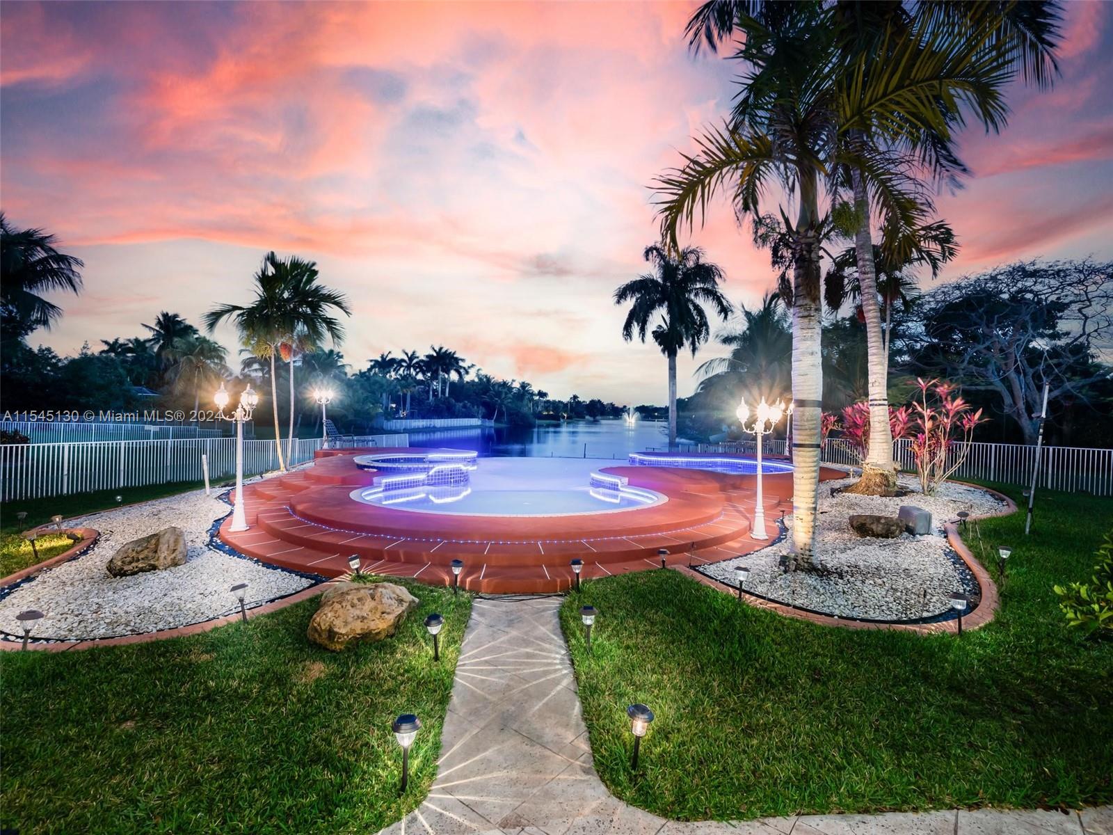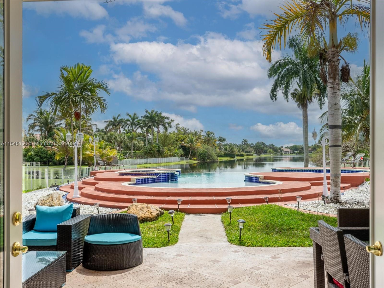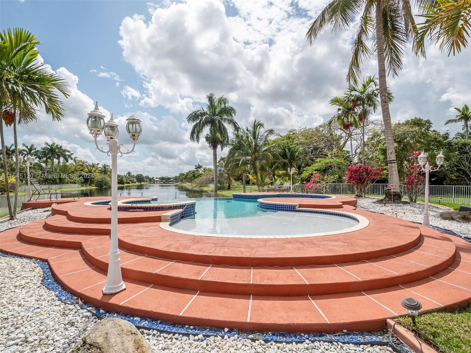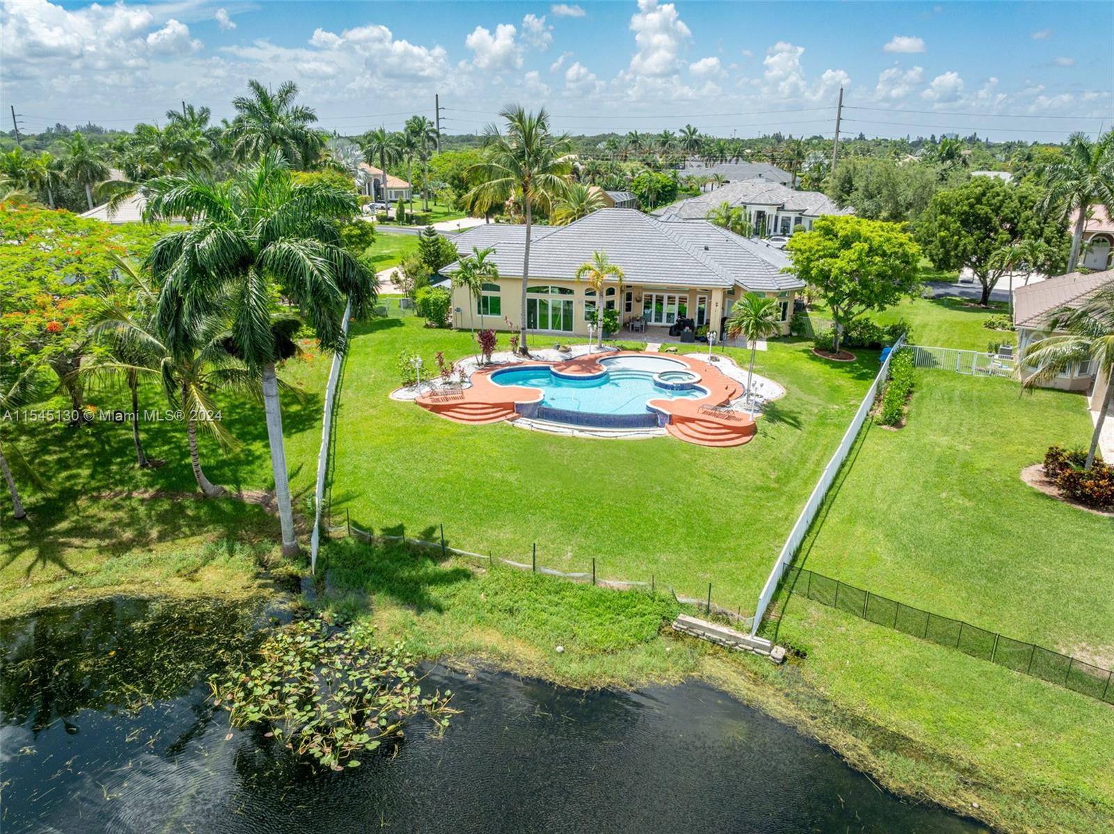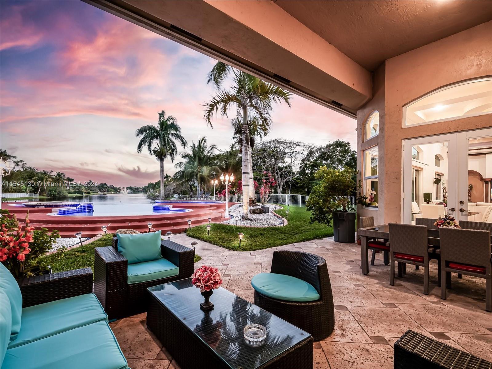 Experience luxury living in this stunning one-story home in the prestigious Emerald Springs gated community (only 74 homes). With 7 bedrooms, 6 bathrooms, a large office & a wet bar, this property offers ample space for large families. Almost 5,000 sq ft of open concept living space on a 35,054 sq ft lot. Infinity pool with a spectacular lake view. 14' ceilings & marble floors. Contemporary wood kitchen, granite countertops and Subzero fridge. Impact doors & windows. Tankless water heater & security system. 3 car garage (w/AC) & space for 15 cars. New roof is being installed. Low HOA dues. 165" IMAX Surround home cinema system negotiable. Gym equipment included. Newer AC units. Automatic sprinkler system. Perfect location near major highways, shopping & entertainment. A delightful living!