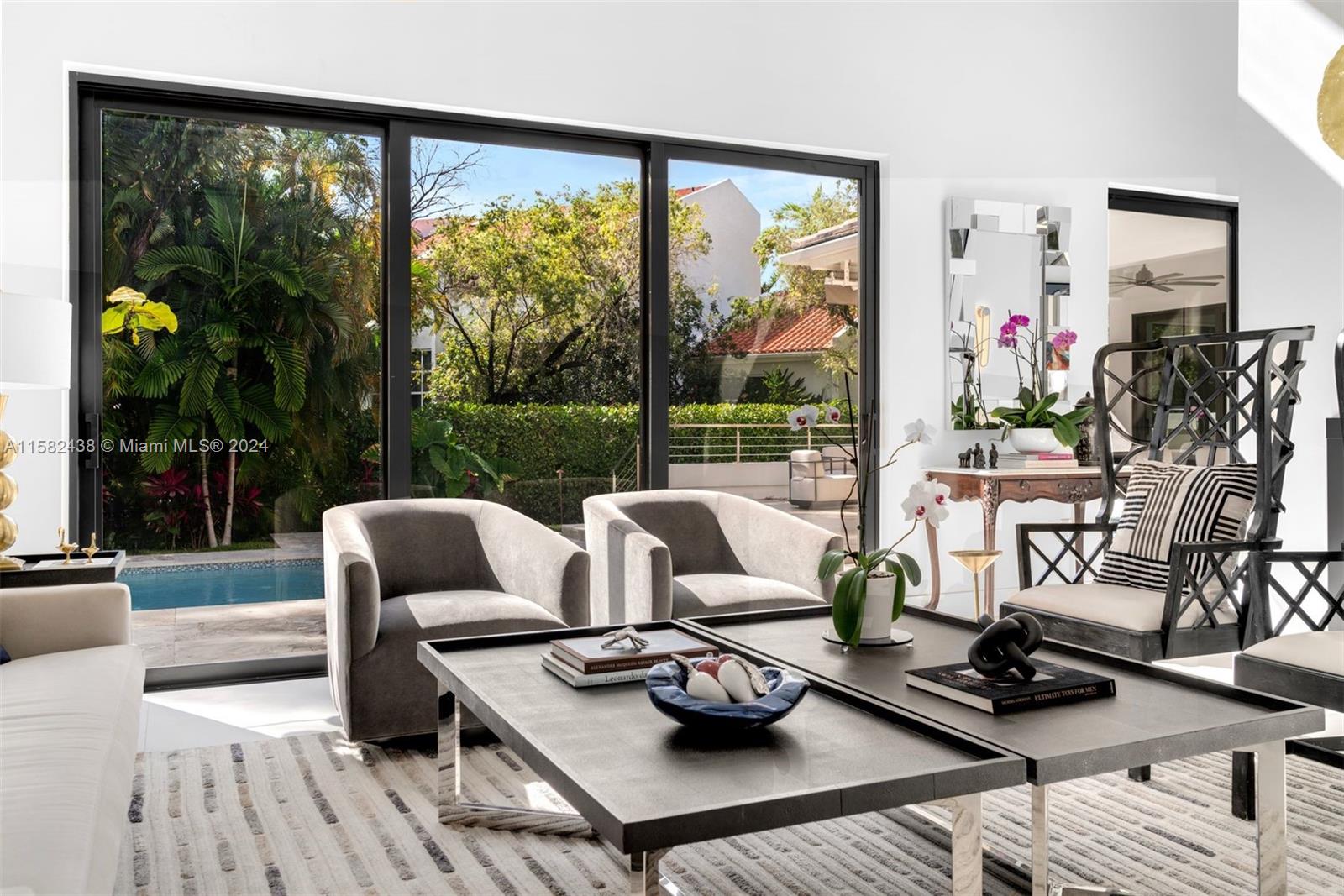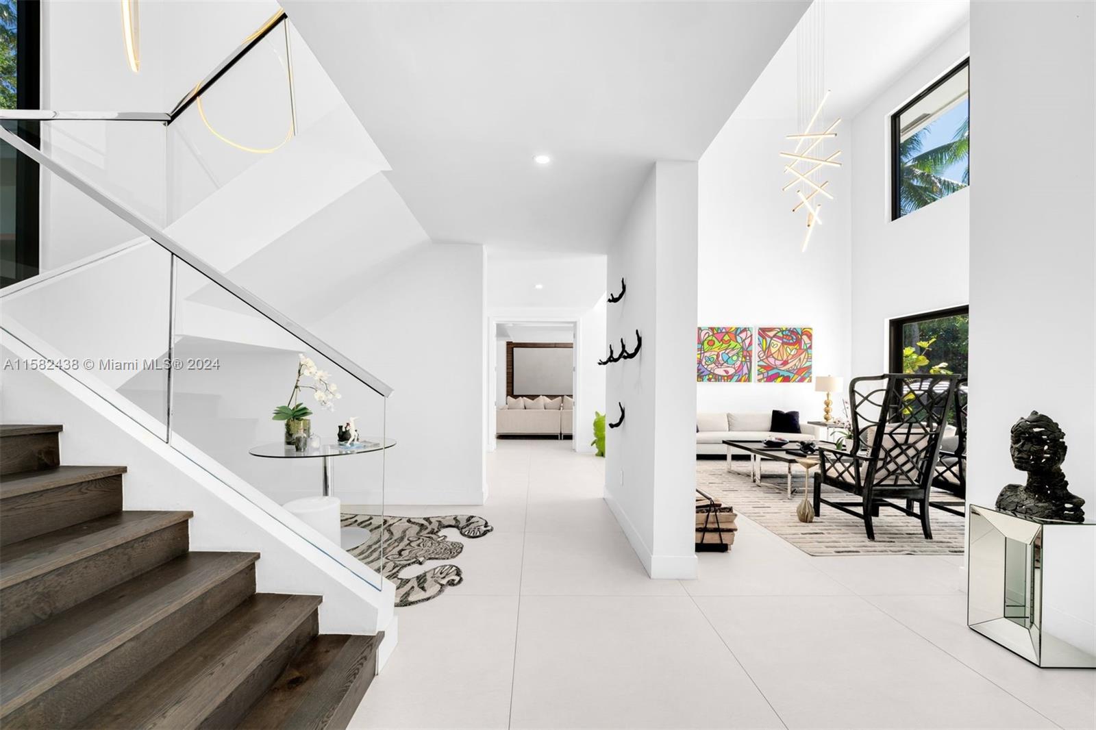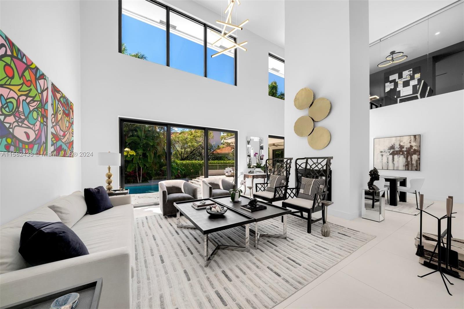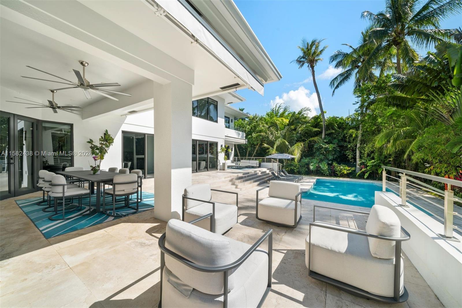 Contemporary 6,760 SF residence with 5 BD and 5.5 BA on a sizable 18,055 SF lot, in the highly sought-after gated community of Cocoplum. Substantially remodeled in 2021, the two-story home showcases voluminous ceilings and an open layout offering plenty of natural light. The gourmet eat-in kitchen features custom floor-to-ceiling cabinetry, ample storage, gas range, high-end appliances, and Grohe carbonated water filter system. The kitchen and family room open seamlessly to outdoor entertainment areas and a beautiful backyard, including a pool with jacuzzi, terraces with retractable awnings, summer kitchen, and stunning tropical landscaping. Additional features include impact windows and doors, office with glass enclosure, media room, and 2-car garage with epoxy flooring.