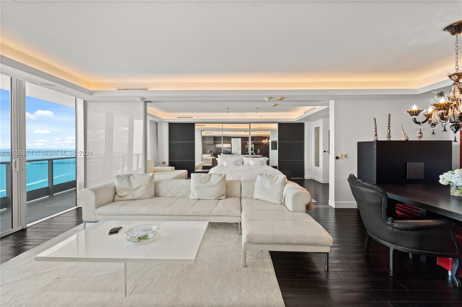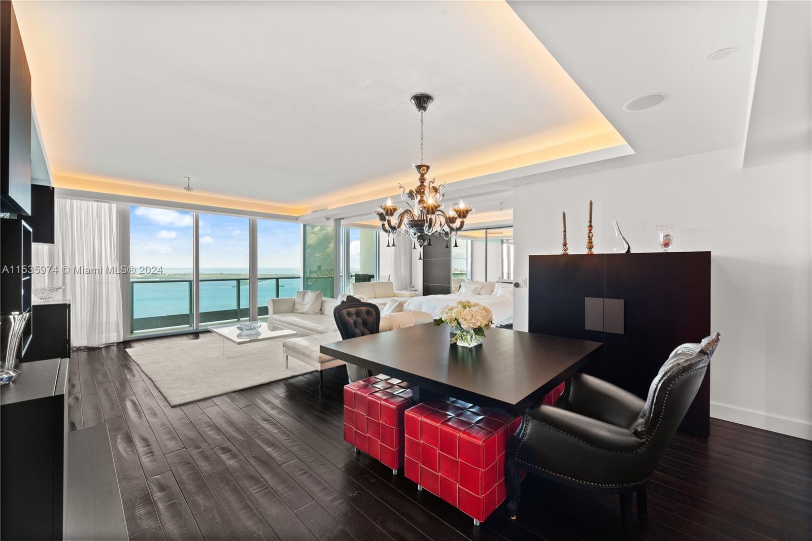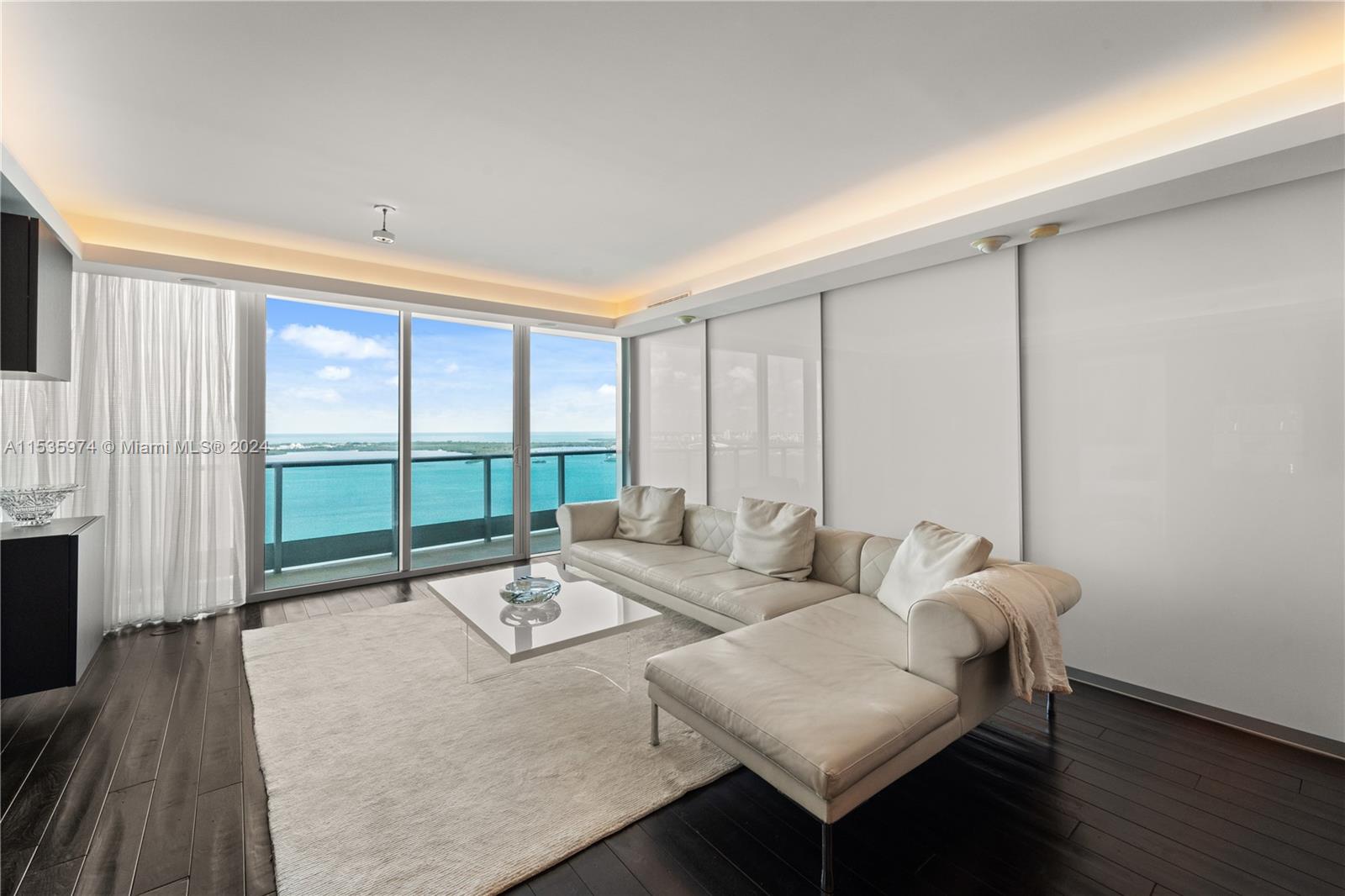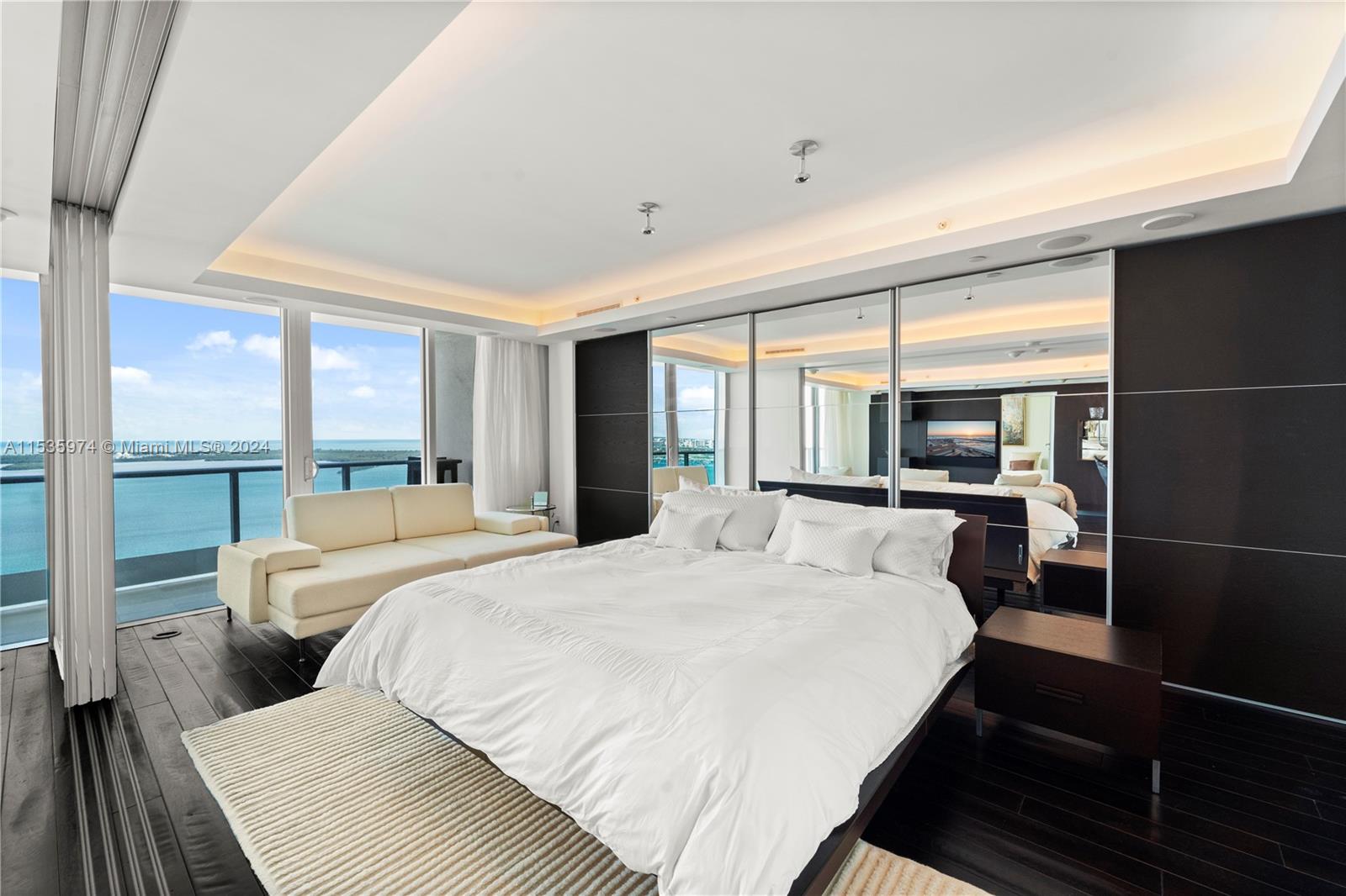 Priced to sell! Tessi Garcia designed turnkey 2Bed+Den 3Bath with breathtaking water views located right on the bay in the heart of Brickell. This unit features dark wood floors throughout, floor-to-ceiling high impact-resistant windows, 10 foot ceilings, master bedroom with illuminated king size bed and sliding glass door system to keep the bedroom exposed or private, built in closets, glass-enclosed shower in master bath and jacuzzi with marble floors. Kitchen with high-end appliances by Sub-Zero Miele, Italian wood cabinetry and cappuccino maker, WD. Lutron lighting system, remote control Hunter Douglas shades and more. 1 assigned parking space right off the lobby, 1 valet space and 1 storage cage. Full service amenity style building.