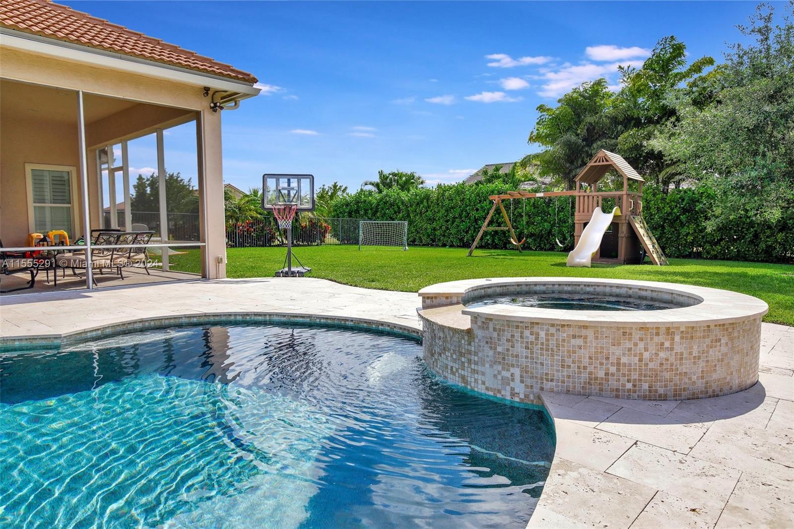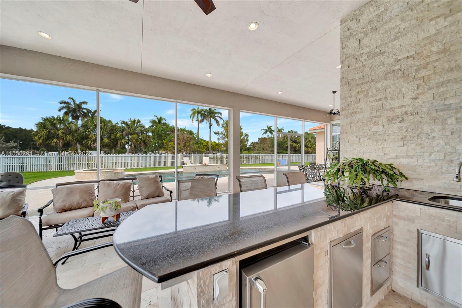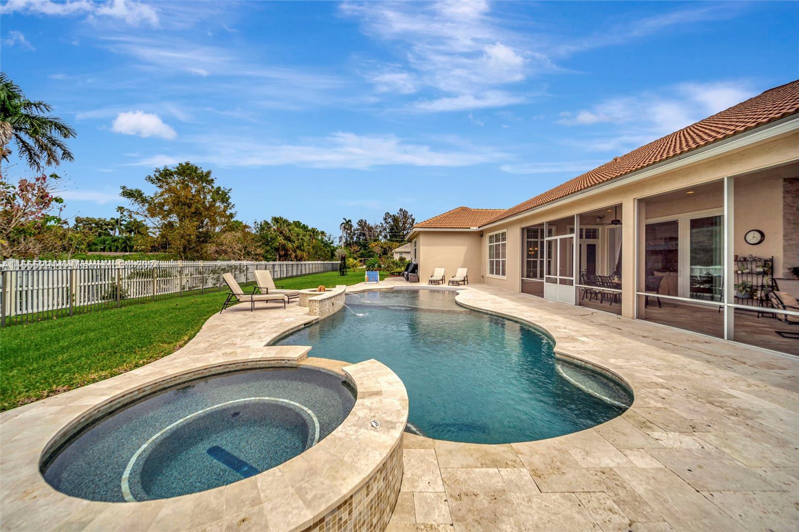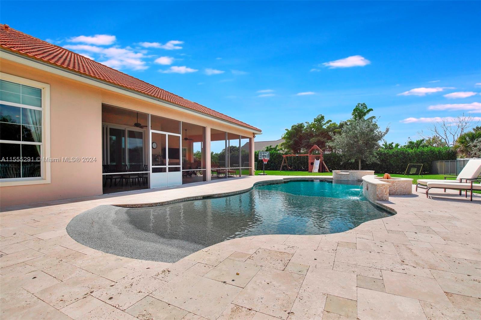 Hawthorne model on .80 acre has 4 bedrooms, office, and flex space is spacious and versatile. Those 4.5 baths definitely make mornings a breeze. Chef's kitchen with granite tops, GE Monogram appliances are a dream for anyone who loves cooking. Ample storage, keeping everything organized. Outdoors is a true oasis with beach entry saltwater heated pool, raised spa surrounded by travertine. Screened patio with an outdoor kitchen is perfect for enjoying year-round. Hurricane impact windows; dedicated power outlet for a generator provides peace of mind during storm season. HOA fee covers amenities of alarm system and lawn care. Living in Sterling Ranch is luxurious and convenient. Fantastic location near major highways and attractions. Home is an incredible opportunity for luxury living.