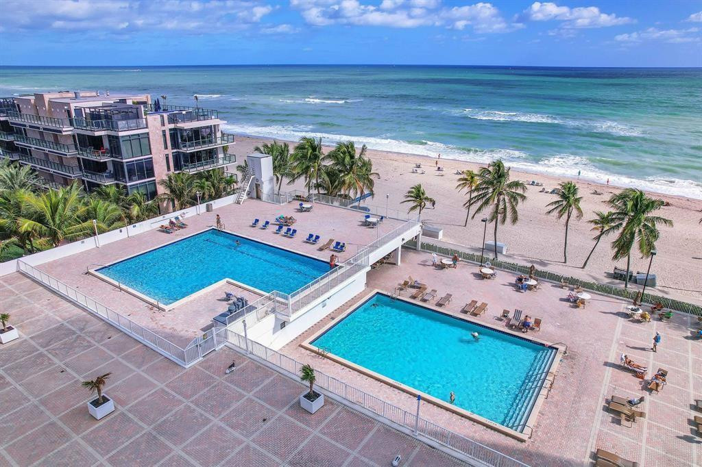 Sellers will consider a 5k credit towards buyers new floors. Owners are encouraging offers...EXTREMELY ATTRACTIVE PRICE REDUCTION. Perfect canvas!! Make this beach front building your own beautiful home or getaway. This one bedroom two bath condo in the Quadomain building 2201 is located directly on Hollywood Beach with resort style amenities: two pools, wide open deck area, gym, spa, restaurant, valet parking, secured entrance, activity room, activity committee keeping all residents active throughout the year, all age building, 40 year certification completed, additional improvement are in the works, this unit comes with a deeded parking space, which is covered. New Publix in walking distance, Casino Horse track, mass transit, Vacant and easy to show.