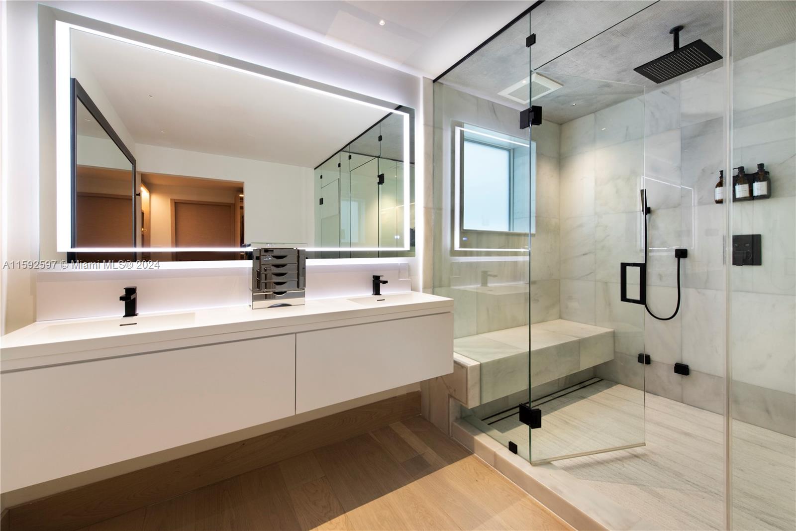 Palau Penthouse-7 has a total of 3,580SF of glorious in/outdoor living space in the blossoming Sunset Harbour neighborhood. Radyca design team spared no expense remodeling this 3 bedroom 2.5 bath 1,850SF beauty. Custom millwork throughout, European Oak floors with Porsche downlighting. Primary bath is a marble spa with steam shower and custom cabinetry. A floating staircase leads you to the crowning glory of a 1,730-SF private rooftop with an Aquatica hot/cold plunge jacuzzi, Barcelona imported summer kitchen, yoga decking lounge area, mosaic designed black and white floors, surrounded by lush planters with irrigation for privacy. Palau is an exclusive boutique building in the heart of all the action with full amenities. 24-hour security & valet. Easy to show!