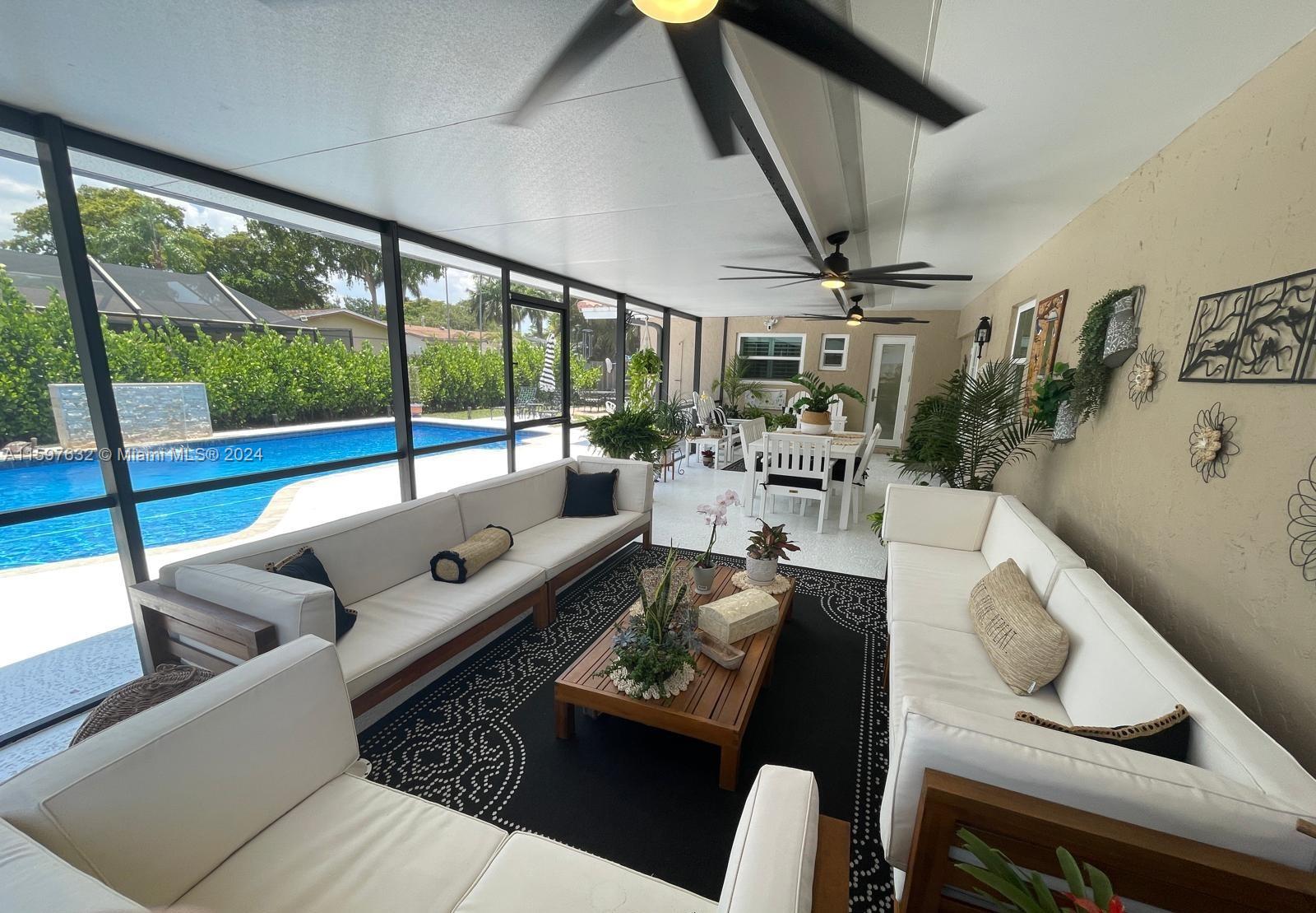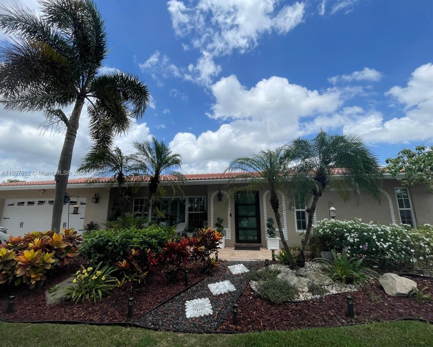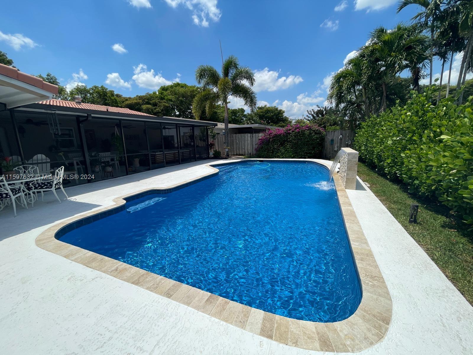 Indulge in luxury living with this stunning 4-bed, 2-bath home boasting a pristine pool & captivating waterfall feature. Meticulously renovated, the gourmet kitchen showcases quartz countertops & stainless steel appliances, ensuring every detail exudes opulence. Whether hosting lavish gatherings in the expansive living room or enjoying outdoor bliss on the lanai overlooking the 8-ft-deep crystal-clear marcite pool, complete with a convenient cabana bathroom, every moment is imbued in elegance. Retreat to the private master en-suite with walk-in closet, while the split bedroom layout offers both comfort & privacy. 2-car garage featuring laundry facilities & extra refrig, everyday living is effortlessly elevated. Near shopping, fine dining. NO HOA. Welcome home to unparalleled luxury.
