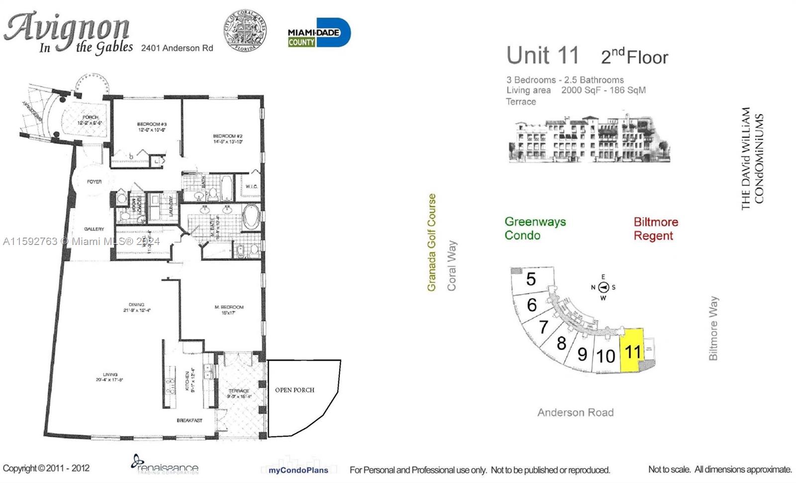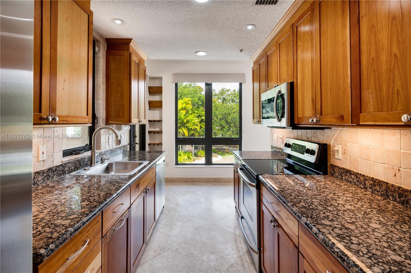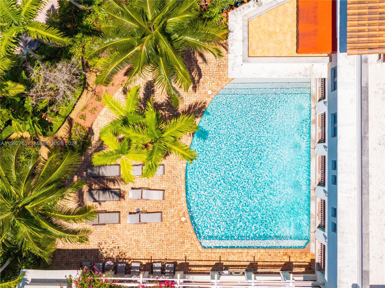Make your home in the epicenter of the City Beautiful in this rarely available unit in Avignon?Coral Gables' hidden gem. Avignon is a sophisticated boutique building on a tree-lined street, a block from Granada Golf course, near famed Miracle Mile, & less than a mile from the iconic Biltmore Hotel. A sprawling 2,000 sq ft unit awaits with its roomy 3 beds & 2.5 baths. A large, covered terrace allows for family dinners alfresco, & continues with an open veranda overlooking the picturesque pool, with entertaining spaces & bougainvillea-adorned pergolas. Impact doors & windows, neutral stone floors throughout, ample closet space, & laundry room complete the space. The building features secure gated entry, 2 garage parking spaces, & gym, making this unit a unique find! A Very Special Home.