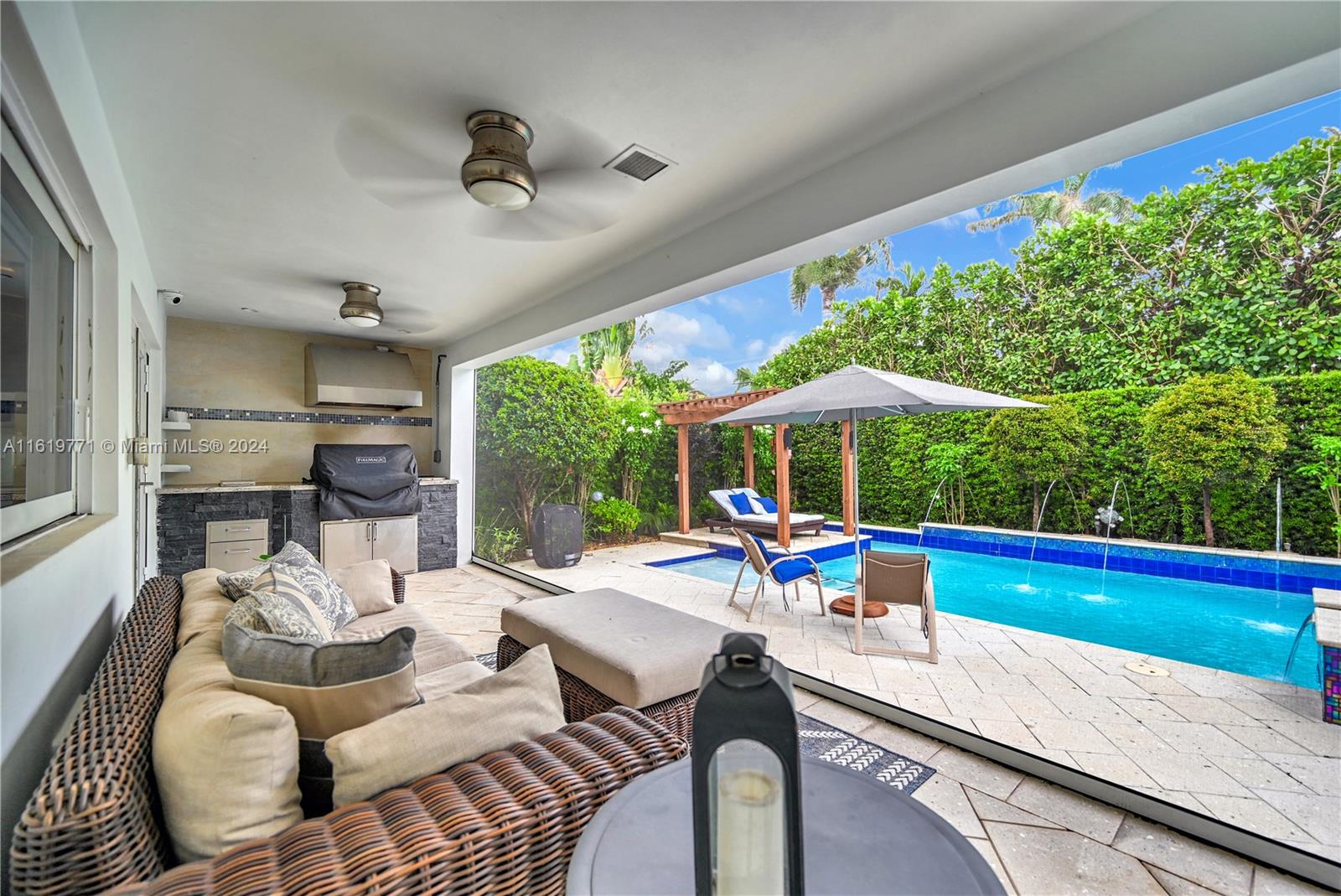 Experience luxury living in this stunning contemporary residence, boasting 5,090 sq ft of sleek & sophisticated space. The open-concept design seamlessly integrates indoor & outdoor living, perfect for entertaining & relaxation. 4 expansive bedrooms, with ample closet space & ensuite bathrooms! Featuring a gourmet kitchen with high-end appliances, center island & breakfast nook. Ultimate convenience with a large & spacious home office & media room. An expansive outdoor living area which has been beautifully landscaped, includes a covered patio & pool deck, outdoor kitchen & adjustable screens complete the lifestyle. This contemporary masterpiece is a true gem, offering the ultimate blend of style, comfort, and functionality.