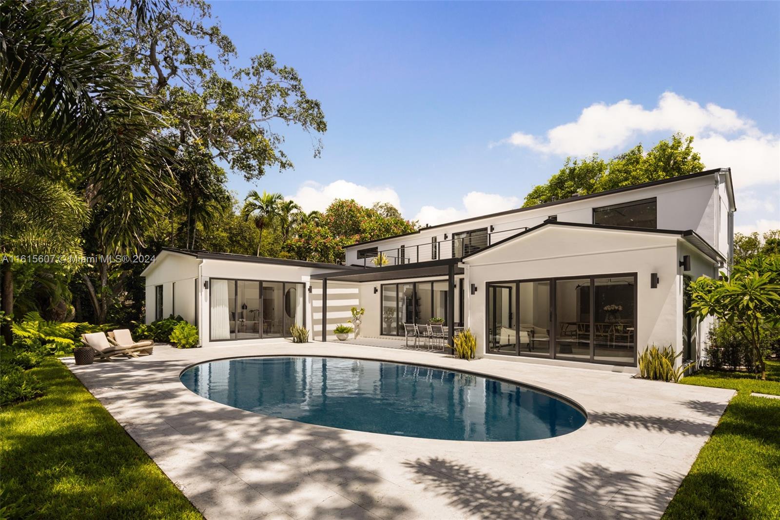 NOW COMPLETED turnkey designer residence in a prime location, nestled on an oversized 10,700SF lot in coveted North Grove. Rare to market gated family home features 5 beds, 5.5 baths, interiors by acclaimed Farache Bromberg Design Studio. Hardwood floors throughout and incredible natural light via bronze windows and sliding glass doors. Custom kitchen with seamless cabinetry, Neolith Travertine countertops and Miele appliances, plus separate dining room. Bathrooms include frameless glass shower doors and floating vanities. Outdoors find ample space for entertaining with a stunning oval-shaped pool, expansive limestone deck, trellis, and lush landscaping. Additional features include meticulous millwork, fireplace, laundry room, garage. Available fully furnished.