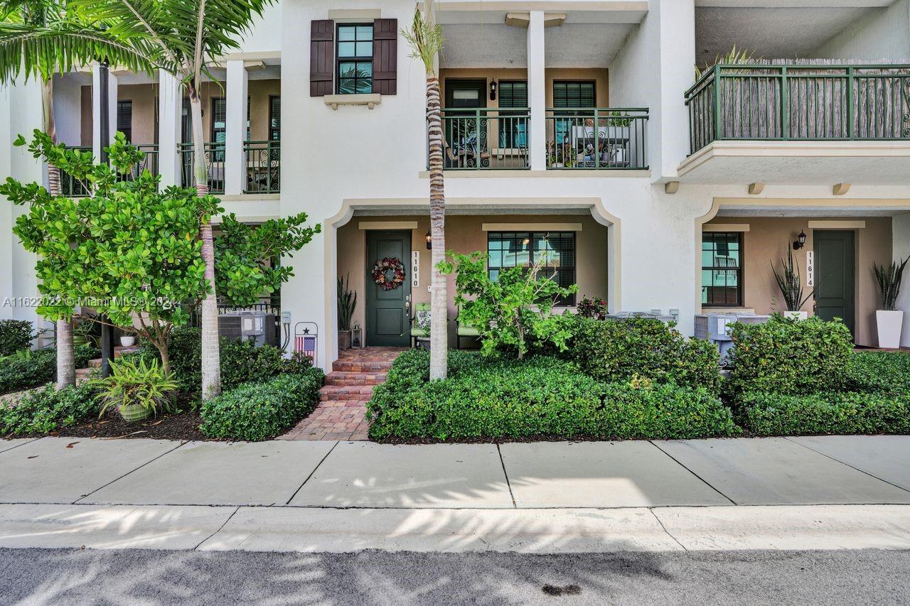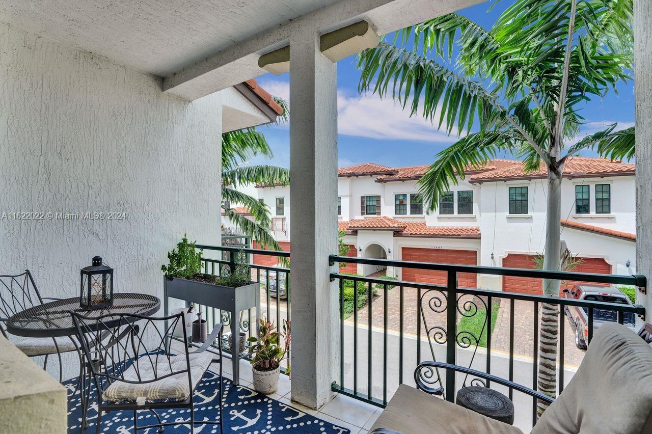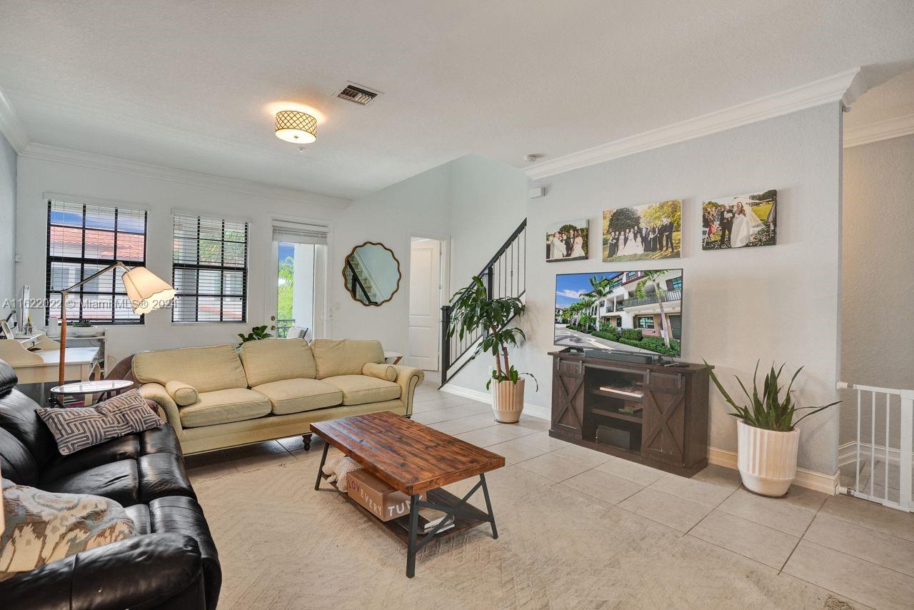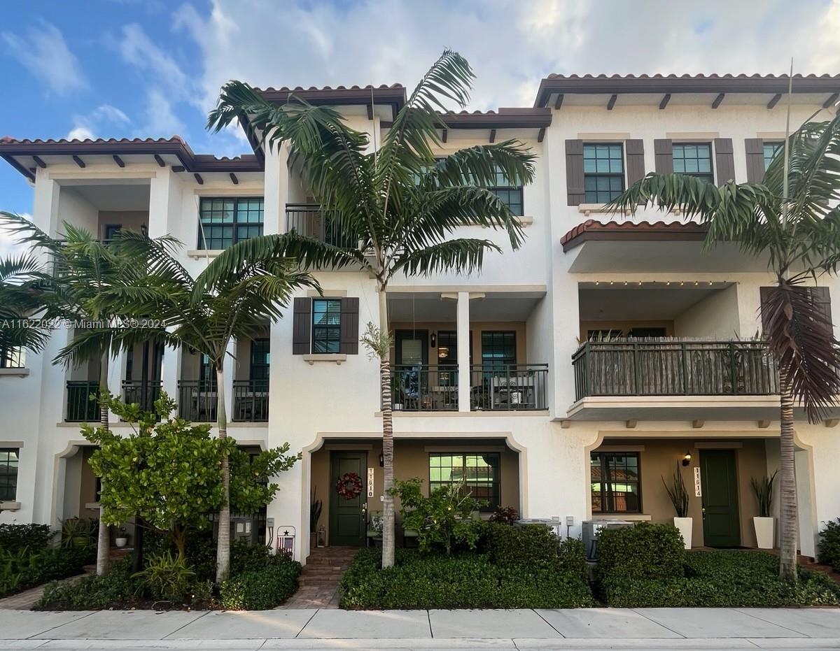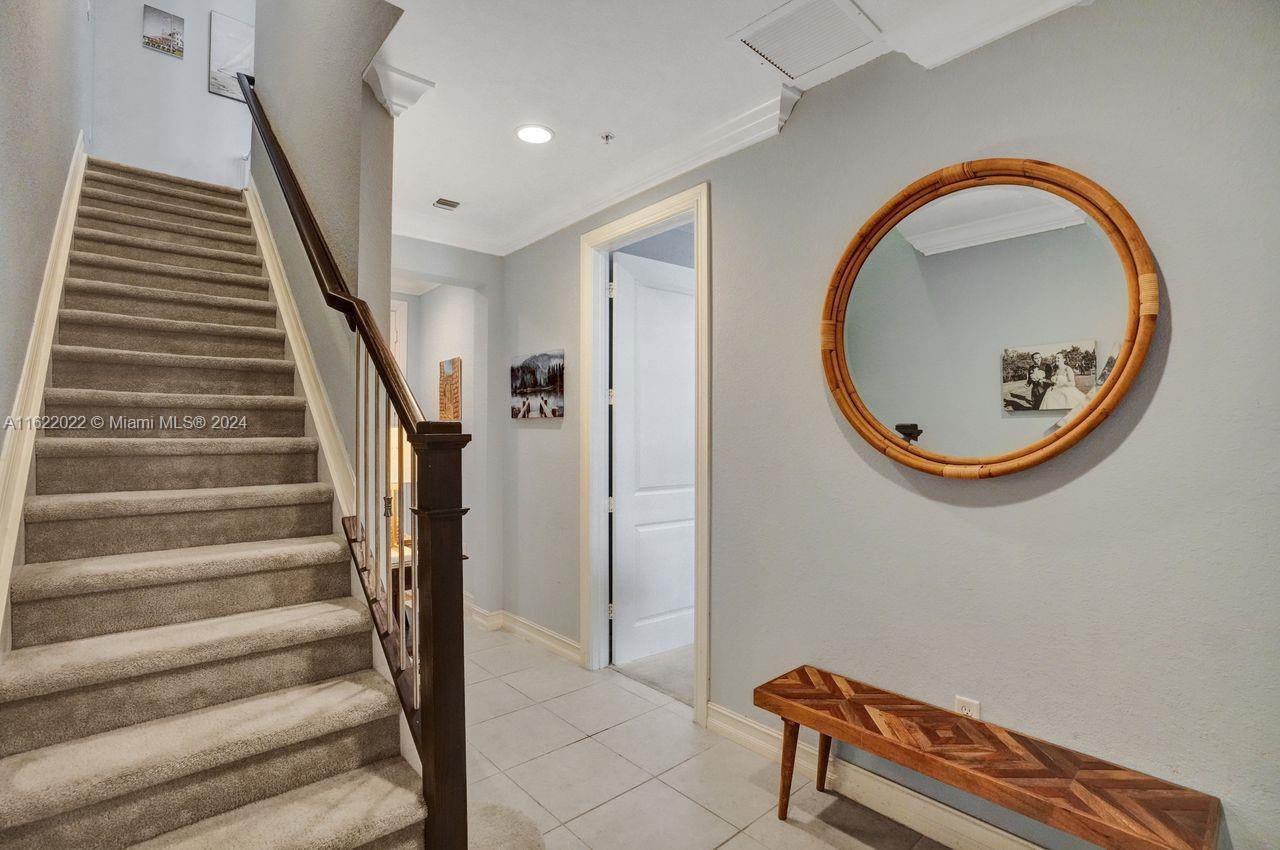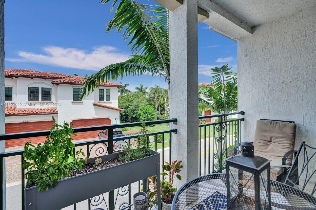 Welcome to this stunning tri-level townhome, in the sought-after community of Raintree. All three bedrooms have their own full bathroom, with a half bathroom in the main living area. The ground level features one bedroom with a walk-in closet. The primary bedroom is on the third level and features a shower, double sink, and a sitting area. The third bedroom has a full bathroom with a tub. Tile and carpet flooring. The kitchen with stainless steel appliances, a cooking island, and a formal dining area. The second and third floor has an outdoor balcony for your own private retreat. Numerous upgrades including custom crown molding throughout the entire home, upgraded staircases and kitchen backsplash. Impact windows. Two-car garage. Amenities include a community pool, clubhouse, and gym.