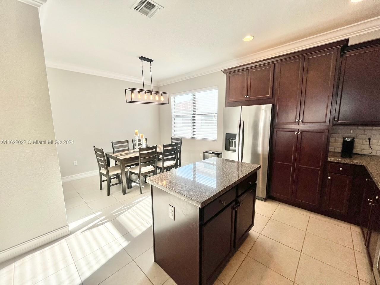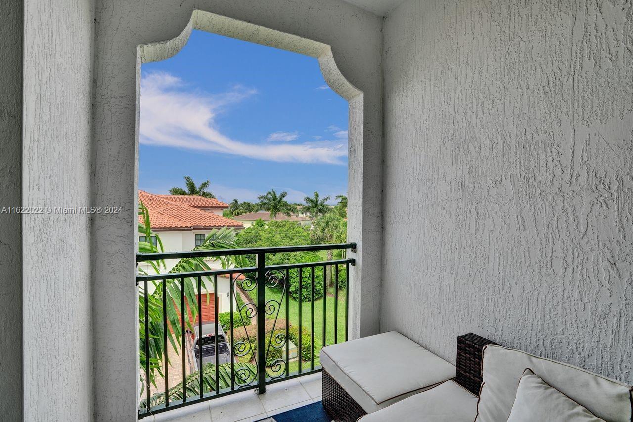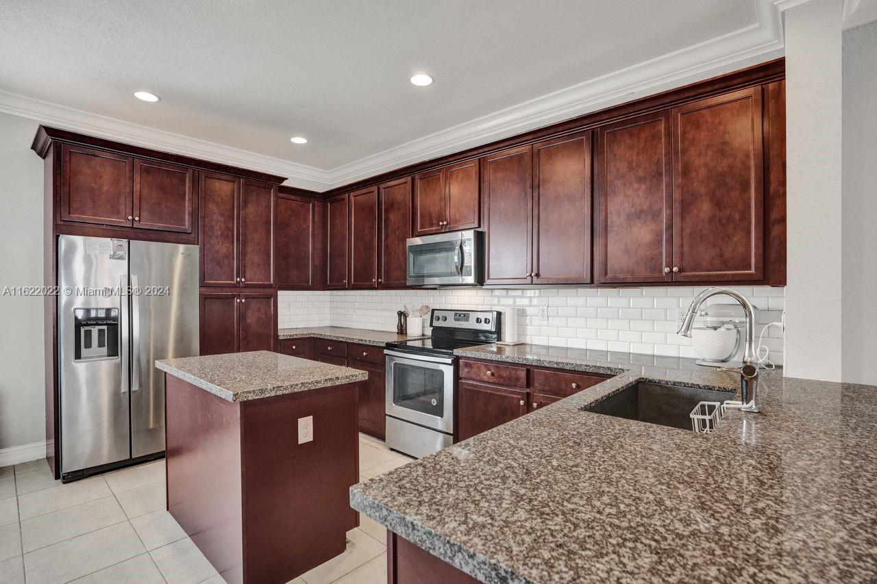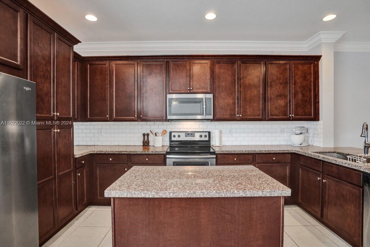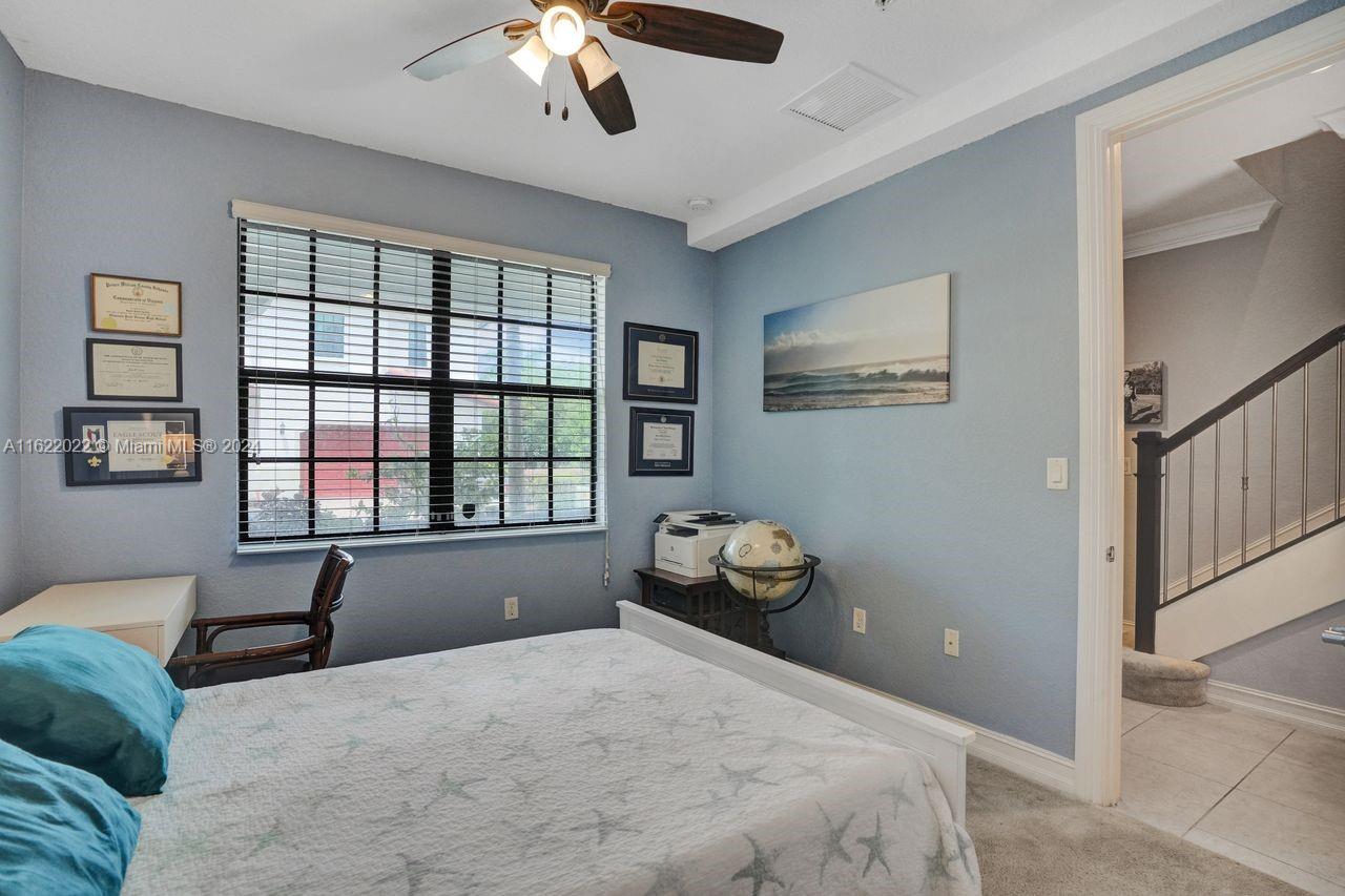 Welcome to this stunning tri-level townhome, in the sought-after community of Raintree. All three bedrooms have their own full bathroom, with a half bathroom in the main living area. The ground level features one bedroom with a walk-in closet. The primary bedroom is on the third level and features a shower, double sink, and a sitting area. The third bedroom has a full bathroom with a tub. Tile and carpet flooring. The kitchen with stainless steel appliances, a cooking island, and a formal dining area. The second and third floor has an outdoor balcony for your own private retreat. Numerous upgrades including custom crown molding throughout the entire home, upgraded staircases and kitchen backsplash. Impact windows. Two-car garage. Amenities include a community pool, clubhouse, and gym.