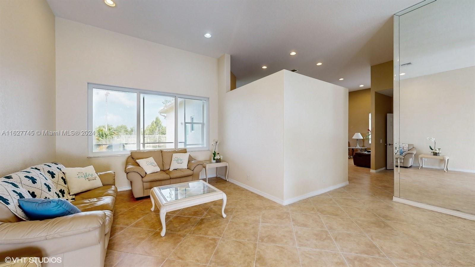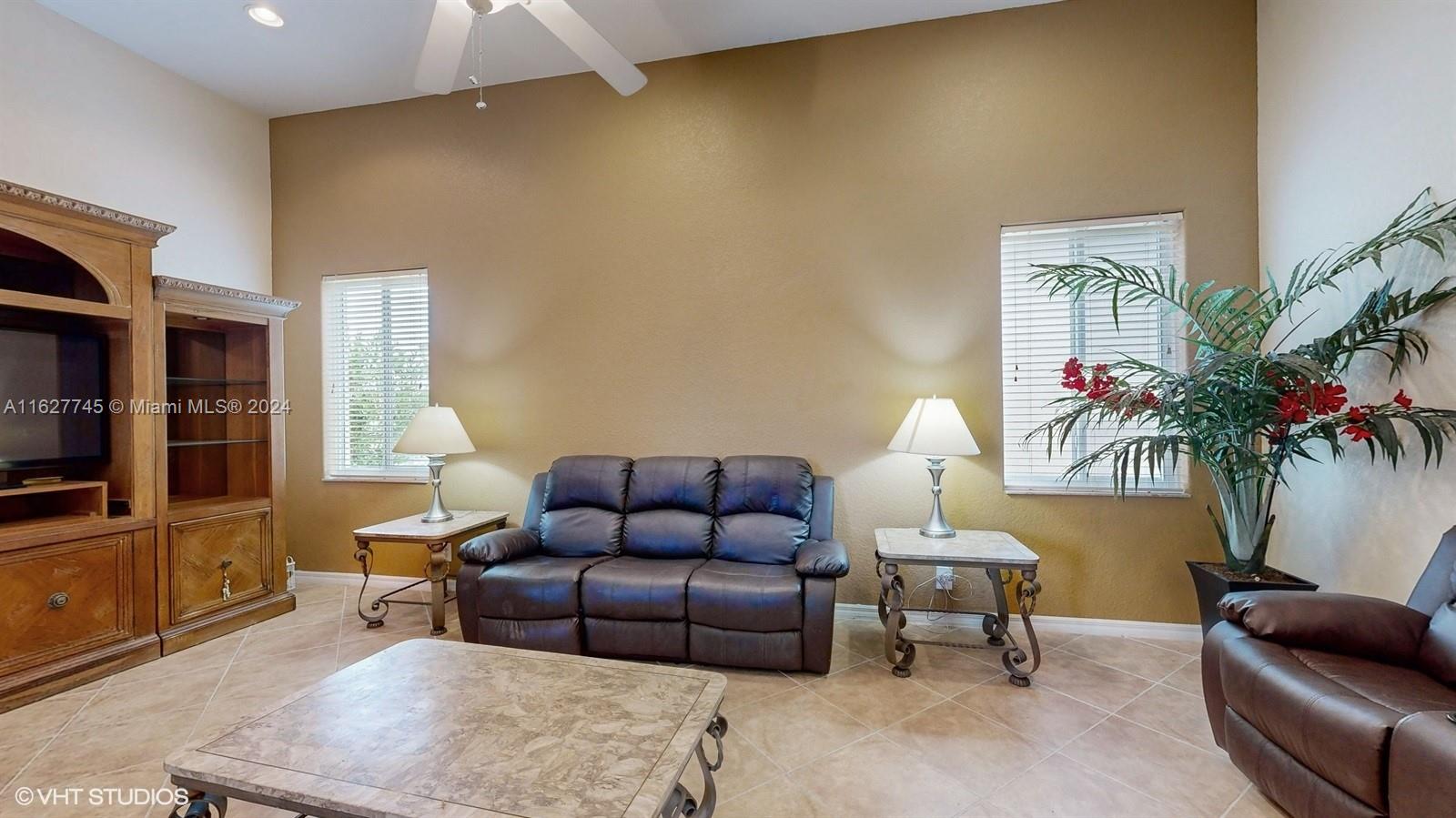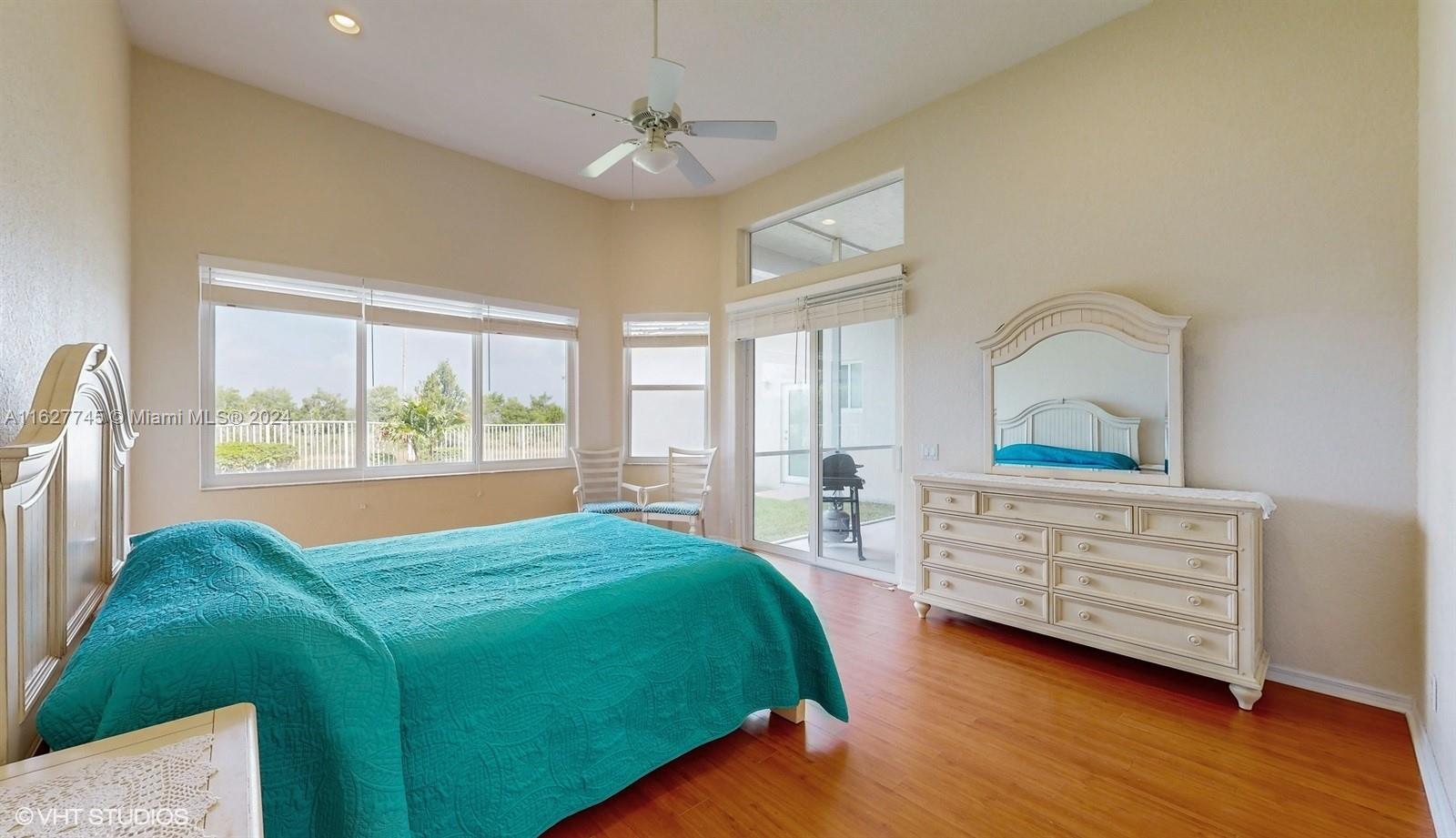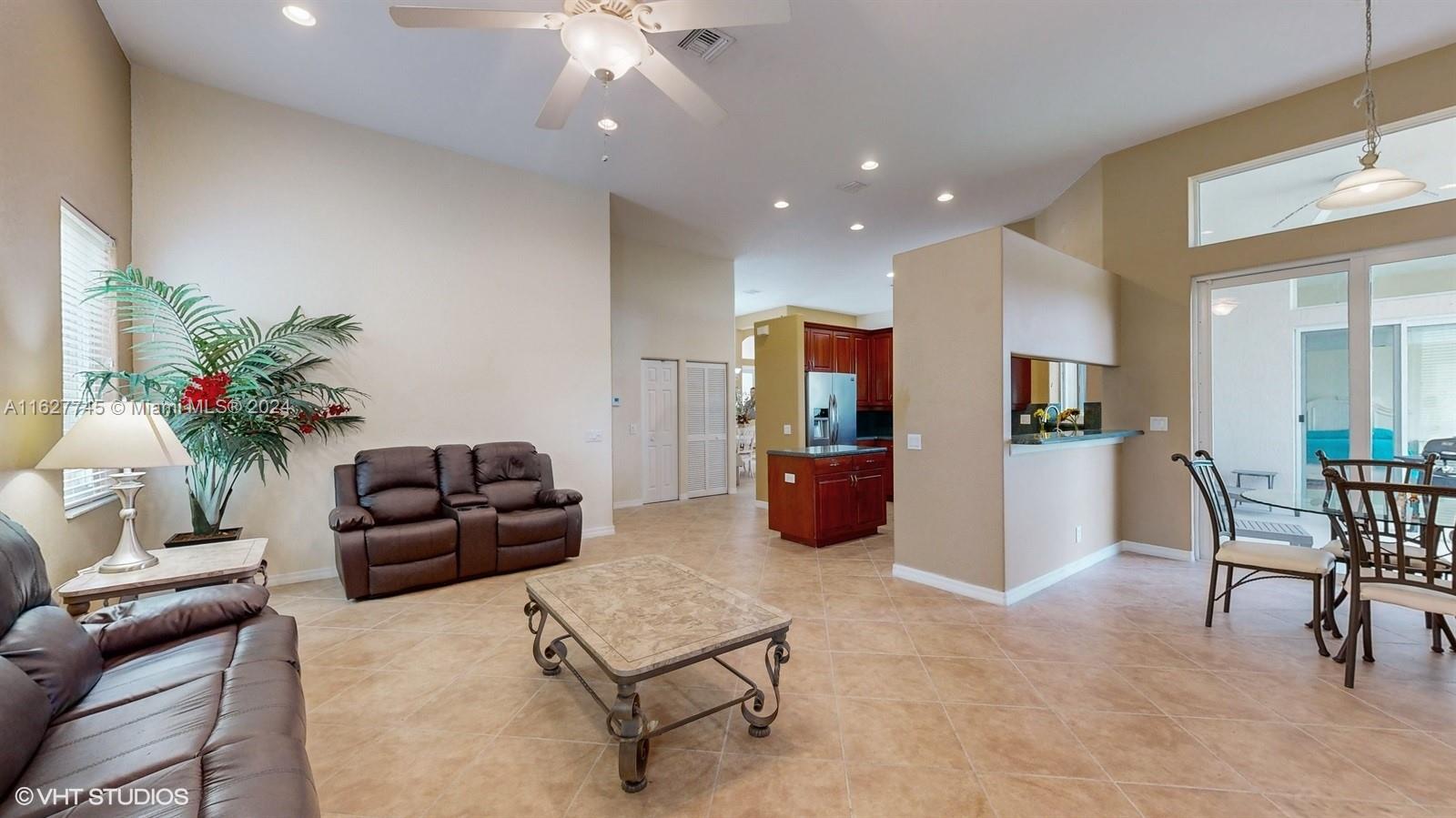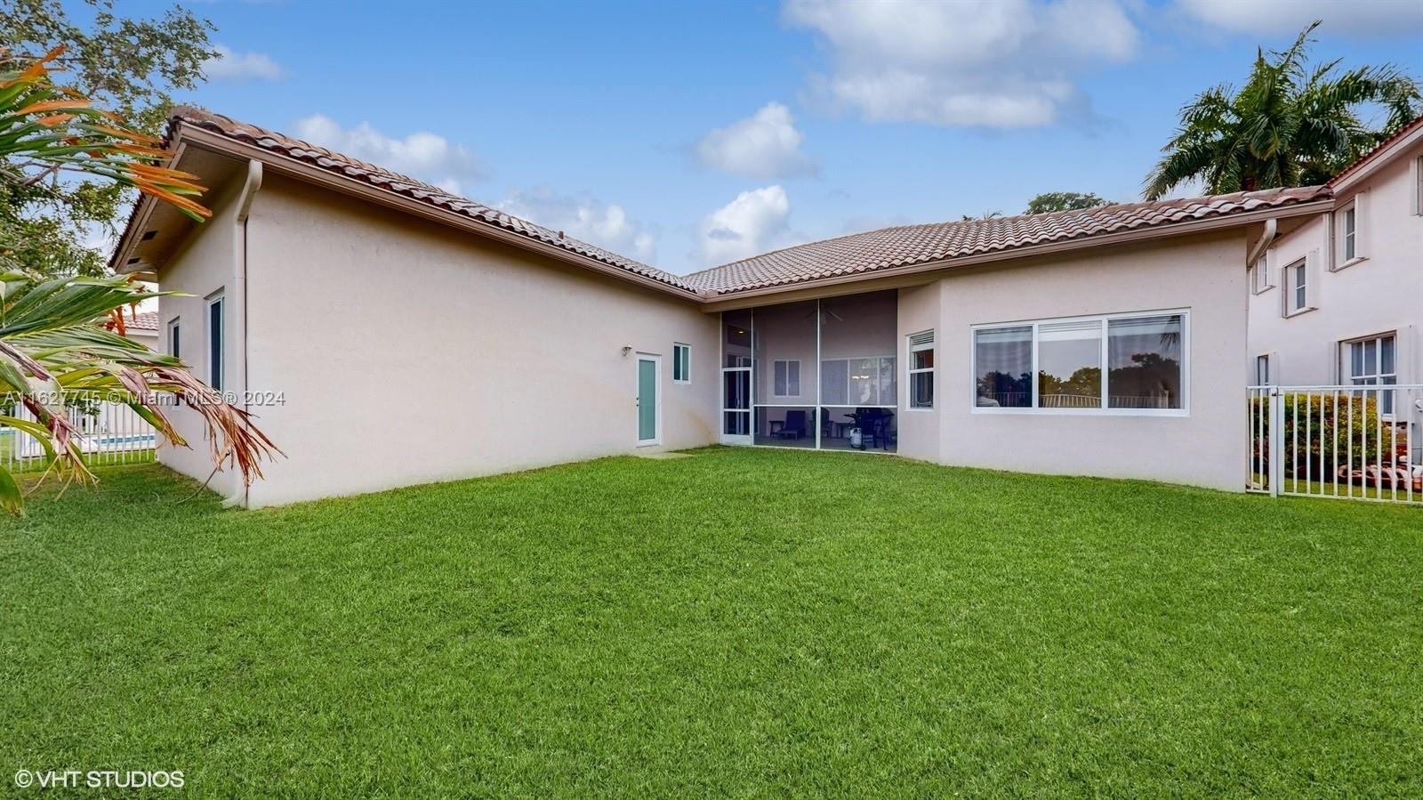 This 4-bedroom plus bonus room, 2.5-bathroom home is a gem located on a picturesque, fenced, waterfront lot overlooking the preserve. Experience breathtaking sunsets from your screened, covered patio. The home features a pavered driveway and front porch. Inside, you'll find a spacious layout with volume ceilings, new hurricane storm windows, and wood kitchen cabinets. There is a formal living room, dining room, and a large family room. The 2-way, split floor plan ensures privacy. There is a laundry room and a 2-car garage. The Savanna community offers the best clubhouse in Weston, complete with a heated lap pool, a huge communal pool and amenities such as miniature golf, a basketball court, a soccer field, roller hockey, a kids' playground, and a cafe. New floors installed in all bedrooms