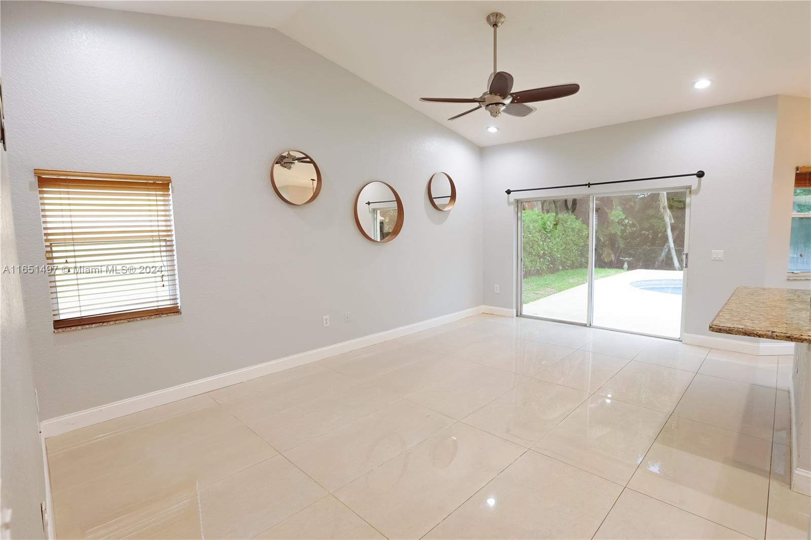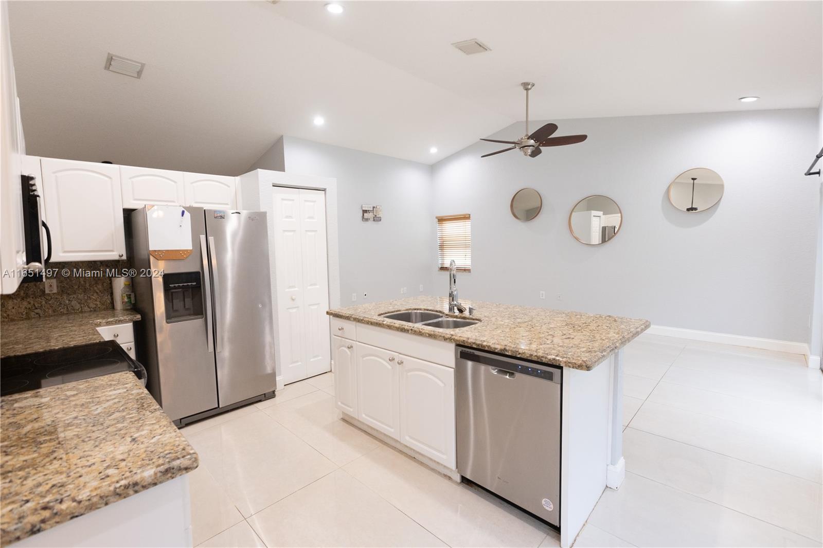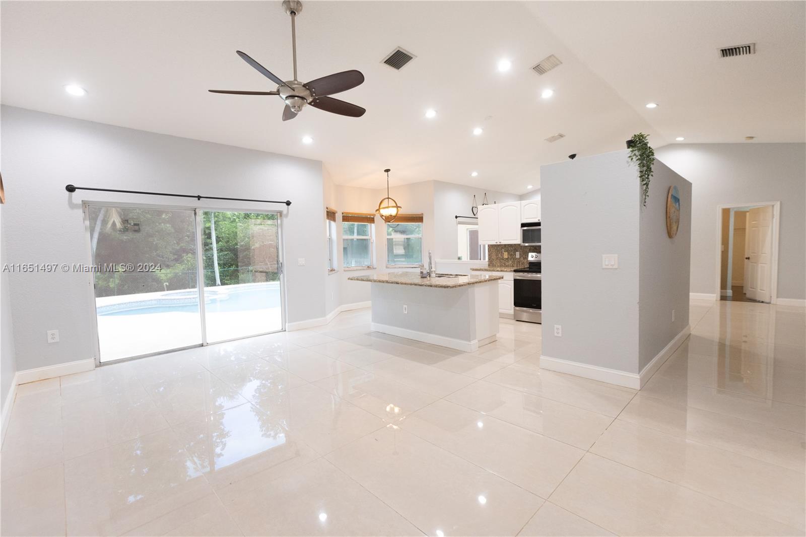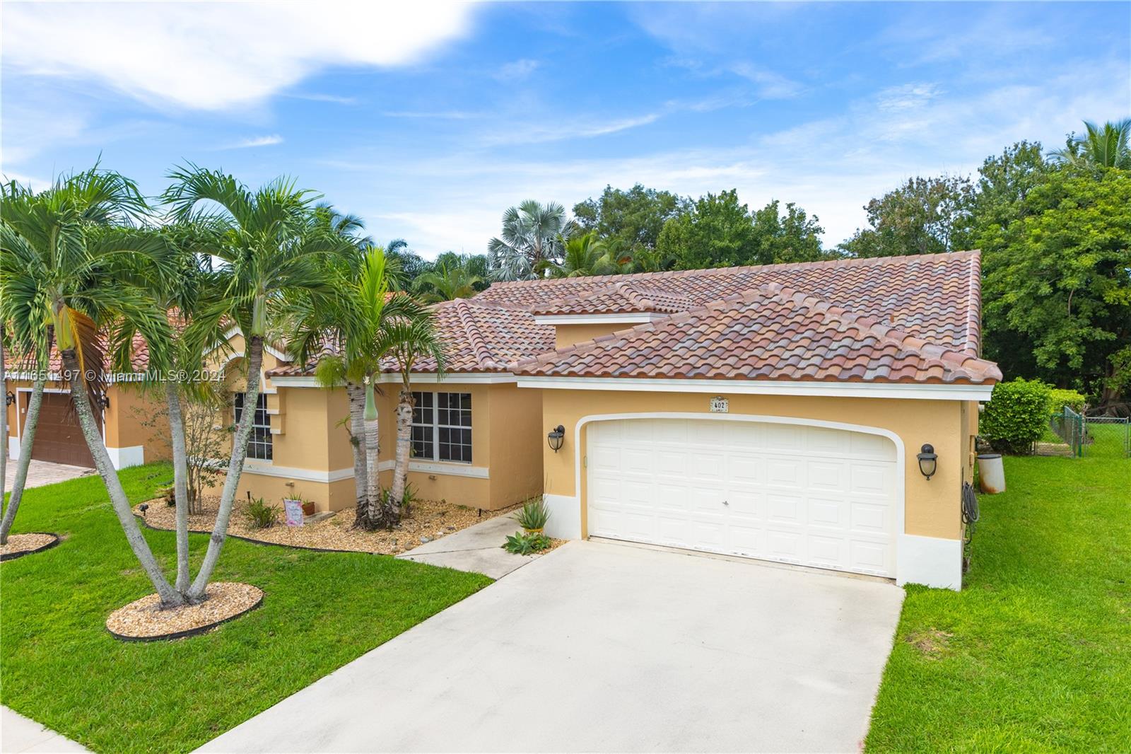 Welcome to Alhambra! This 4-bedroom, 2-bathroom split floorplan provides privacy and functionality, while the open concept living area makes it ideal for both everyday living and entertaining. The property features a brand-new roof (2024) and hurricane panels. Inside, you'll find porcelain tile and laminate flooring throughout. The eat-in kitchen is equipped with stainless-steel appliances and ample counter space. Step outside to your private retreat, where a heated swimming pool and hot tub await, perfect for relaxation and enjoyment year-round. Residents of Alhambra enjoy access to a well-maintained park and children's playground. Top rated schools nearby. HOA $455/qtr. which includes cable/internet, maintenance of common areas & sprinkler system.