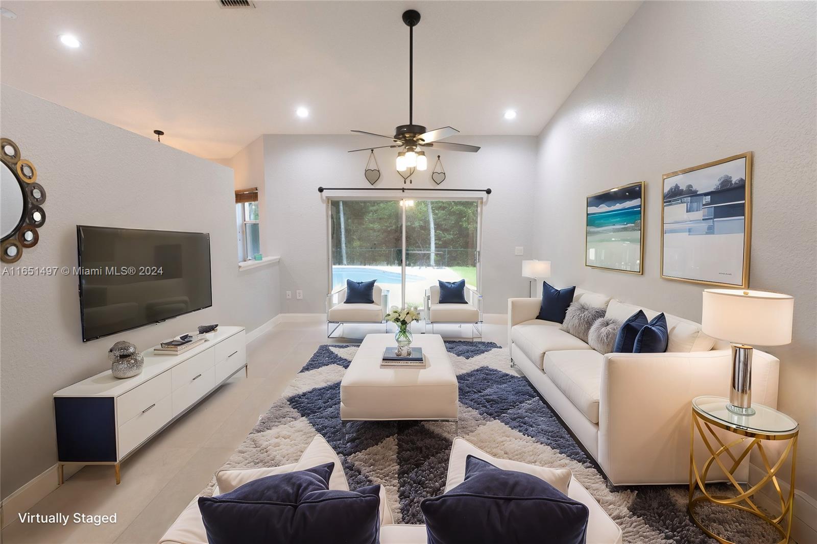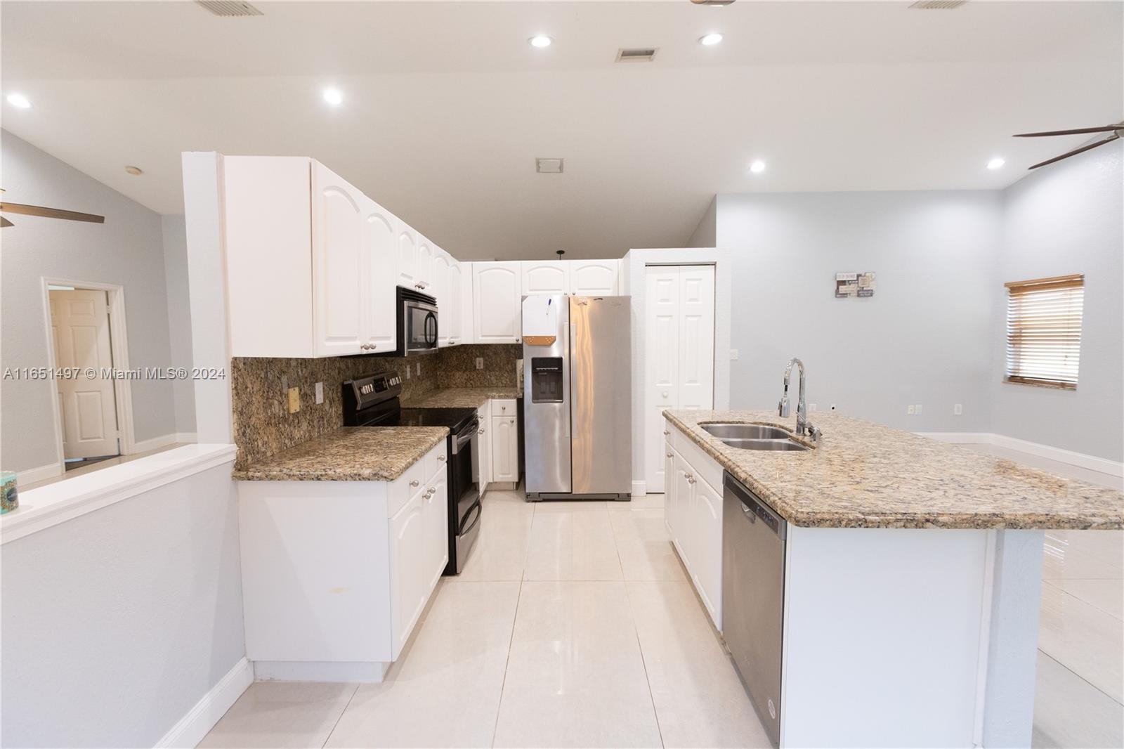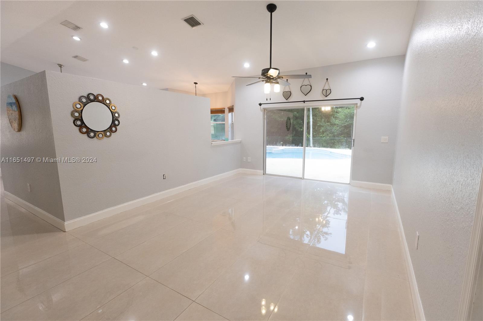 Welcome to Alhambra! This 4-bedroom, 2-bathroom split floorplan provides privacy and functionality, while the open concept living area makes it ideal for both everyday living and entertaining. The property features a brand-new roof (2024) and hurricane panels. Inside, you'll find porcelain tile and laminate flooring throughout. The eat-in kitchen is equipped with stainless-steel appliances and ample counter space. Step outside to your private retreat, where a heated swimming pool and hot tub await, perfect for relaxation and enjoyment year-round. Residents of Alhambra enjoy access to a well-maintained park and children's playground. Top rated schools nearby. HOA $455/qtr. which includes cable/internet, maintenance of common areas & sprinkler system.