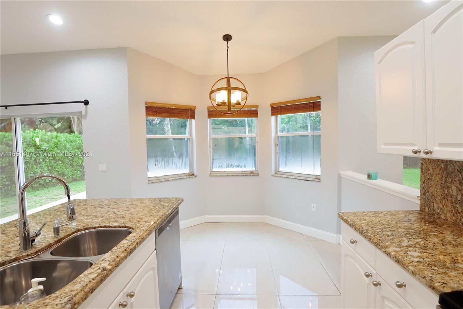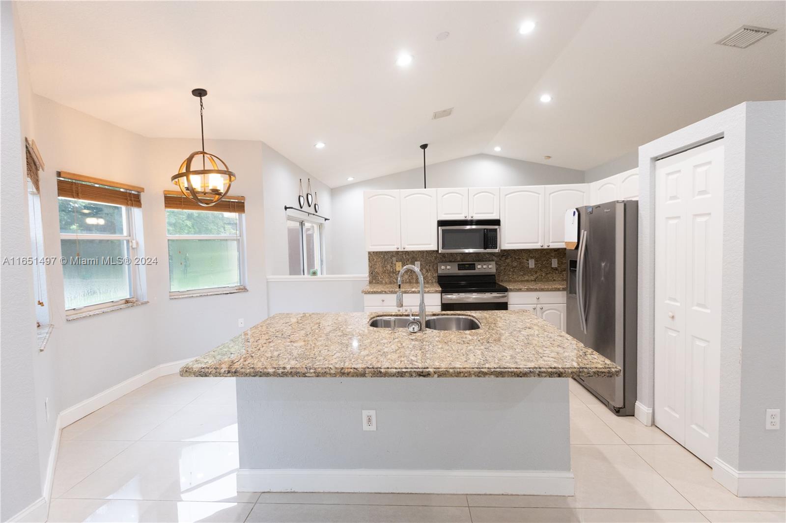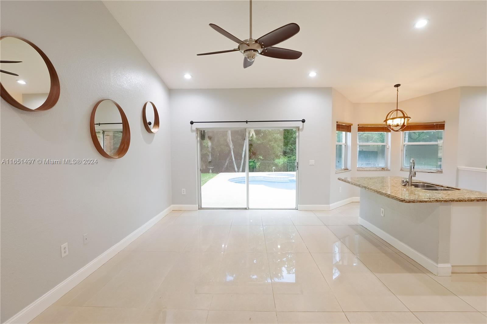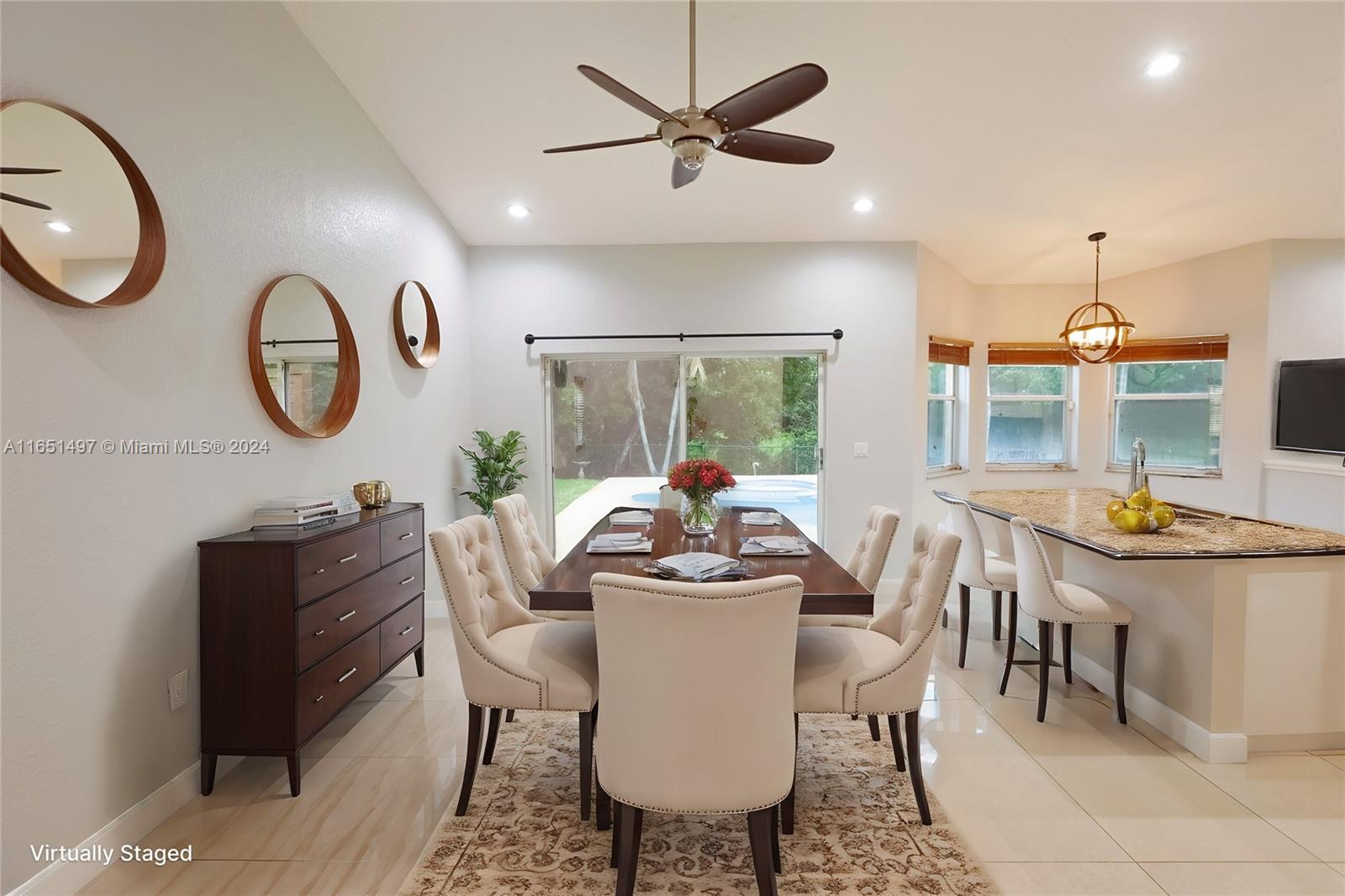 Welcome to Alhambra! This 4-bedroom, 2-bathroom split floorplan provides privacy and functionality, while the open concept living area makes it ideal for both everyday living and entertaining. The property features a brand-new roof (2024) and hurricane panels. Inside, you'll find porcelain tile and laminate flooring throughout. The eat-in kitchen is equipped with stainless-steel appliances and ample counter space. Step outside to your private retreat, where a heated swimming pool and hot tub await, perfect for relaxation and enjoyment year-round. Residents of Alhambra enjoy access to a well-maintained park and children's playground. Top rated schools nearby. HOA $455/qtr. which includes cable/internet, maintenance of common areas & sprinkler system.