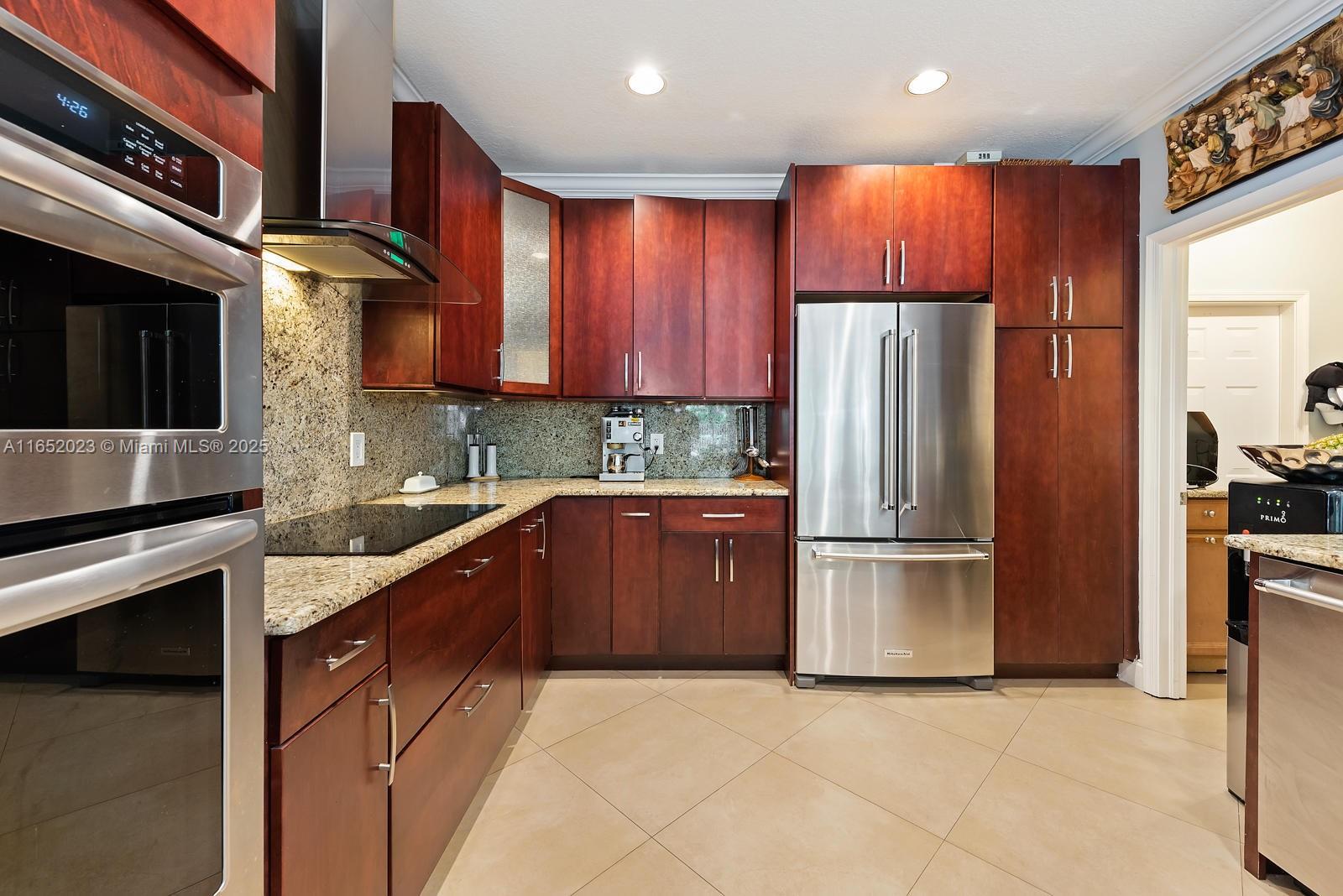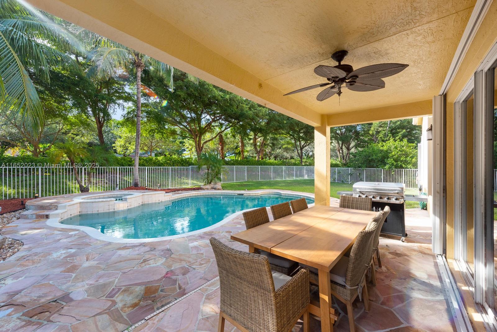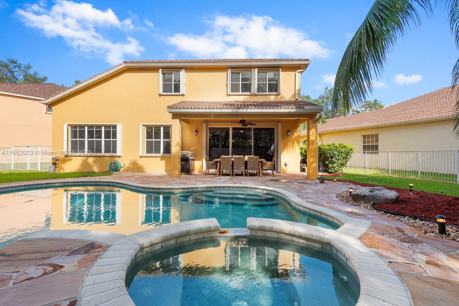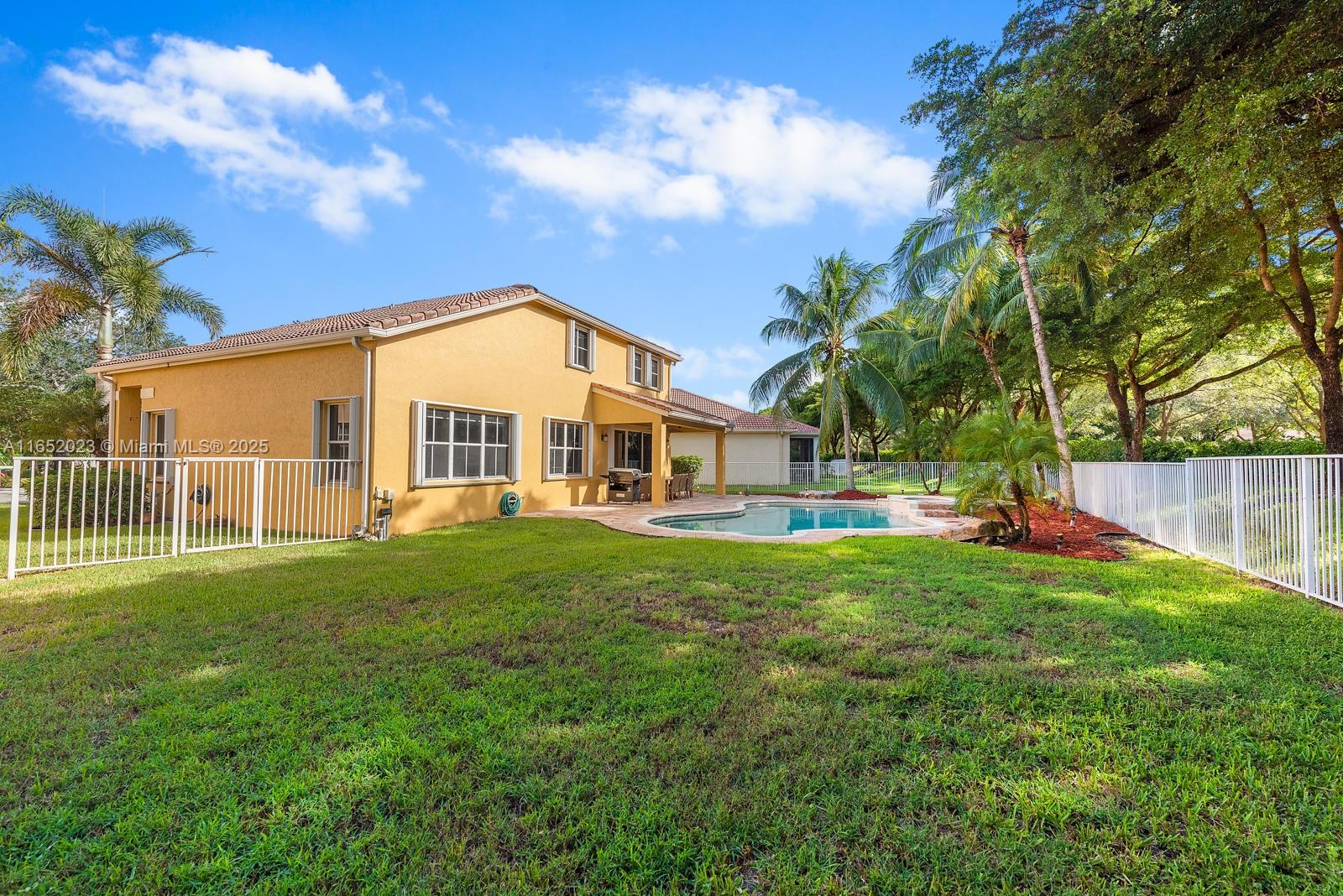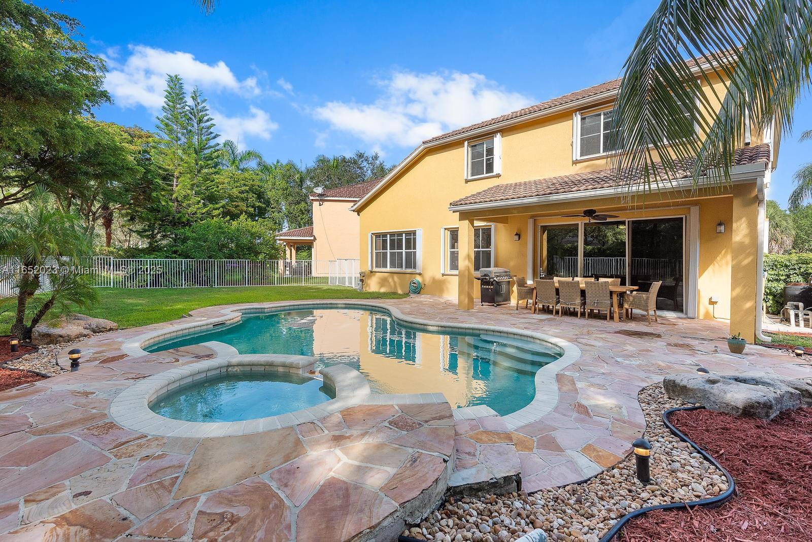 Popular Weston Ridges community home w/ newly surfaced pool. 4 bedrooms, 3.5 baths, 1 bed on ground level with en-suite, 2nd floor den, besides large family room, large pie shaped lot, in-ground salt water pool/spa, automatic pool cleaner. Home backs to berm. Located in cul-de-sec. Closest community of single family homes to highly rated Cypress Bay High, Falcon Cove Middle, Broward College at Weston & Library. Minutes to Manatee Bay & Everglades Elementary. First Floor diagonally installed Porcelain tiles throughout including bathrooms. High end Kitchen Aid appliance in Kitchen, Thomasville wood cabinets w/ pull out drawers, granite counters, LG Large Capacity washer dryer. Second floor hard wood throughout (including stairs). Community with pickle ball, large pool, BBQ & party room.