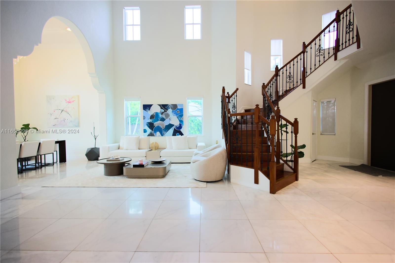 Beautiful 2-story home in Doral Isles, Mediterranea. Modern finishes. Large open kitchen, spacious and open living areas. Large Master Suite with roman tub and separate shower. Paved pool/jacuzzi deck in backyard perfect for entertaining guests. Home features high ceilings, circular iron staircase overlooking main living areas. Impact windows on 1st floor. New roof. Carrara floors on first floor, new kitchen, new bathrooms. Water filter for the entire house. Remodeled pool.