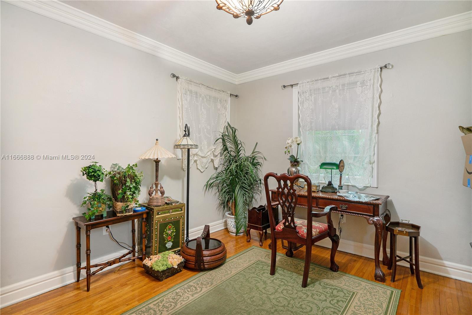 This classic Coral Gables beauty offers 3 spacious bedrooms and 2 baths, with a bonus space that can be used as a study, office, or extra living area, catering to the needs of families or children. The large master bedroom includes space for a sitting area and a walk-in closet for ample storage. Features custom kitchen cabinets, and beautiful wood floors throughout adding warmth and sophistication to the home. Enjoy the elegance of a formal dining room perfect for both entertainment and family gatherings. Ample parking and storage with a convenient two-car garage, plus impact windows throughout. Lastly, the beautifully landscaped backyard provides a serene oasis for relaxation and outdoor activities. Schedule your showing appointment today.