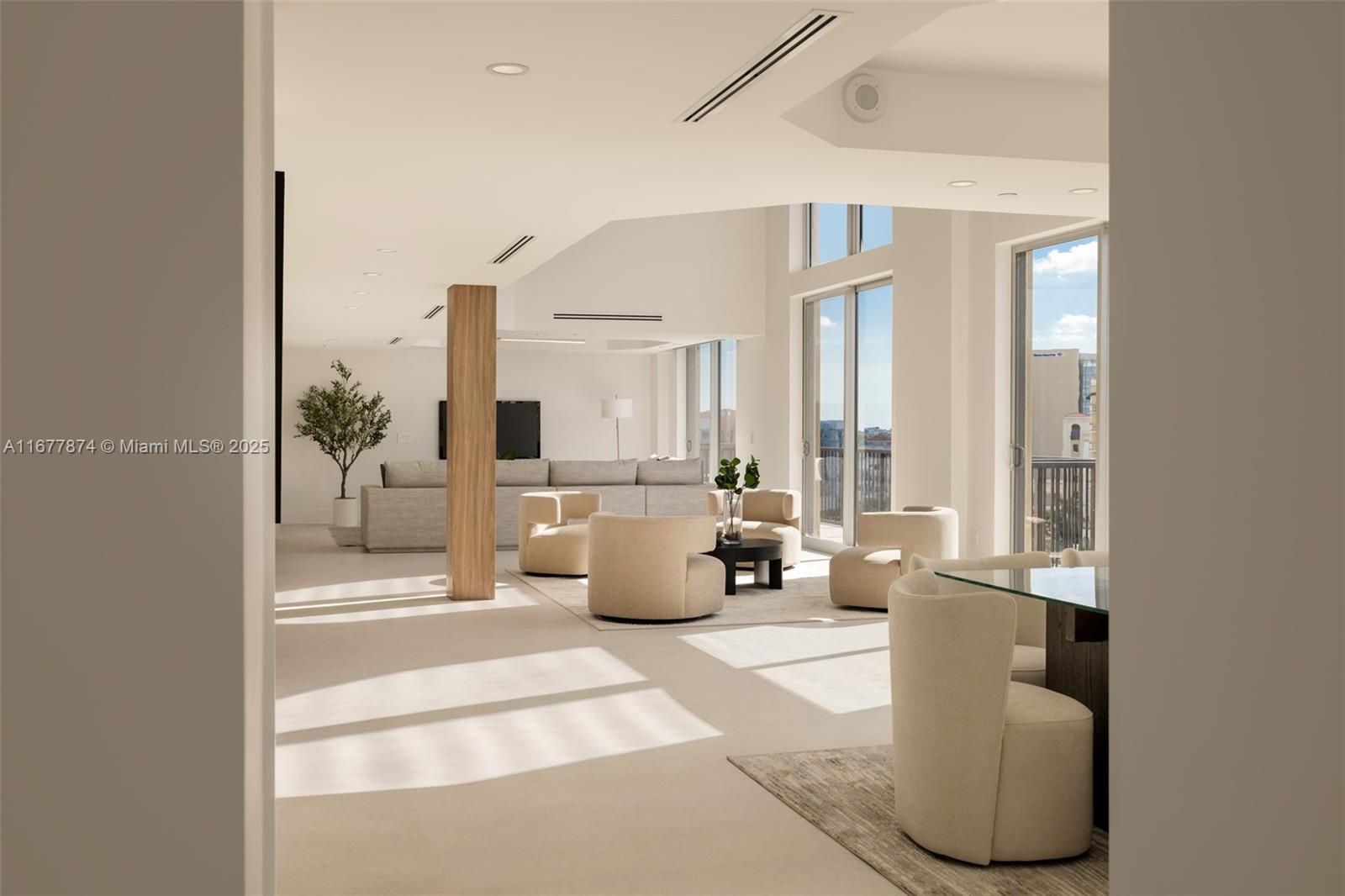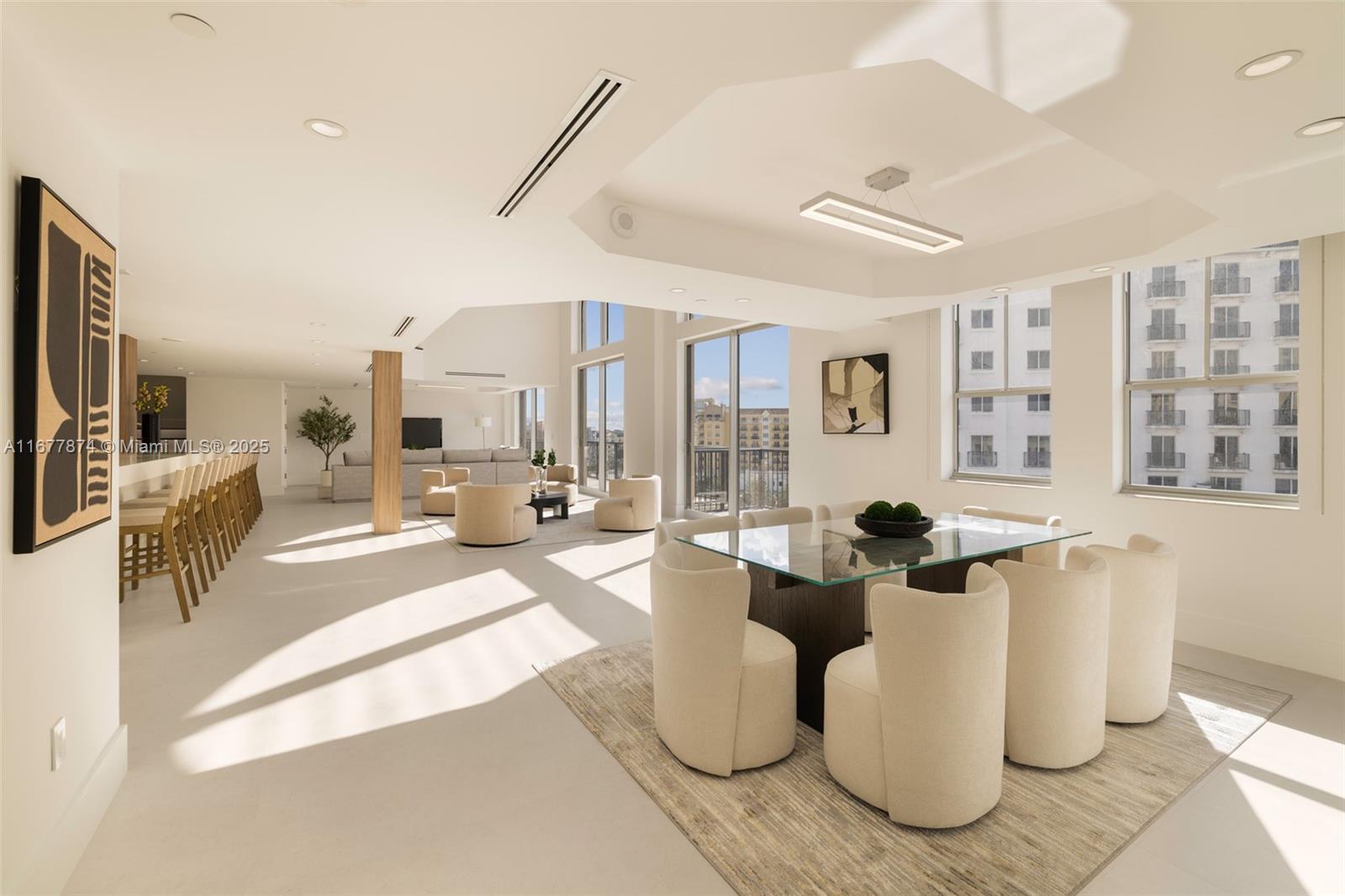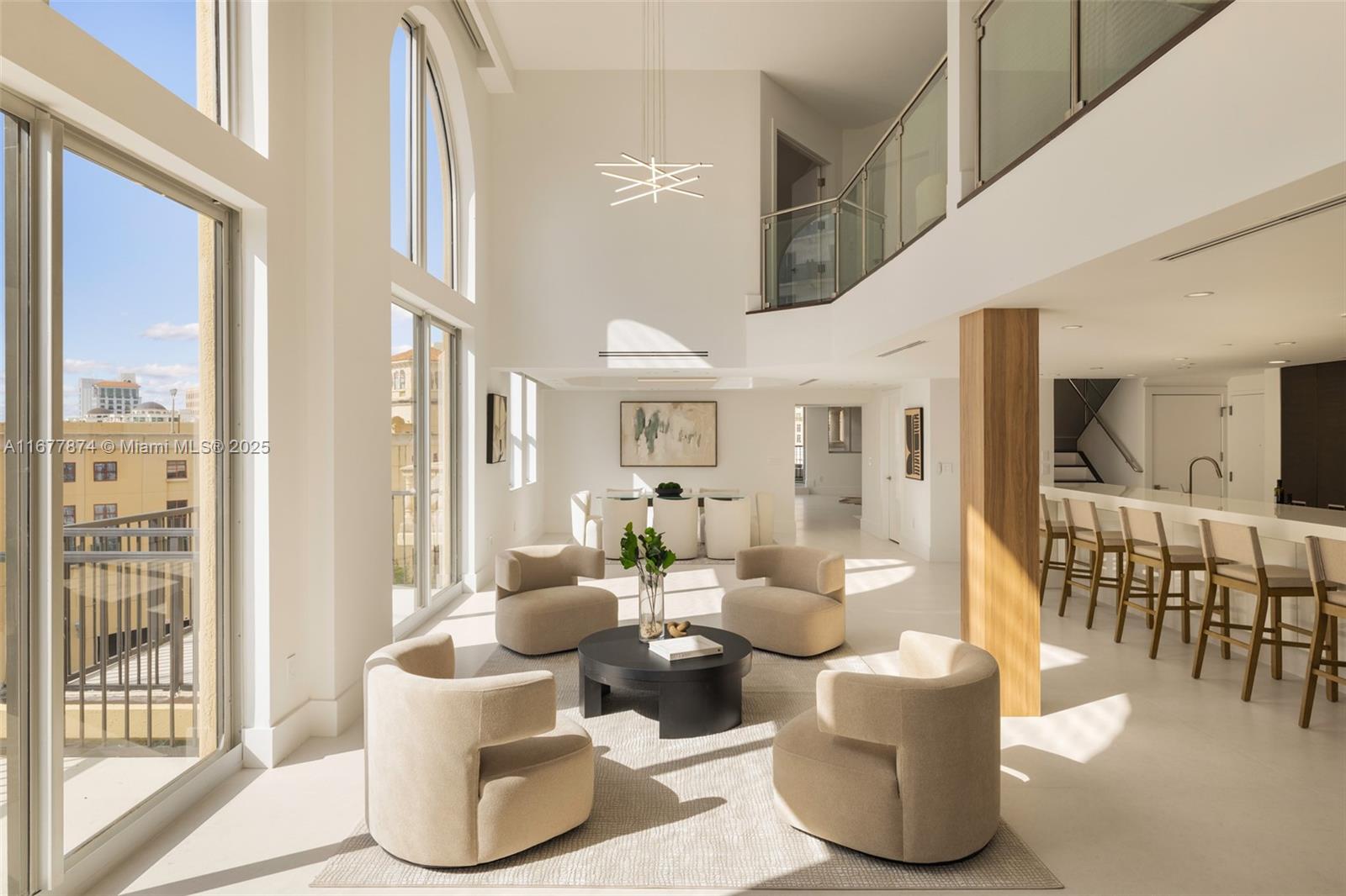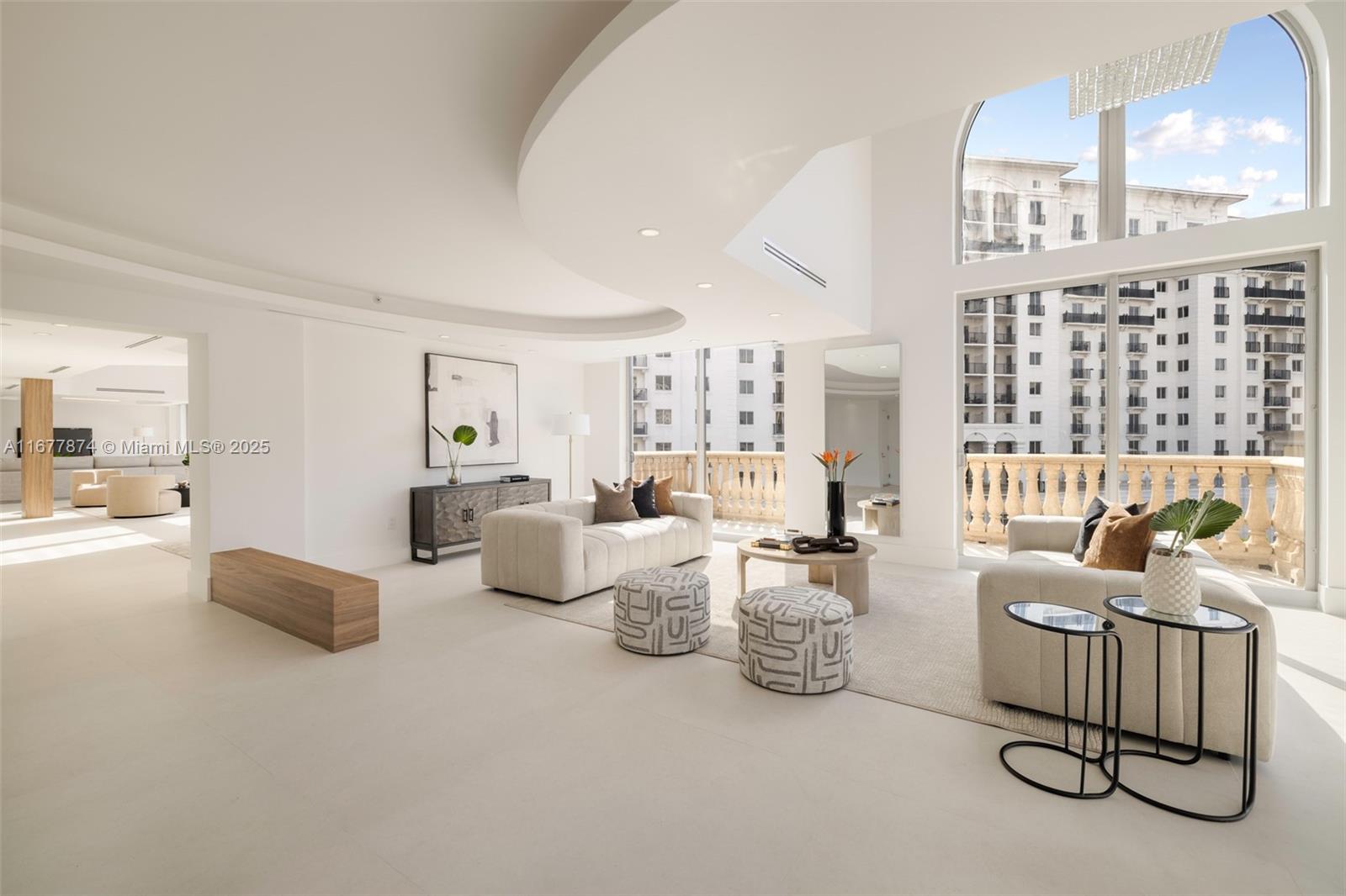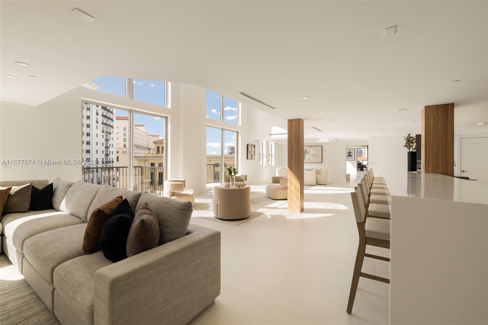 Introducing a newly price-improved 2-story penthouse nestled in the heart of Downtown Coral Gables. This one-of-a-kind residence has been thoughtfully updated to blend luxurious living with modern elegance. Sleek porcelain Beraice 48x48 tiles grace the main living areas, which flow seamlessly onto a massive private terrace. Enjoy the rare convenience of 6 included parking spaces and full concierge services. The open and spacious floor plan is enhanced by soaring 22-foot ceilings in the living and family room areas, creating an airy and inviting atmosphere. The kitchen is equipped with top-of-the-line Gaggenau appliances, perfect for culinary explorations.