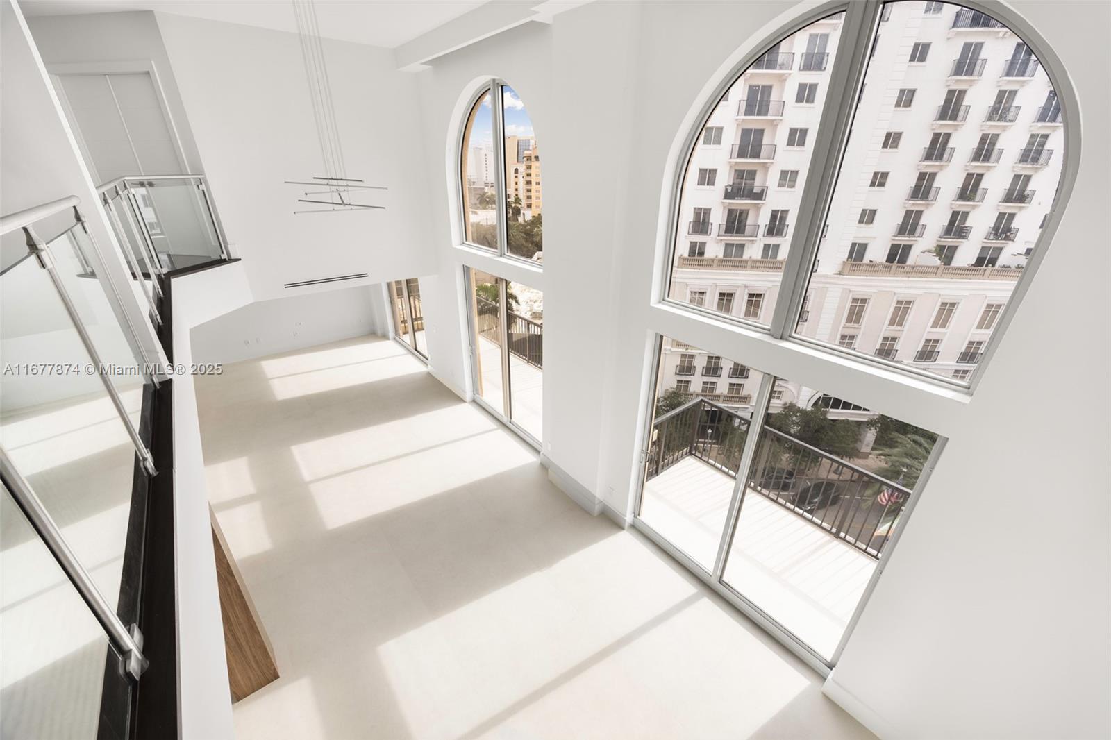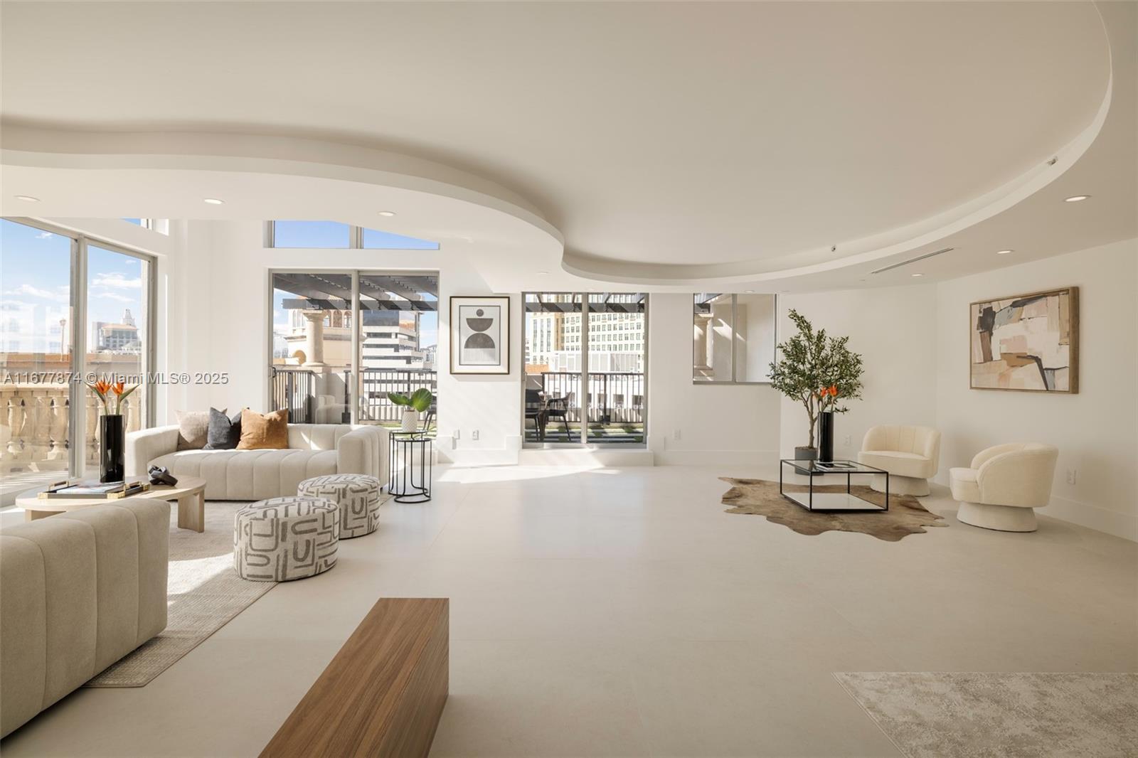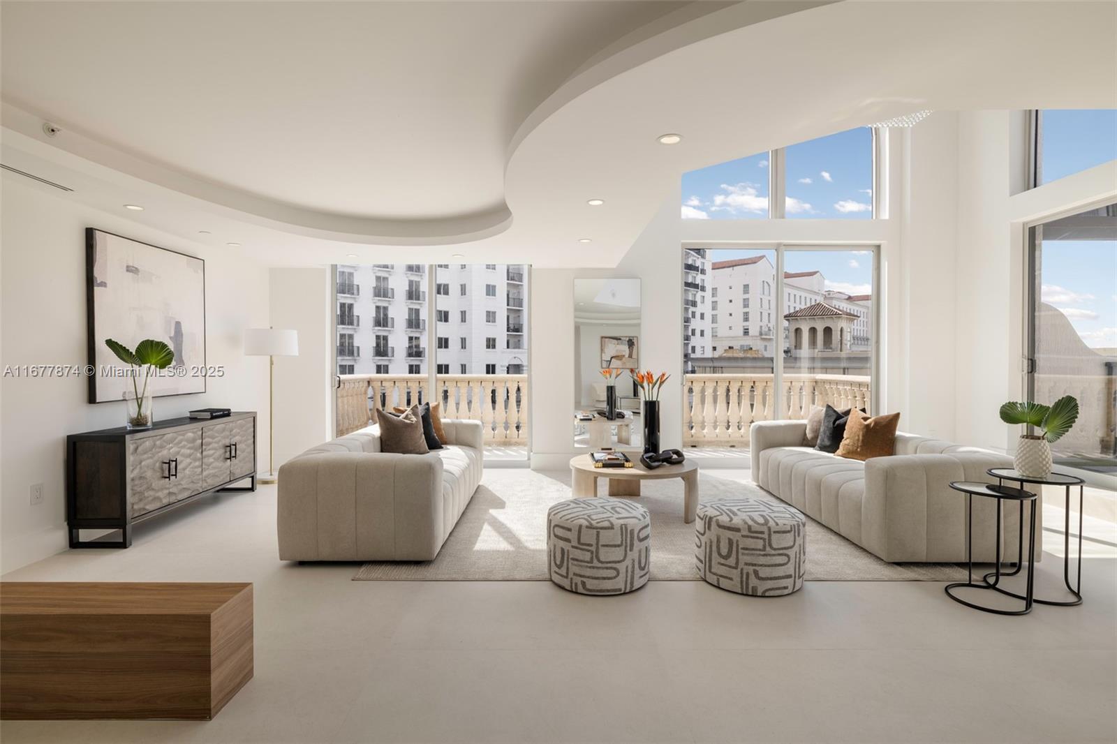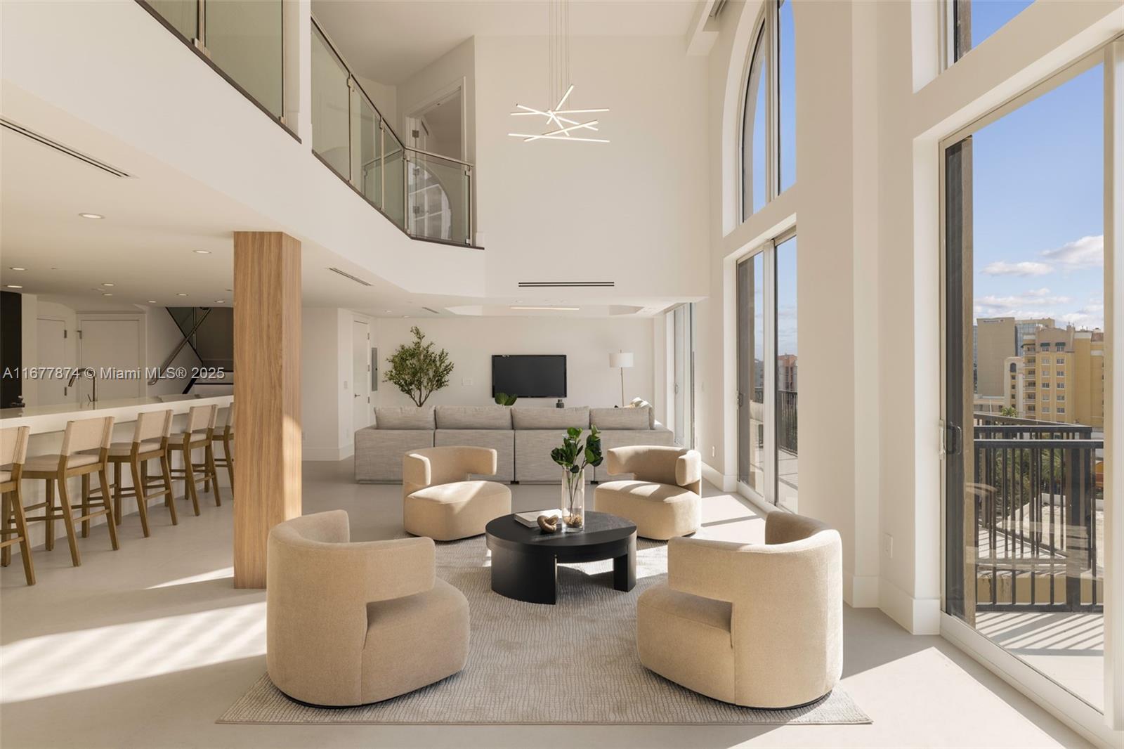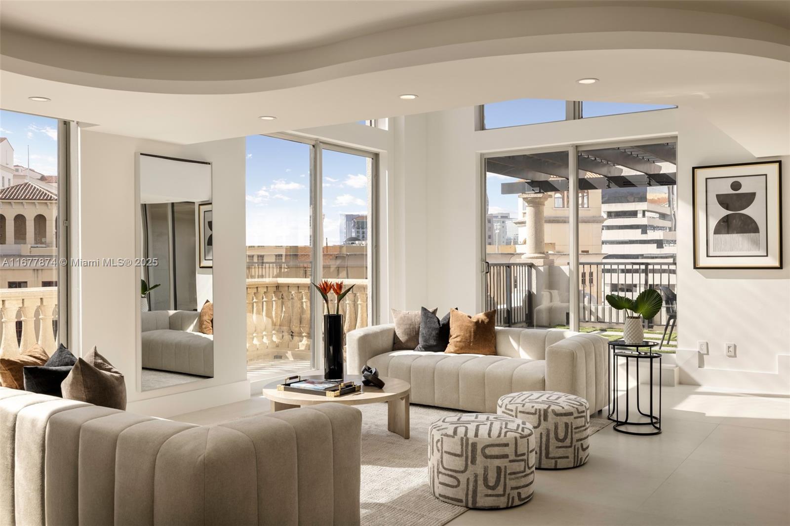 Introducing a newly price-improved 2-story penthouse nestled in the heart of Downtown Coral Gables. This one-of-a-kind residence has been thoughtfully updated to blend luxurious living with modern elegance. Sleek porcelain Beraice 48x48 tiles grace the main living areas, which flow seamlessly onto a massive private terrace. Enjoy the rare convenience of 6 included parking spaces and full concierge services. The open and spacious floor plan is enhanced by soaring 22-foot ceilings in the living and family room areas, creating an airy and inviting atmosphere. The kitchen is equipped with top-of-the-line Gaggenau appliances, perfect for culinary explorations.