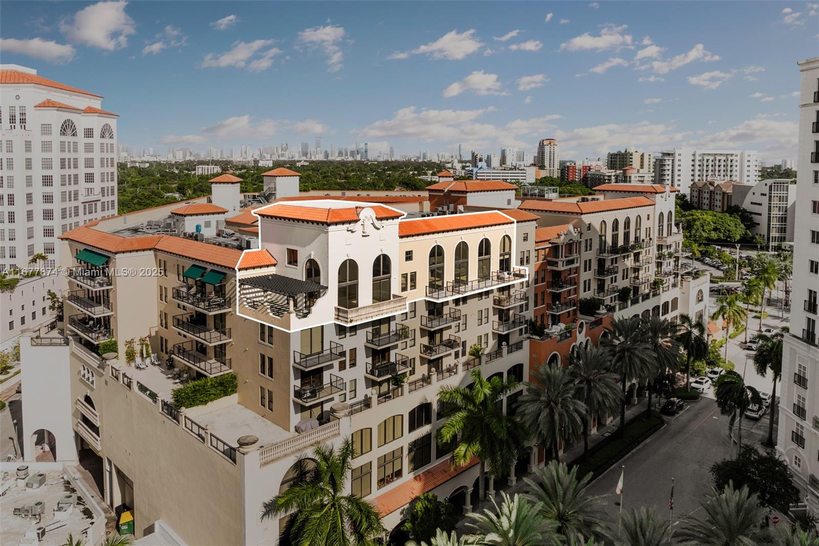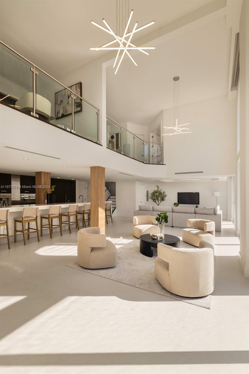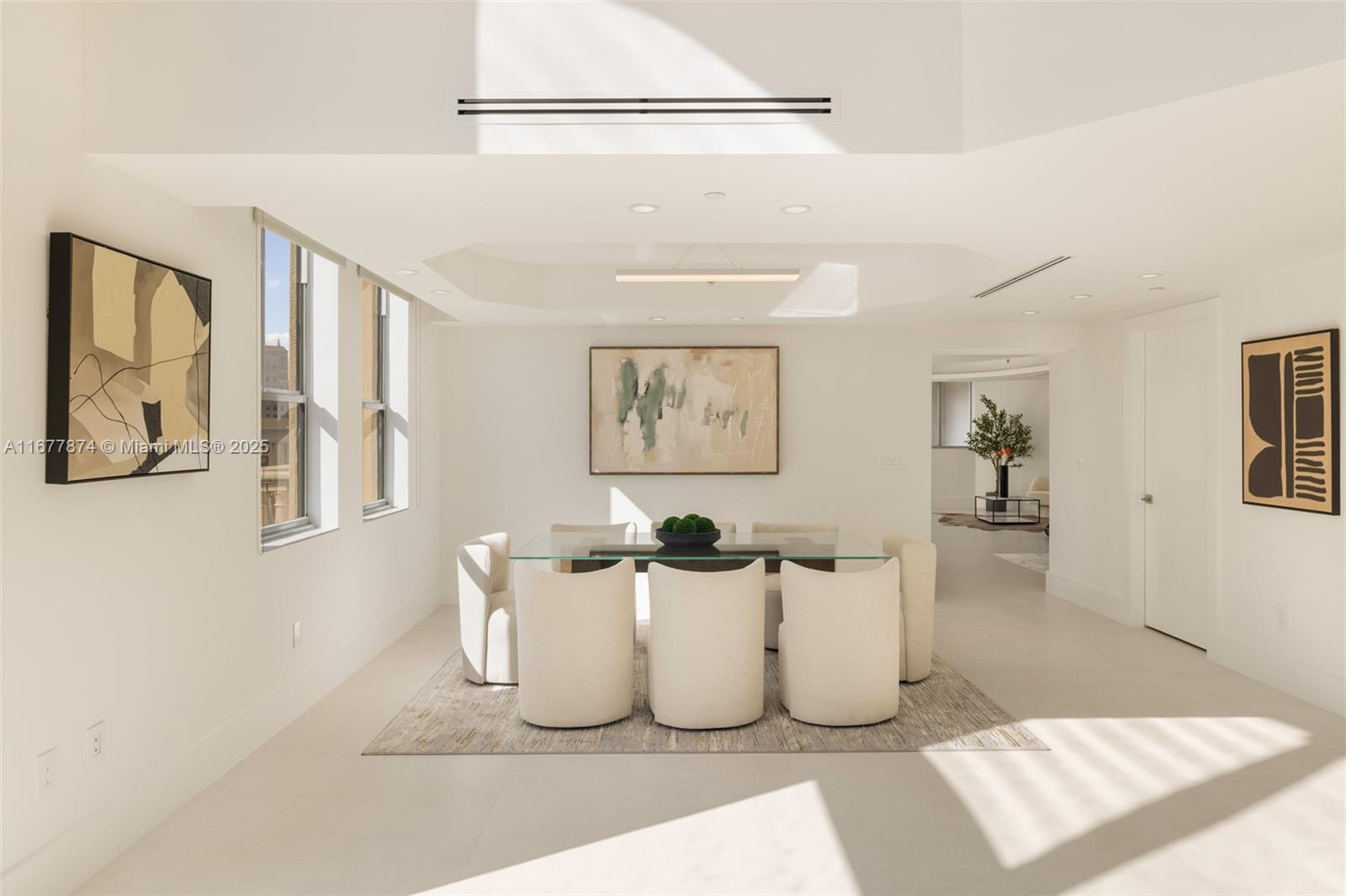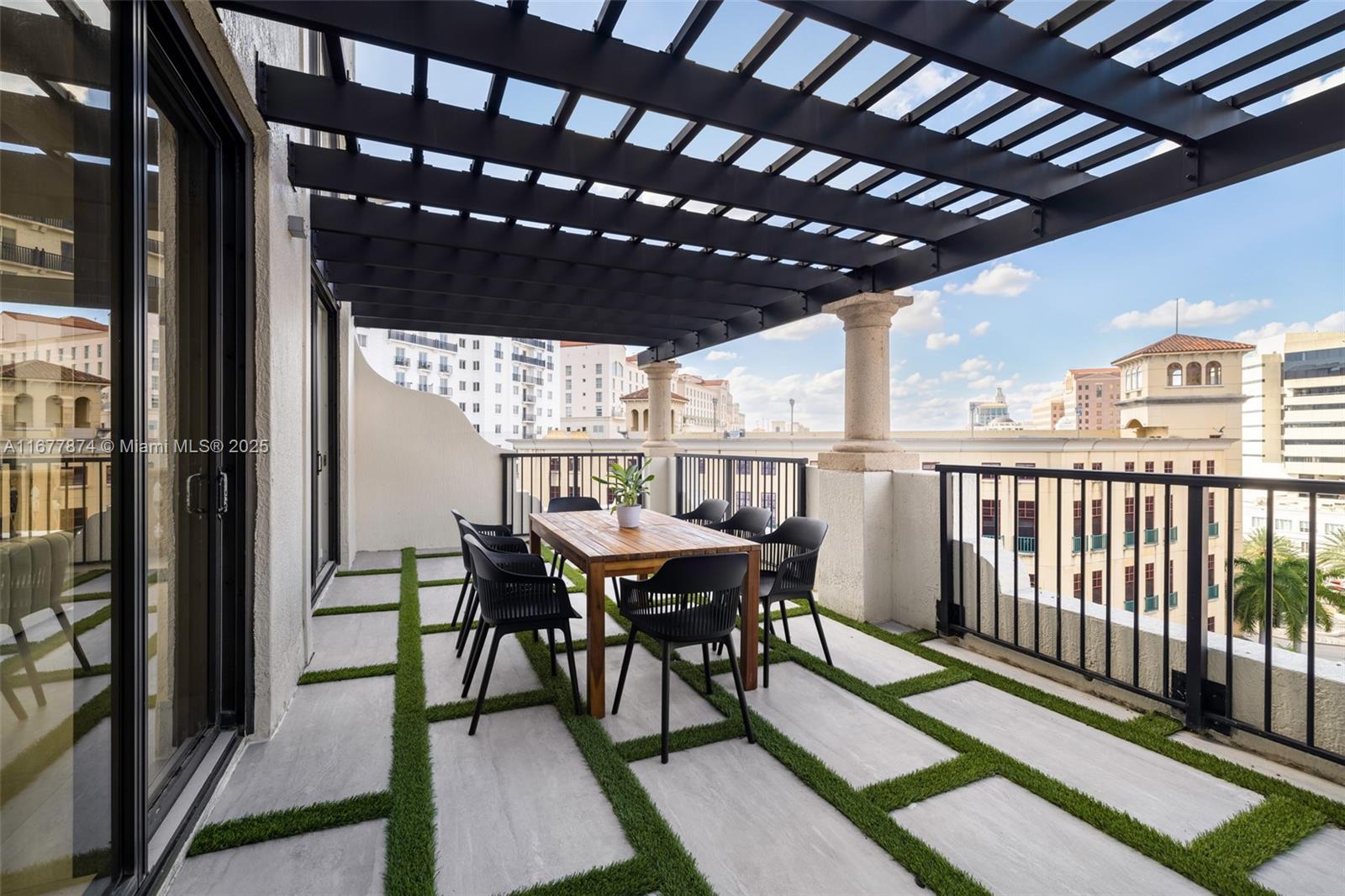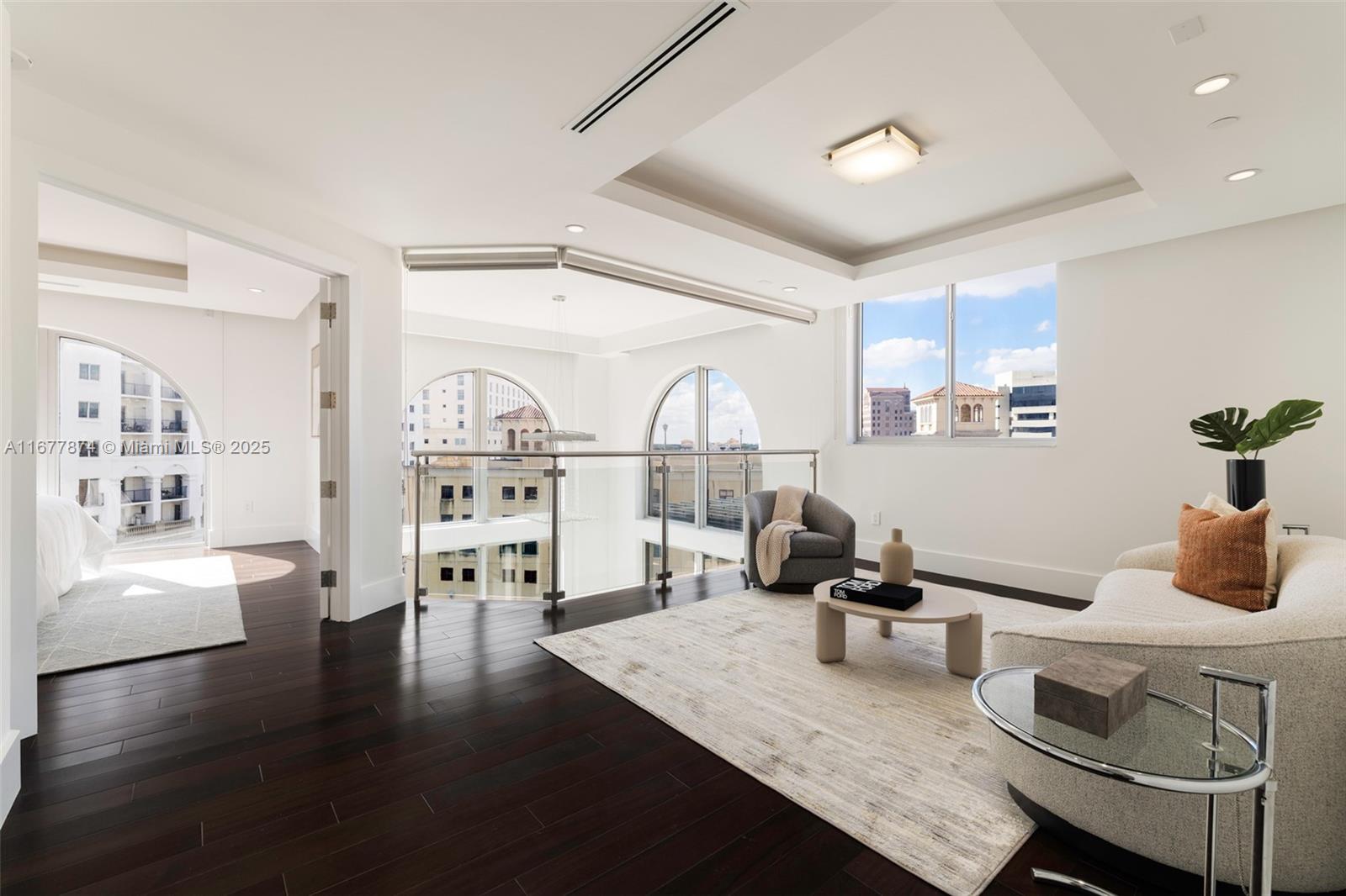 Introducing a newly price-improved 2-story penthouse nestled in the heart of Downtown Coral Gables. This one-of-a-kind residence has been thoughtfully updated to blend luxurious living with modern elegance. Sleek porcelain Beraice 48x48 tiles grace the main living areas, which flow seamlessly onto a massive private terrace. Enjoy the rare convenience of 6 included parking spaces and full concierge services. The open and spacious floor plan is enhanced by soaring 22-foot ceilings in the living and family room areas, creating an airy and inviting atmosphere. The kitchen is equipped with top-of-the-line Gaggenau appliances, perfect for culinary explorations.