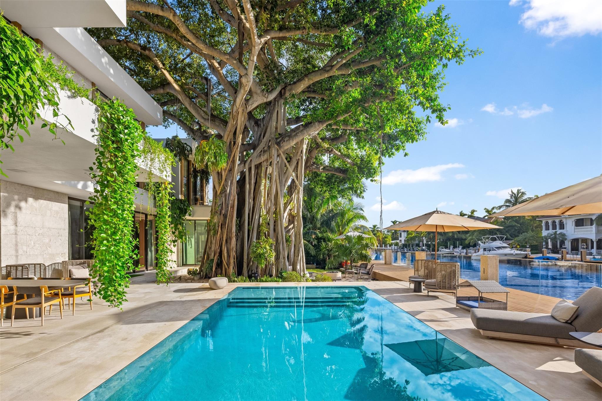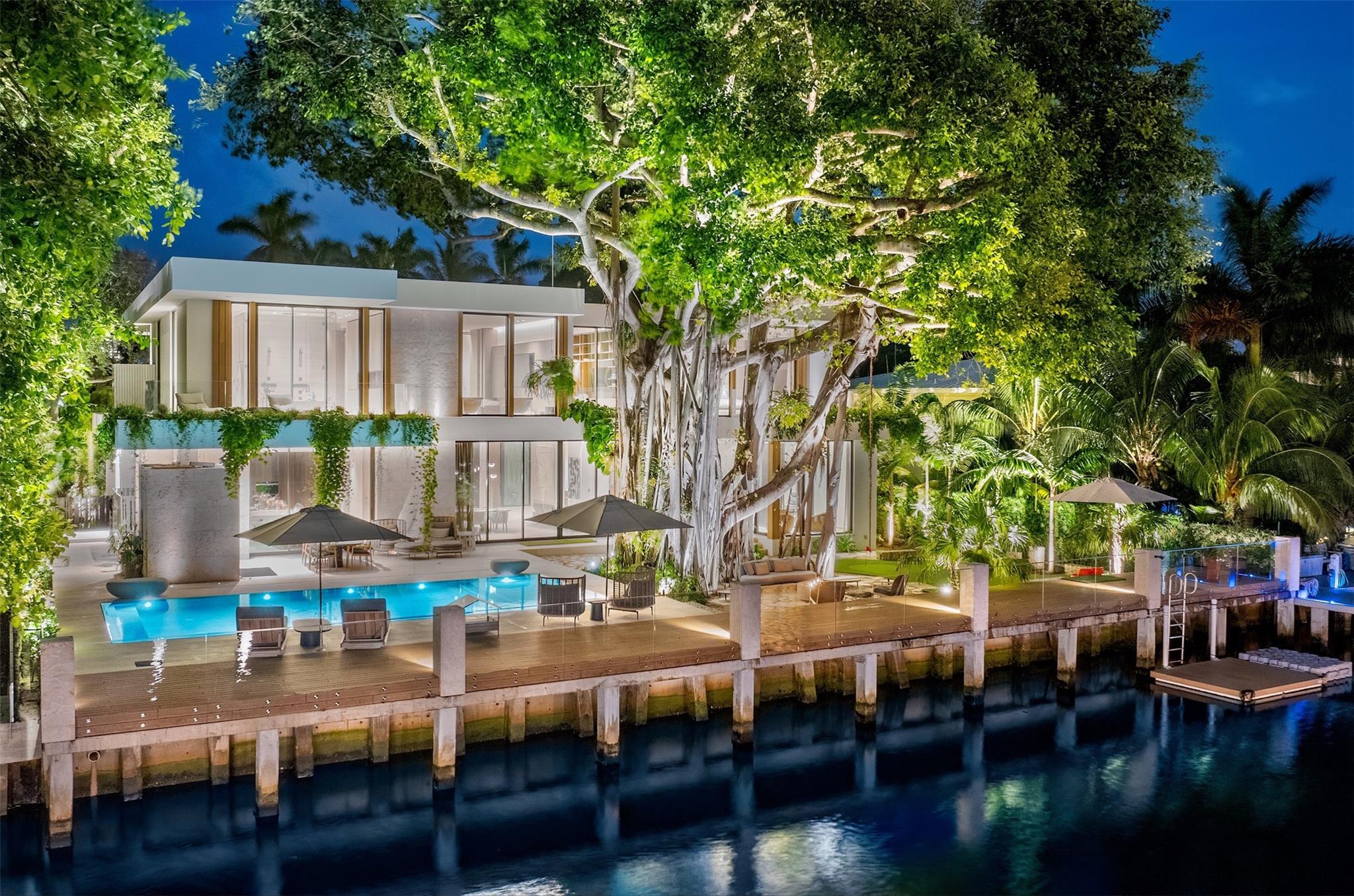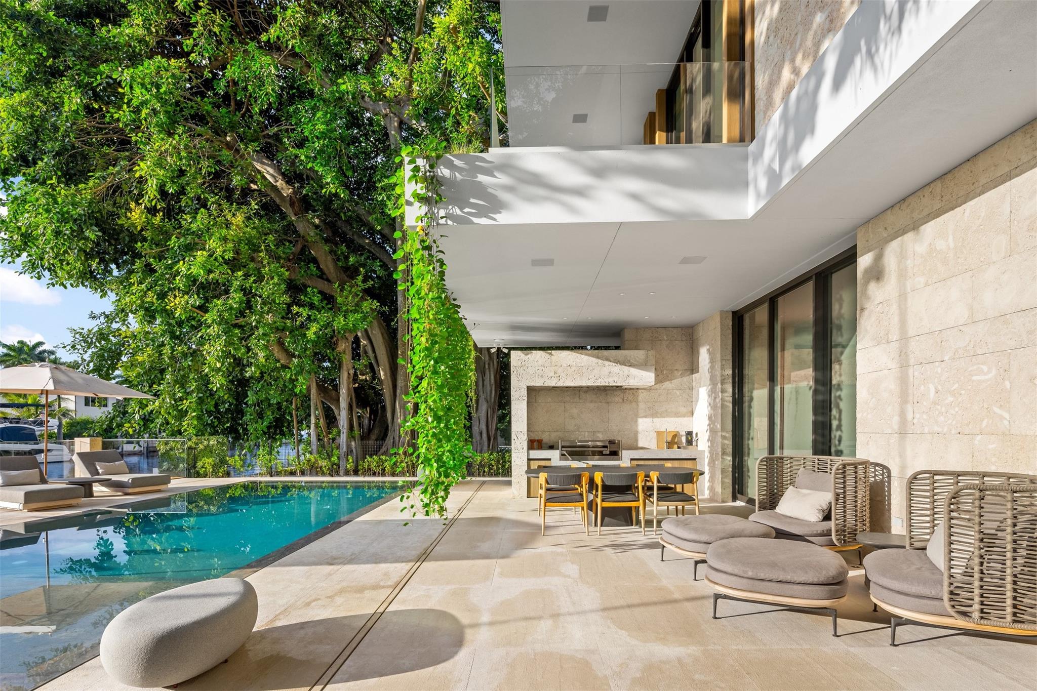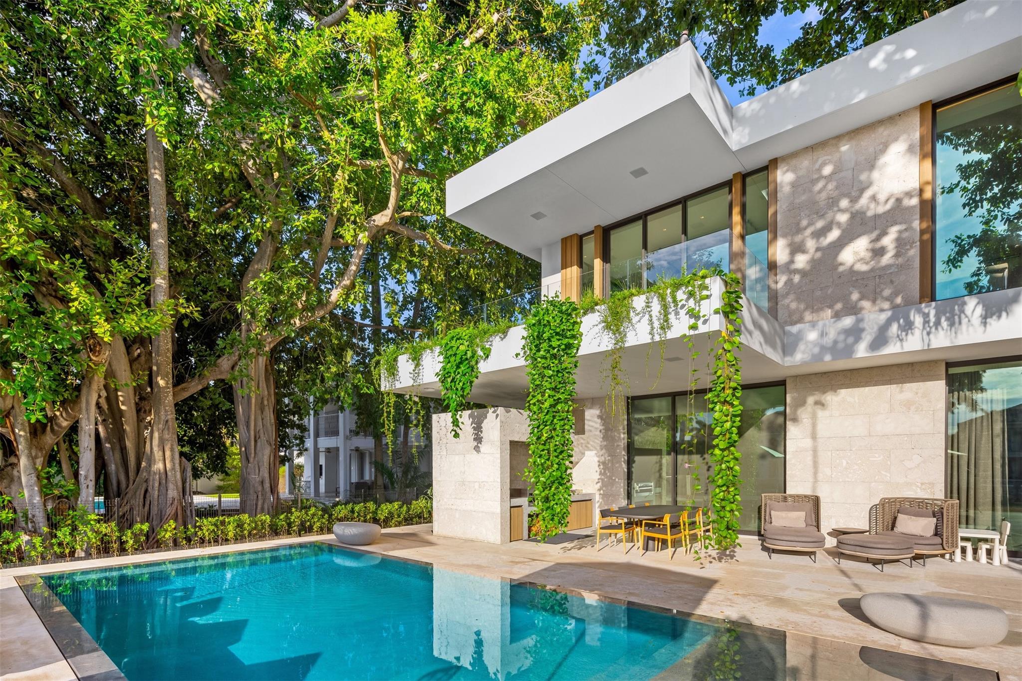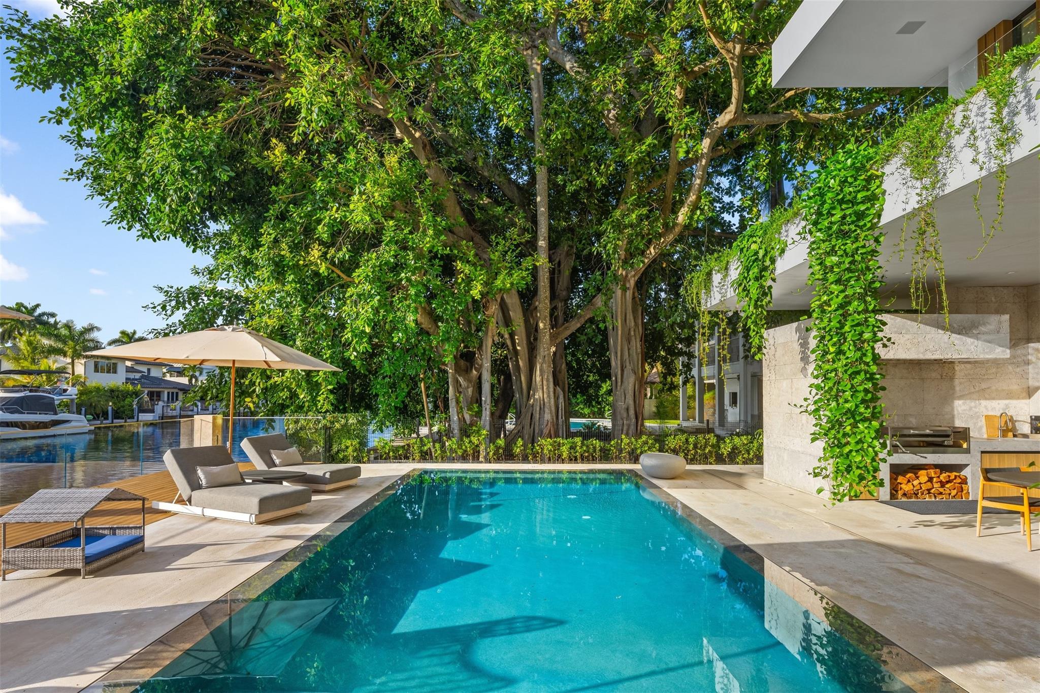 Welcome to 57 Nurmi, an architectural masterpiece redefining luxury on Las Olas’ most exclusive street. This brand new home offers grand living spaces and a chef’s kitchen with Italian Mia Cucina Design, Vena Grigio stone finishes, and an auxiliary kitchen with top-tier appliances—perfect for gatherings. Step outside to an infinity-edge mirror pool shaded by a magnificent 96-year-old Banyan tree, creating harmony between nature and architecture. Indoors, enjoy limestone floors, rich walnut accents, and a relaxing office with inspiring views. With 100’ WF and no fixed bridges, it’s a boater’s paradise. Featuring Crestron technology, a home theater with a 150-inch screen, and a yoga gym, this estate sets a new standard in luxury, offering unmatched charm, sophistication, and exclusivity.