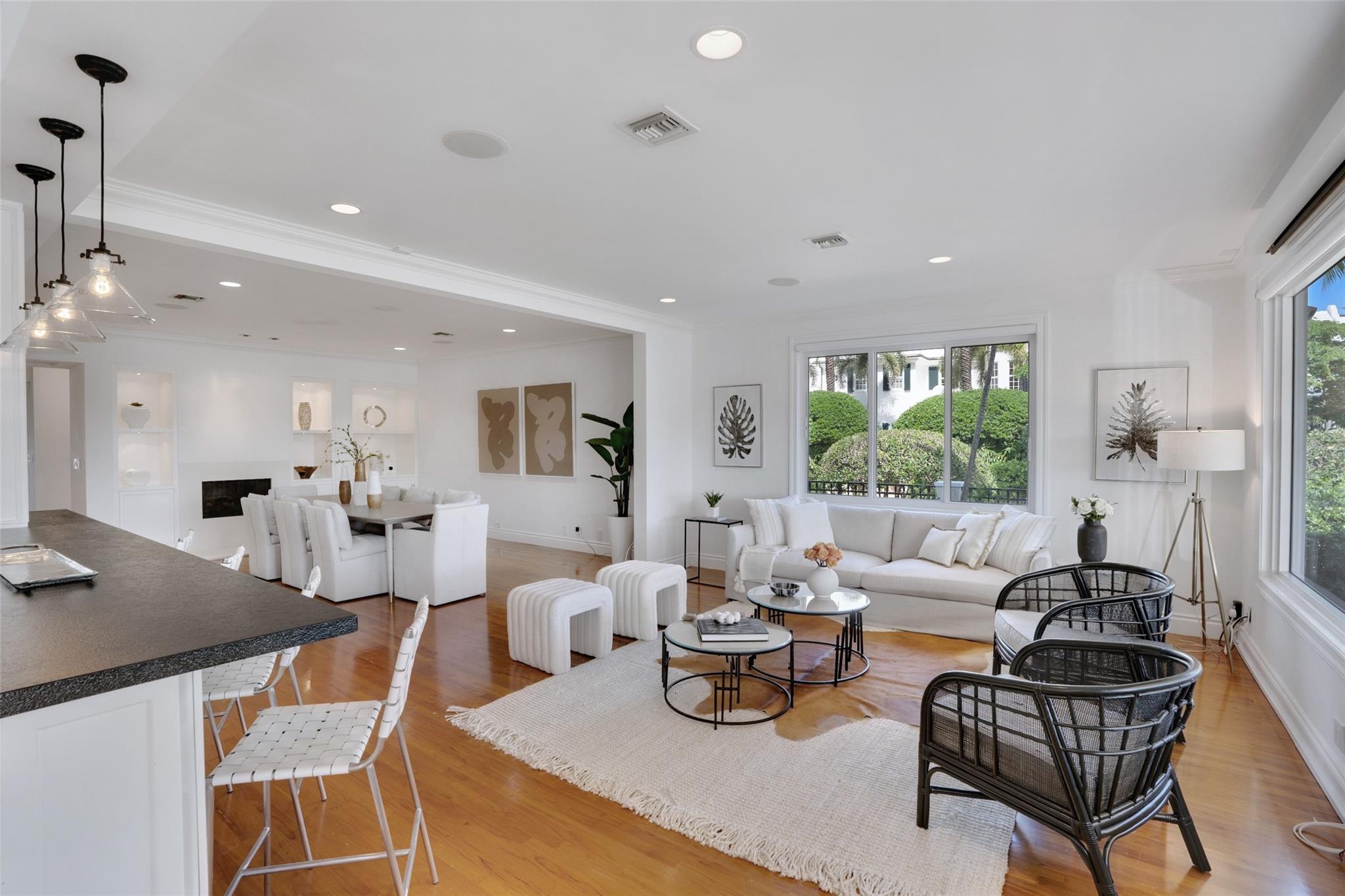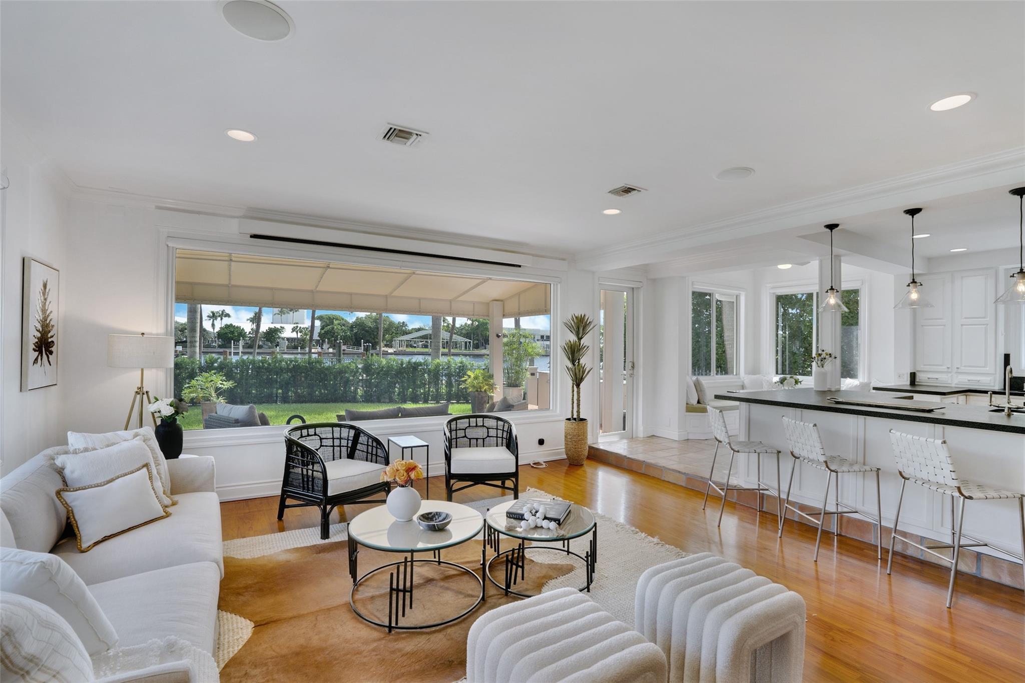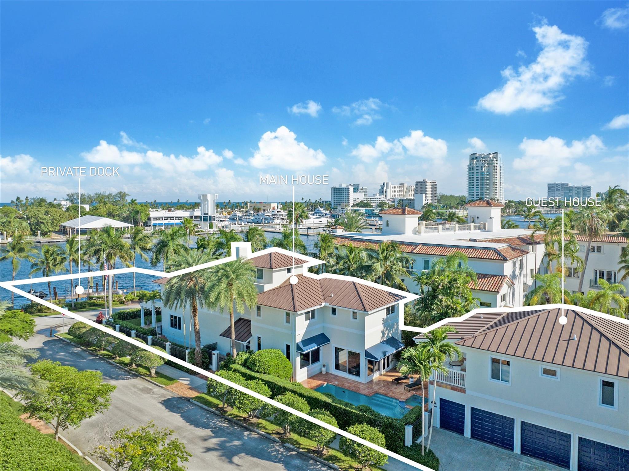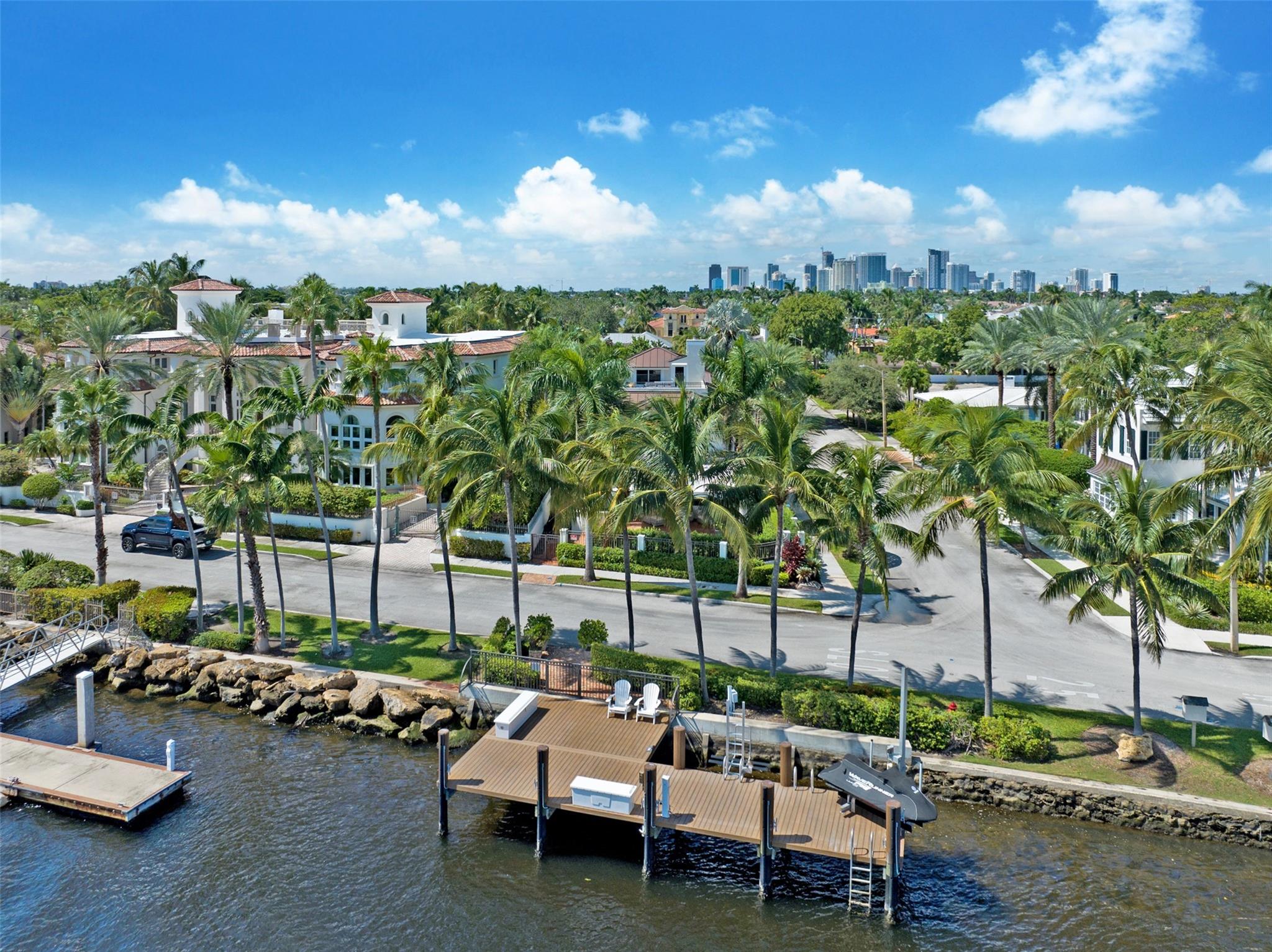 A rare opportunity to live on prestigious Idlewyld Dr. Enjoy unparalleled Intracoastal views and daily endless boat parade from this contemporary 2-story + 3rd floor sky lounge & rooftop deck residence. Boasting high ceilings, open floor plan seamlessly connecting the living room, dining room, breakfast nook & gourmet kitchen w/oversized island & top-of-the-line appliances. Additional: media room, bar area, office & sunroom. The primary features walk-in closets, spa-like bathroom. Outdoor: waterfront patio w/summer kitchen, heated pool & spa. New deep-water dock built to the latest regulations, in a NO-WAKE ZONE, with easy ocean access & no fixed bridges. Generator, A/C 4-car garage. Detached 2bds/2baths Guest House w/kitchen & living room. Secure Location. Steps away from dining & beaches