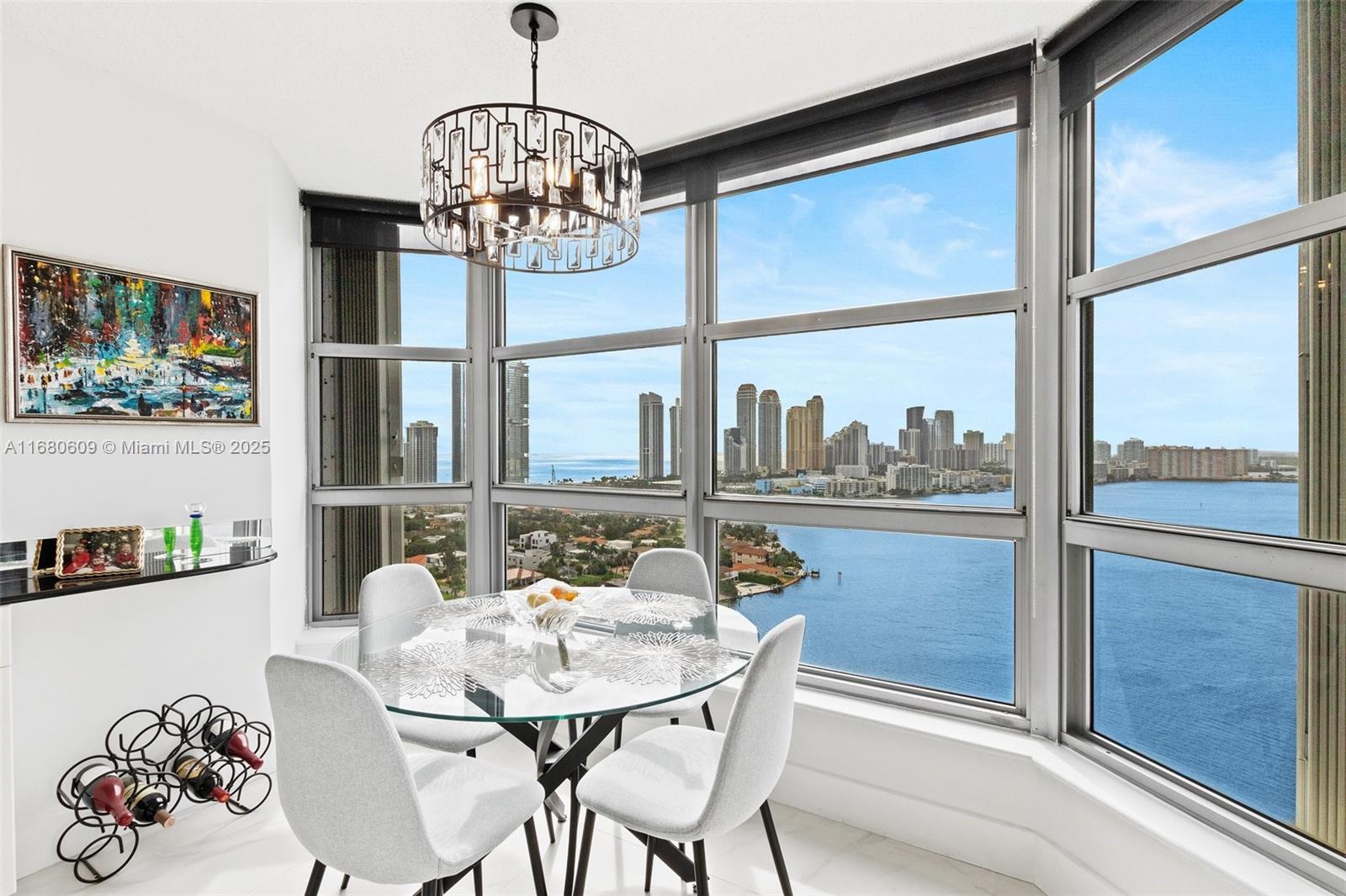 Outstanding views of the Ocean, Intracoastal, and south to downtown Miami. Wrap-around balcony, floor-to-ceiling windows with tons of natural light, beautiful porcelain floors throughout, beautiful upgrades, principal suite with tub and walk-in closet, laundry room with full-size washer and dryer. Hurricane shutters, Gated community with resort-style living: concierge, valet, pool, gym, full-service marina, wonderful restaurant, beauty salon, pickleball, and tennis courts. Walk around the complex while enjoying the Intracoastal view. Walking distance to Aventura Mall and Aventura Circle. Pet friendly.