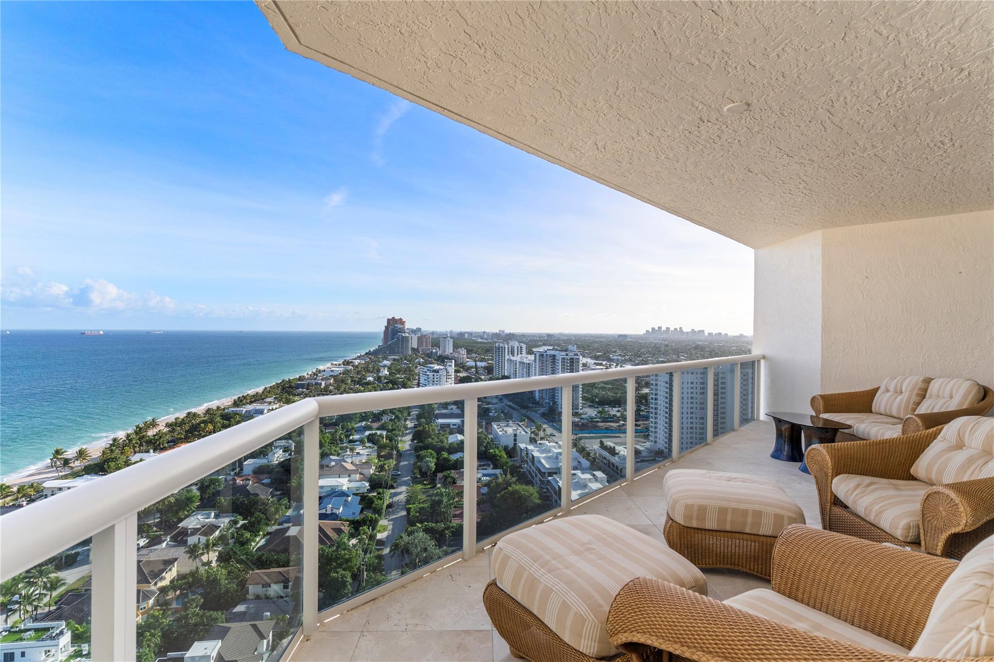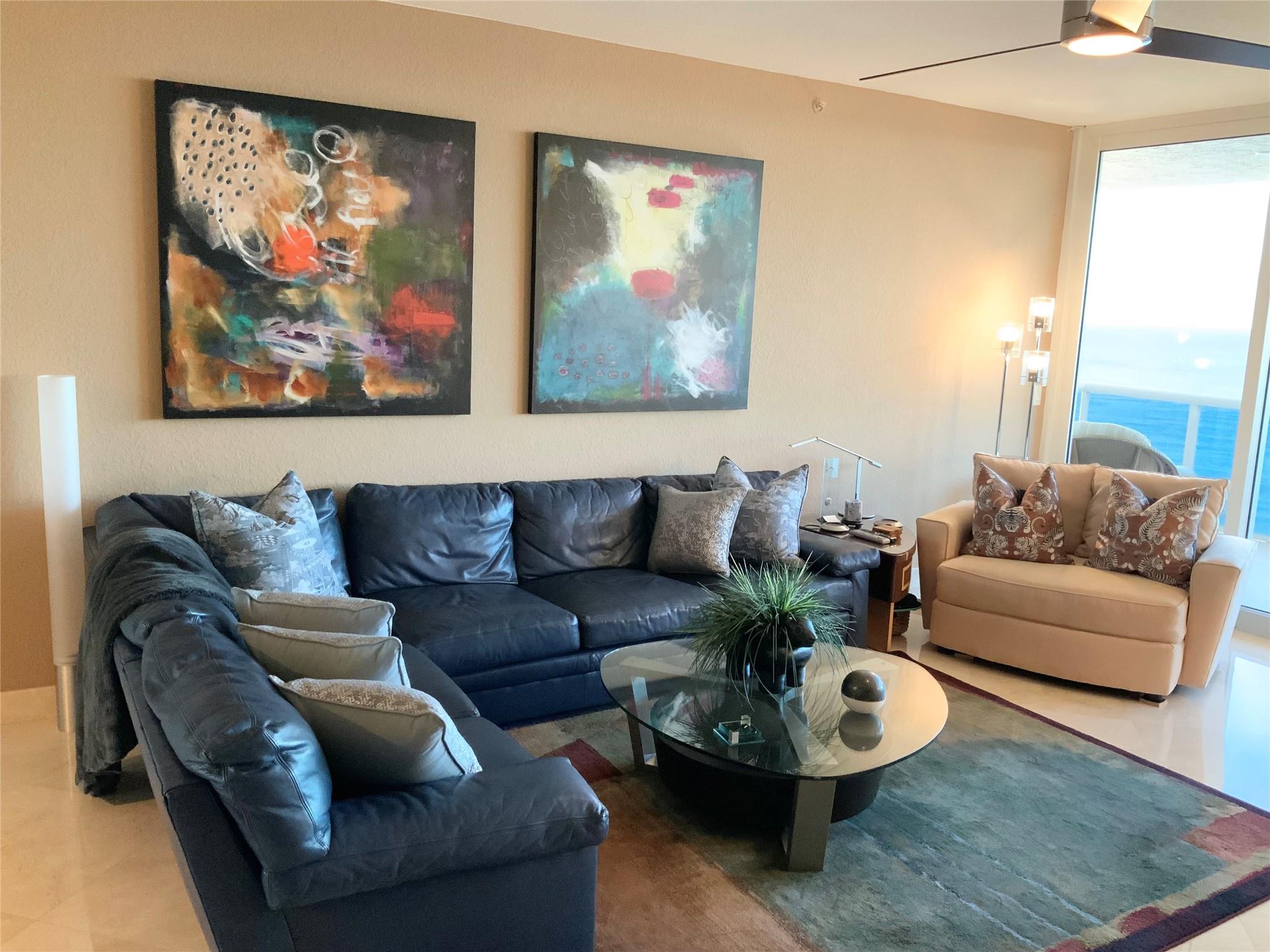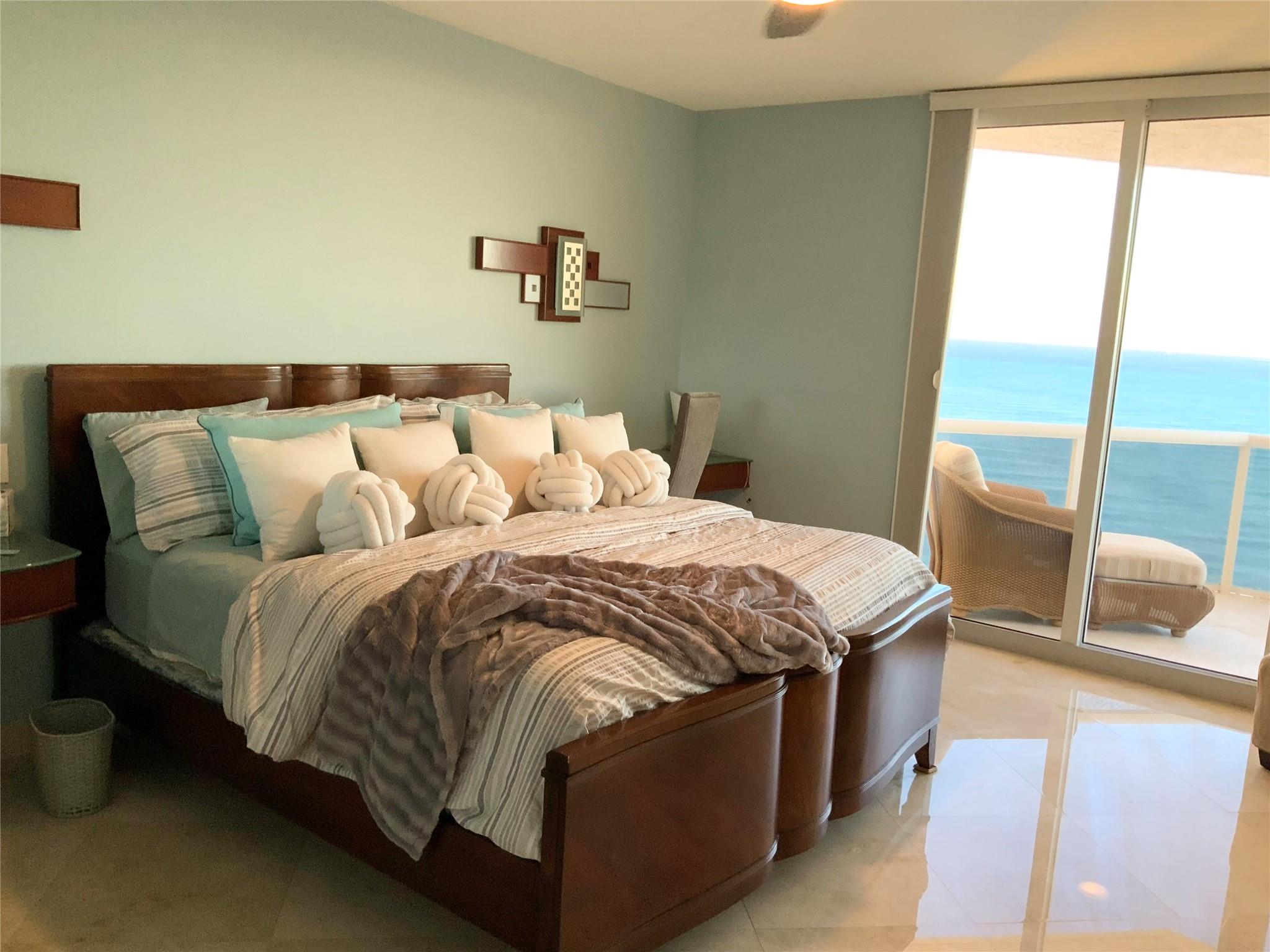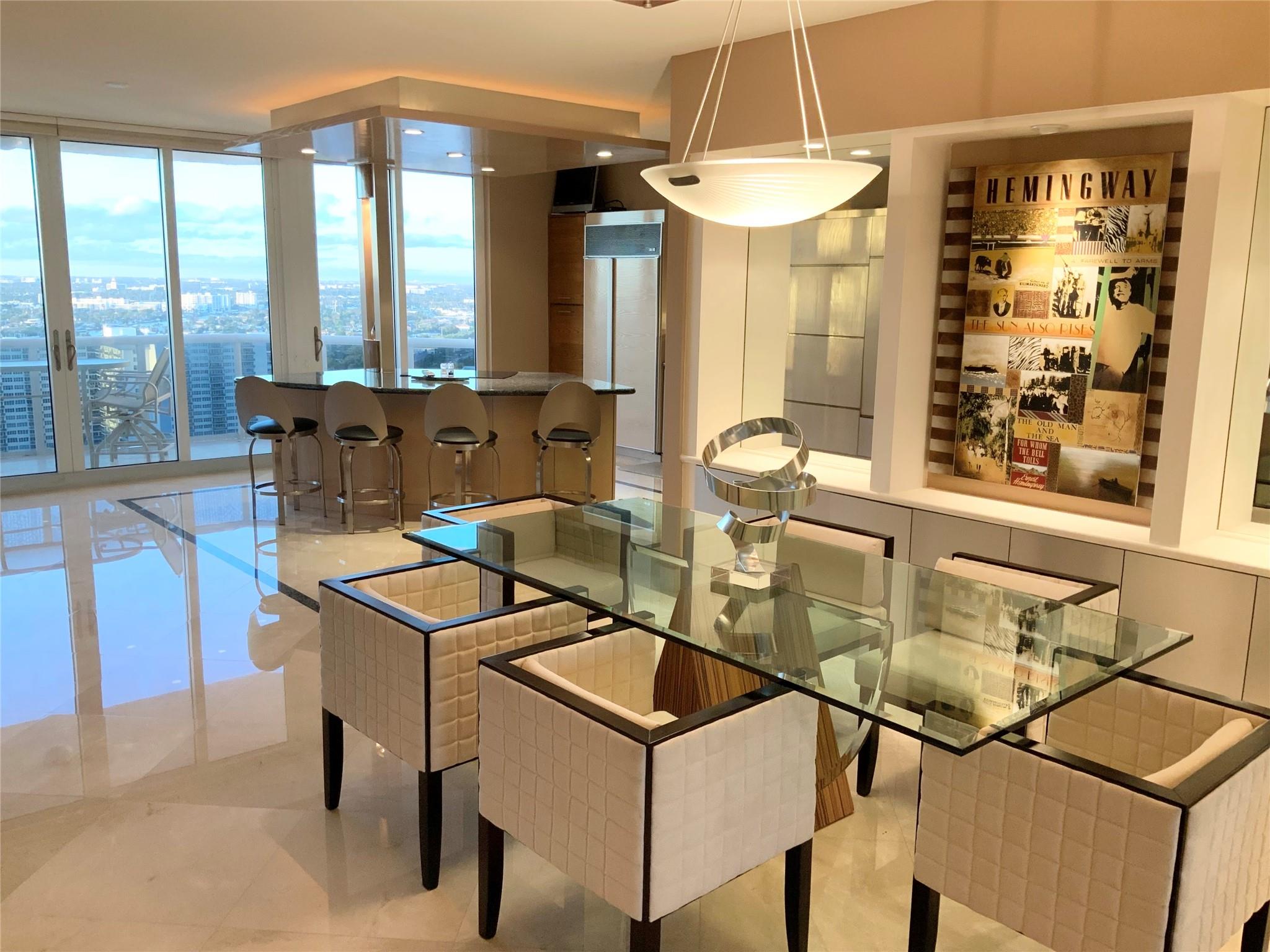 SOUTHEAST EXPOSURE. all day sun. PANORAMIC VIEWS of OCEAN, COASTLINE, CITY & WATERWAYS. CURRENTLY RENTED AT $10,000 a month until May, 2025. Third bedroom wall has been removed for open loft-like floor plan w a murphy-type wall bed/ built in. FURNISHED..Marble floors throughout . HURRICANE IMPACT DOORS. Elevator opens directly to condo. 2 terraces. RESORT-LIKE COMPLEX. 10 OCEANFRONT ACRES,2 tennis courts, 2 pools, 2 spas, POOLSIDE RESTAURANT: L'HERMITAGE BAR & GRILL. full bar. happy hours daily , eat in or delivery (maintenance fee INCLUDES a credit per quarter for food/beverage) concierge, cabanas, valet PLUS SELF PARK IN GARAGE, 2nd parking space available, beach attendant, BBQ , tikis and PET PARKS. 2 pets, ANY SIZE, OK