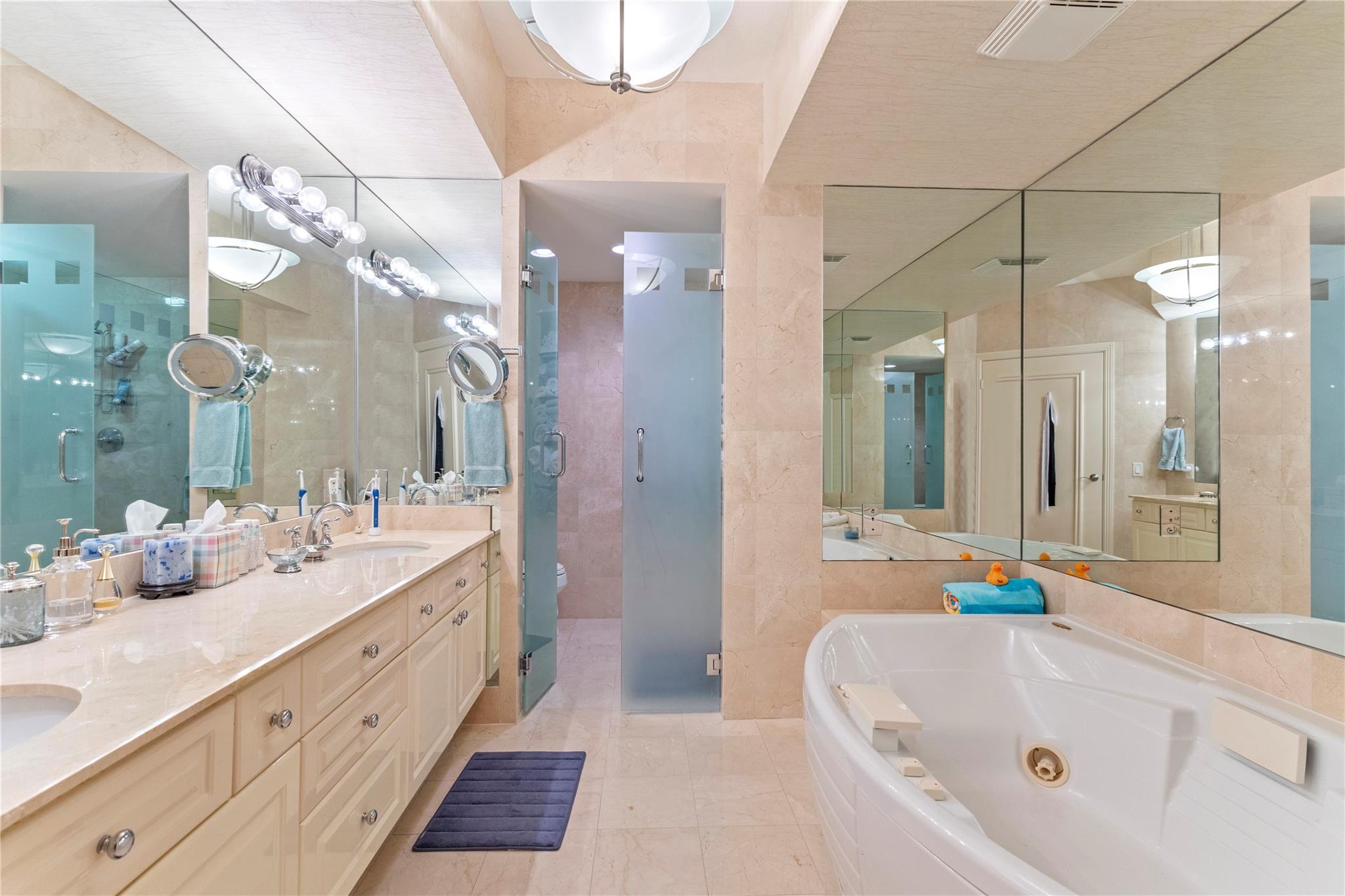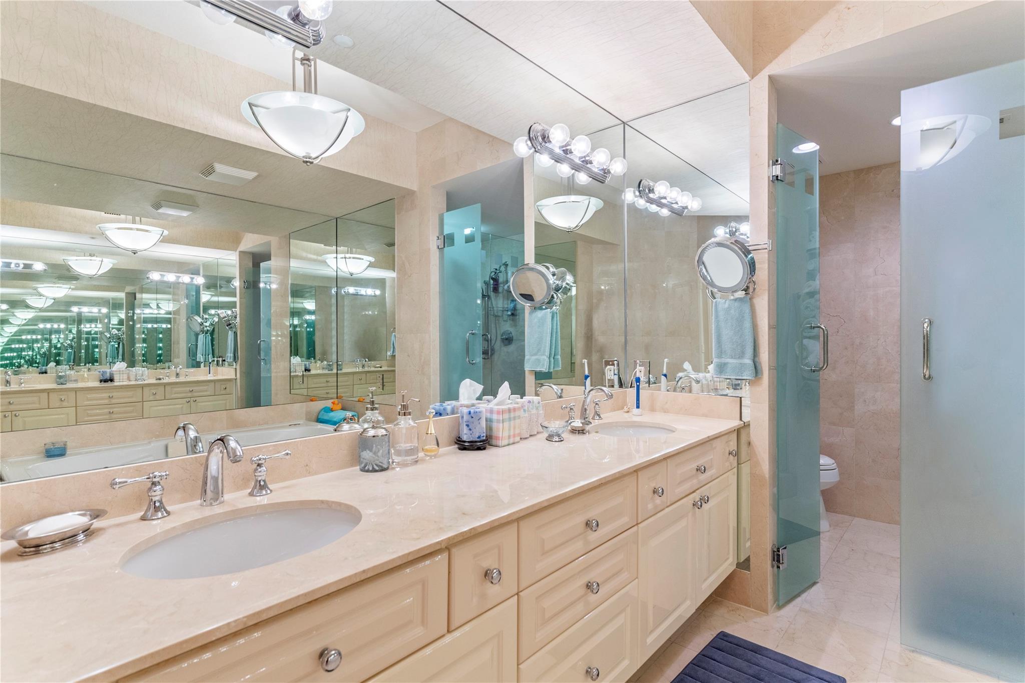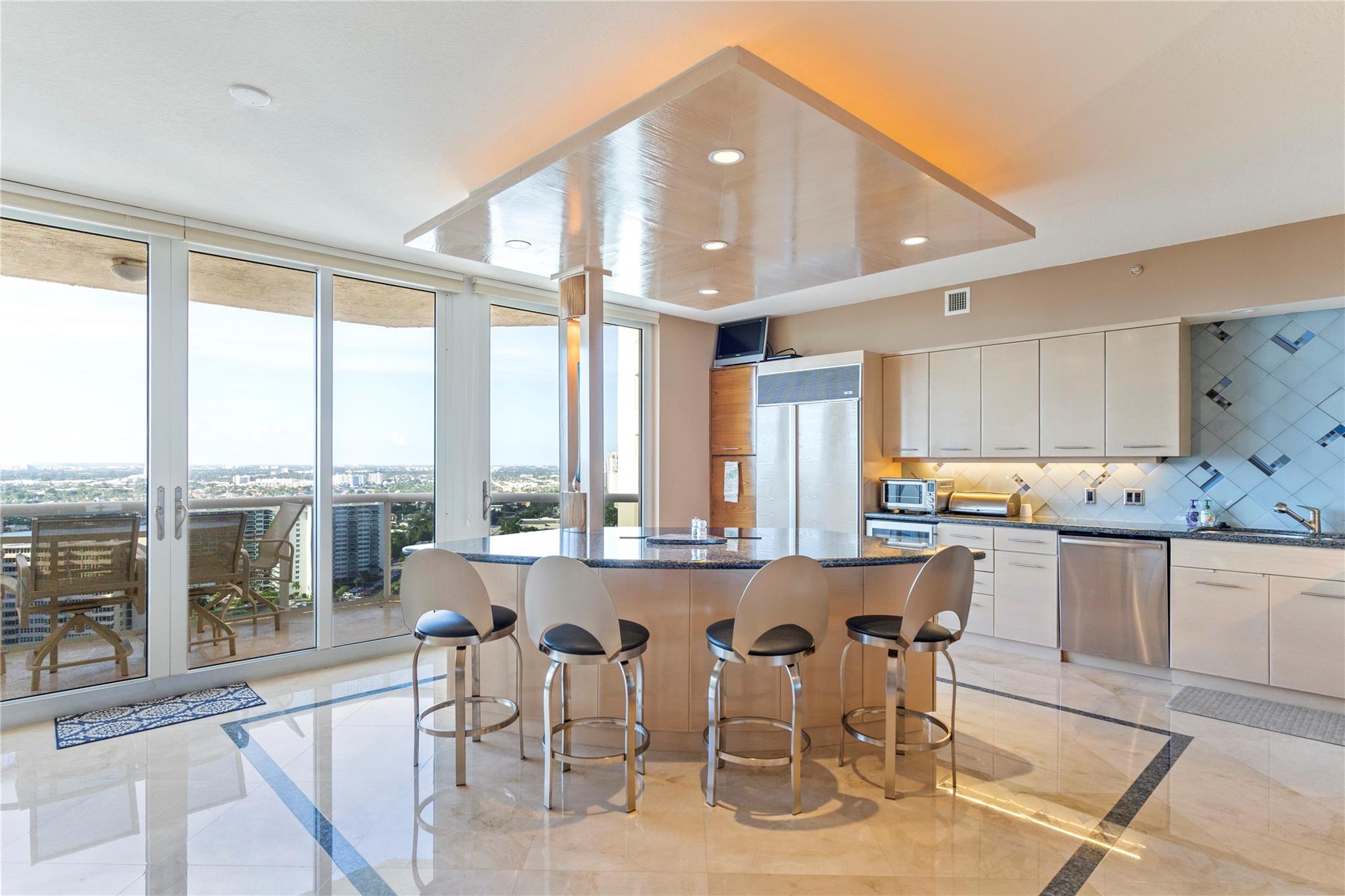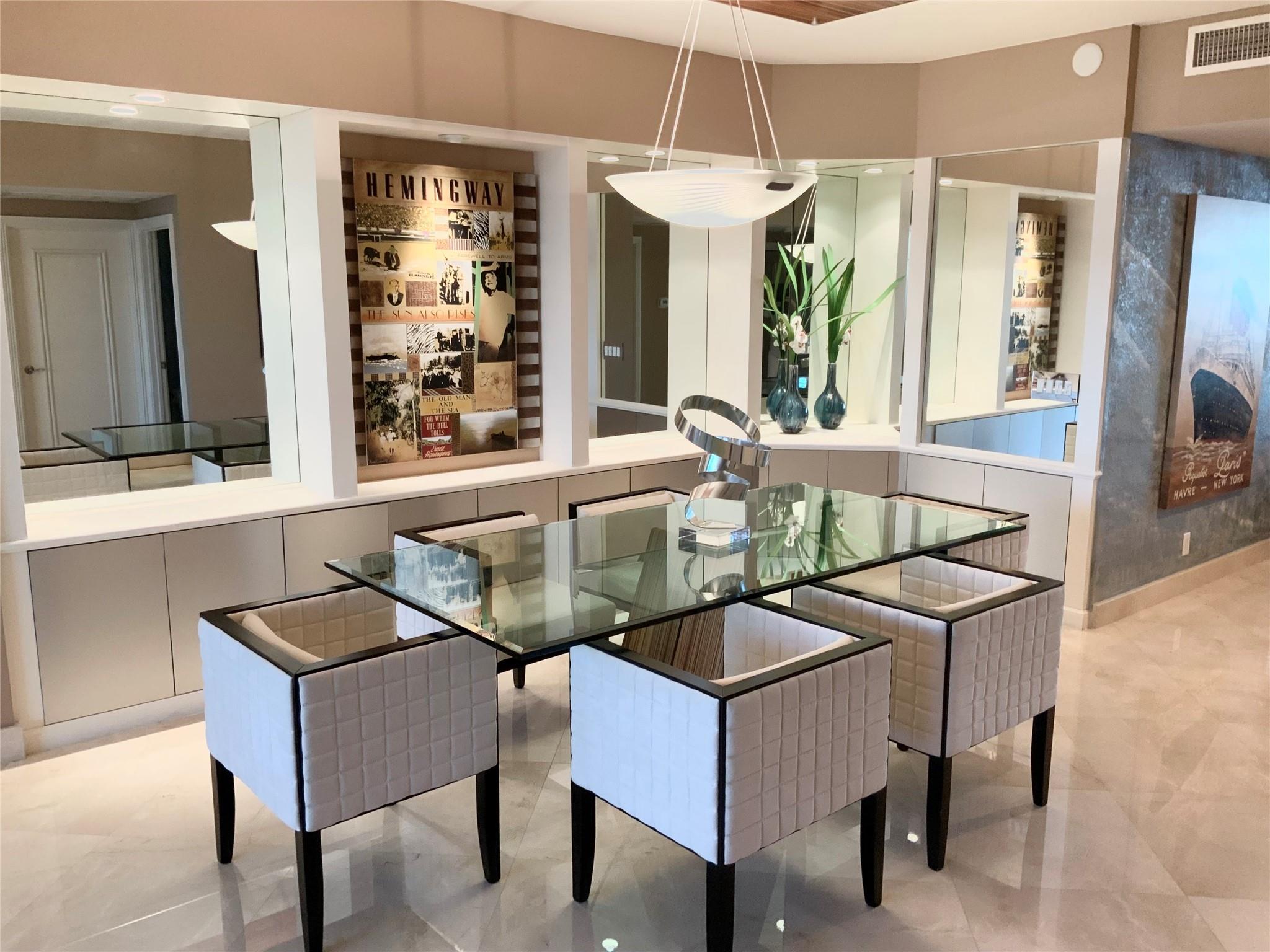 SOUTHEAST EXPOSURE. all day sun. PANORAMIC VIEWS of OCEAN, COASTLINE, CITY & WATERWAYS. CURRENTLY RENTED AT $10,000 a month until May, 2025. Third bedroom wall has been removed for open loft-like floor plan w a murphy-type wall bed/ built in. FURNISHED..Marble floors throughout . HURRICANE IMPACT DOORS. Elevator opens directly to condo. 2 terraces. RESORT-LIKE COMPLEX. 10 OCEANFRONT ACRES,2 tennis courts, 2 pools, 2 spas, POOLSIDE RESTAURANT: L'HERMITAGE BAR & GRILL. full bar. happy hours daily , eat in or delivery (maintenance fee INCLUDES a credit per quarter for food/beverage) concierge, cabanas, valet PLUS SELF PARK IN GARAGE, 2nd parking space available, beach attendant, BBQ , tikis and PET PARKS. 2 pets, ANY SIZE, OK