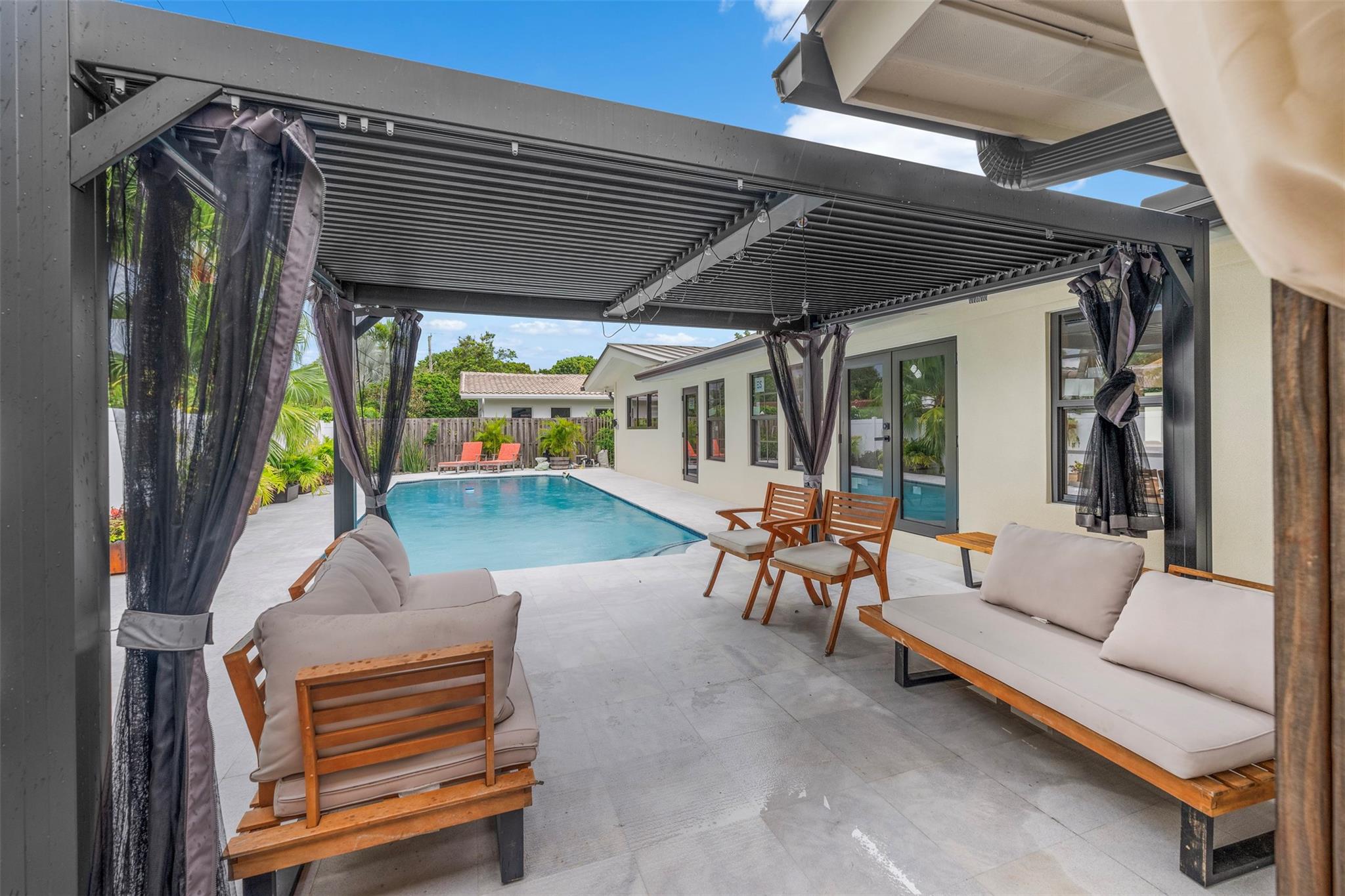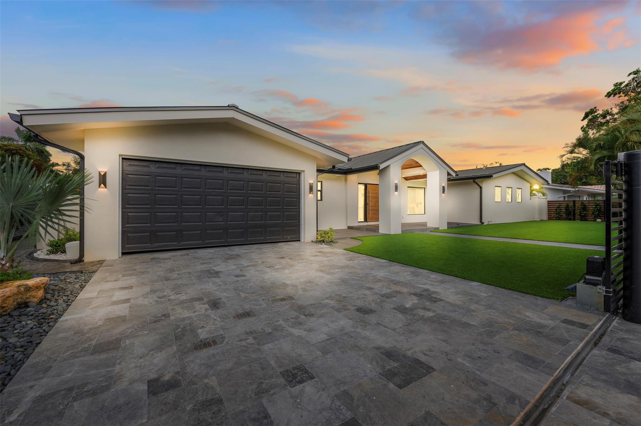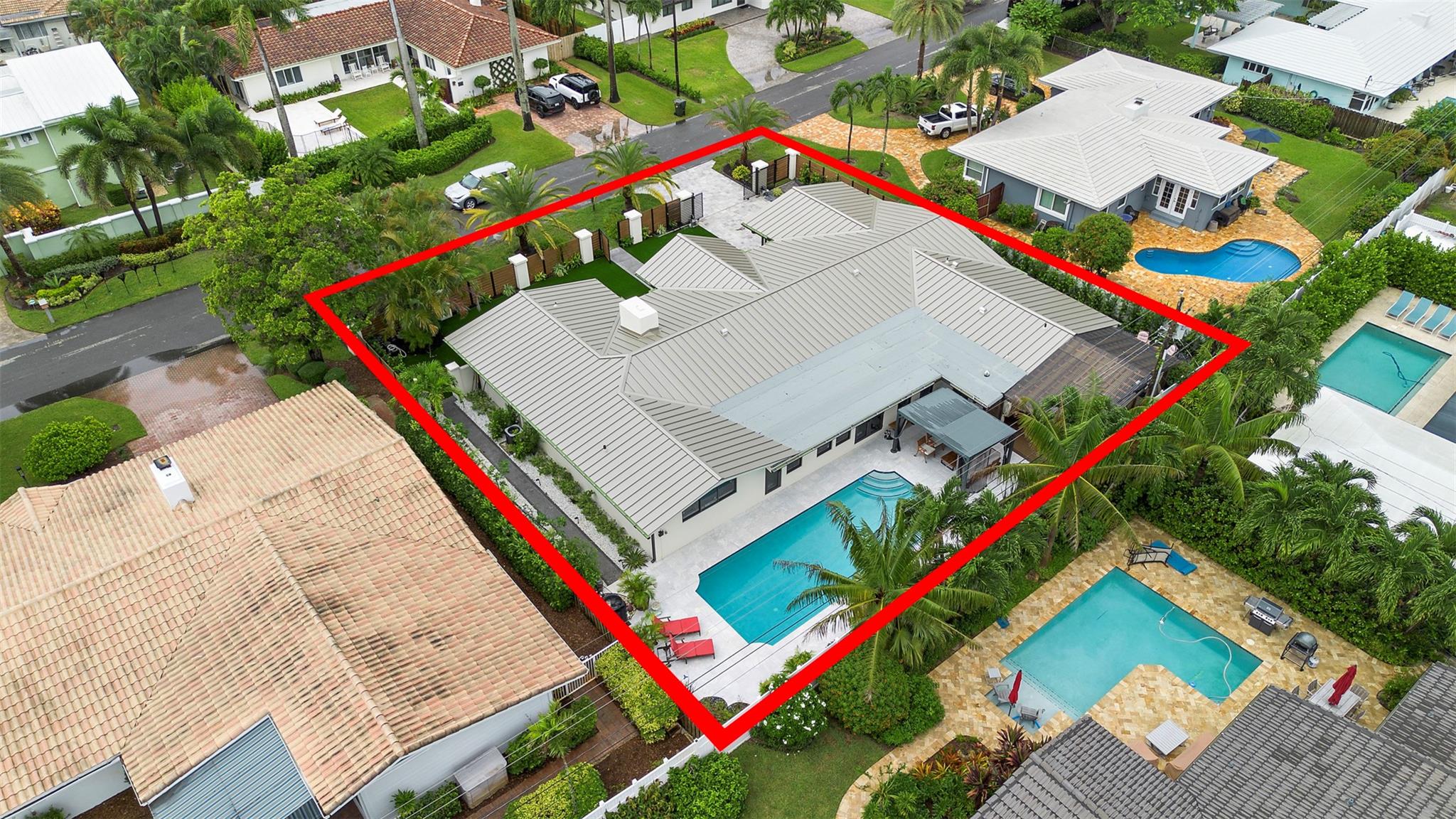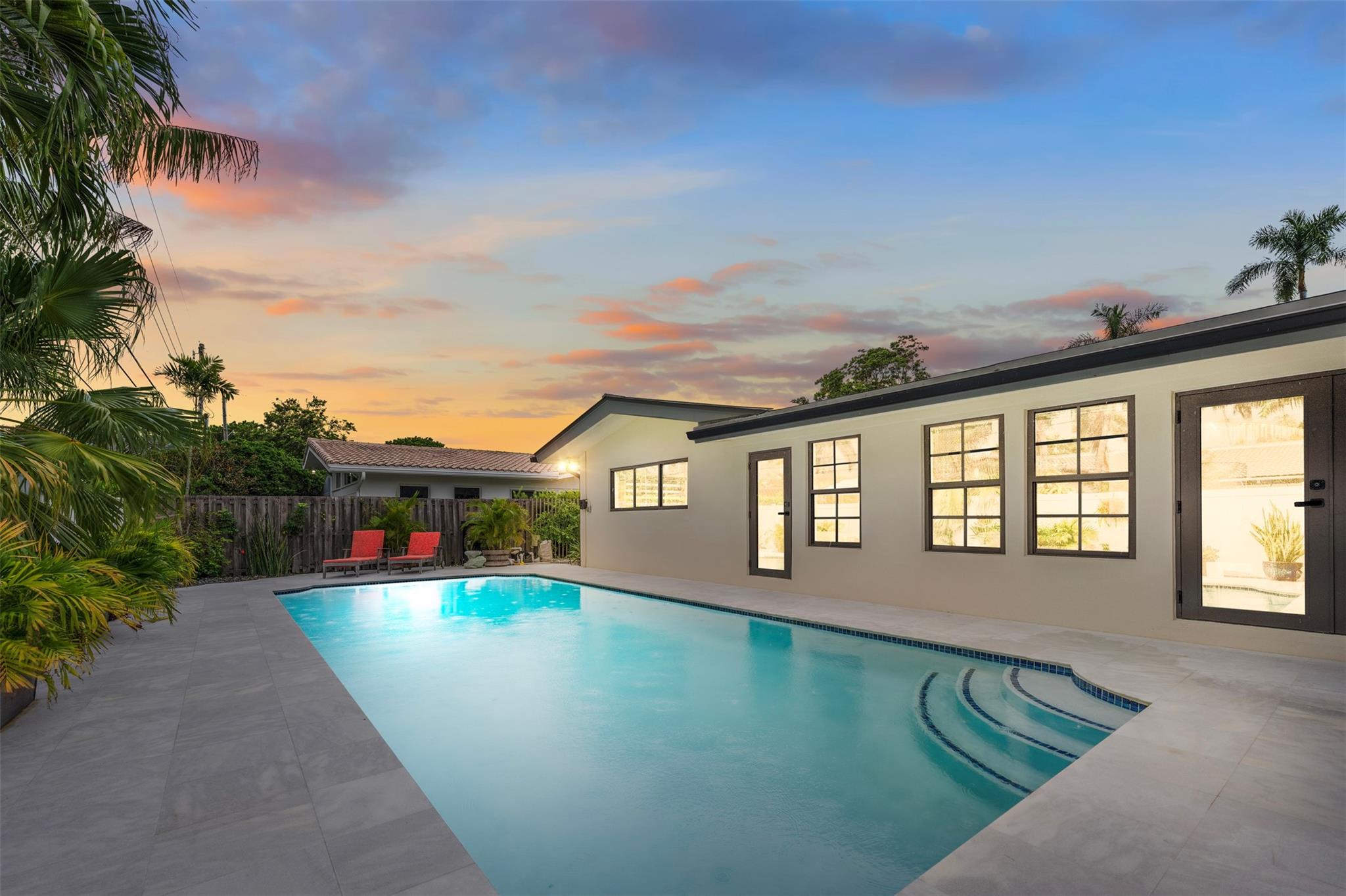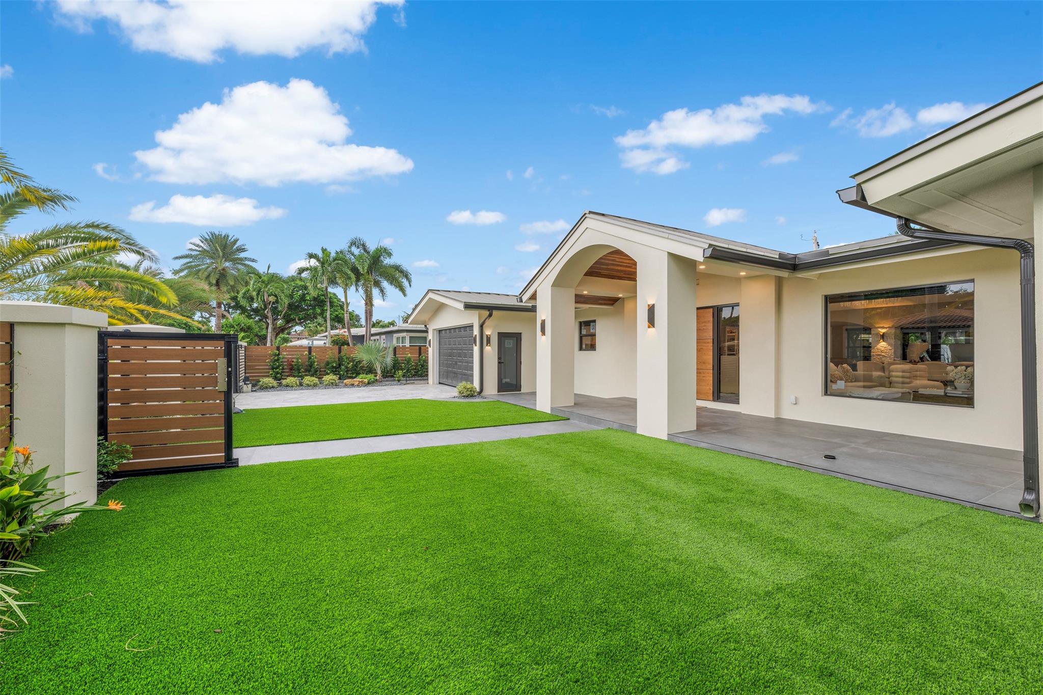 The epitome of elegance in this 4/3 with a 2-car+ garage in Coral Ridges Bayview School District. Over 3,000 SF perfectly manicured. Modern style and functionally with its sleek finishes, open living spaces and private gated entrance for ultimate seclusion. Renovated inside and outside w. vaulted ceiling, PVC fencing, impact windows & doors finished in 2024, aluminum roof, pool, pergolas and more. Gourmet kitchen with center dining island, separate formal dining, large walk-in pantry, Huge laundry room, linear air ducts, modern fixtures, and appliances. Amazing outdoor covered living space, pool bathroom and shower, fire pit. perfect for relaxation, entertaining and parties. Under 1 mile to Fort Lauderdale Beach, less than a mile to Oakland Park shops and restaurants and Galleria Mall.