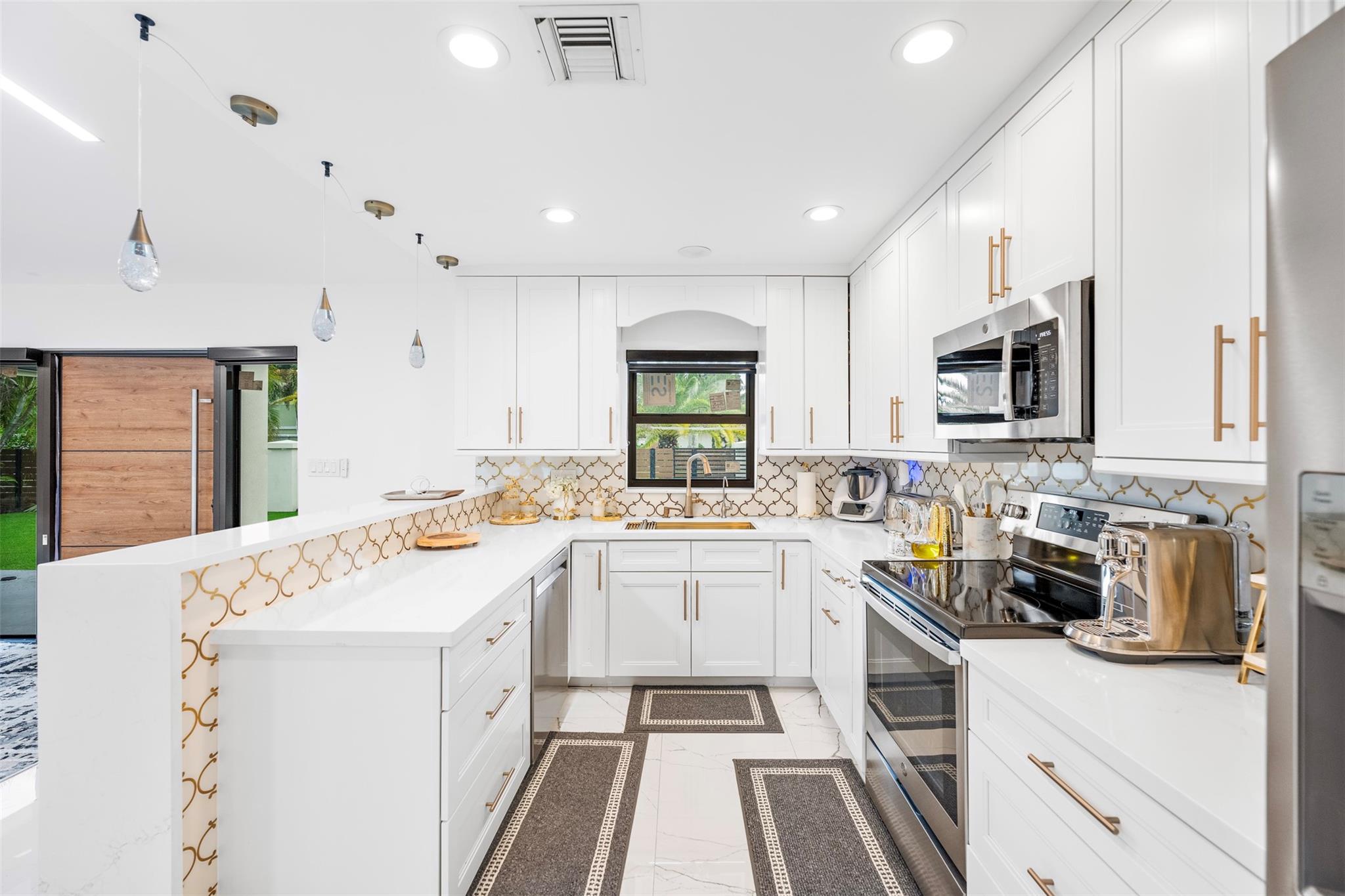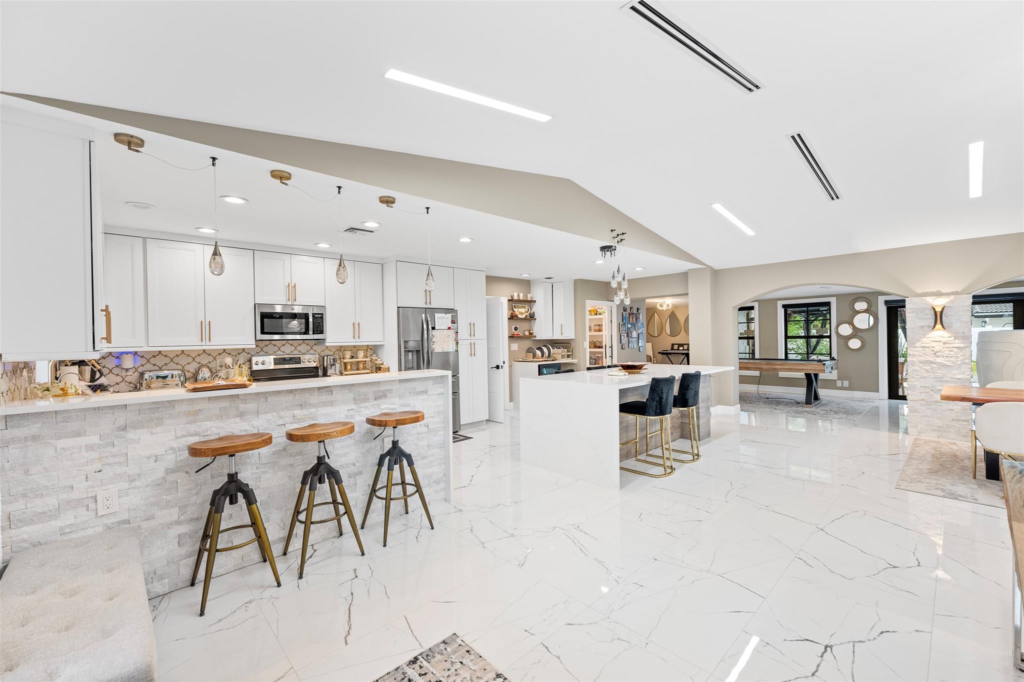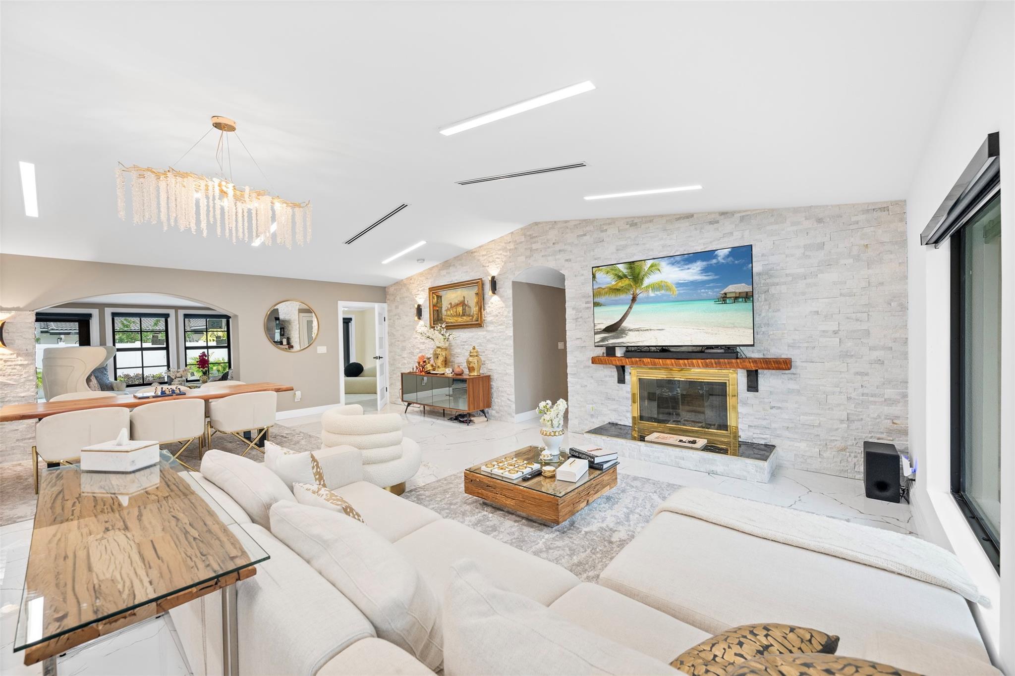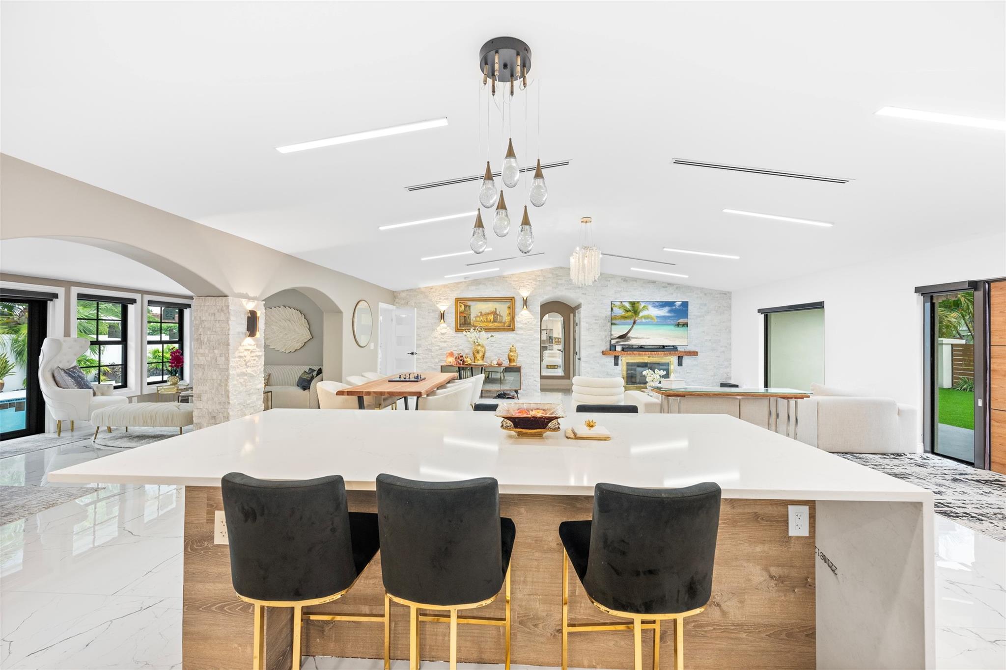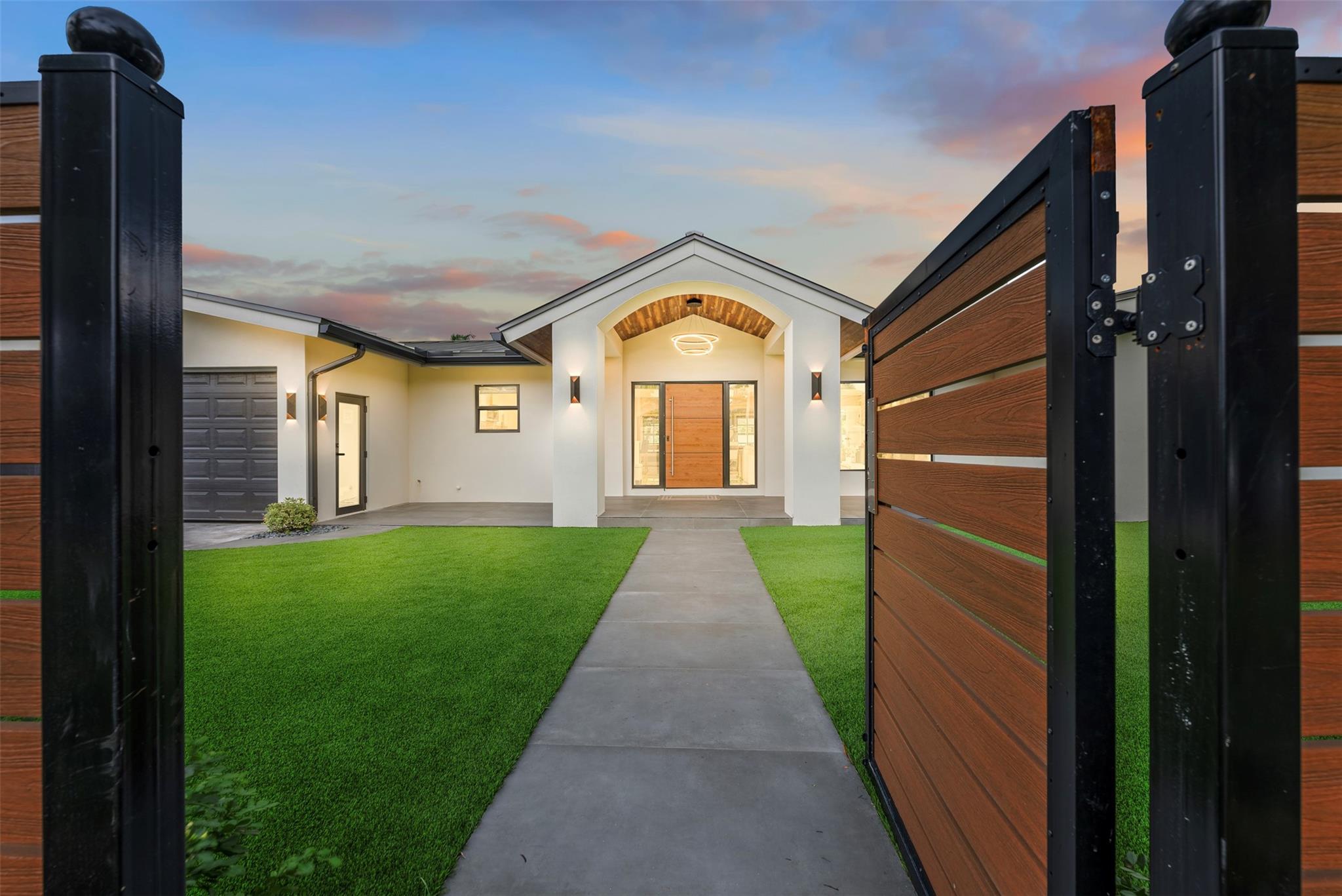 The epitome of elegance in this 4/3 with a 2-car+ garage in Coral Ridges Bayview School District. Over 3,000 SF perfectly manicured. Modern style and functionally with its sleek finishes, open living spaces and private gated entrance for ultimate seclusion. Renovated inside and outside w. vaulted ceiling, PVC fencing, impact windows & doors finished in 2024, aluminum roof, pool, pergolas and more. Gourmet kitchen with center dining island, separate formal dining, large walk-in pantry, Huge laundry room, linear air ducts, modern fixtures, and appliances. Amazing outdoor covered living space, pool bathroom and shower, fire pit. perfect for relaxation, entertaining and parties. Under 1 mile to Fort Lauderdale Beach, less than a mile to Oakland Park shops and restaurants and Galleria Mall.