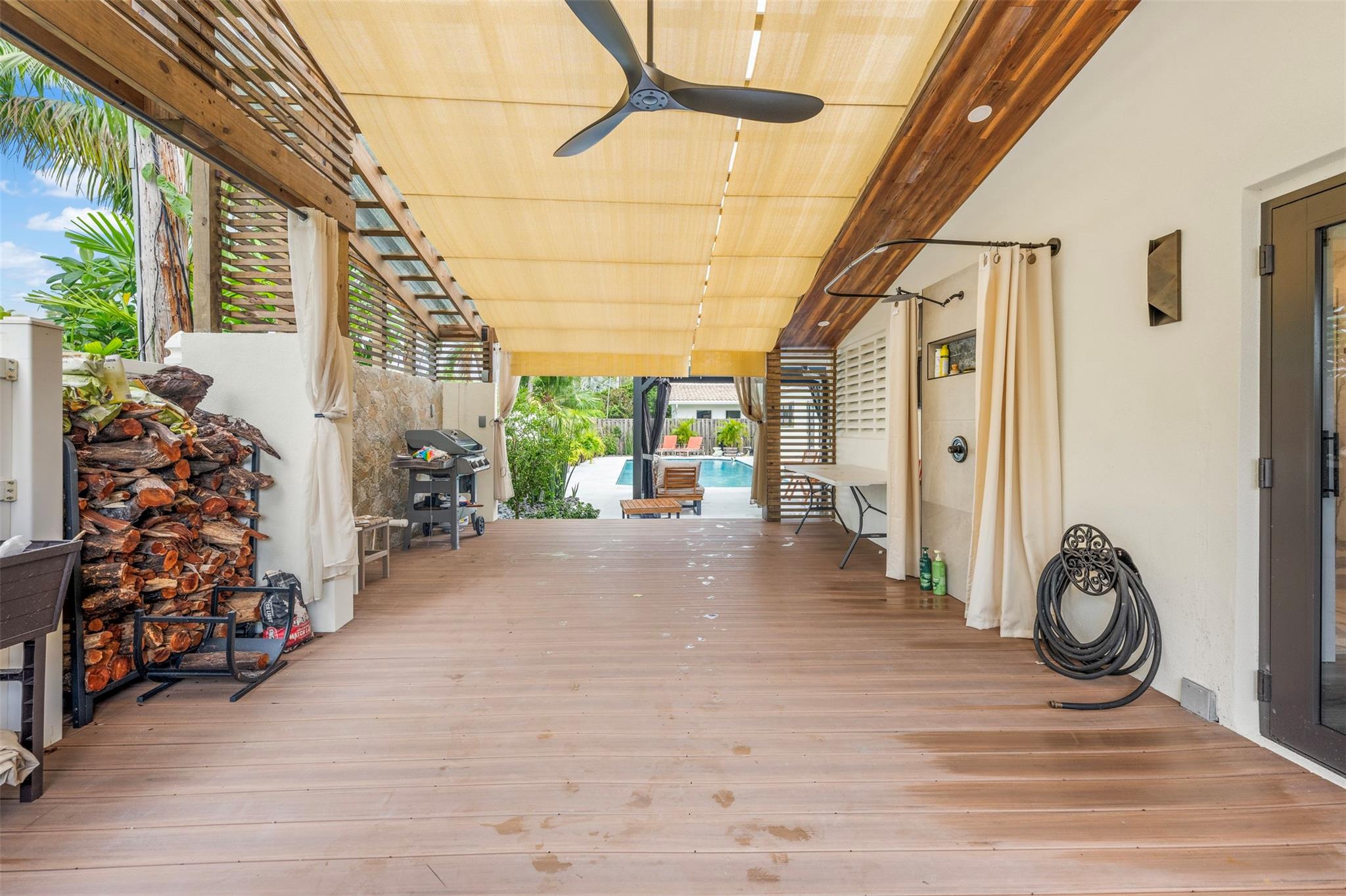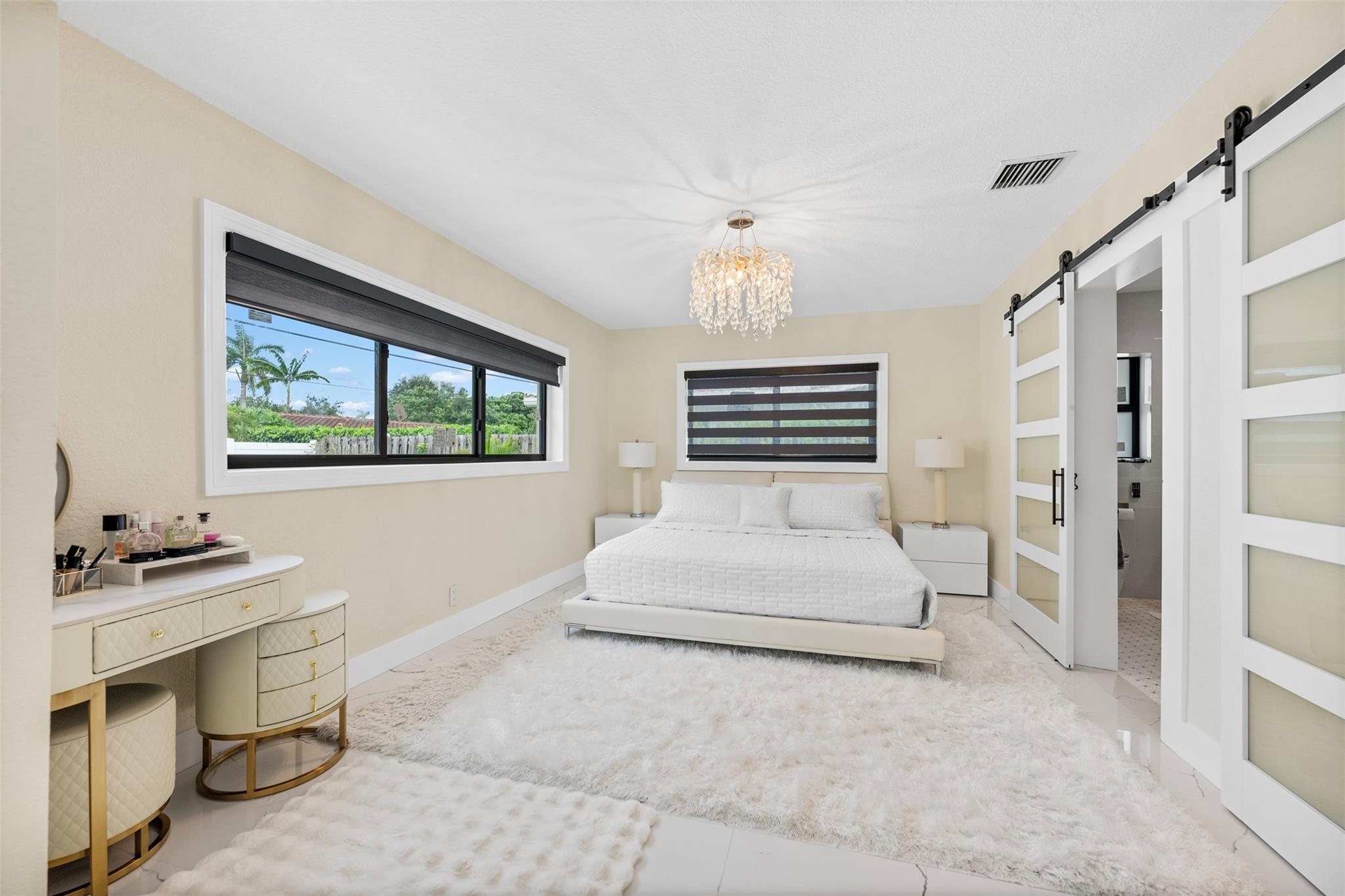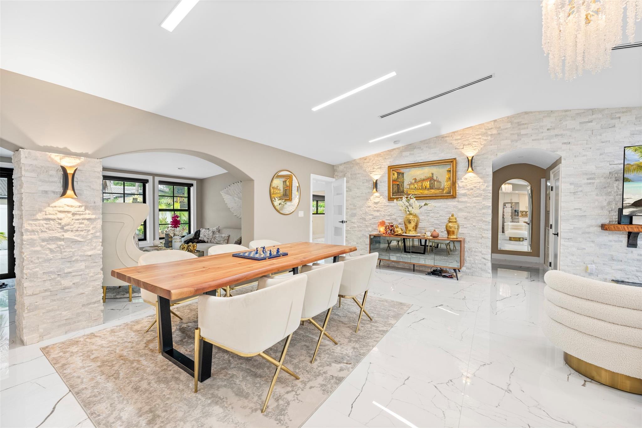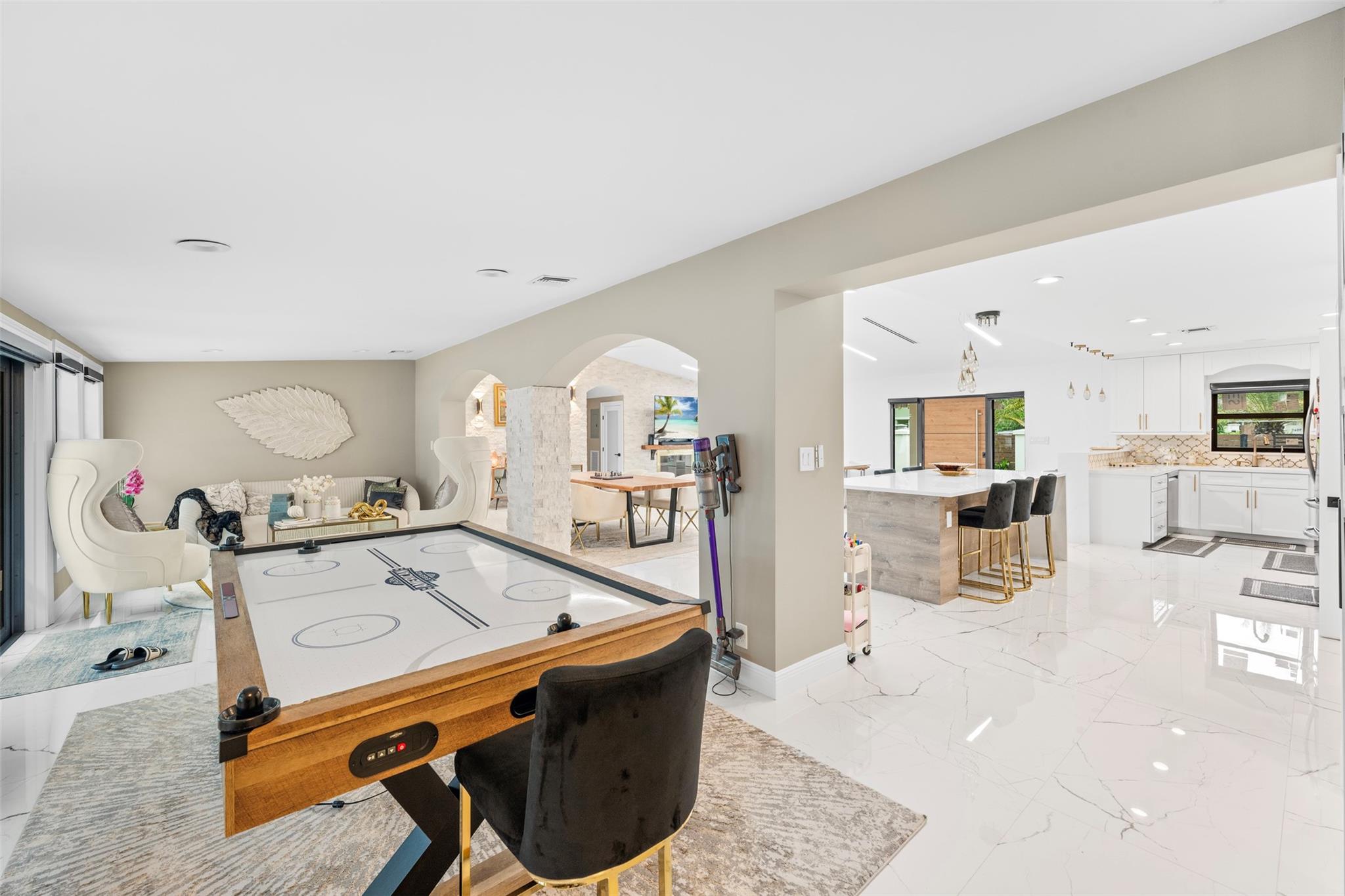 The epitome of elegance in this 4/3 with a 2-car+ garage in Coral Ridges Bayview School District. Over 3,000 SF perfectly manicured. Modern style and functionally with its sleek finishes, open living spaces and private gated entrance for ultimate seclusion. Renovated inside and outside w. vaulted ceiling, PVC fencing, impact windows & doors finished in 2024, aluminum roof, pool, pergolas and more. Gourmet kitchen with center dining island, separate formal dining, large walk-in pantry, Huge laundry room, linear air ducts, modern fixtures, and appliances. Amazing outdoor covered living space, pool bathroom and shower, fire pit. perfect for relaxation, entertaining and parties. Under 1 mile to Fort Lauderdale Beach, less than a mile to Oakland Park shops and restaurants and Galleria Mall.
