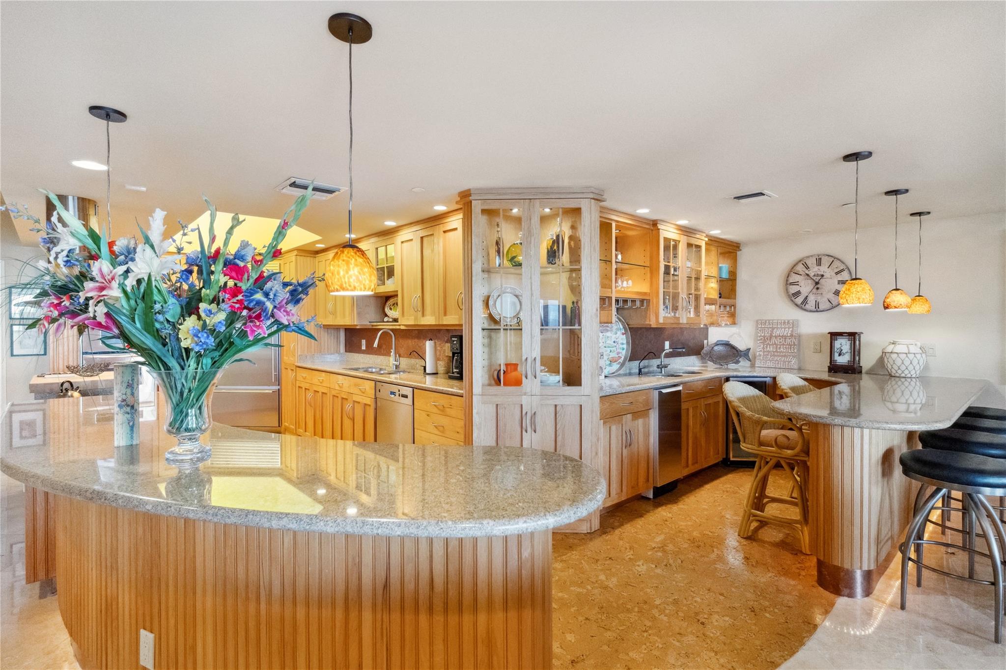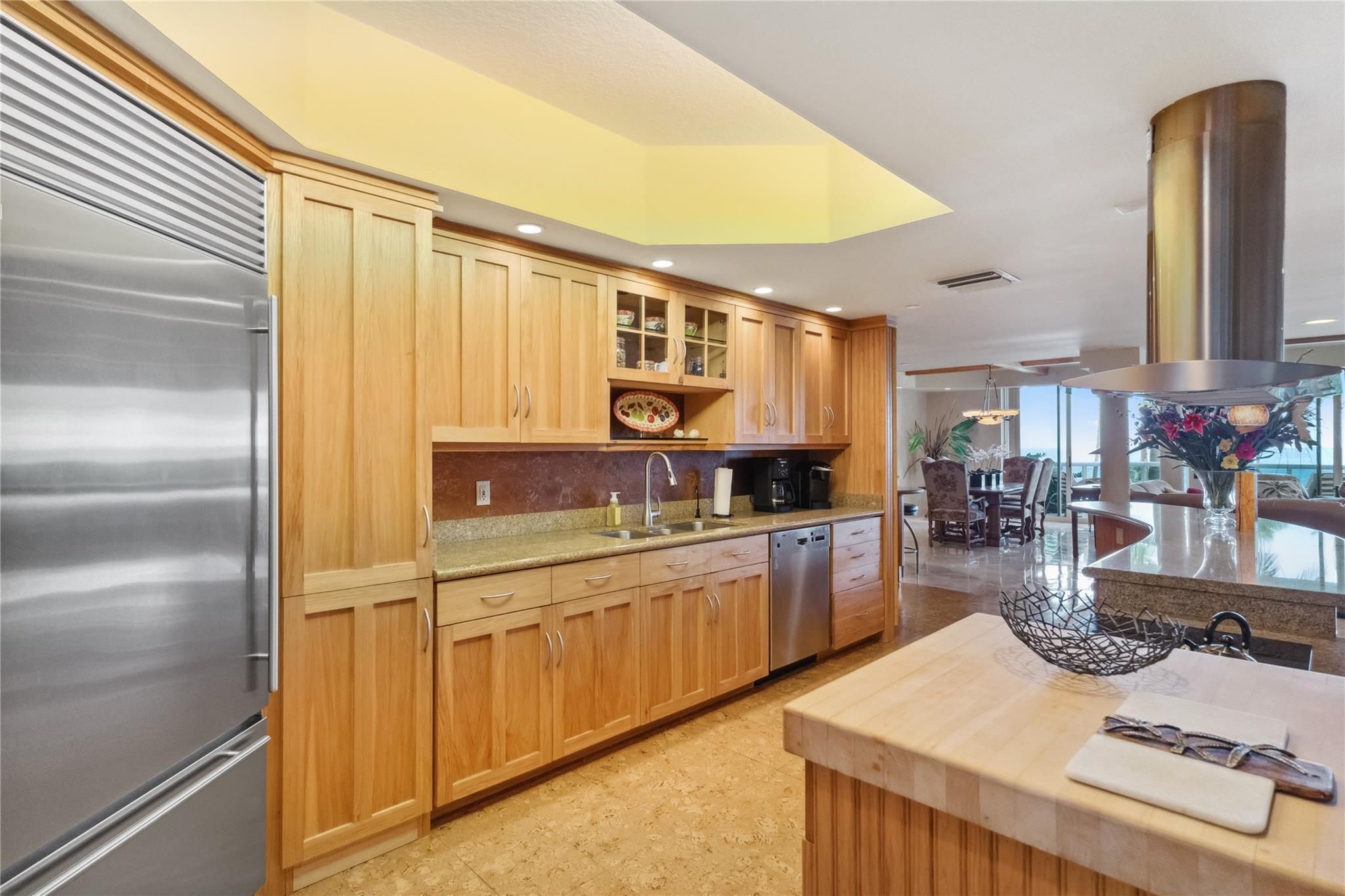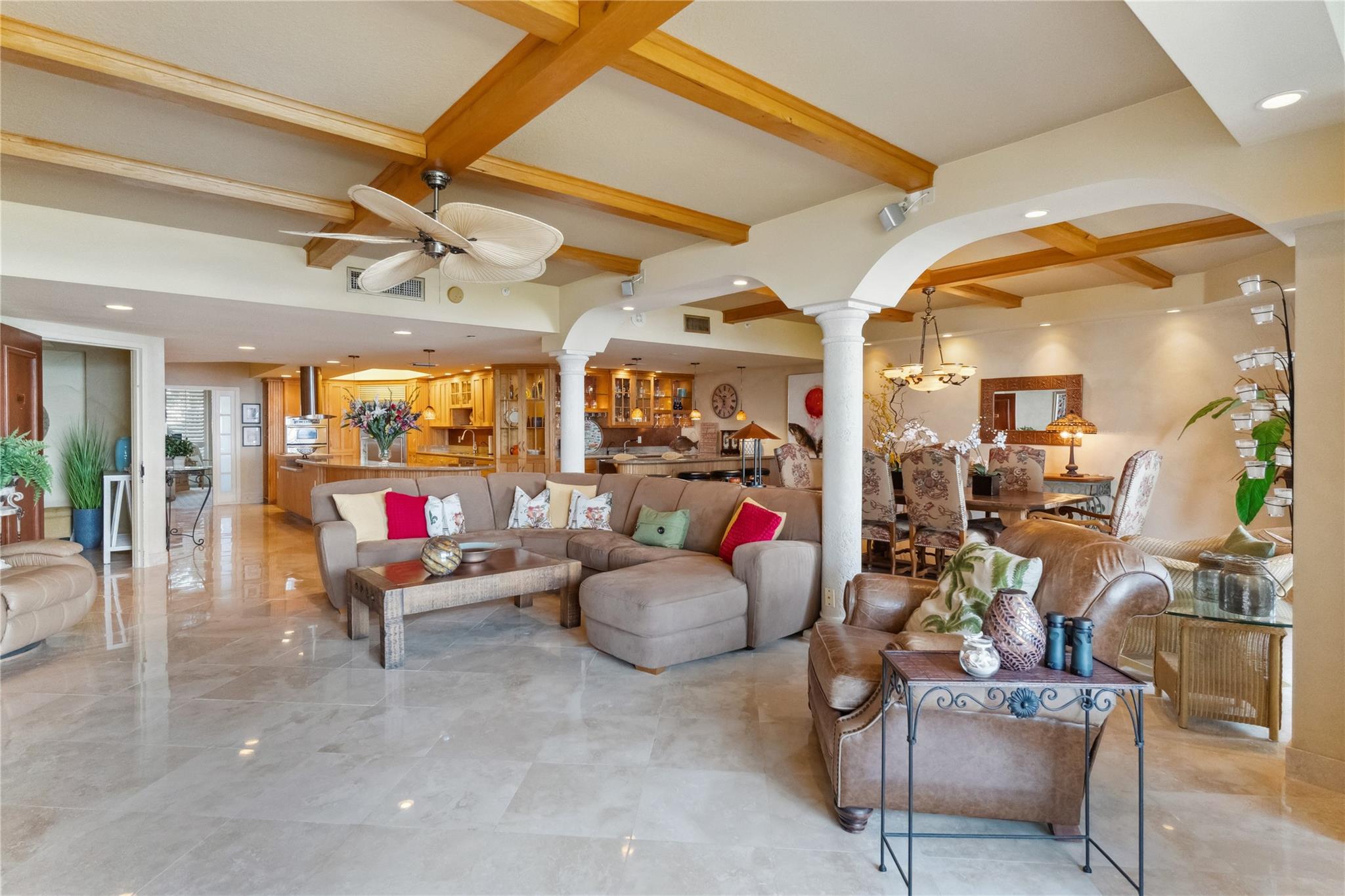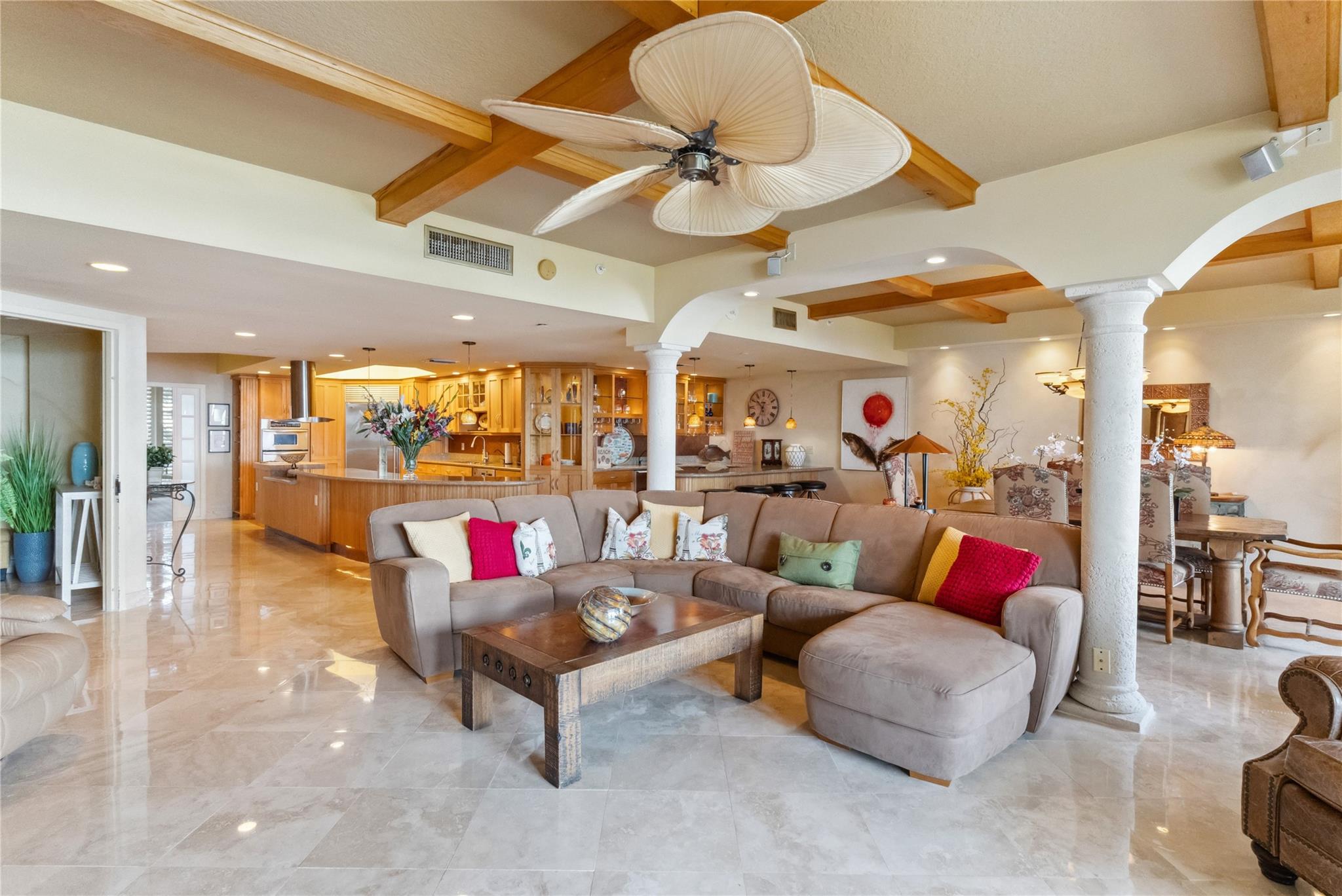 SUNNY…SOUTHEAST EXPOSURE WITH EXPANSIVE OCEAN VIEWS .Very beautiful ,house-like feeling. Impressive great room with open kitchen , bar area, dining and living areas..2 bedrooms plus a bonus room with bunk beds for children. Tropical paradise . Large terraces..RESORT-like complex with poolside restaurant , 2 pools, 2 spas, beach pavilion w tiki huts, bbq grills, cabanas and beach attendant. More amenities include: 2 clay (HAR TRU) tennis courts, valet for guests and SELF PARKING IN GARAGE FOR RESIDENTS, concierge, state-of-the-art the art exercise room. Two pets , any size ok, pet park, too. EASY TO SEE..