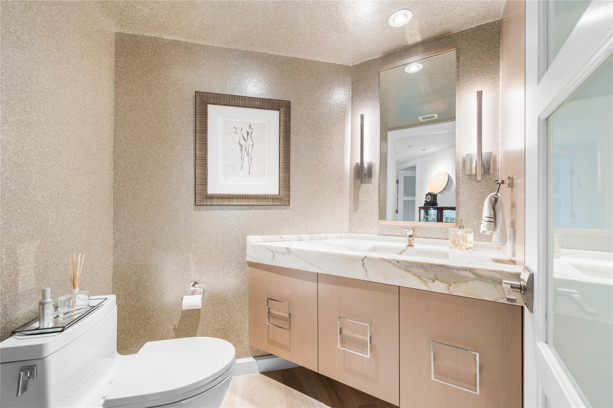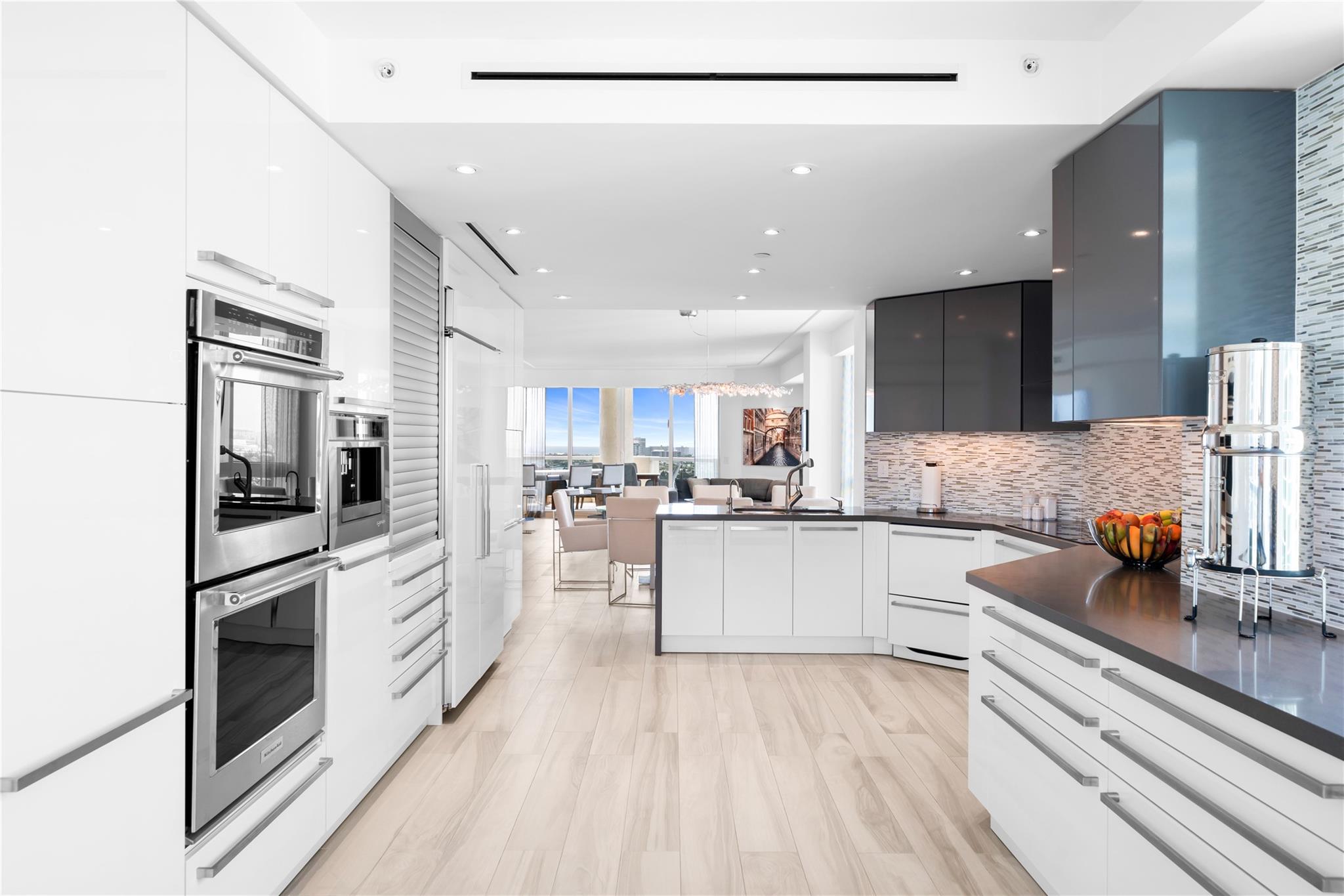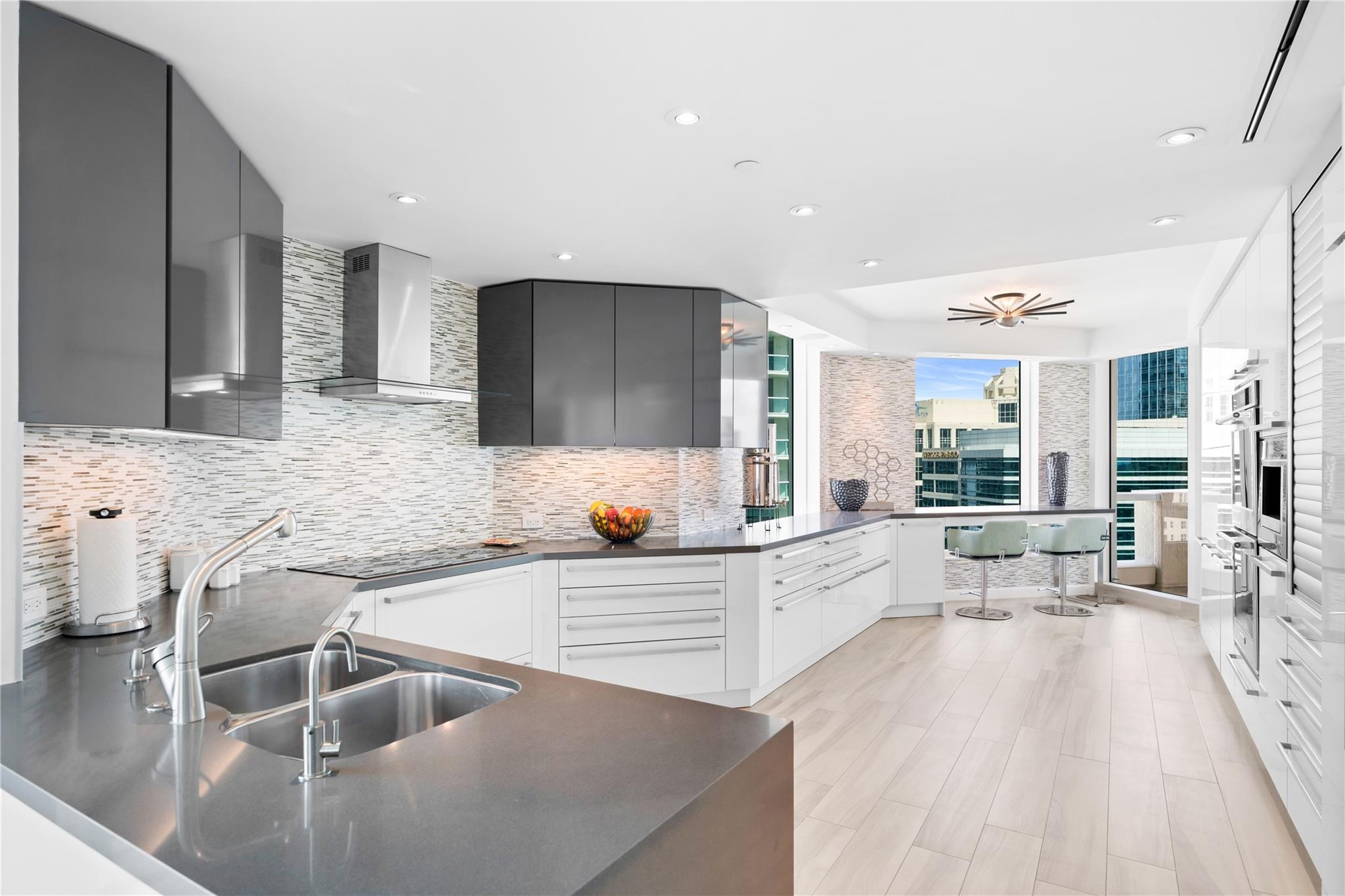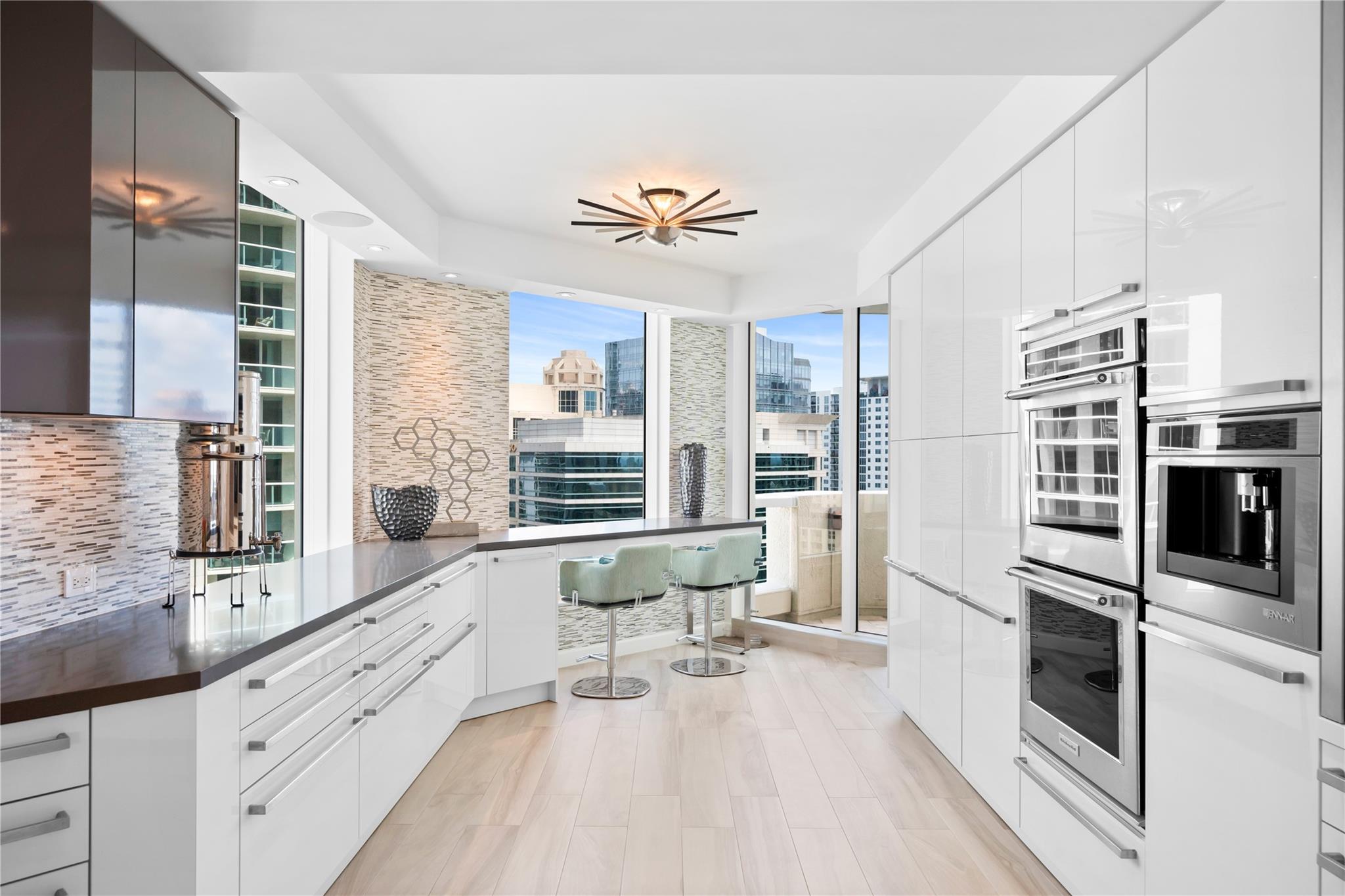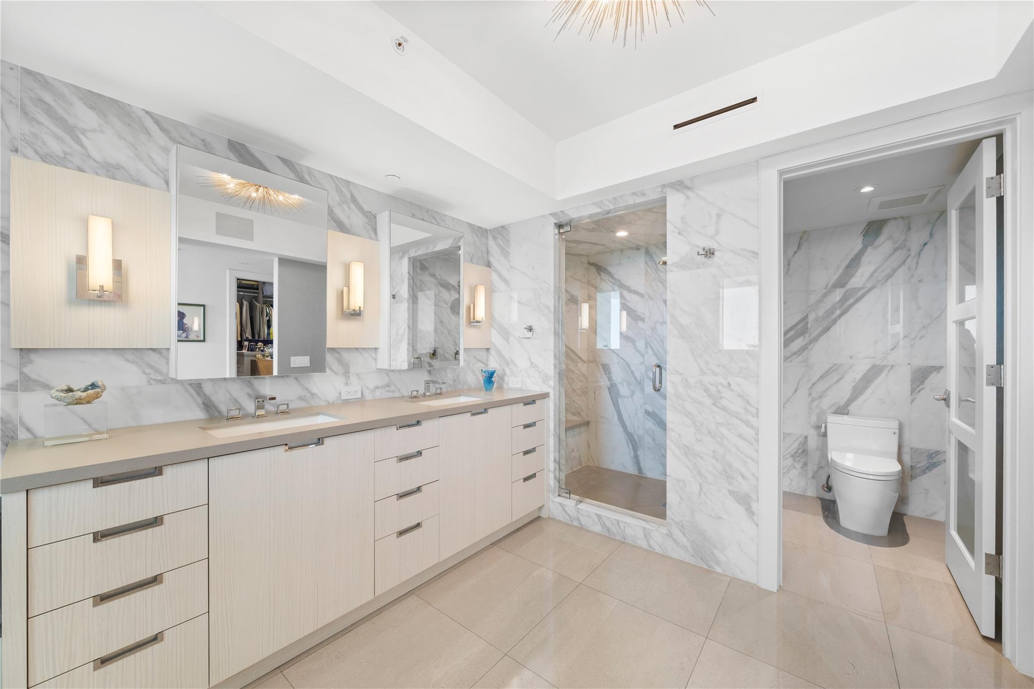 Dramatic ocean, intracoastal & river views! SE Corner Contemporary Residence created & delivered by award winning Causa Design firm! This complete renovation features a gallery like foyer w/ an illuminated custom ceiling, touch of a button smart home system, porcelain floors; leading into a spacious open living area w/ large covered terraces. Customized gourmet kitchen optimizes the space w/quartz stone countertops, expanded cabinetry, top-of-the-line appliances, full mosaic backsplash & Calcutta gold marble bar. The primary suite features a large walk-in closet, beautifully adorned bath w/ full walls of marble stone, soaking tub, Calcutta gold marble vanities & custom lighting. Guest bedrooms feature ensuite baths & city skyline terraces. 2 PARKING SPACES & LARGE STORAGE CAGE INCLUDED