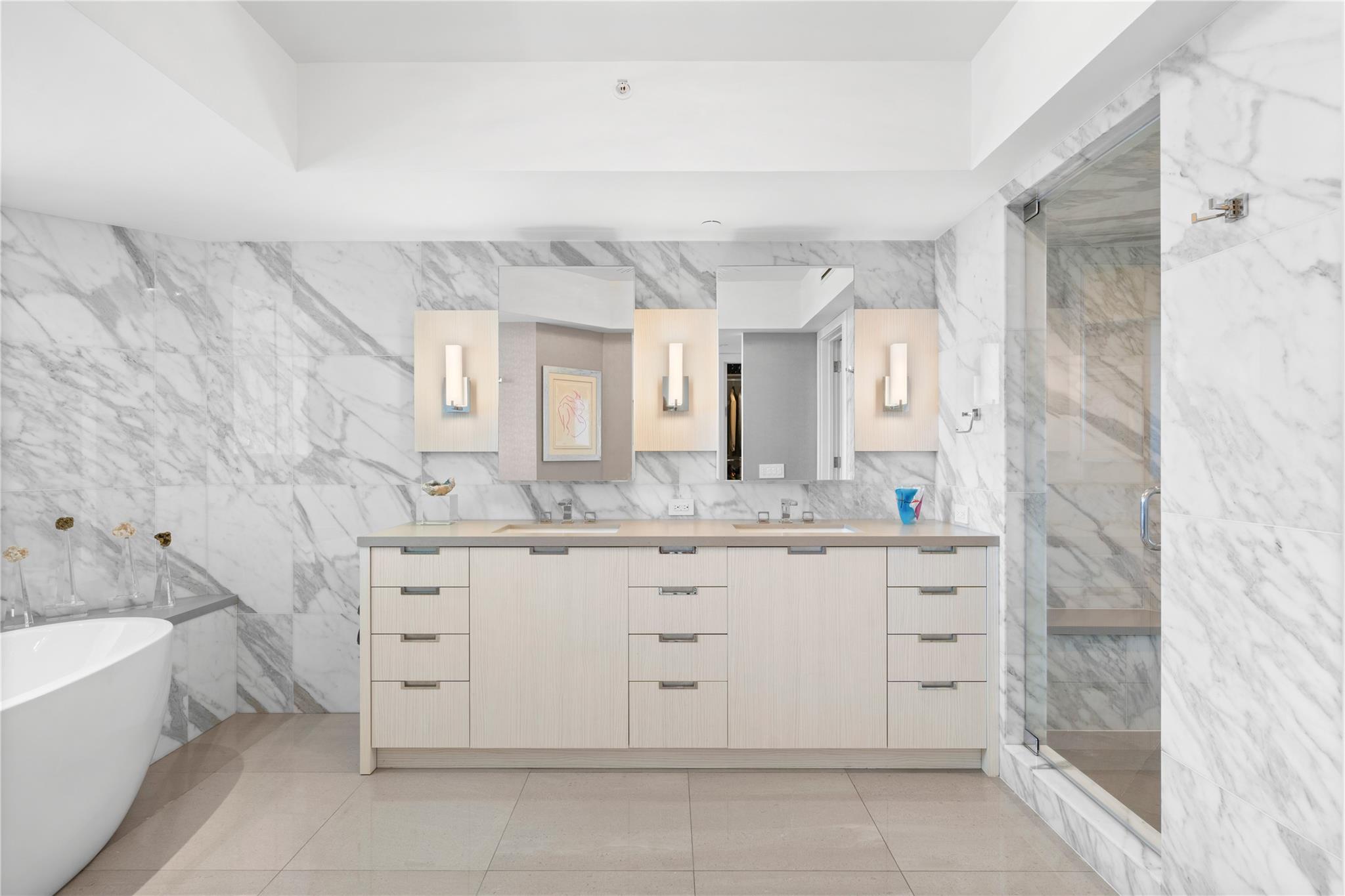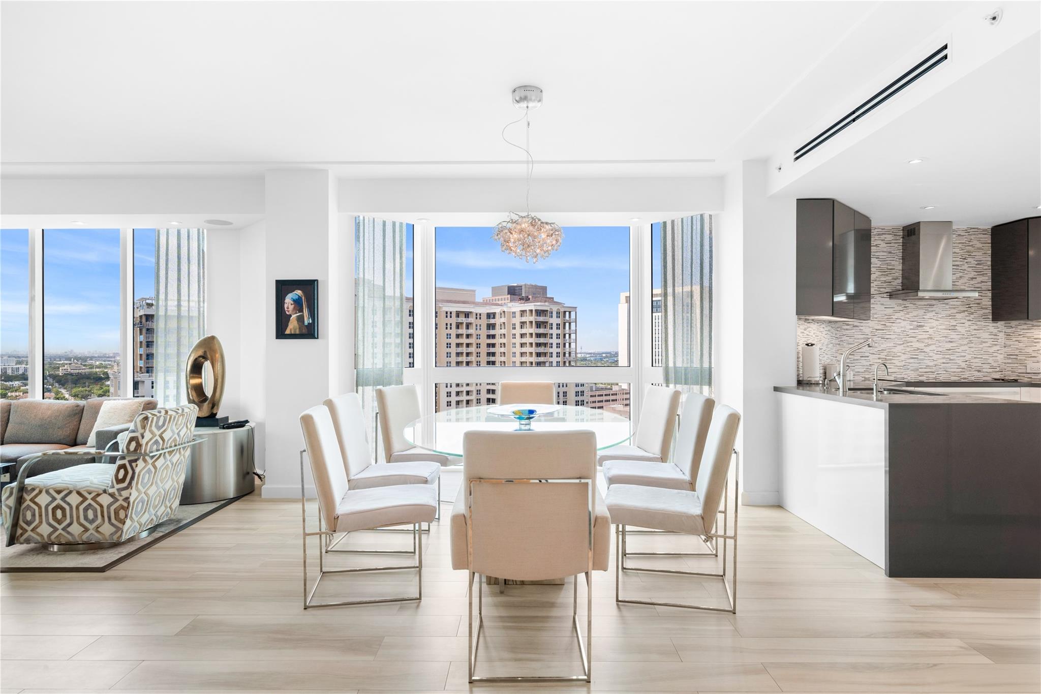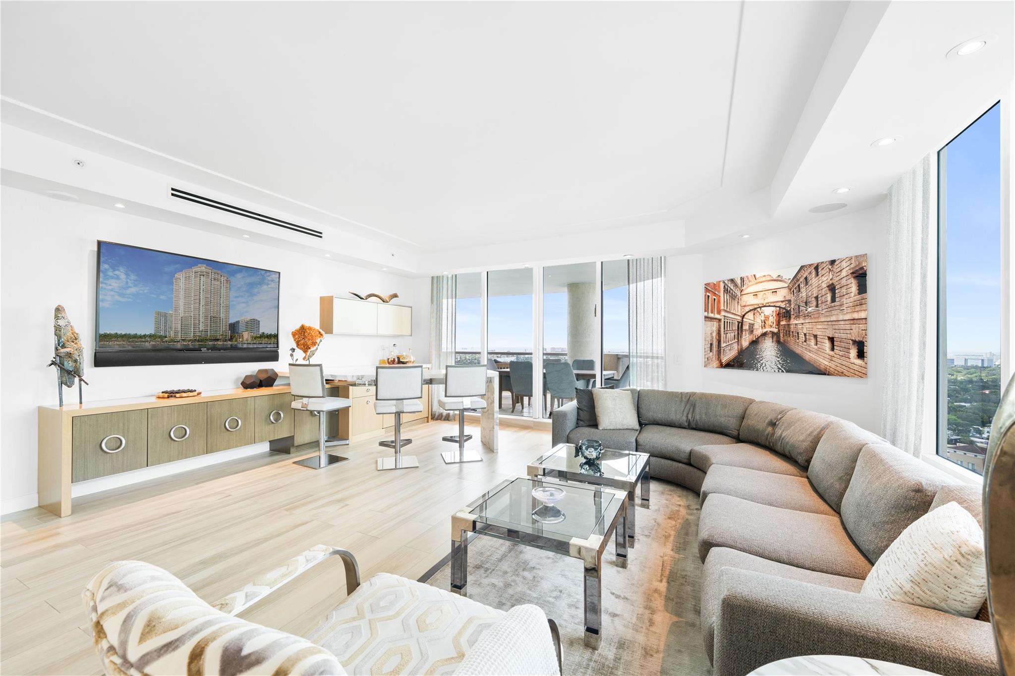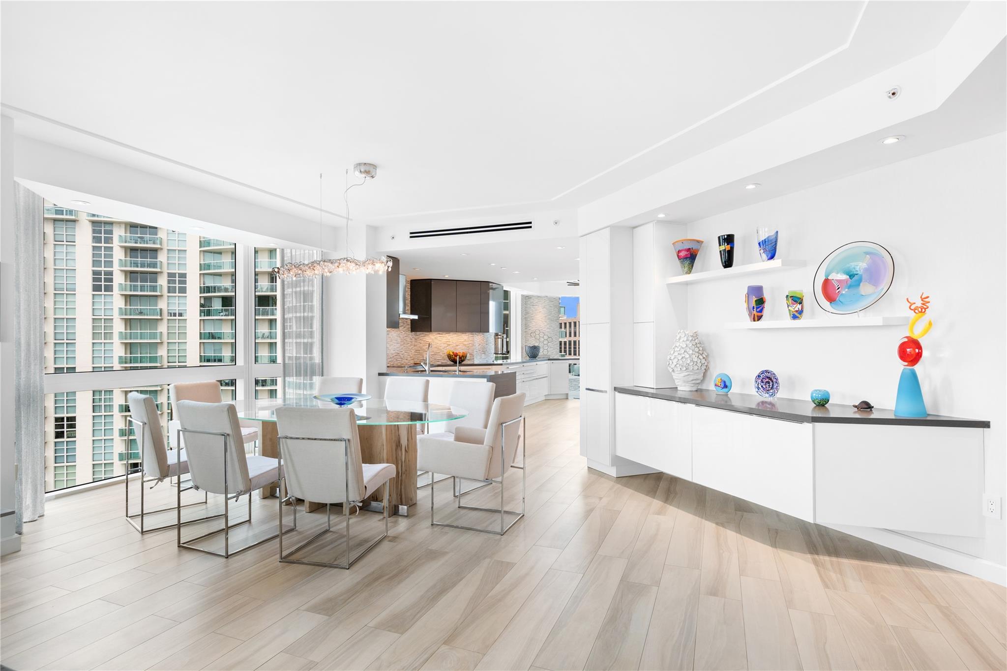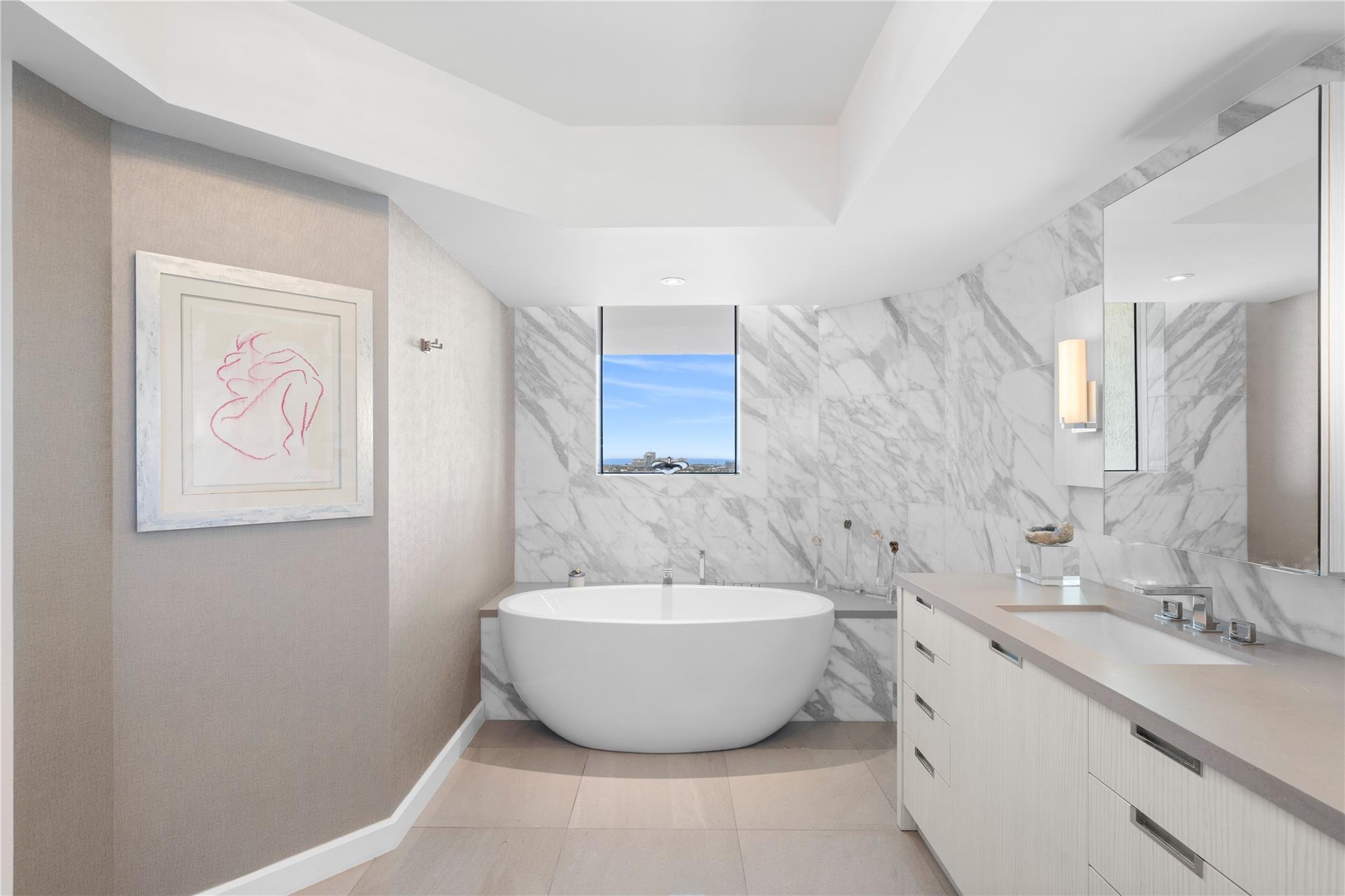 Dramatic ocean, intracoastal & river views! SE Corner Contemporary Residence created & delivered by award winning Causa Design firm! This complete renovation features a gallery like foyer w/ an illuminated custom ceiling, touch of a button smart home system, porcelain floors; leading into a spacious open living area w/ large covered terraces. Customized gourmet kitchen optimizes the space w/quartz stone countertops, expanded cabinetry, top-of-the-line appliances, full mosaic backsplash & Calcutta gold marble bar. The primary suite features a large walk-in closet, beautifully adorned bath w/ full walls of marble stone, soaking tub, Calcutta gold marble vanities & custom lighting. Guest bedrooms feature ensuite baths & city skyline terraces. 2 PARKING SPACES & LARGE STORAGE CAGE INCLUDED
