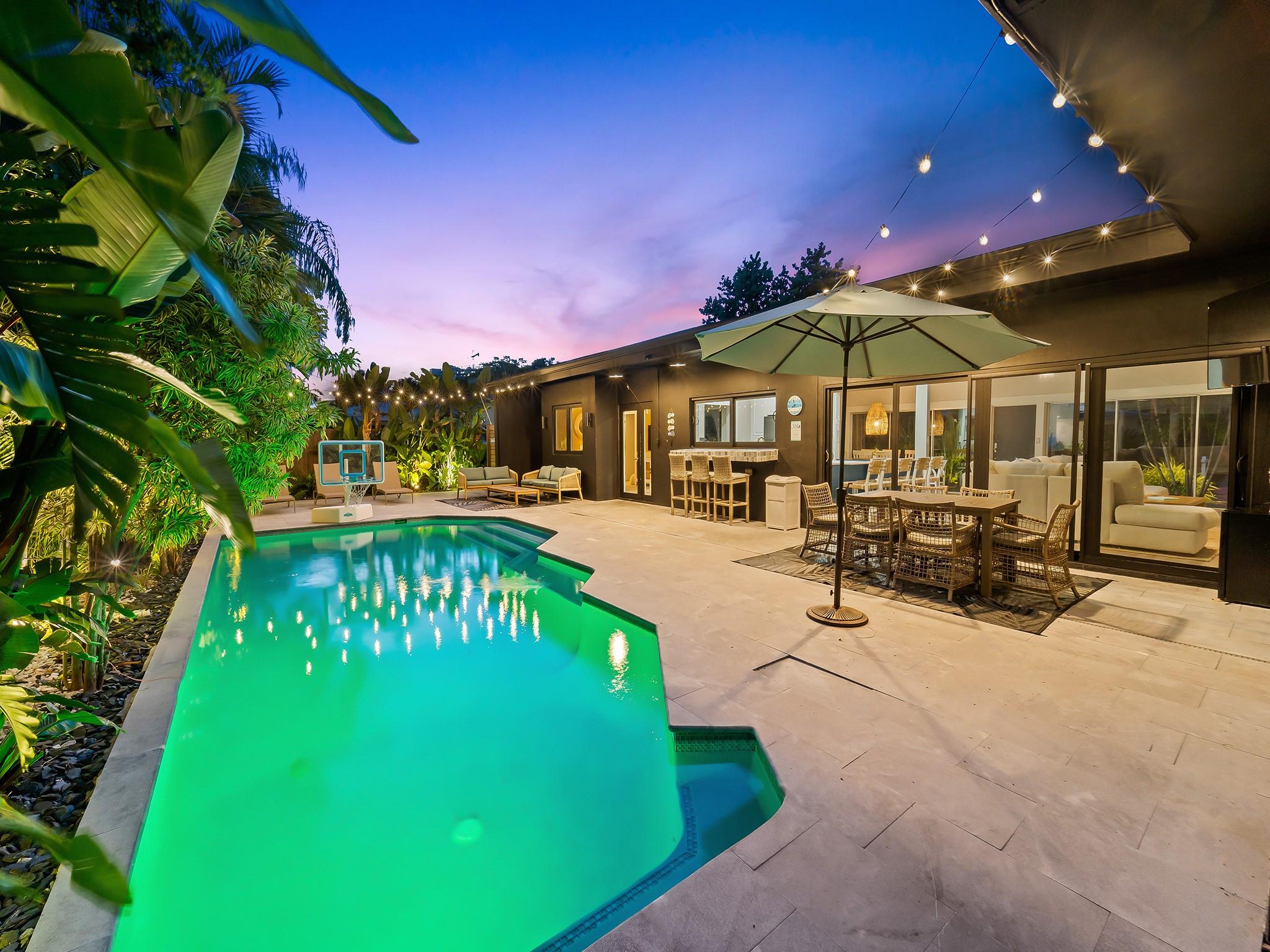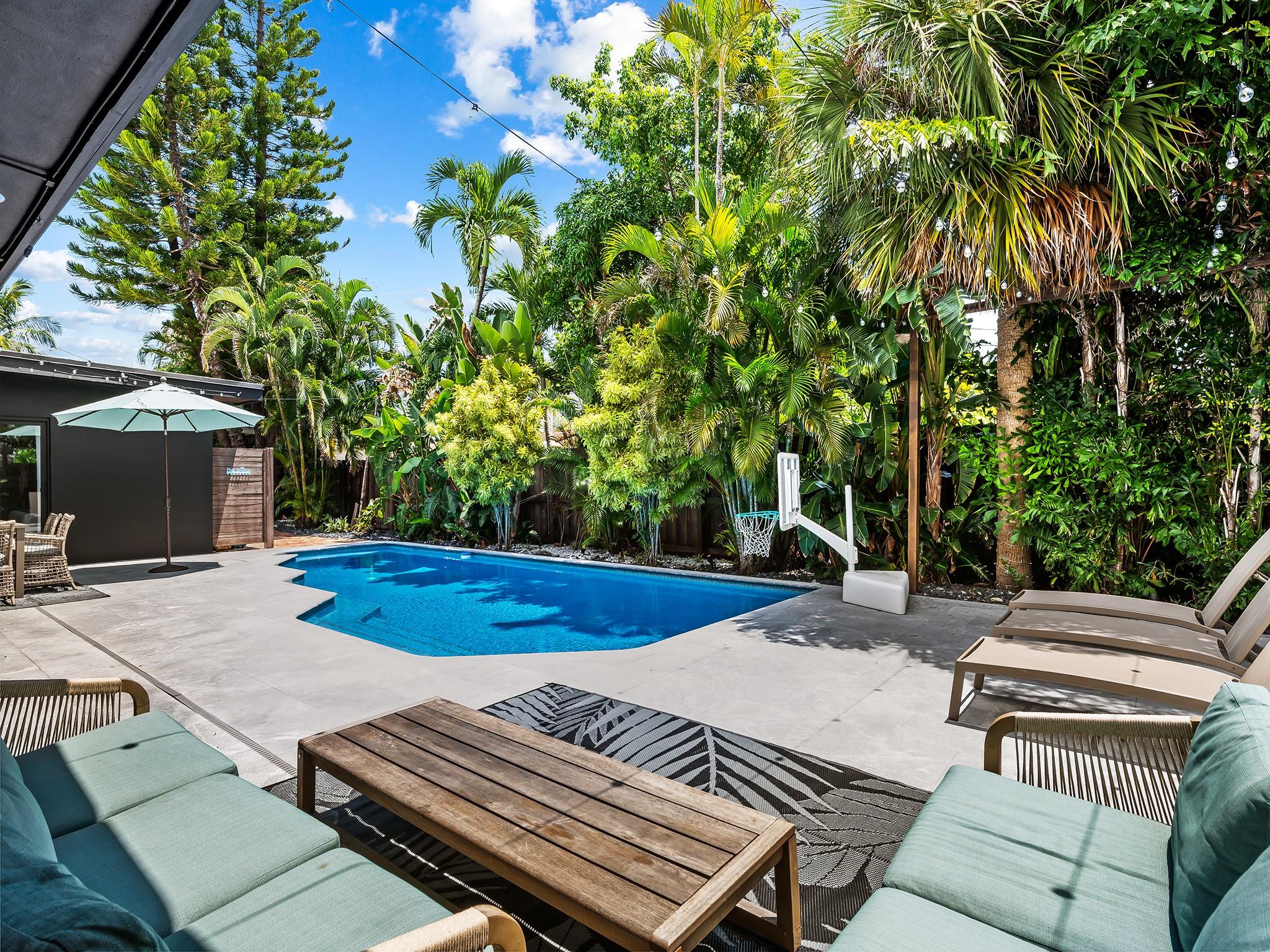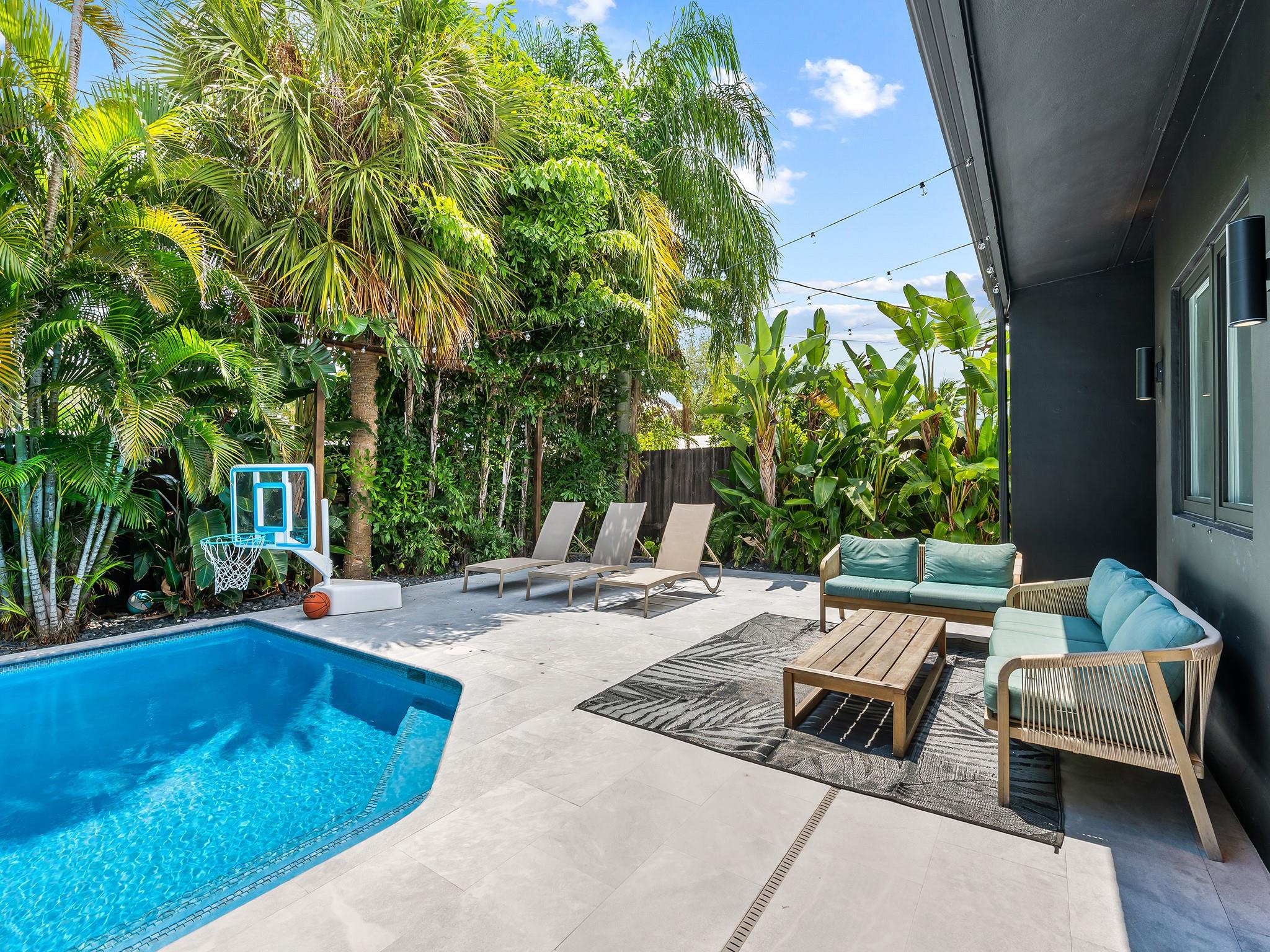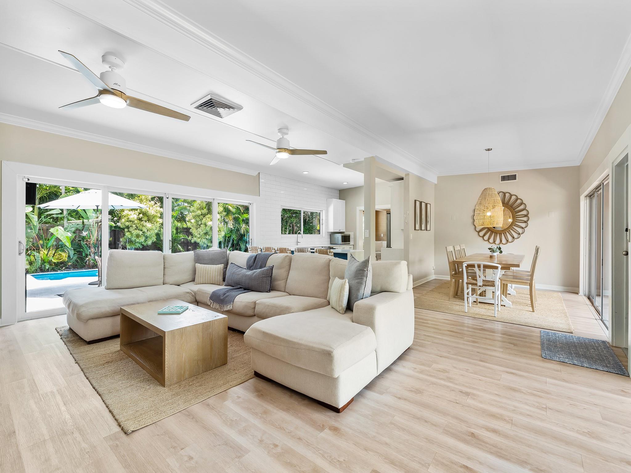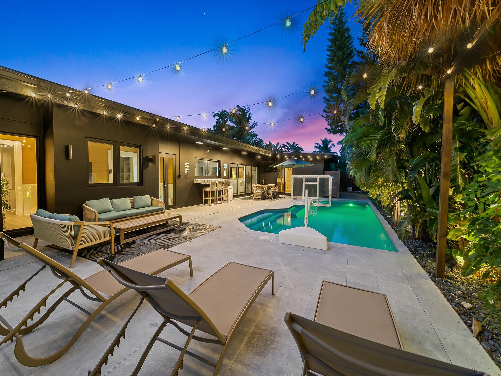 Contemporary architecture & Mid-Century ambiance define this S. Florida tropical oasis. Luminous open concept living spaces harmoniously blend multiple entertaining areas, accentuated with walls of glass, volume & vaulted ceilings & multiple sliding doorways that blend indoor & outdoor living spaces. Lush landscaping frames the oversized heated pool & patio area. The open kitchen outfitted with upgraded appliances overlooks the great room, dining room & intimate family room. The primary suite boasts pool side access, a large walk-in closet & lavish bathrm. The spacious Jr. suite offers expansive closets & private bathroom. Currently operated as a short-term rental property. Walking distance to the beach & mins. to restaurants & shopping. Sq. Ft. from BCPA.