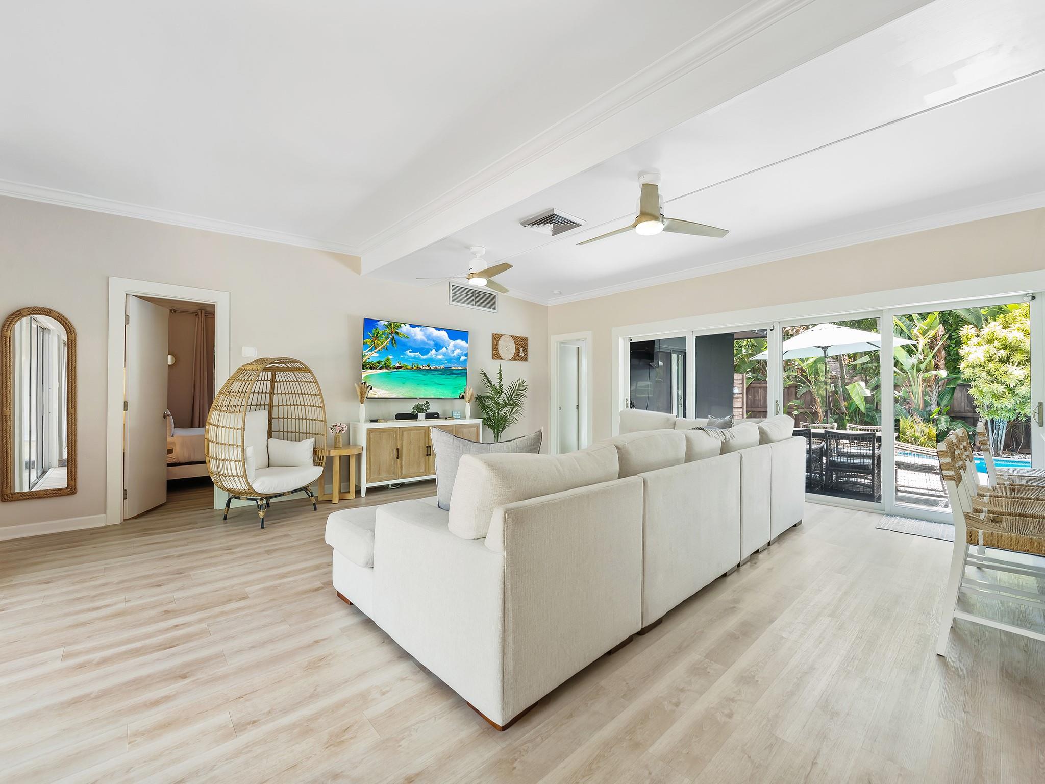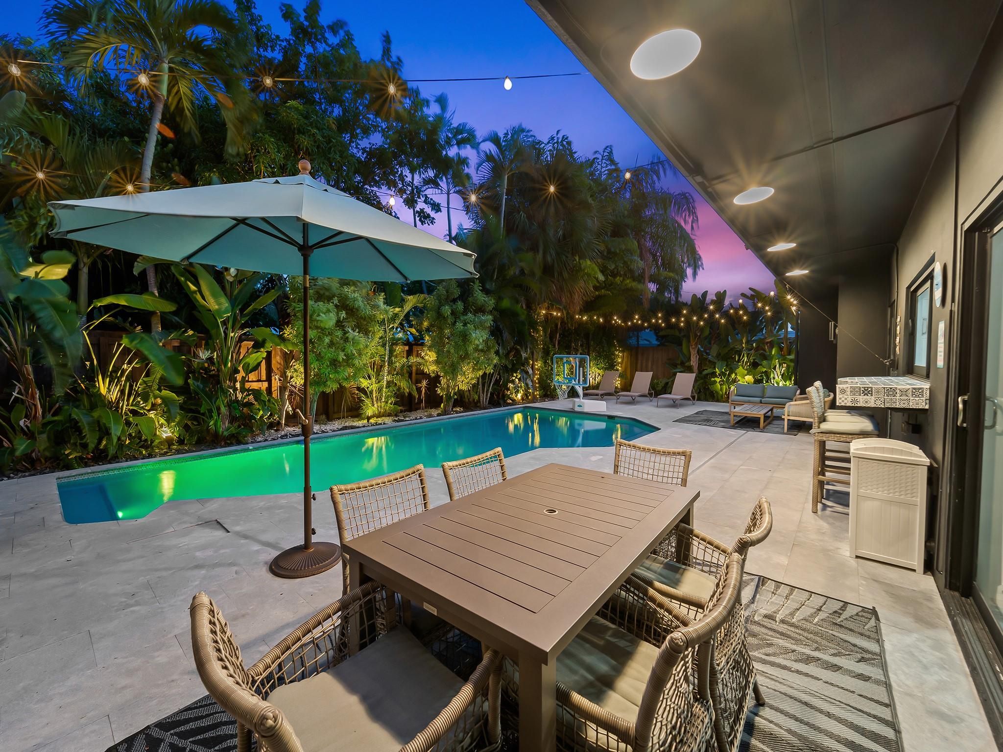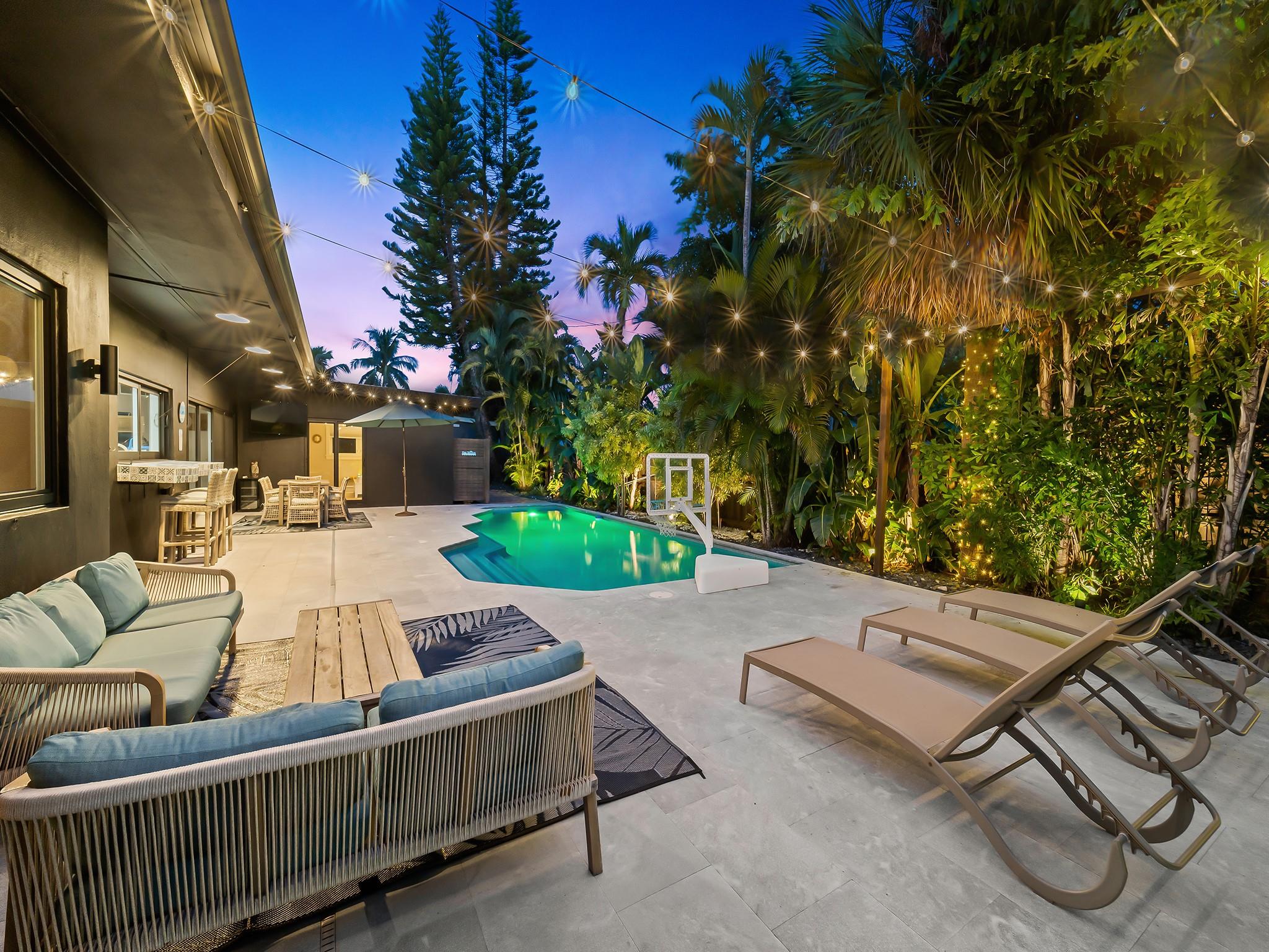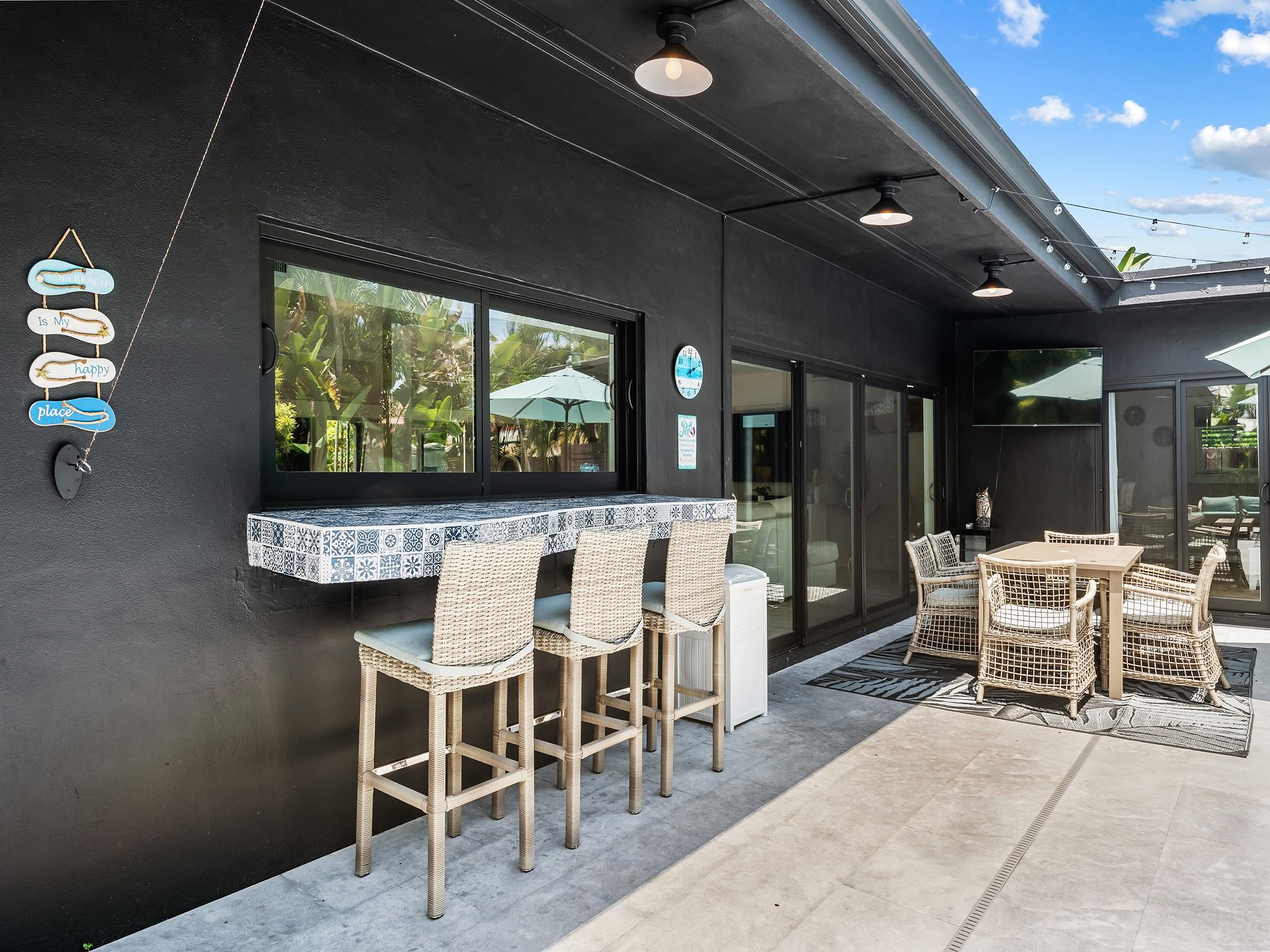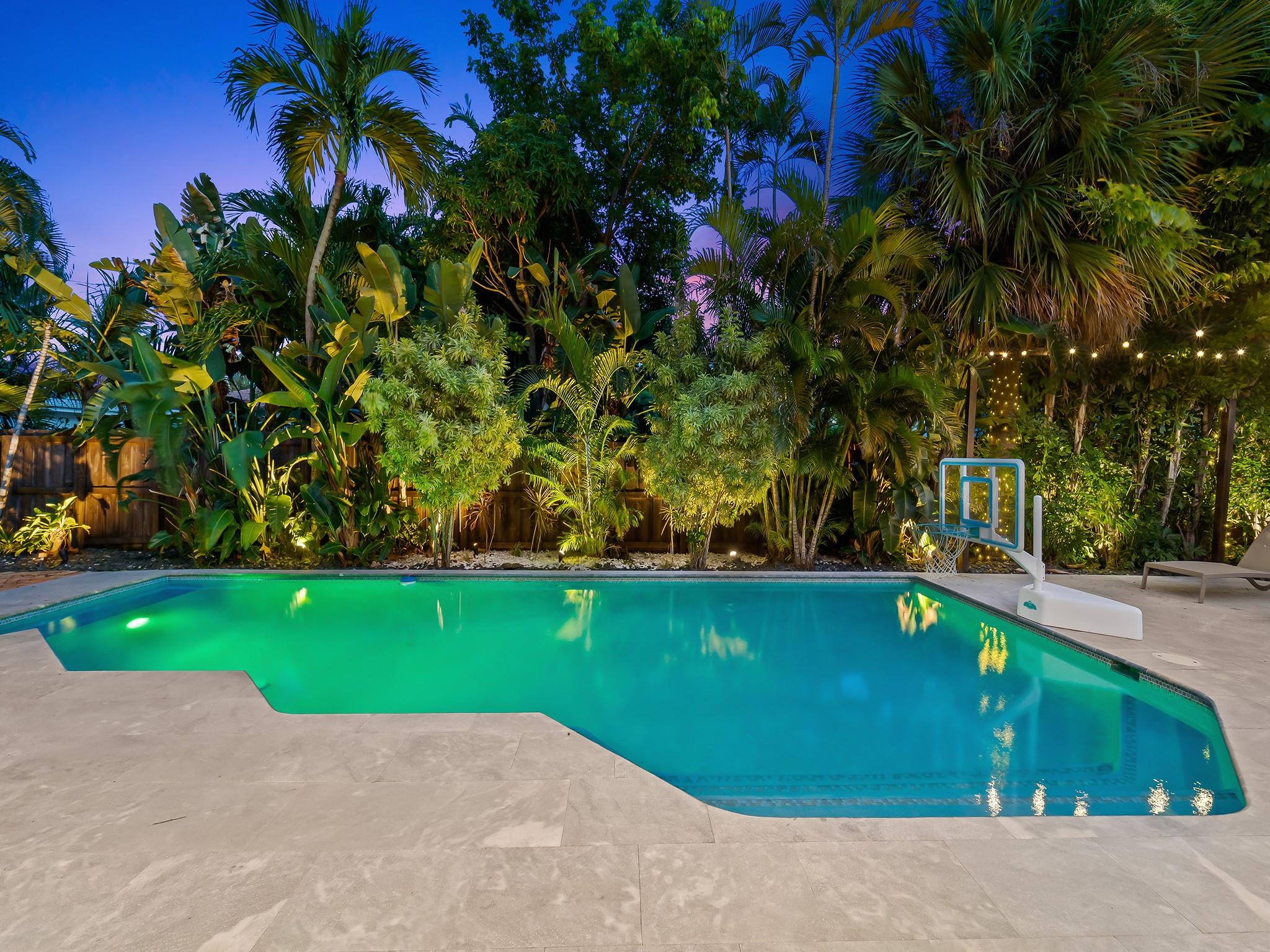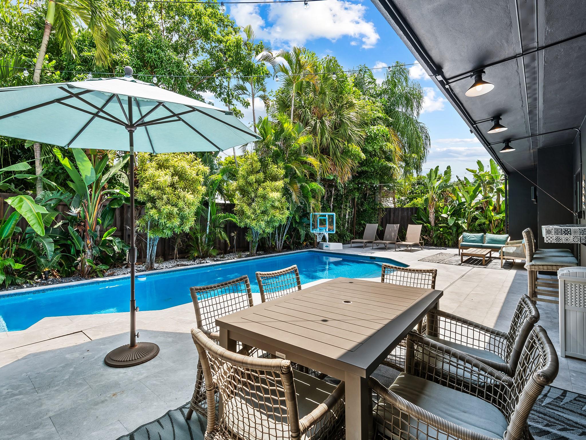 Contemporary architecture & Mid-Century ambiance define this S. Florida tropical oasis. Luminous open concept living spaces harmoniously blend multiple entertaining areas, accentuated with walls of glass, volume & vaulted ceilings & multiple sliding doorways that blend indoor & outdoor living spaces. Lush landscaping frames the oversized heated pool & patio area. The open kitchen outfitted with upgraded appliances overlooks the great room, dining room & intimate family room. The primary suite boasts pool side access, a large walk-in closet & lavish bathrm. The spacious Jr. suite offers expansive closets & private bathroom. Currently operated as a short-term rental property. Walking distance to the beach & mins. to restaurants & shopping. Sq. Ft. from BCPA.