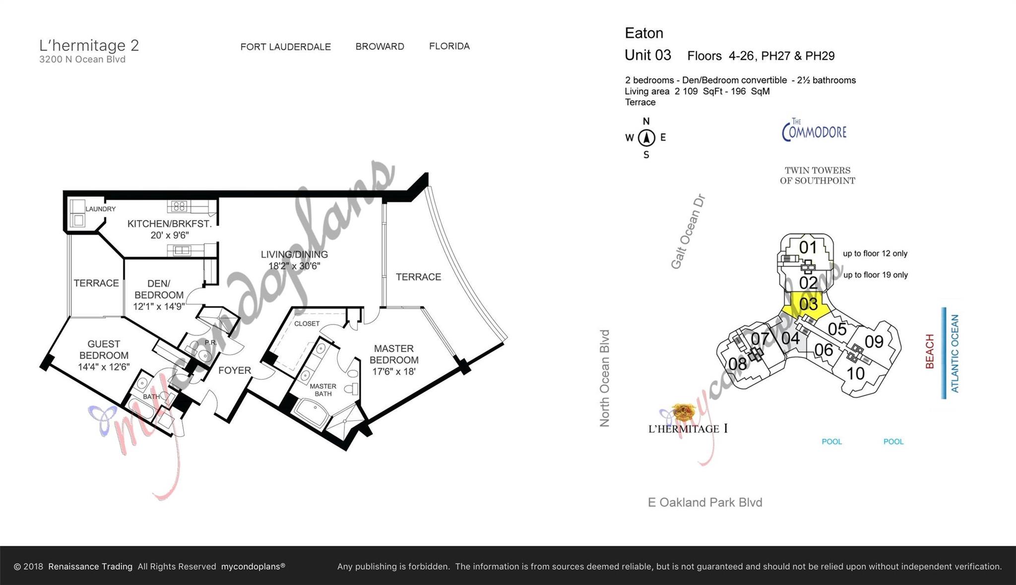 LOWEST PRICE 3 BEDROOMS / 3 BATHROOMS UNIT IN LHERMITAGE COMPLEX! IMMERSE YOURSELVES IN CRUISE VIEWS FROM RESIDENCE 1103 OF L'HERMITAGE II. This luxury unit offers access to balconies from every bedroom FACING THE OCEAN FOR BREATHTAKING SUNRISES & SUNSETS and lots of natural lights. This 10-acre, pet-friendly paradise features pet parks, valet, guest parking and 24/7 security. Enjoy luxurious amenities: DIRECT ACCESS TO THE BEACH FROM THE LOBBY WITH NO STAIRS OR ELEVATORS, beach attendants, cabanas, BBQ area, cafe and restaurant, 2 heated pools, hot tubs, tennis courts, state-of-the-art gym, massage rooms, sauna and the Ocean Room for events. THE 3 ENSUITE BEDROOMS, REFLECTIVE CEILINGS AND AN OCEAN-VIEW KITCHEN COMPLETE THIS SERENAL COASTAL RETREAT.