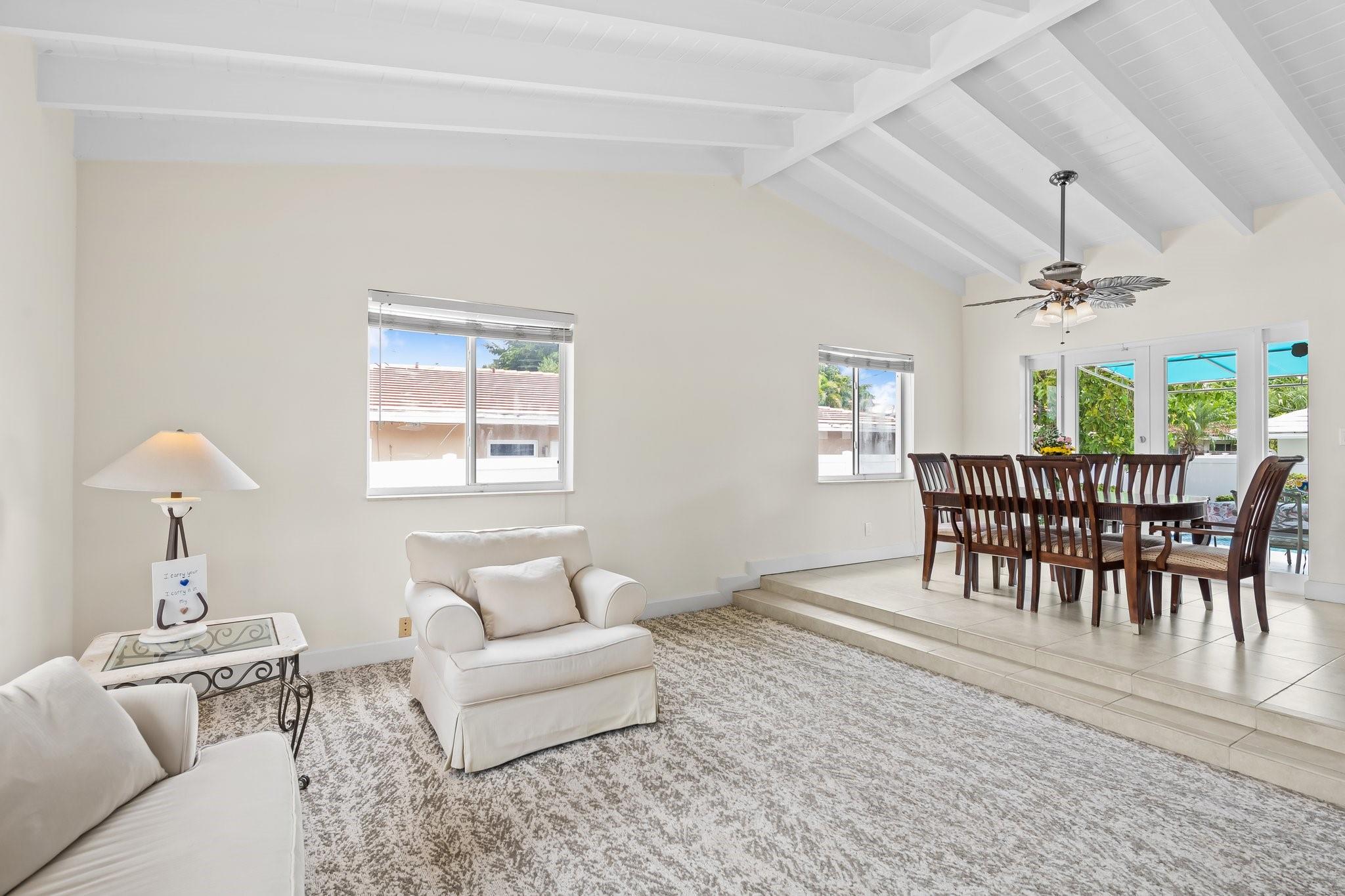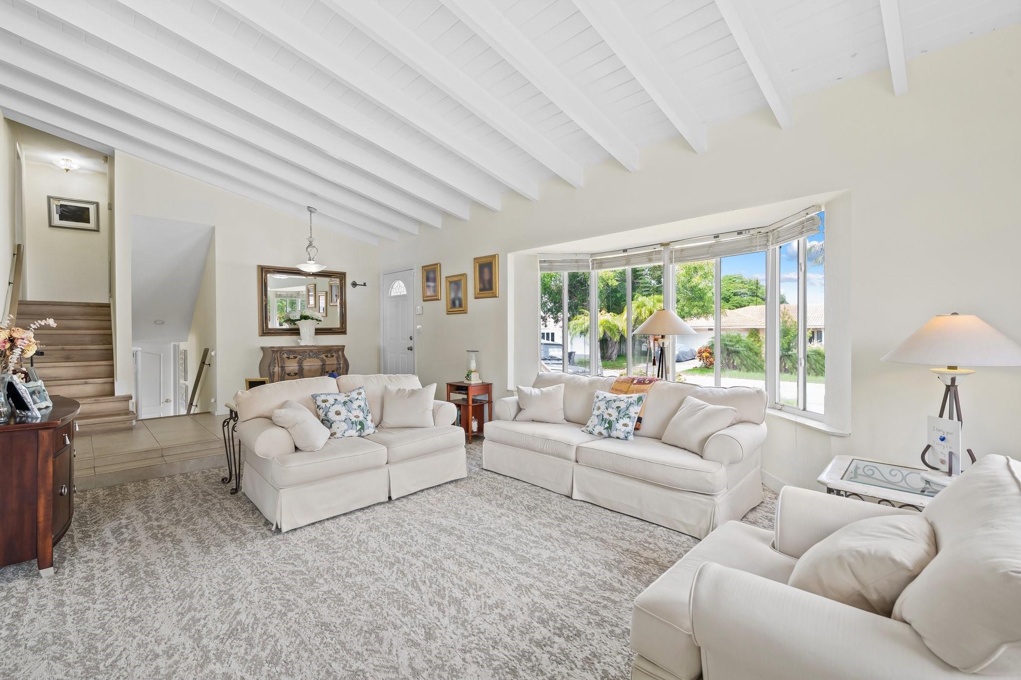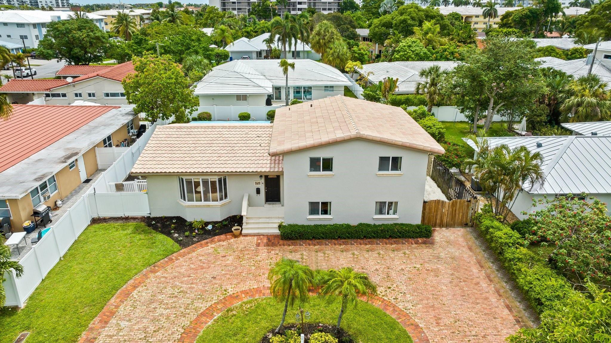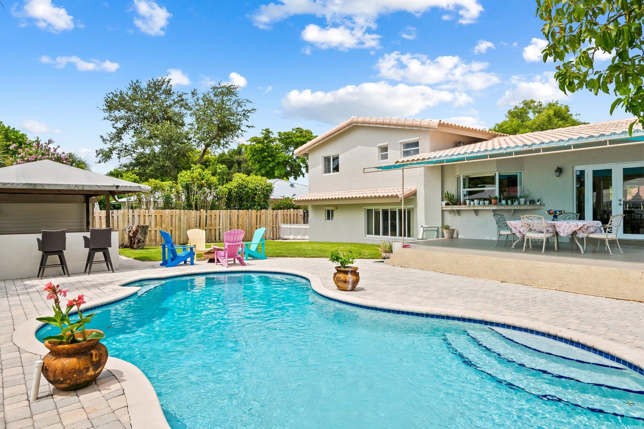 Welcome to your sanctuary in Coral Ridge Country Club Estates! 4 bedrooms, 3 bath tri-level home offers 2,240 sq ft of living space. The second level features a family area with vaulted, wood beam ceilings and a bay window offering an abundance of natural light. Kitchen is equipped with stainless steel appliances and granite countertops opens to an outdoor oasis with a pool. First level includes two bedrooms & shared bath, sitting area and laundry room. Third level boasts the primary suite with jetted tub and an additional bedroom. Enjoy a circular driveway, hurricane shutters, walking distance to Cardinal Gibbons High School, Christ Church, beaches and Lauderdale-by-the-Sea's dining and shopping.