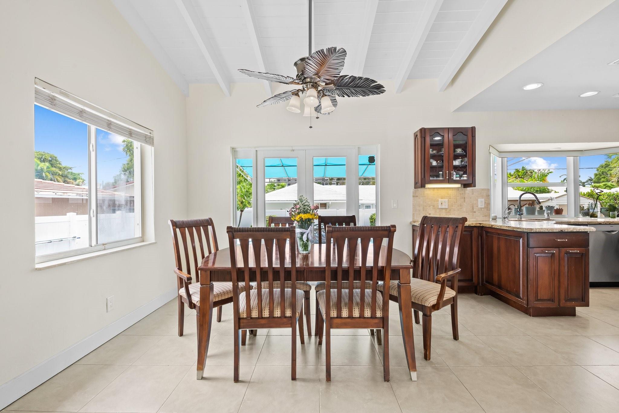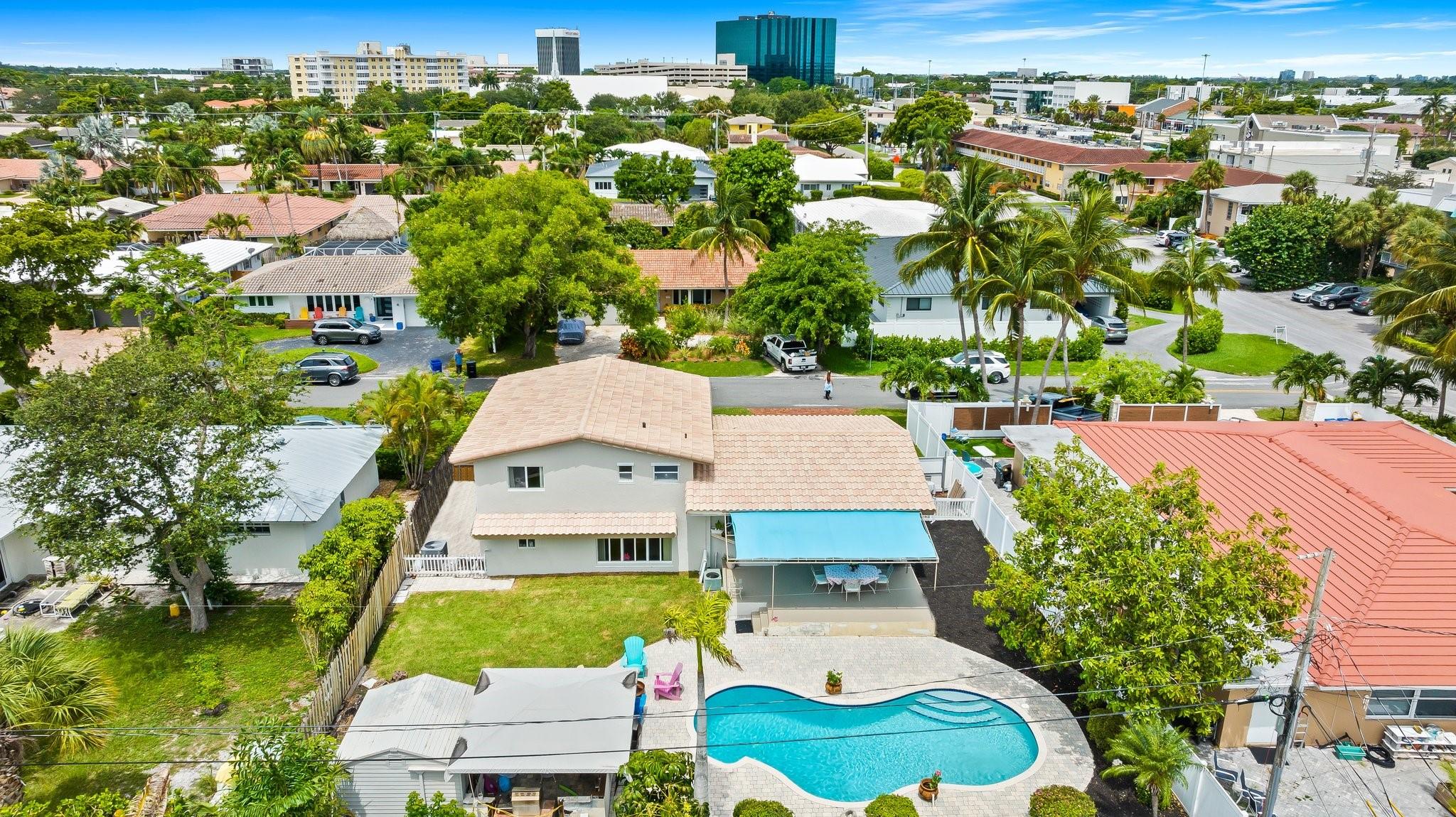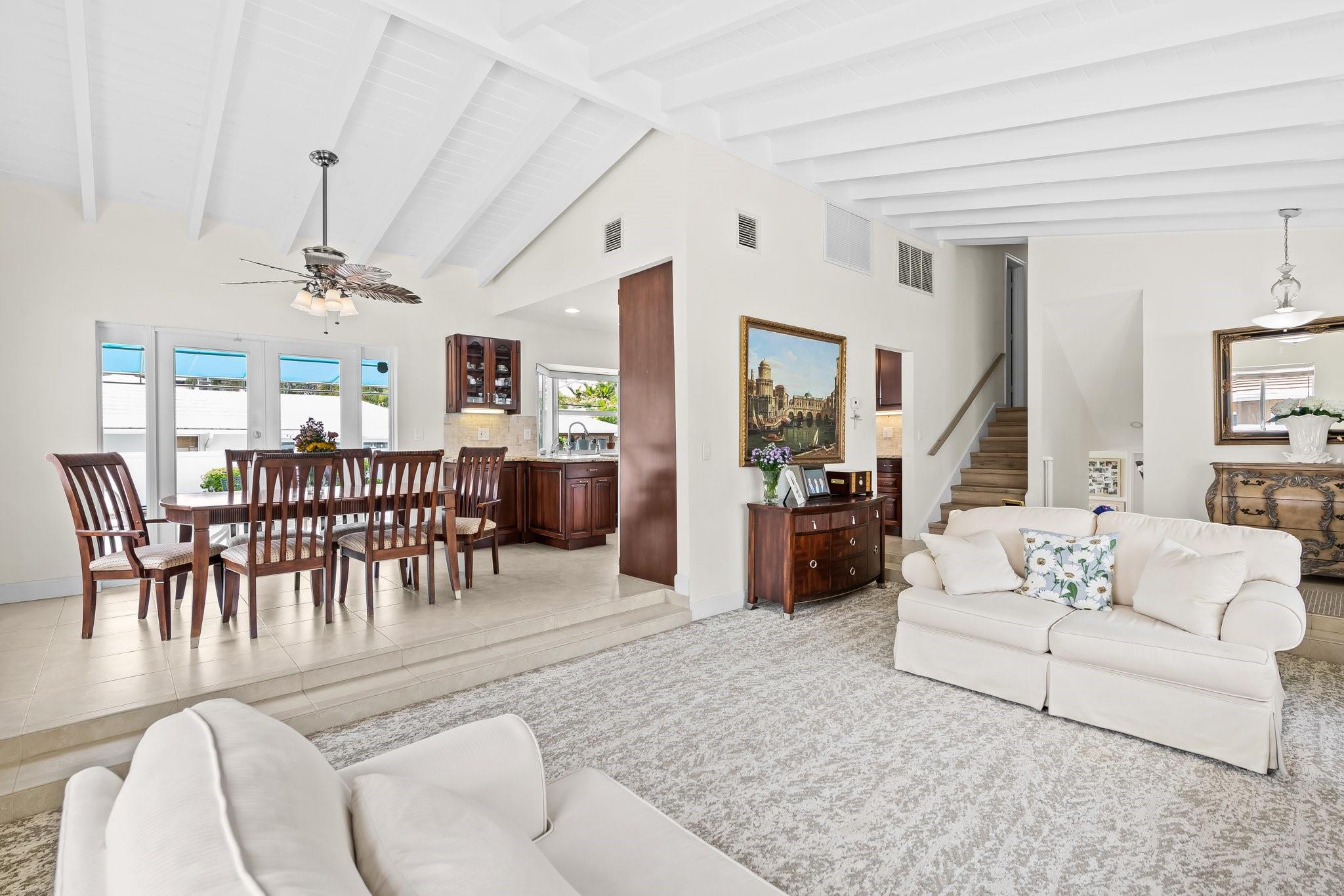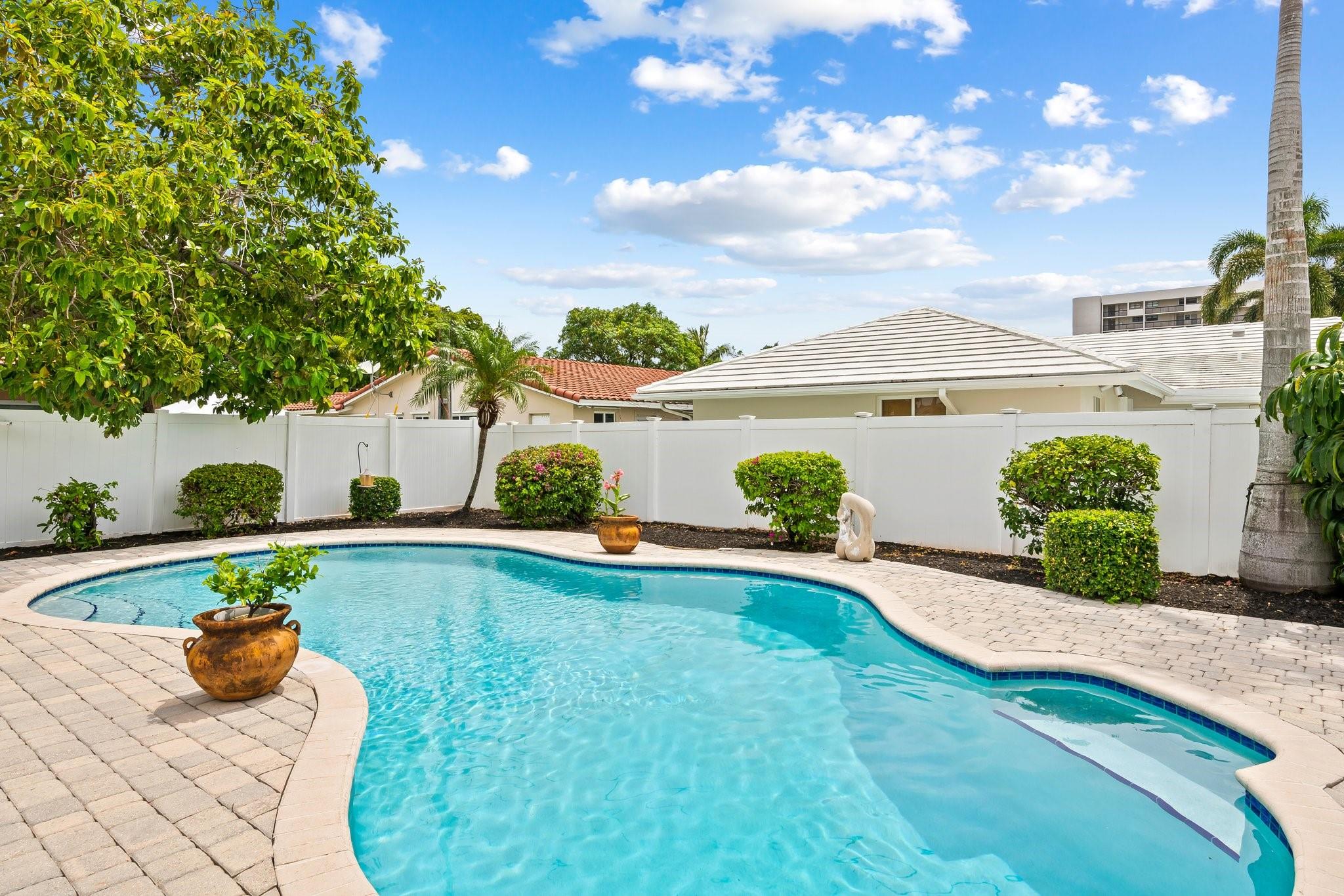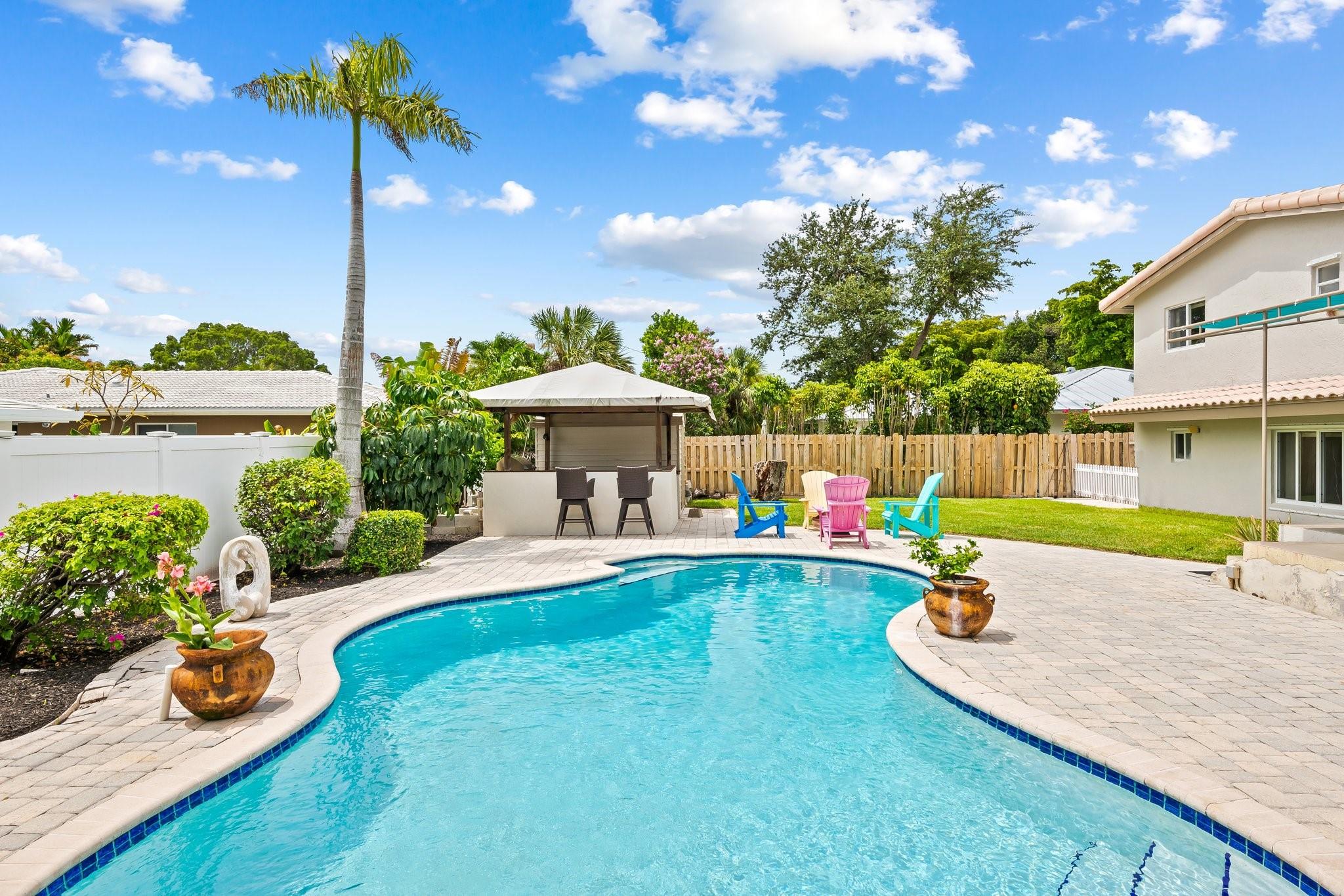 Welcome to your sanctuary in Coral Ridge Country Club Estates! 4 bedrooms, 3 bath tri-level home offers 2,240 sq ft of living space. The second level features a family area with vaulted, wood beam ceilings and a bay window offering an abundance of natural light. Kitchen is equipped with stainless steel appliances and granite countertops opens to an outdoor oasis with a pool. First level includes two bedrooms & shared bath, sitting area and laundry room. Third level boasts the primary suite with jetted tub and an additional bedroom. Enjoy a circular driveway, hurricane shutters, walking distance to Cardinal Gibbons High School, Christ Church, beaches and Lauderdale-by-the-Sea's dining and shopping.