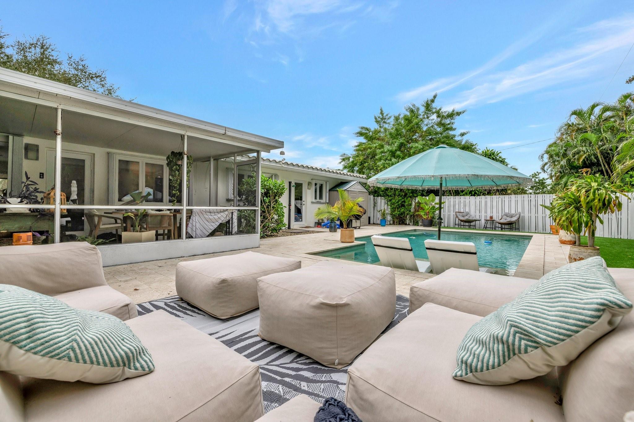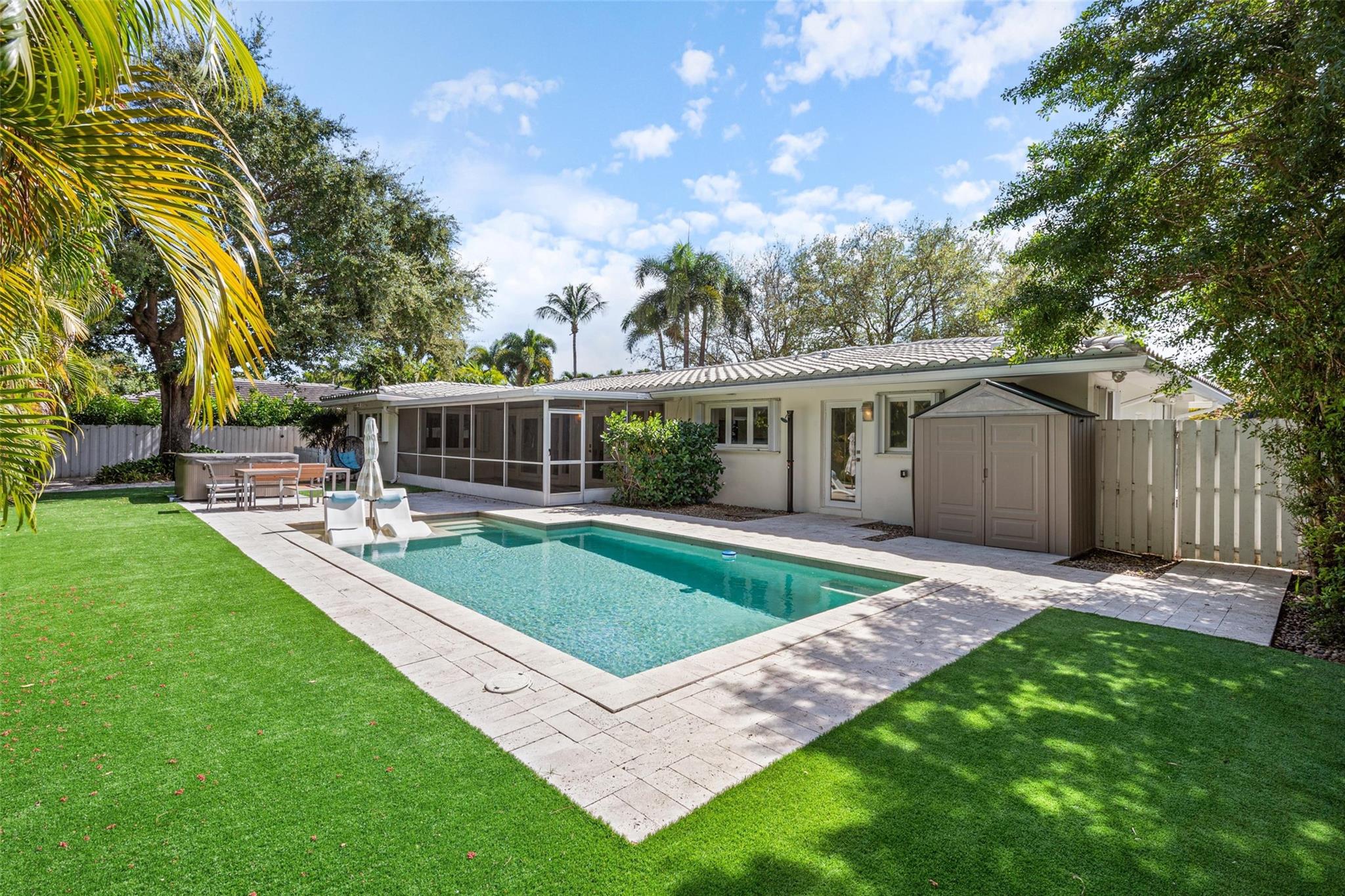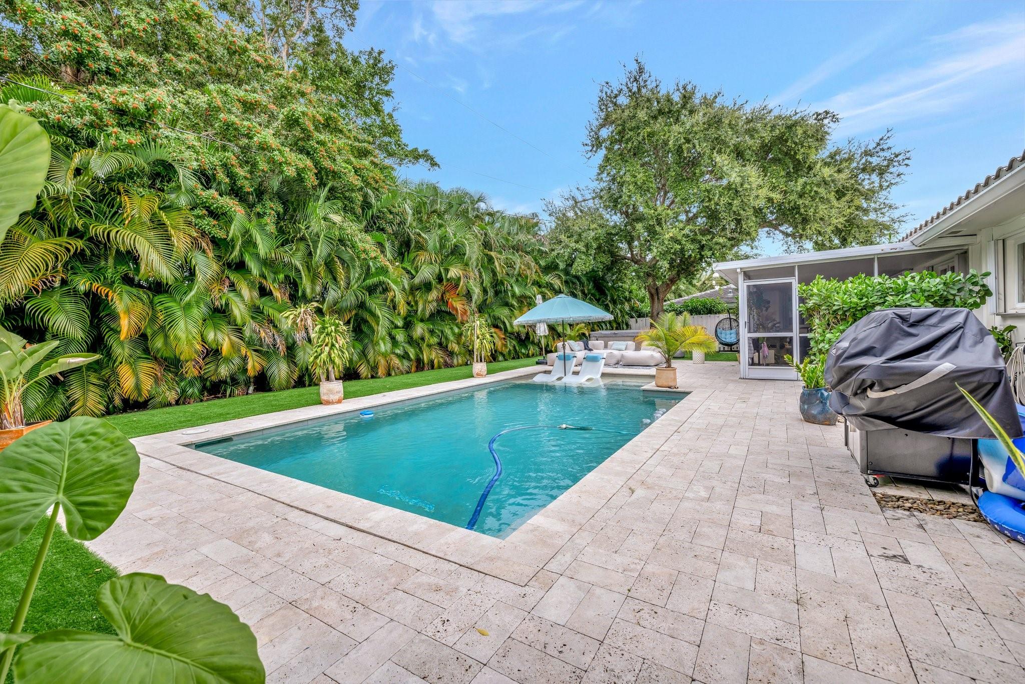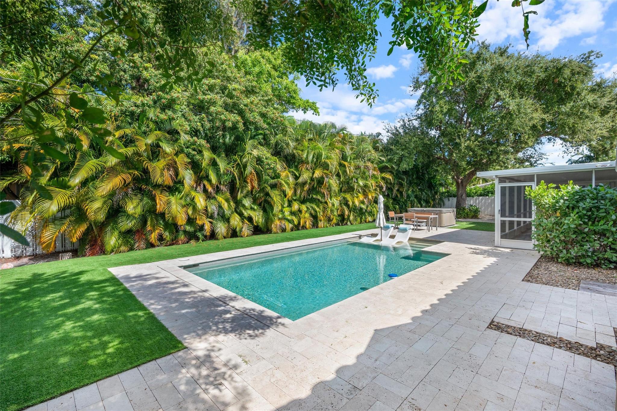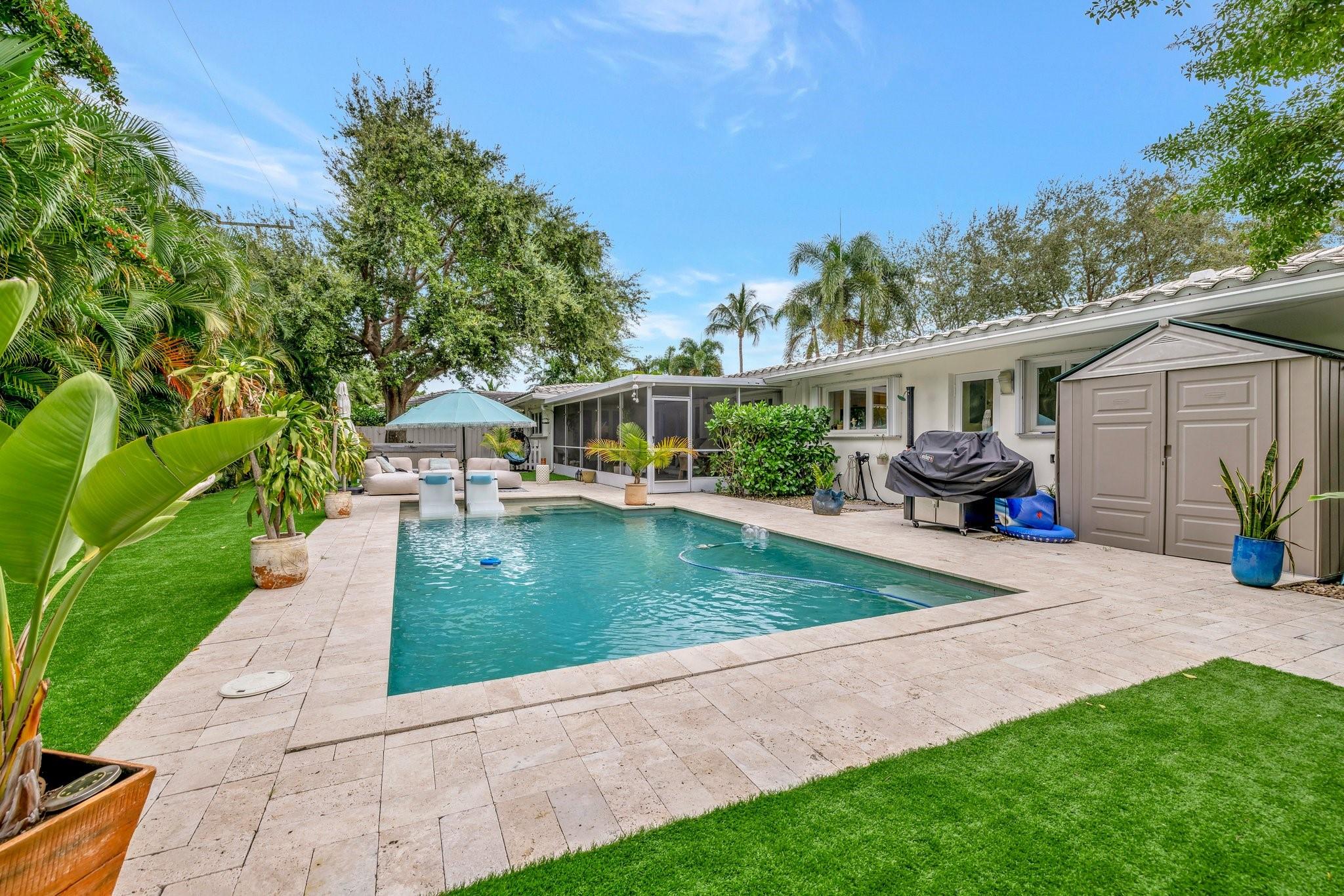 Located in Coral Ridge, this updated contemporary home in East Fort Lauderdale epitomizes the South Florida lifestyle. Just minutes from the beach, shopping, dining, fitness centers, and Bayview Elementary, it combines luxury and convenience. Lush tropical landscaping enhances the curb appeal and welcoming entry. New A/C, Inside, a spacious open floor plan with sliding glass doors seamlessly connects indoor and outdoor living spaces, perfect for entertaining. Relax in the screened lanai overlooking the saltwater pool, hot tub, patio, and garden. The gourmet kitchen offers ample counter space for any chef. The primary suite includes two walk-in closets and a luxurious bath, while the second and third bedrooms share a full bath.