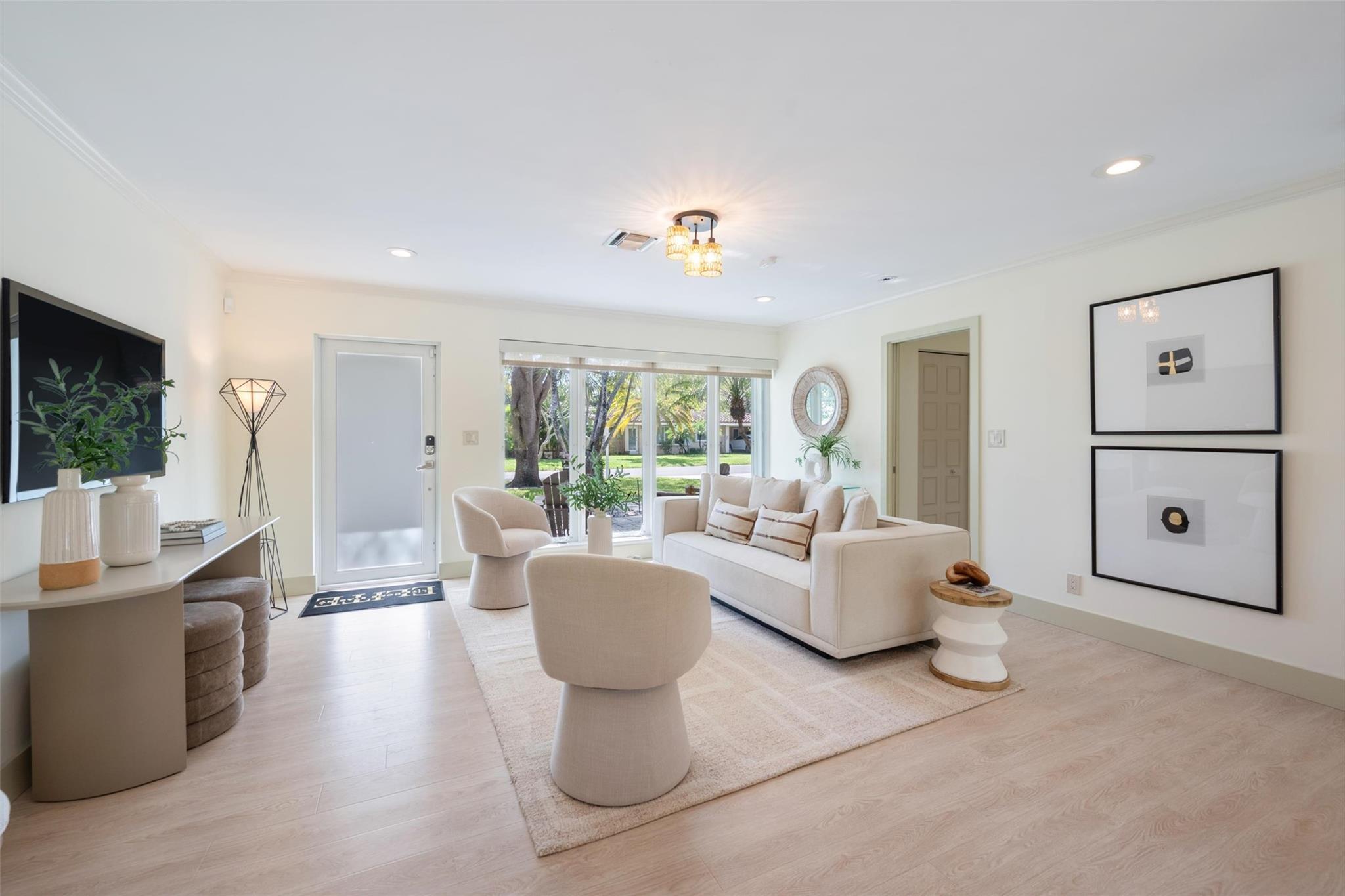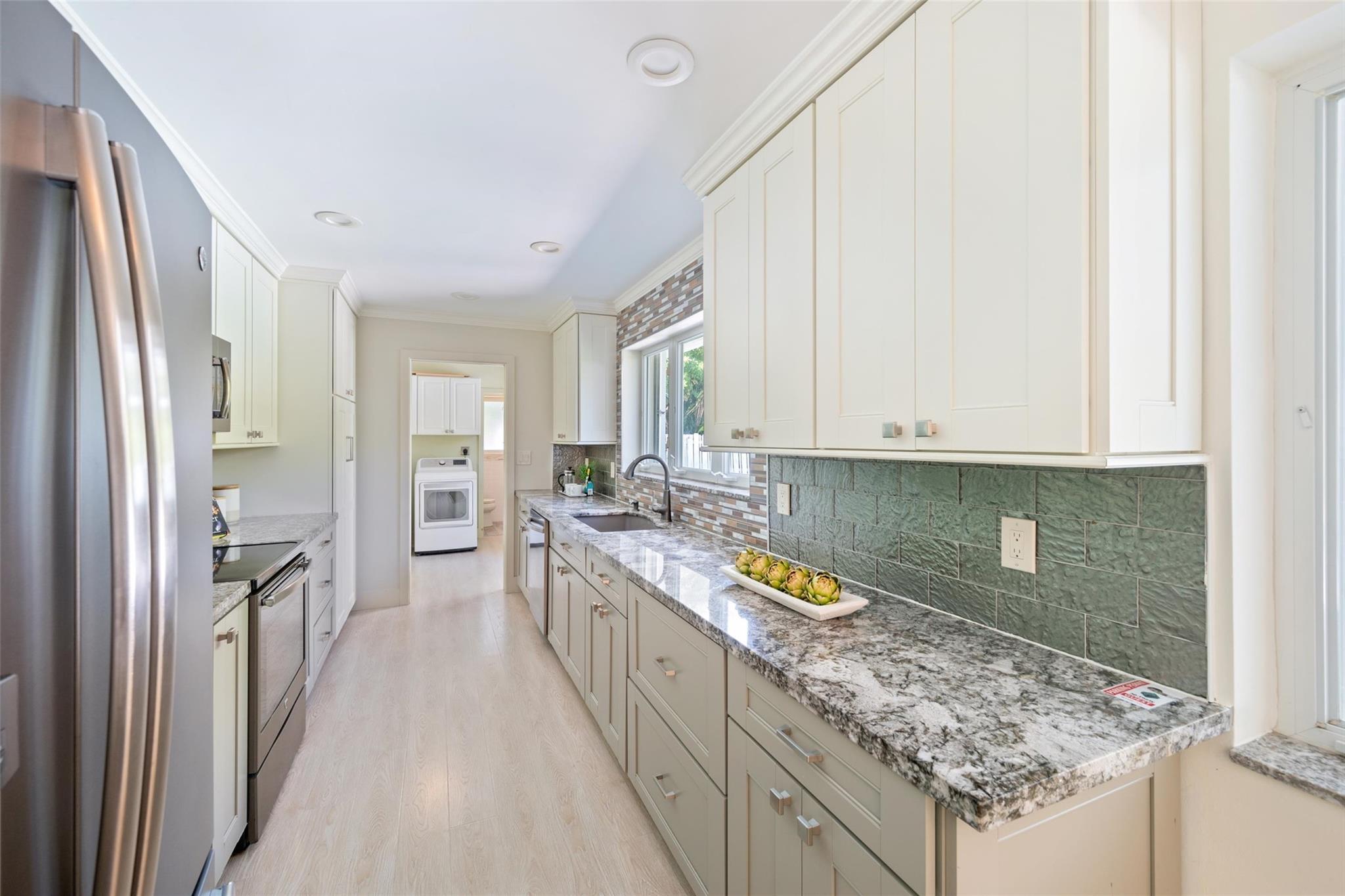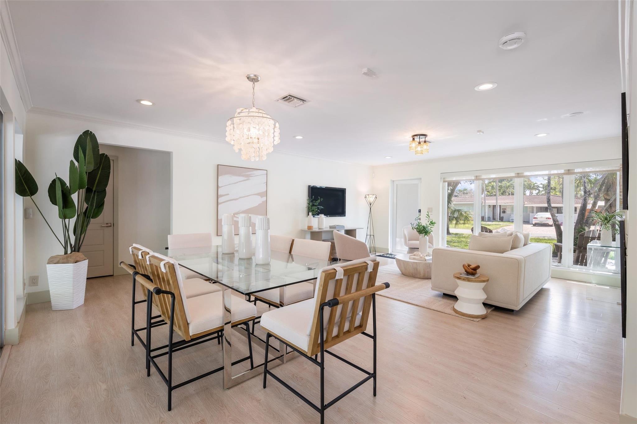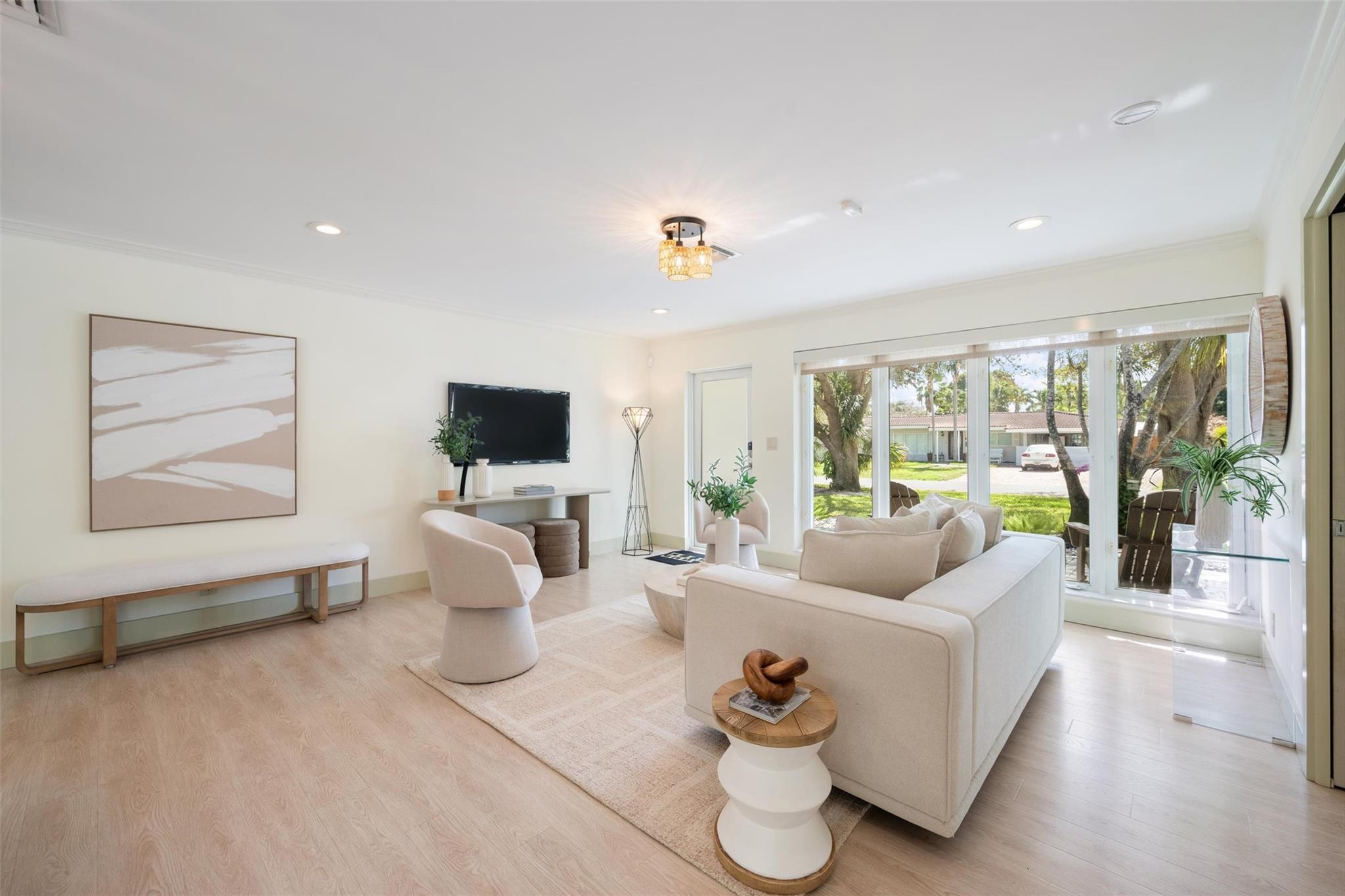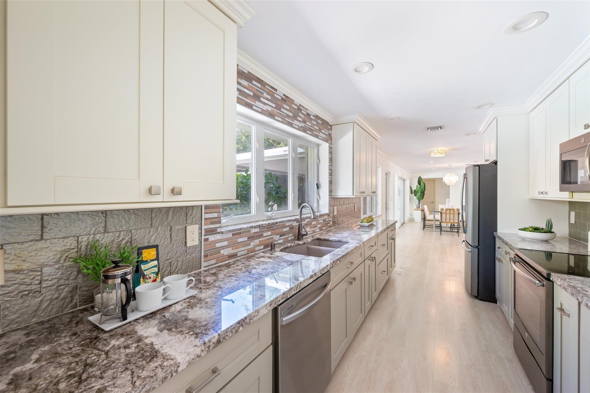 Located in Coral Ridge, this updated contemporary home in East Fort Lauderdale epitomizes the South Florida lifestyle. Just minutes from the beach, shopping, dining, fitness centers, and Bayview Elementary, it combines luxury and convenience. Lush tropical landscaping enhances the curb appeal and welcoming entry. New A/C, Inside, a spacious open floor plan with sliding glass doors seamlessly connects indoor and outdoor living spaces, perfect for entertaining. Relax in the screened lanai overlooking the saltwater pool, hot tub, patio, and garden. The gourmet kitchen offers ample counter space for any chef. The primary suite includes two walk-in closets and a luxurious bath, while the second and third bedrooms share a full bath.