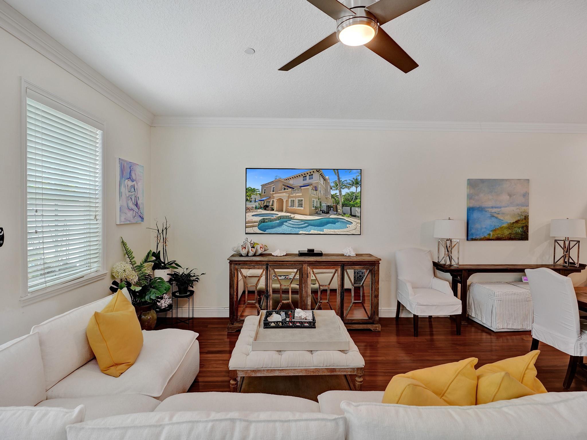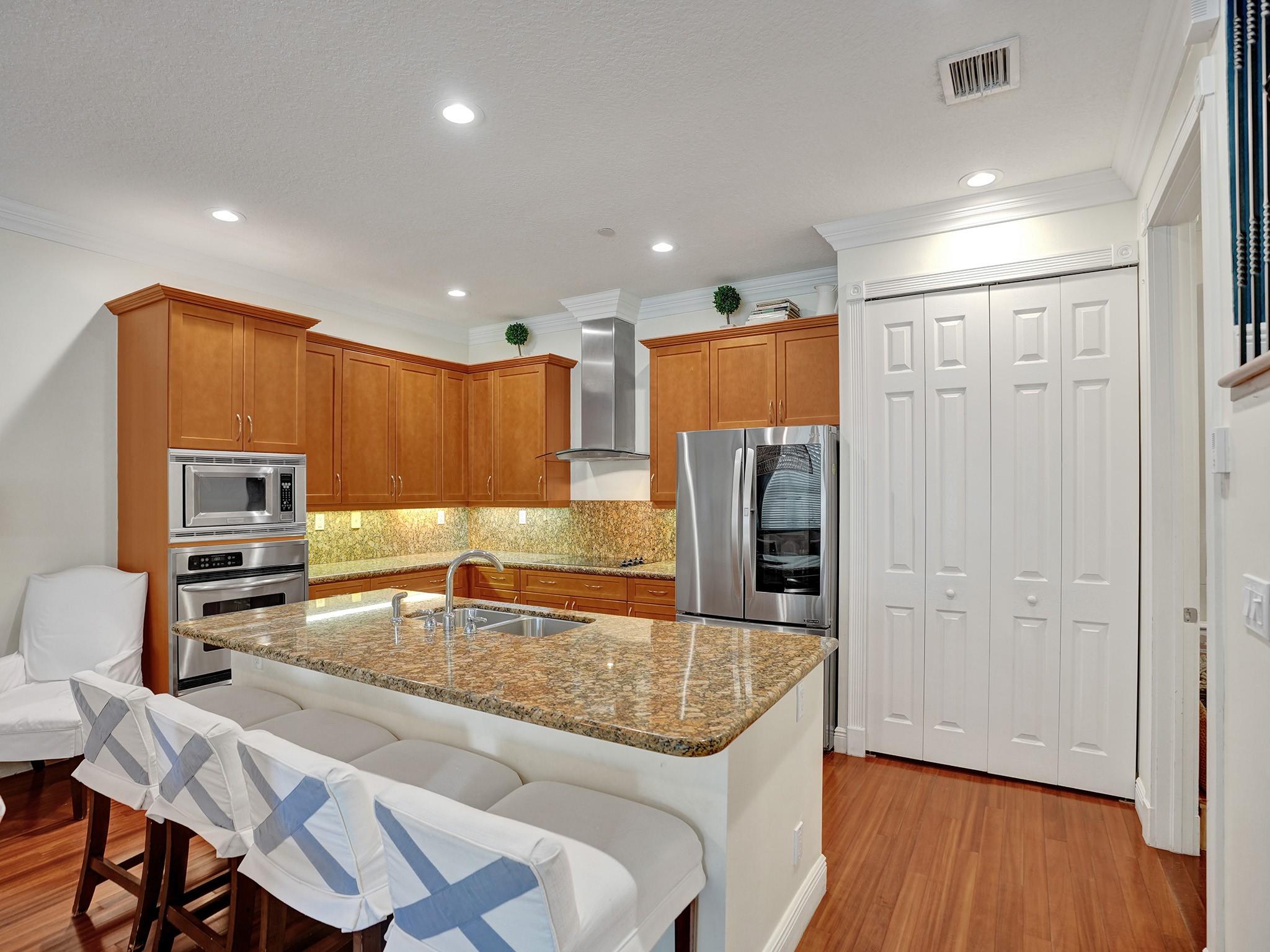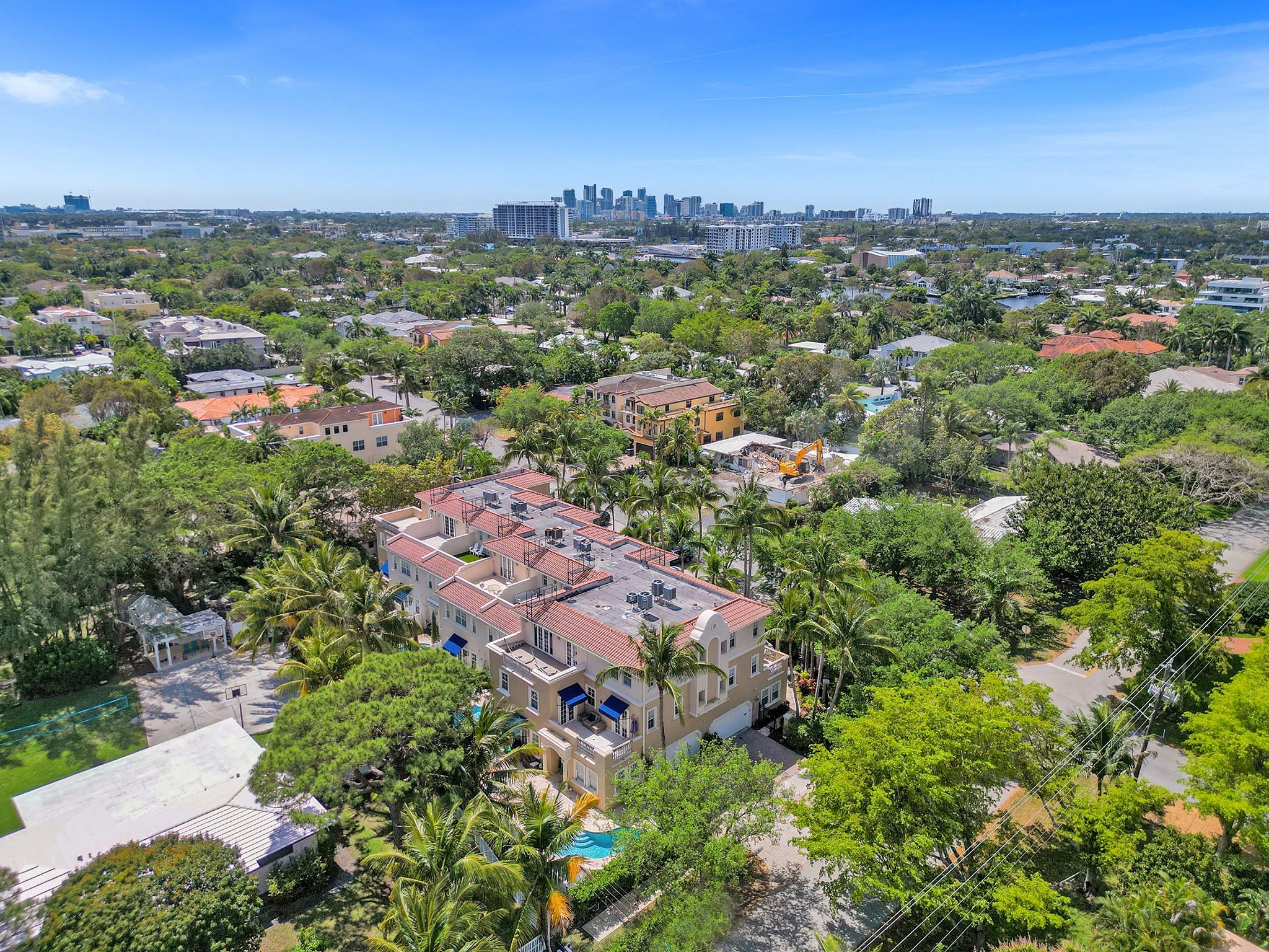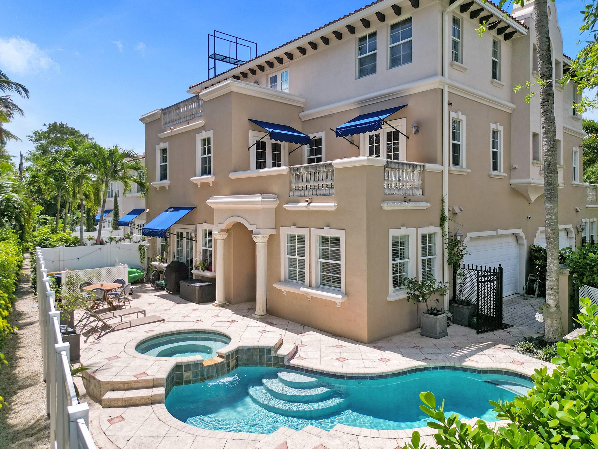 Beautiful and serene CORNER UNIT Townhome with POOL nestled in CORAL RIDGE. Traditional 3-level layout spanning over 2600sq ft. Entrance features a secure atrium with a private pool, courtyard, and 2-car garage. Boasts a well-equipped gourmet kitchen, granite counters, stainless appliances, custom wood cabinets, spacious living area, and a versatile office/4th bedroom. Second level highlights a grand master suite with a jacuzzi tub, dual closets, open terrace, and a generous second bedroom with full bath. The third level offers a spacious family room, wet bar, additional bedroom, and a large terrace with breathtaking views. Prime location near The Galleria, Las Olas, beach, and top-rated schools.