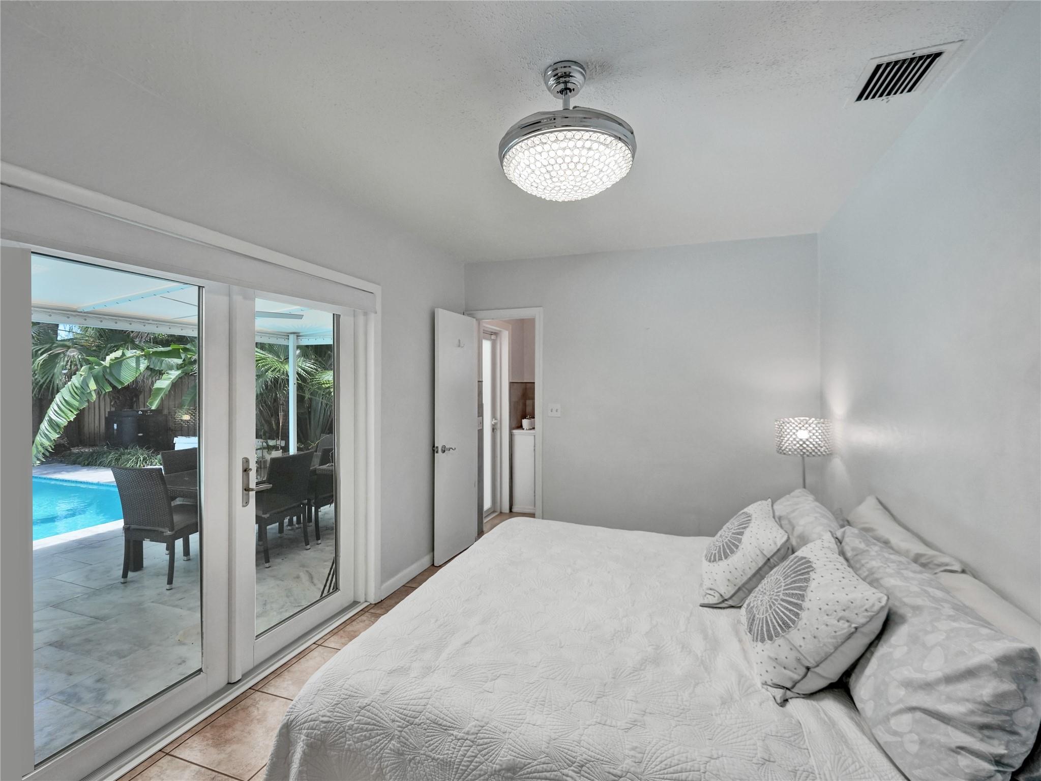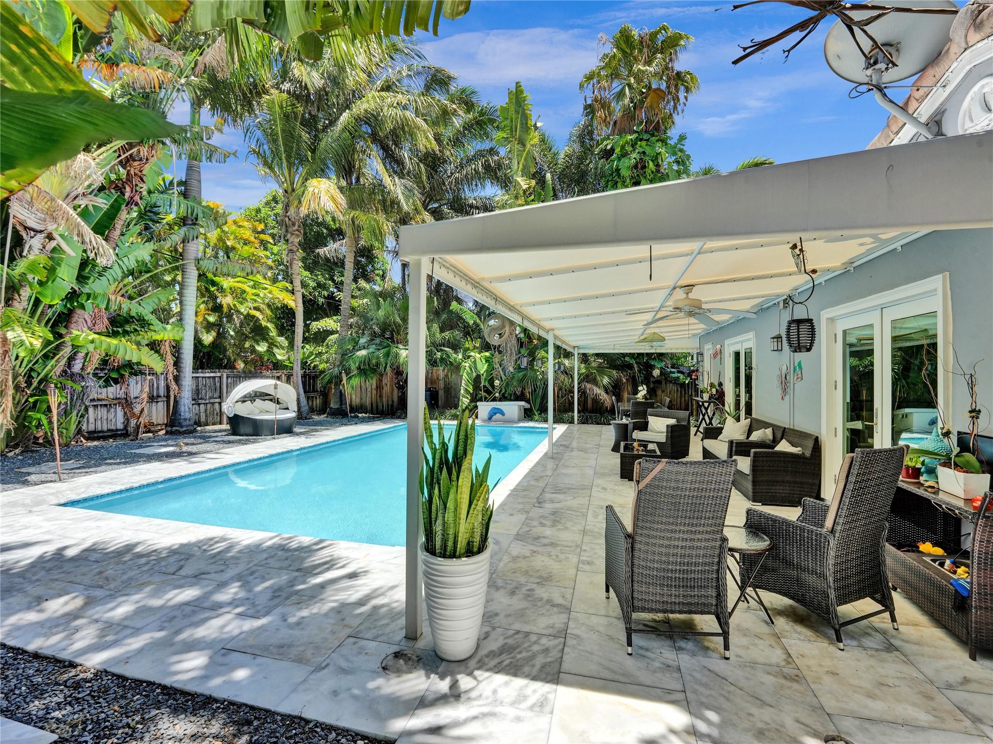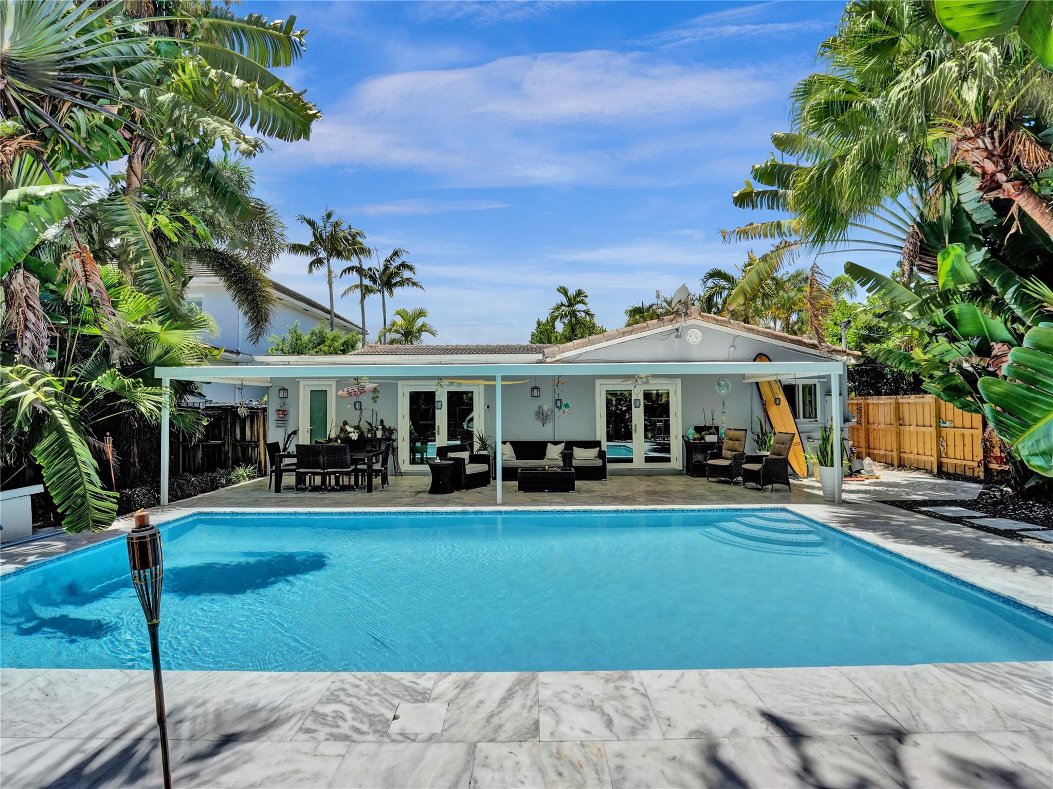 Nestled in the heart of highly sought-after Poinsettia Heights neighborhood, this beautifully updated home is a true gem. Formal living room features a romantic wood-burning fireplace, separate family/TV room, with French doors, opens to a completely private, resort-style pool area. This backyard oasis has been recently remodeled with exquisite Italian marble tile and boasts a sprawling 37-foot covered patio, ideal for entertaining. Newer impact glass windows and doors, updated kitchen with granite counters & maple cabinets. Tasteful tile flooring in living areas. Primary bedroom suite with an extra sitting area/dressing room and a recently updated ensuite bathroom. Pavered double driveway and a 1-car garage. Ideally located with fine restaurants, beach & shopping just minutes away.