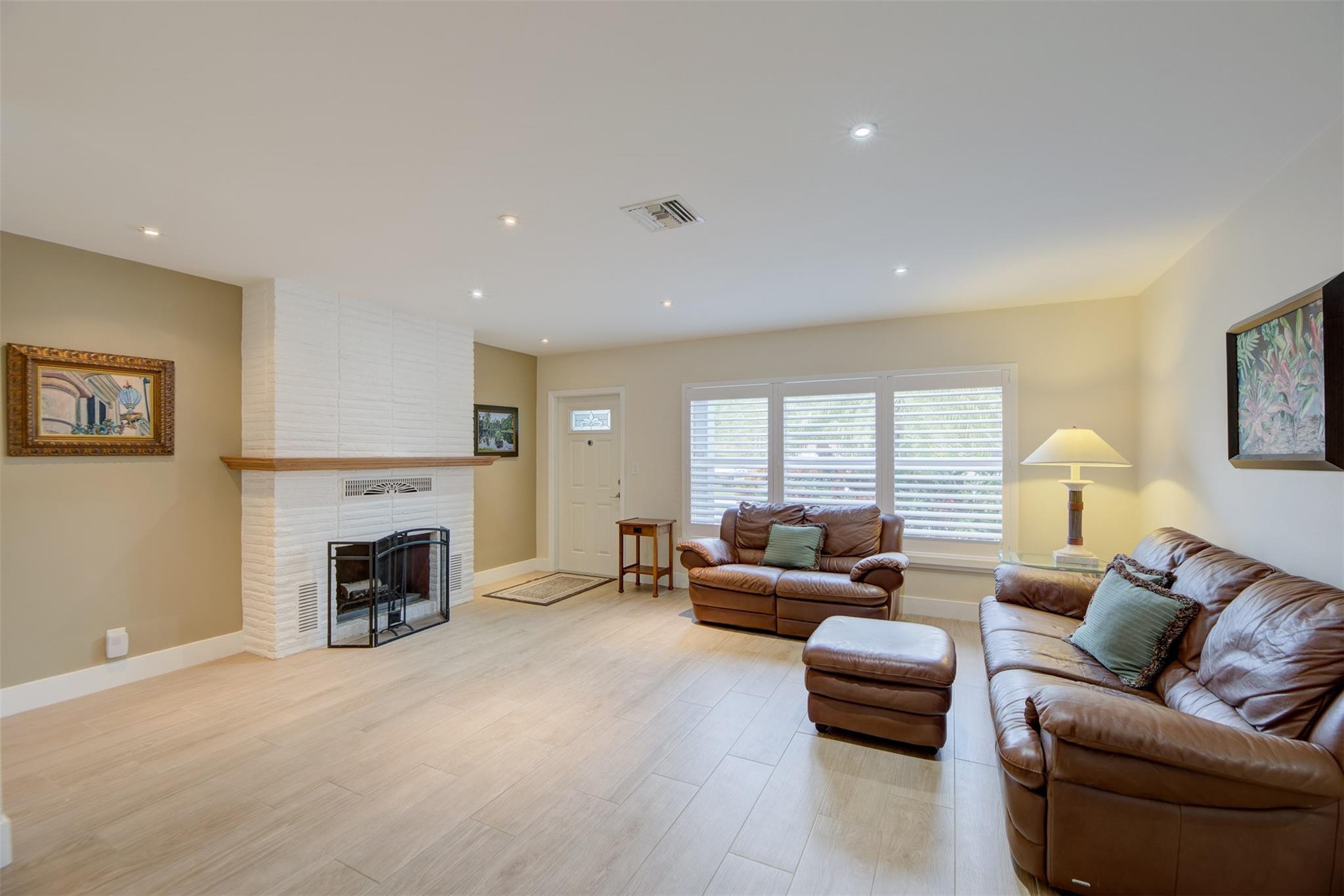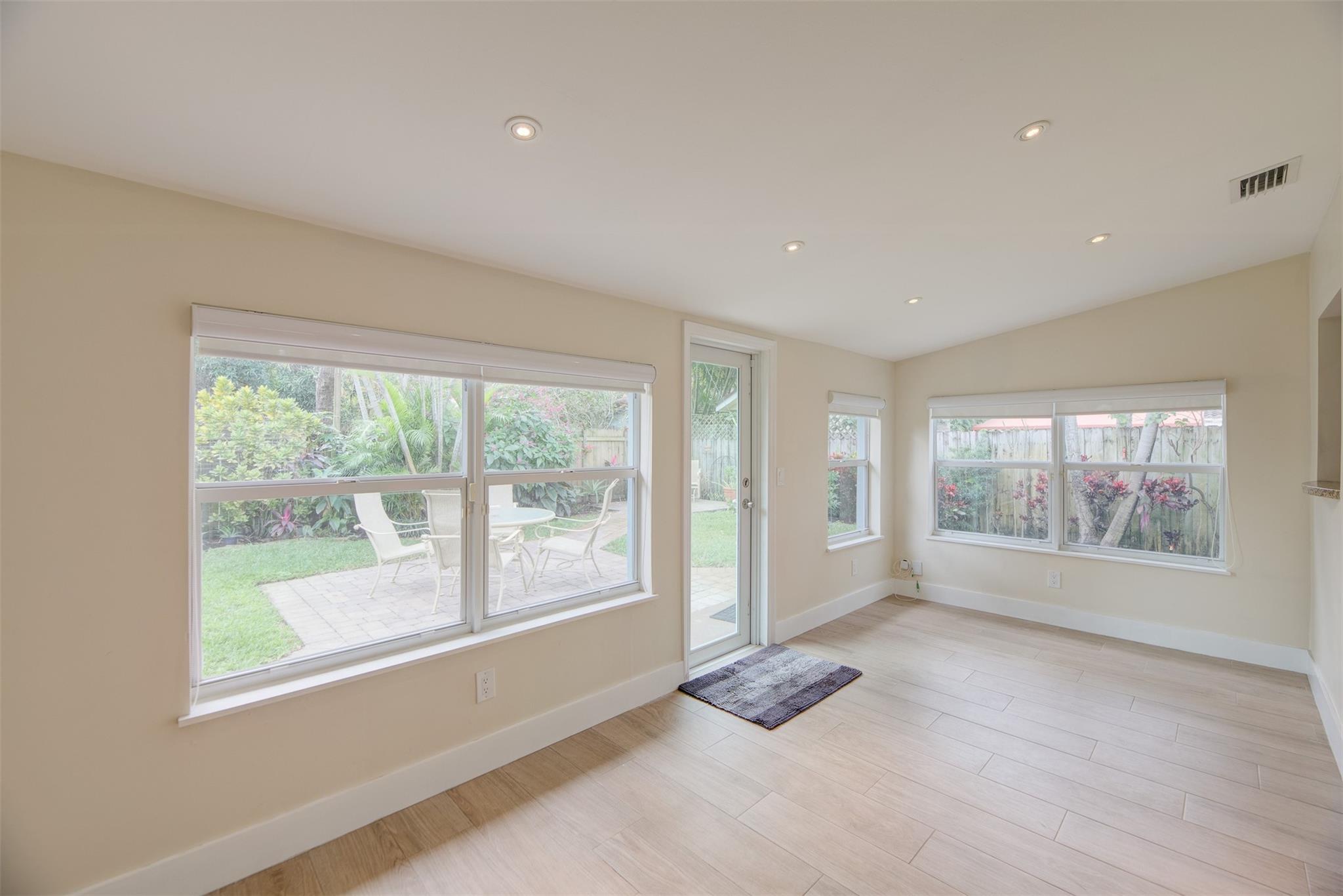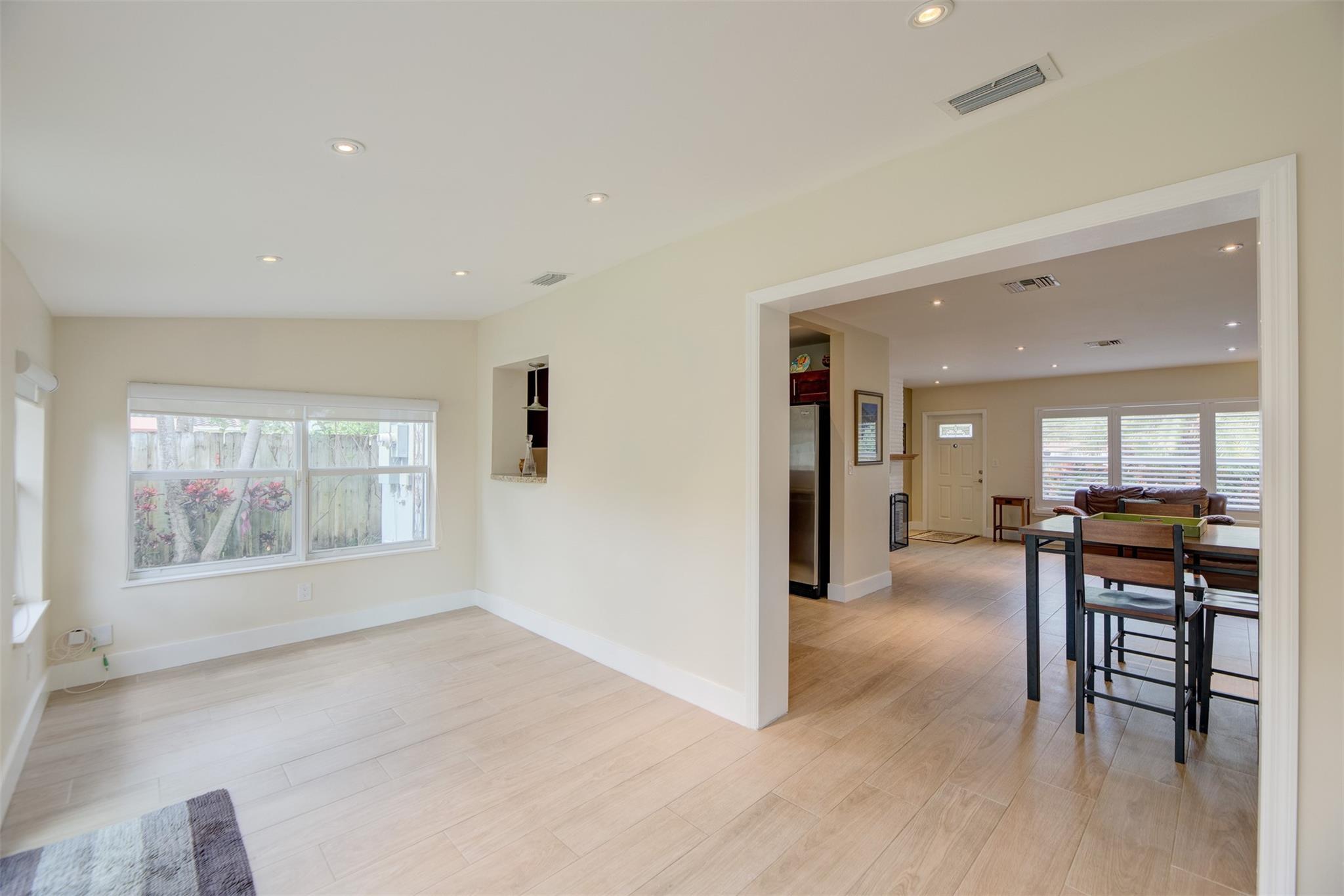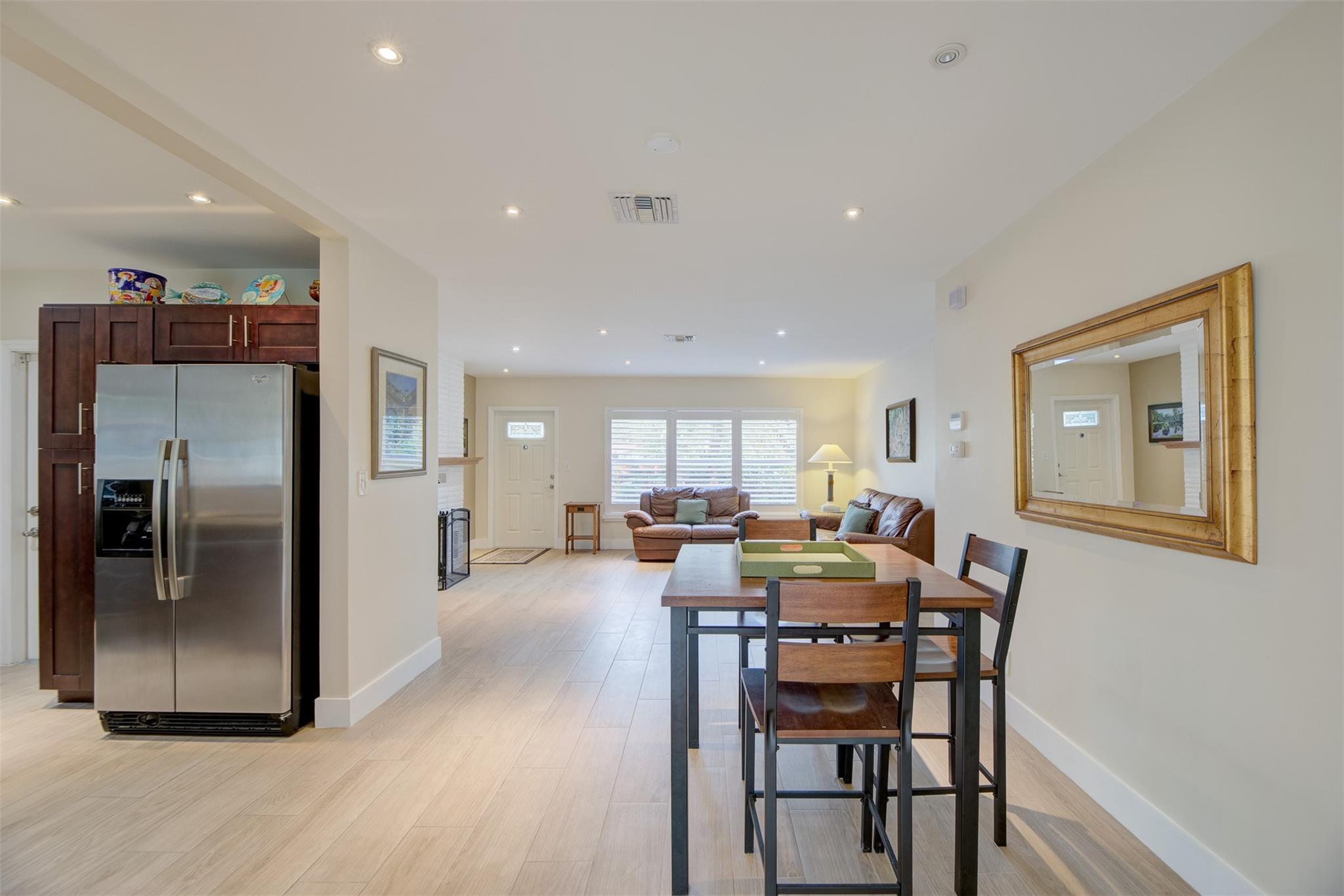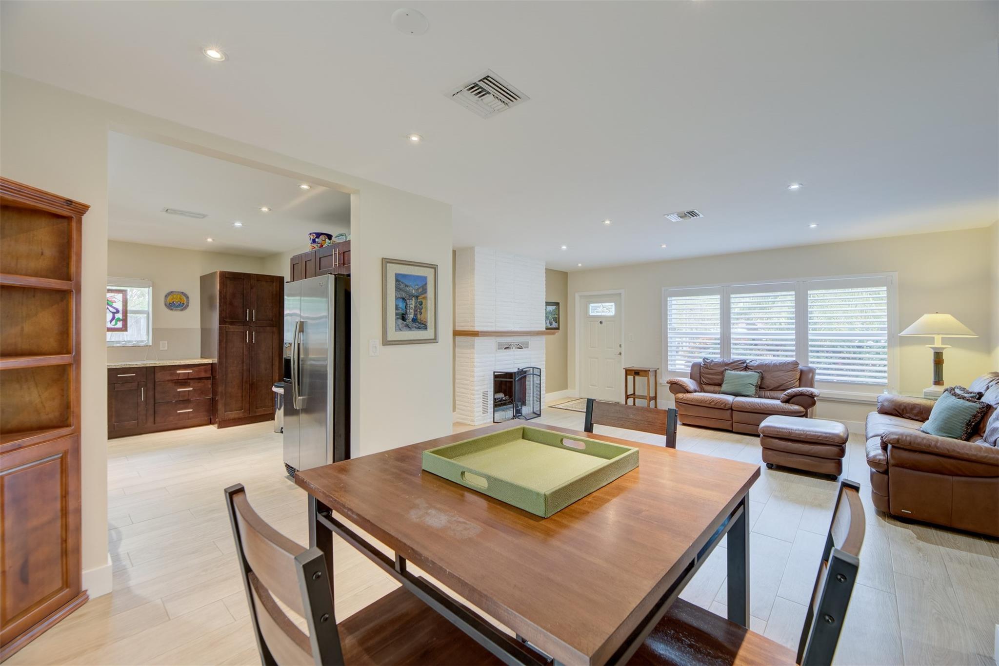 Beautiful mid-century home in desirable Poinsettia Heights with modern feel! Newer roof (2012), impact windows and doors, fireplace with beautiful mantle, ceramic floors that look like wood, modern lighting, modern large kitchen with stainless steel appliances and granite countertops, tankless water heater, Florida room/den, updated modern bathrooms with rain shower, interior laundry, California closets, rear fenced in yard (room for pool), lush tropical landscaping, sprinkler system on well water (with water treatment system), full one car garage with extra storage above. FULL OF CHARACTER! Bring your fussiest buyers!