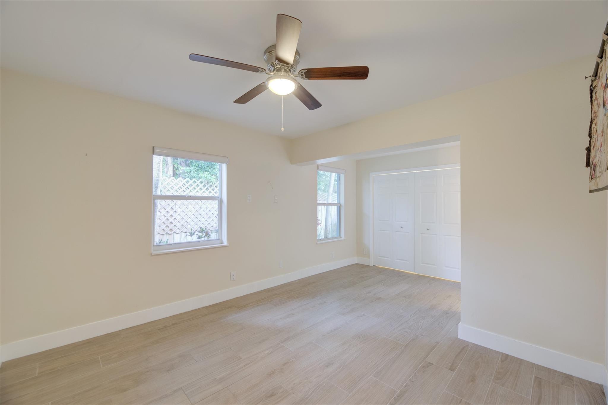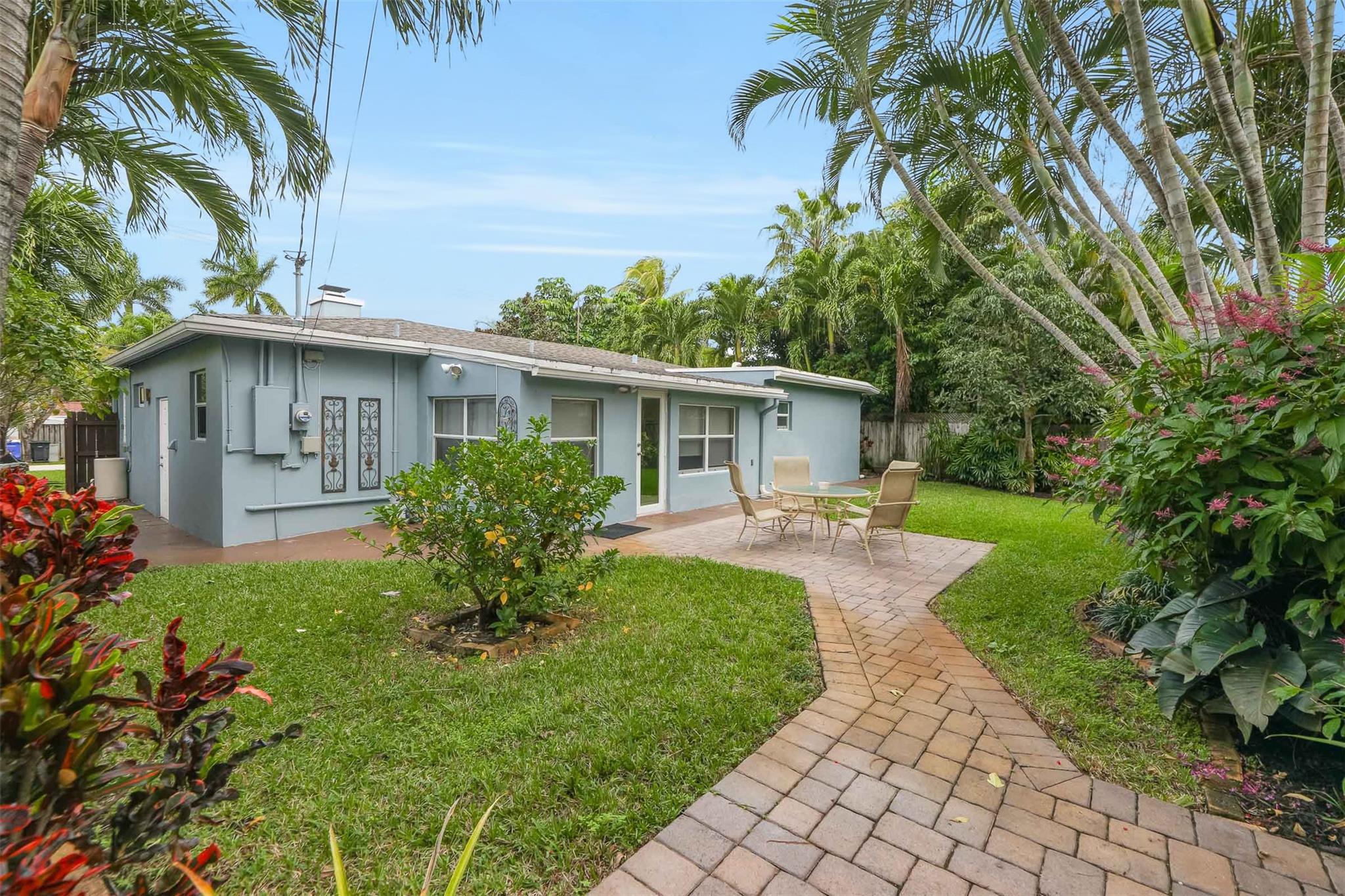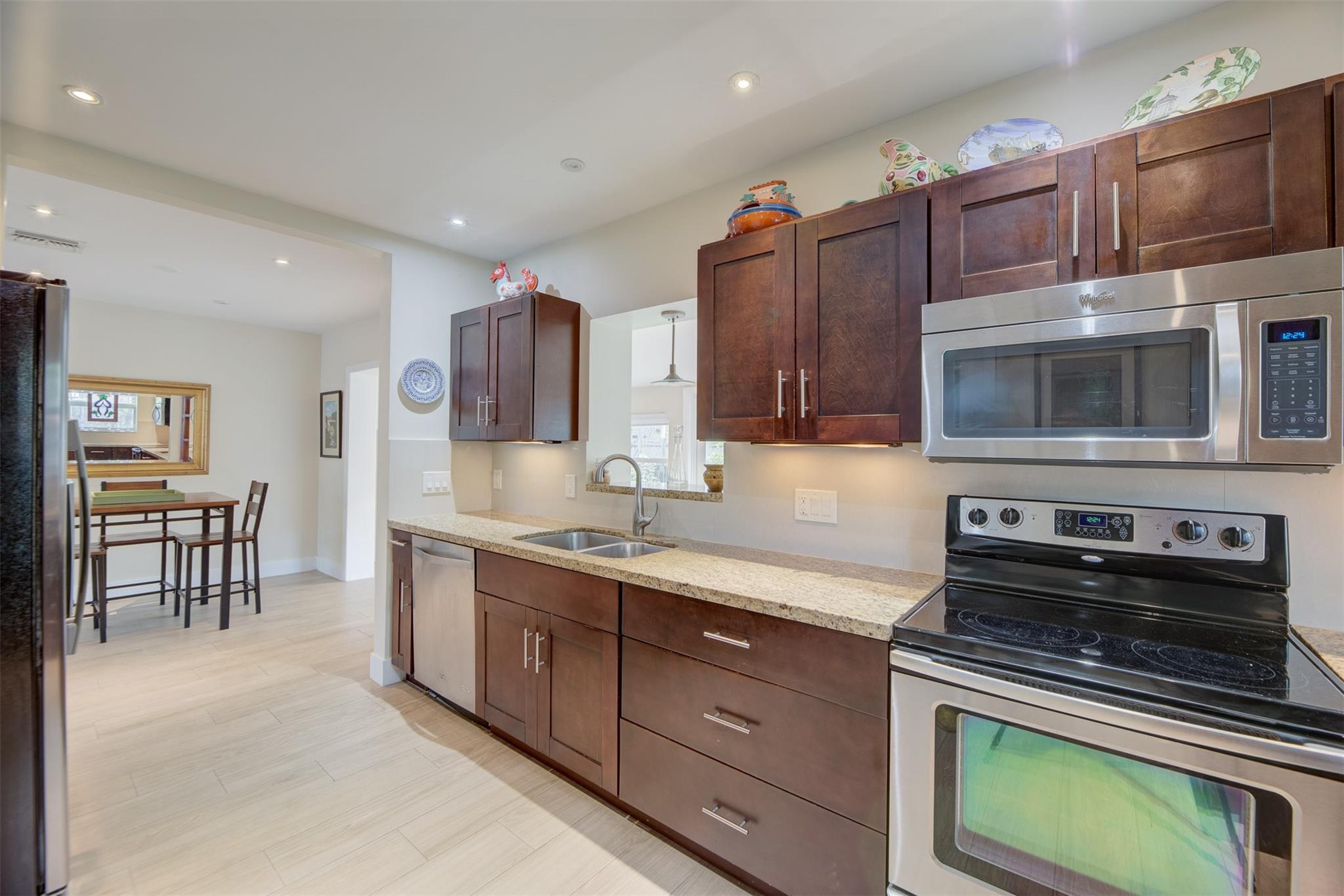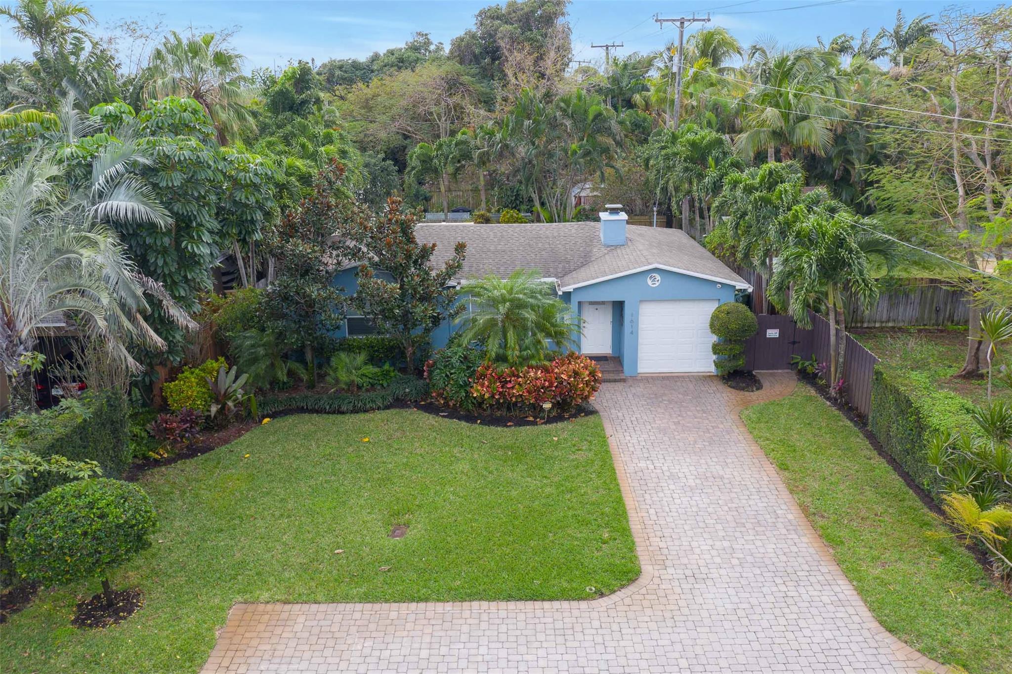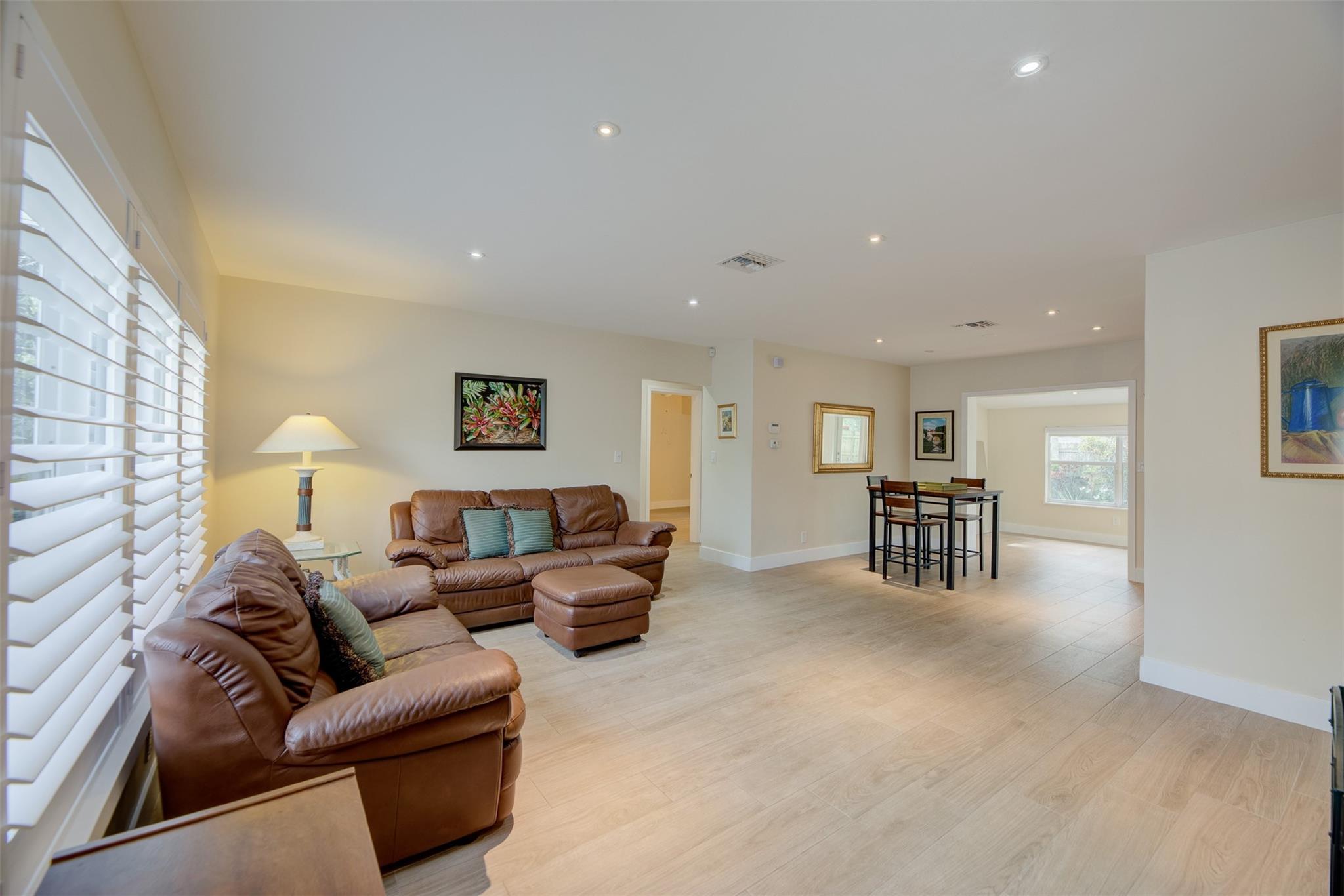 Beautiful mid-century home in desirable Poinsettia Heights with modern feel! Newer roof (2012), impact windows and doors, fireplace with beautiful mantle, ceramic floors that look like wood, modern lighting, modern large kitchen with stainless steel appliances and granite countertops, tankless water heater, Florida room/den, updated modern bathrooms with rain shower, interior laundry, California closets, rear fenced in yard (room for pool), lush tropical landscaping, sprinkler system on well water (with water treatment system), full one car garage with extra storage above. FULL OF CHARACTER! Bring your fussiest buyers!
