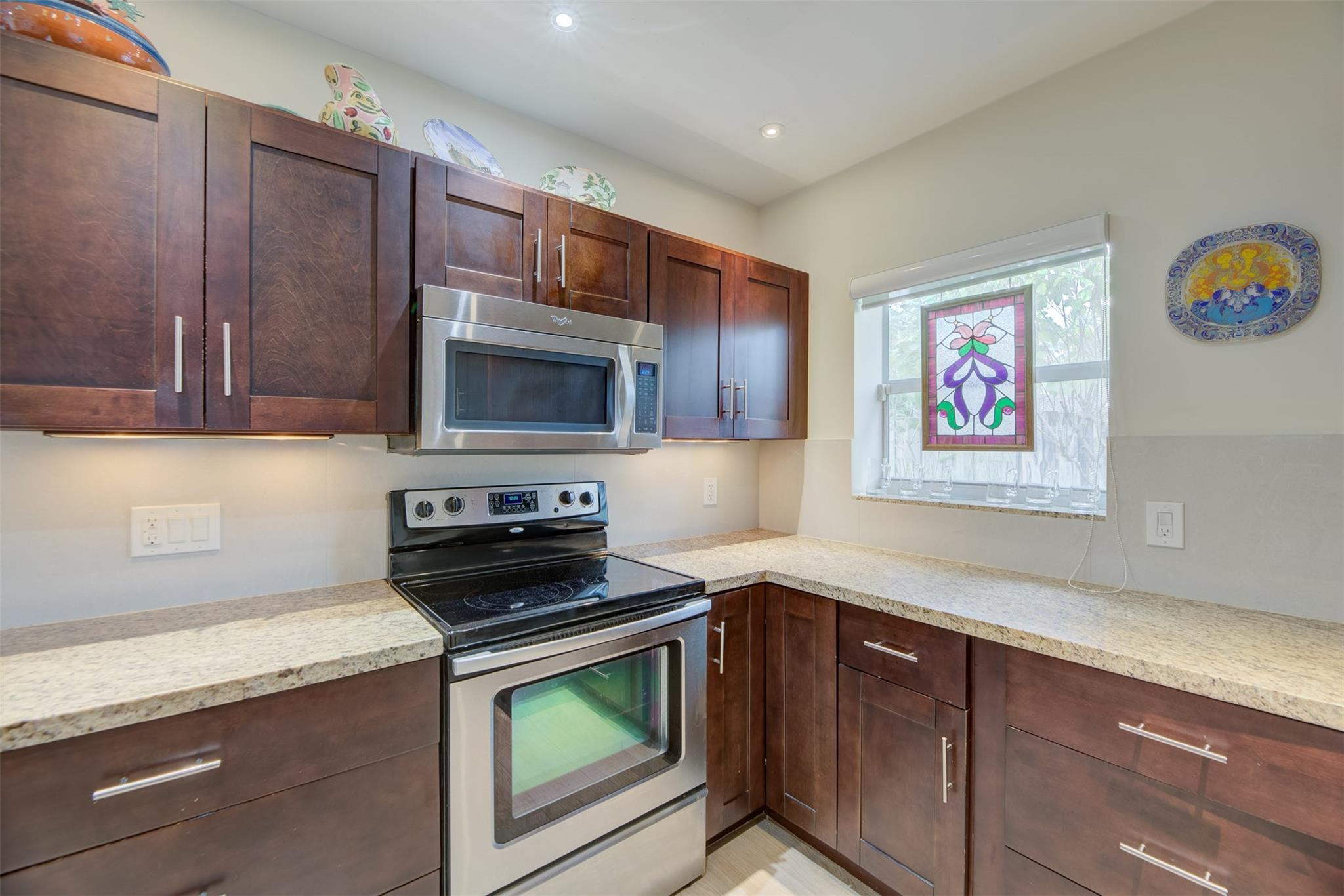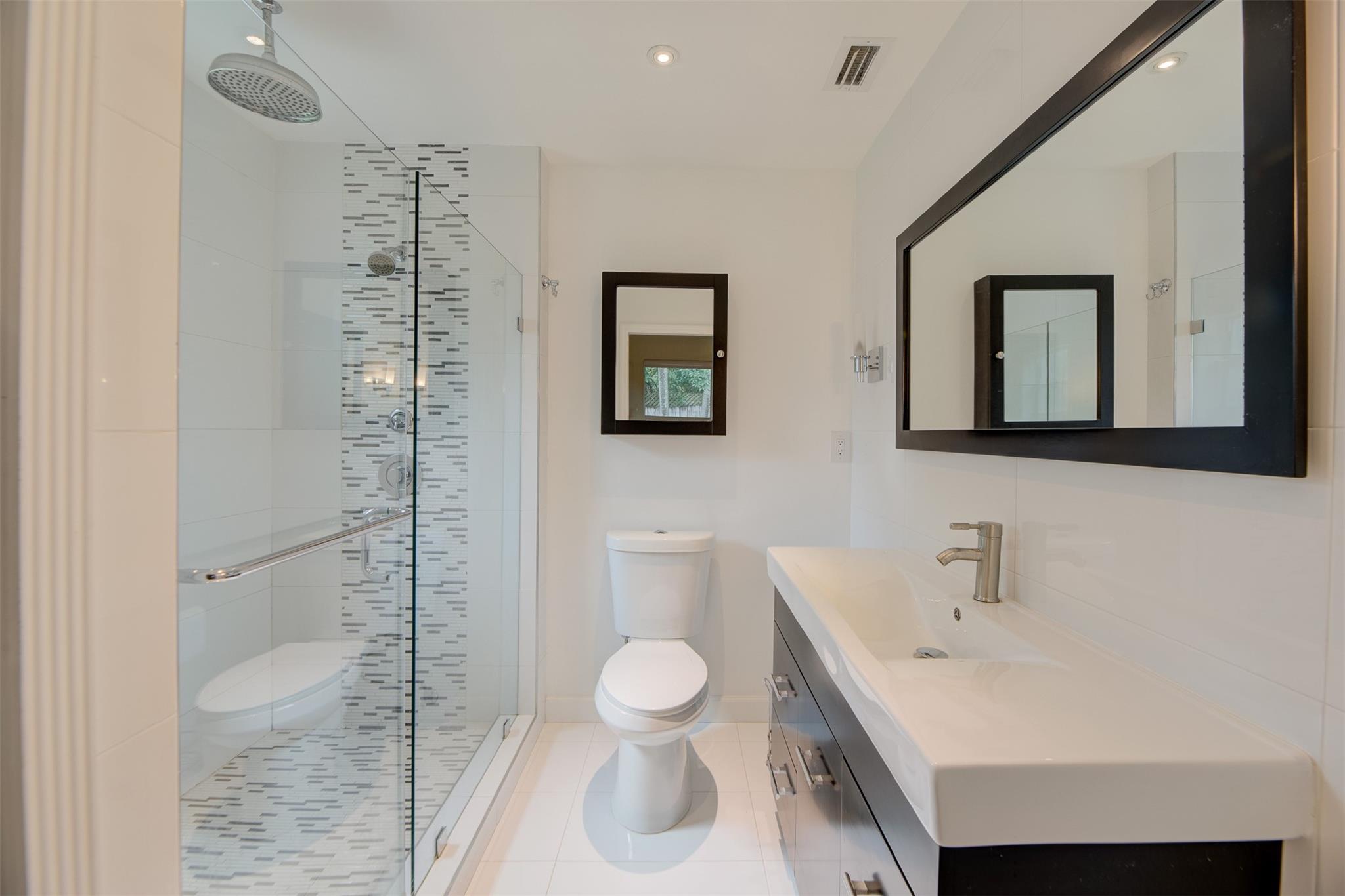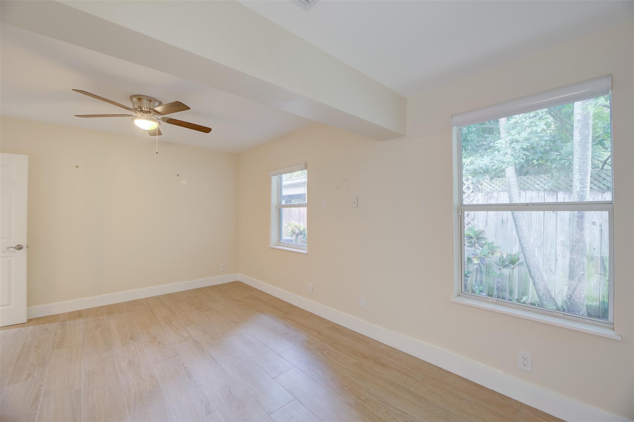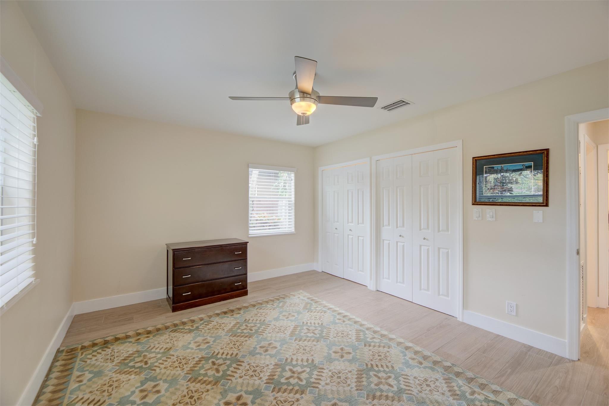 Beautiful mid-century home in desirable Poinsettia Heights with modern feel! Newer roof (2012), impact windows and doors, fireplace with beautiful mantle, ceramic floors that look like wood, modern lighting, modern large kitchen with stainless steel appliances and granite countertops, tankless water heater, Florida room/den, updated modern bathrooms with rain shower, interior laundry, California closets, rear fenced in yard (room for pool), lush tropical landscaping, sprinkler system on well water (with water treatment system), full one car garage with extra storage above. FULL OF CHARACTER! Bring your fussiest buyers!